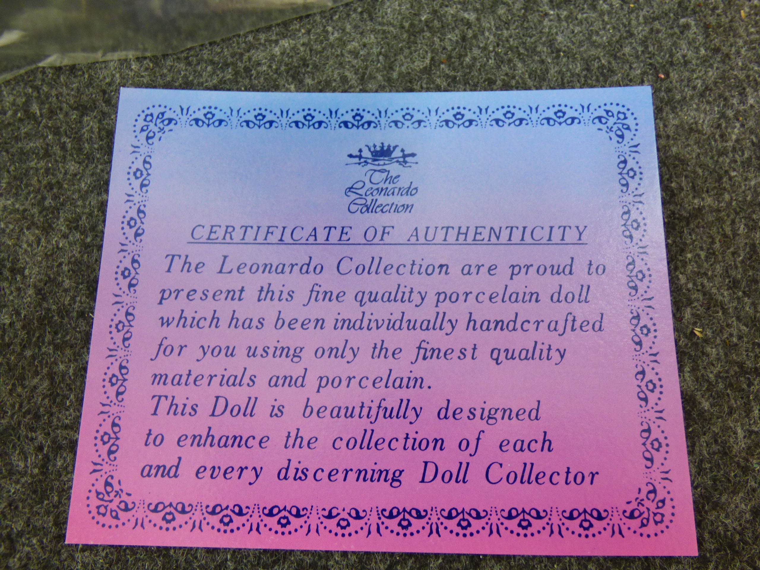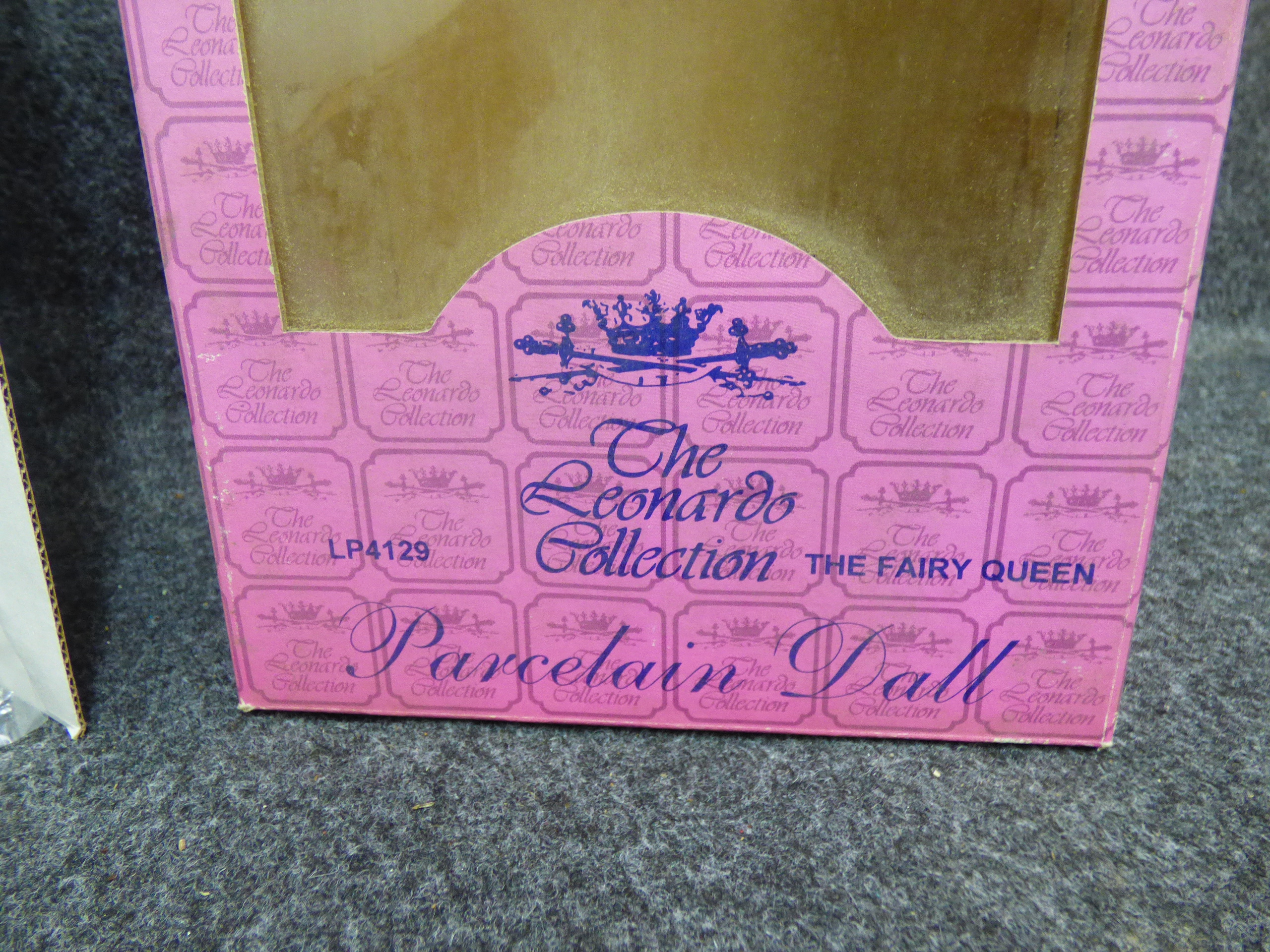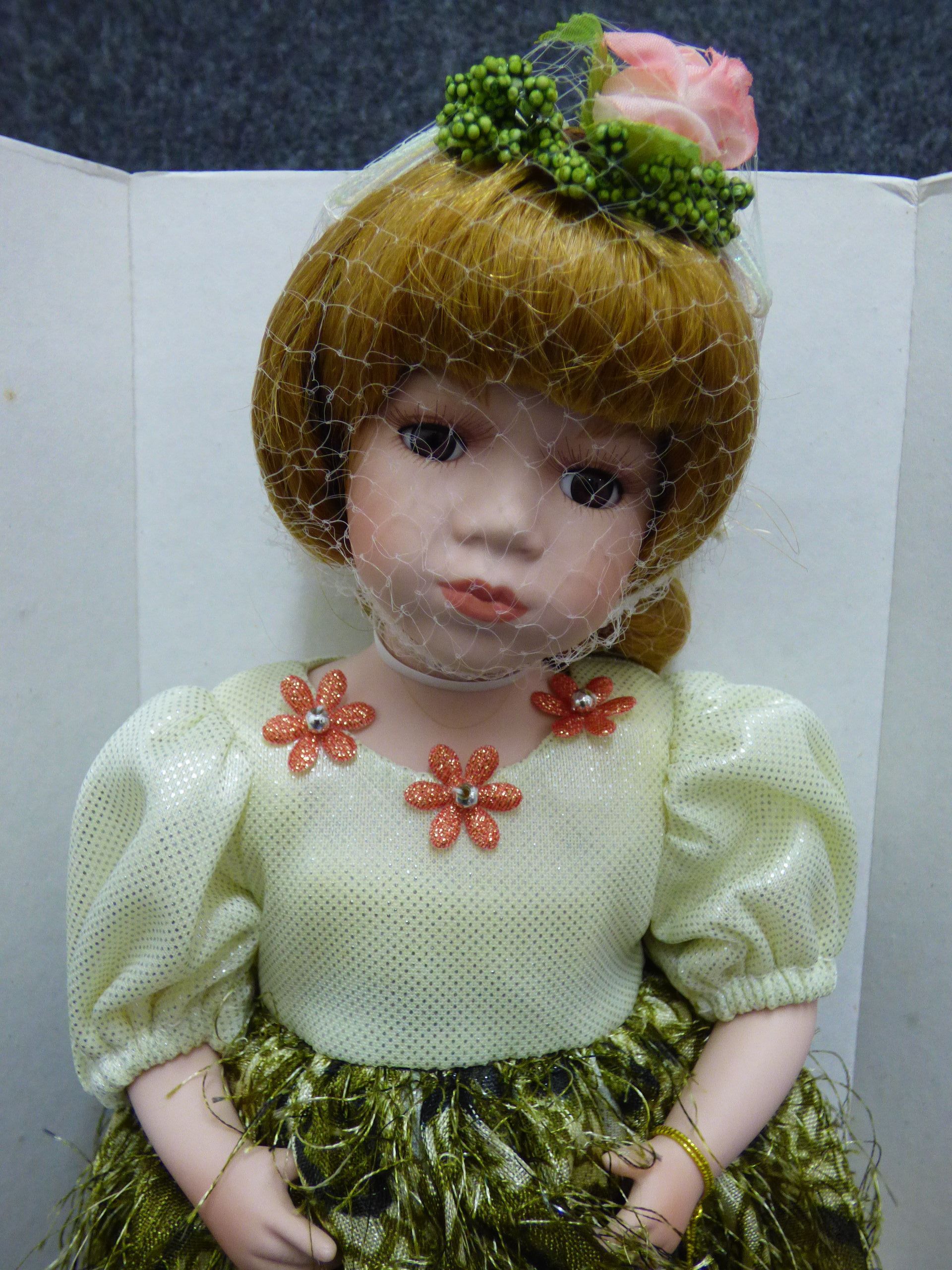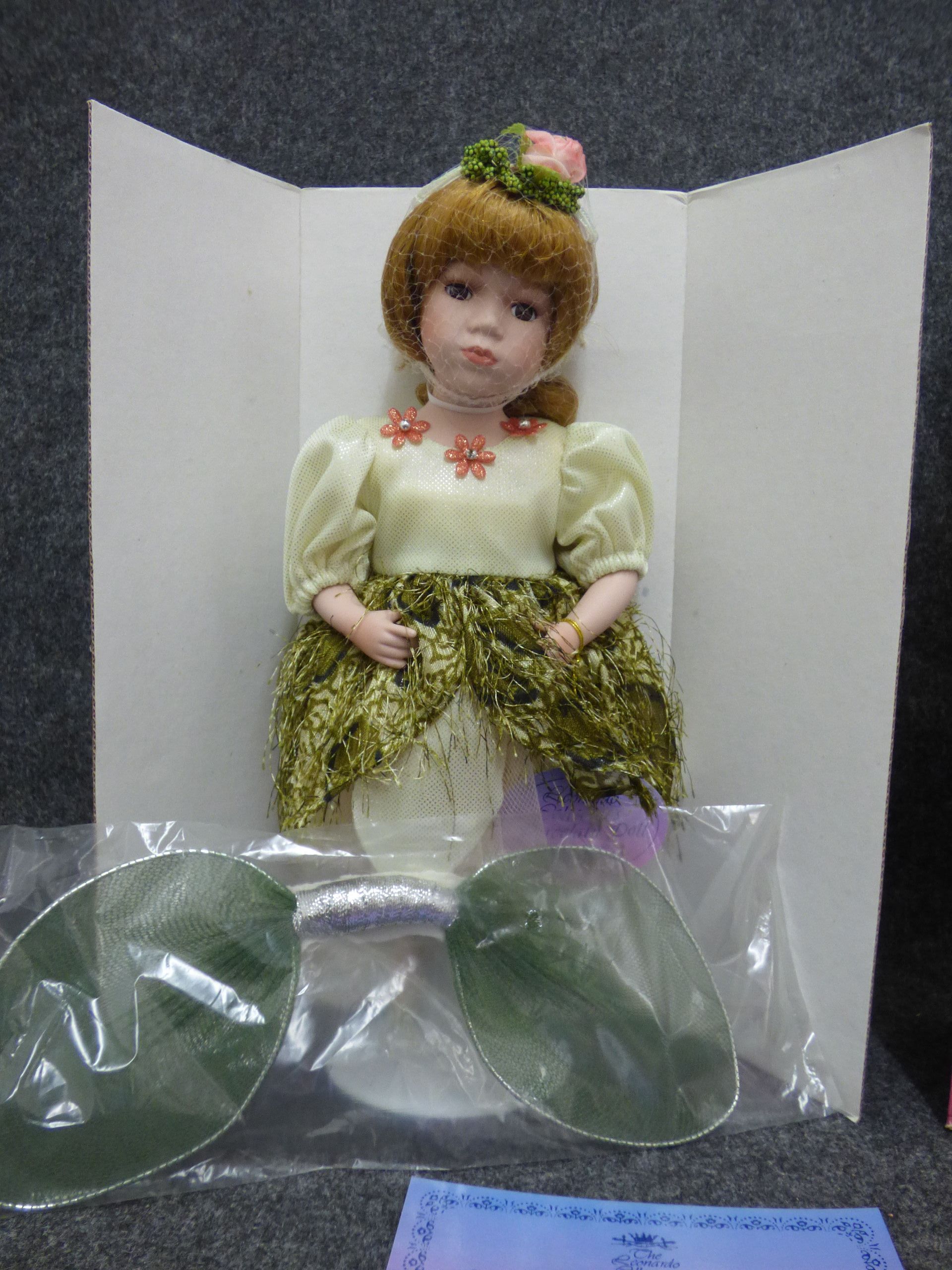 A porcelain doll titled The Fairy Queen featuring a cream gown with green fringe, original box, wings, and certificate. 31cm tall