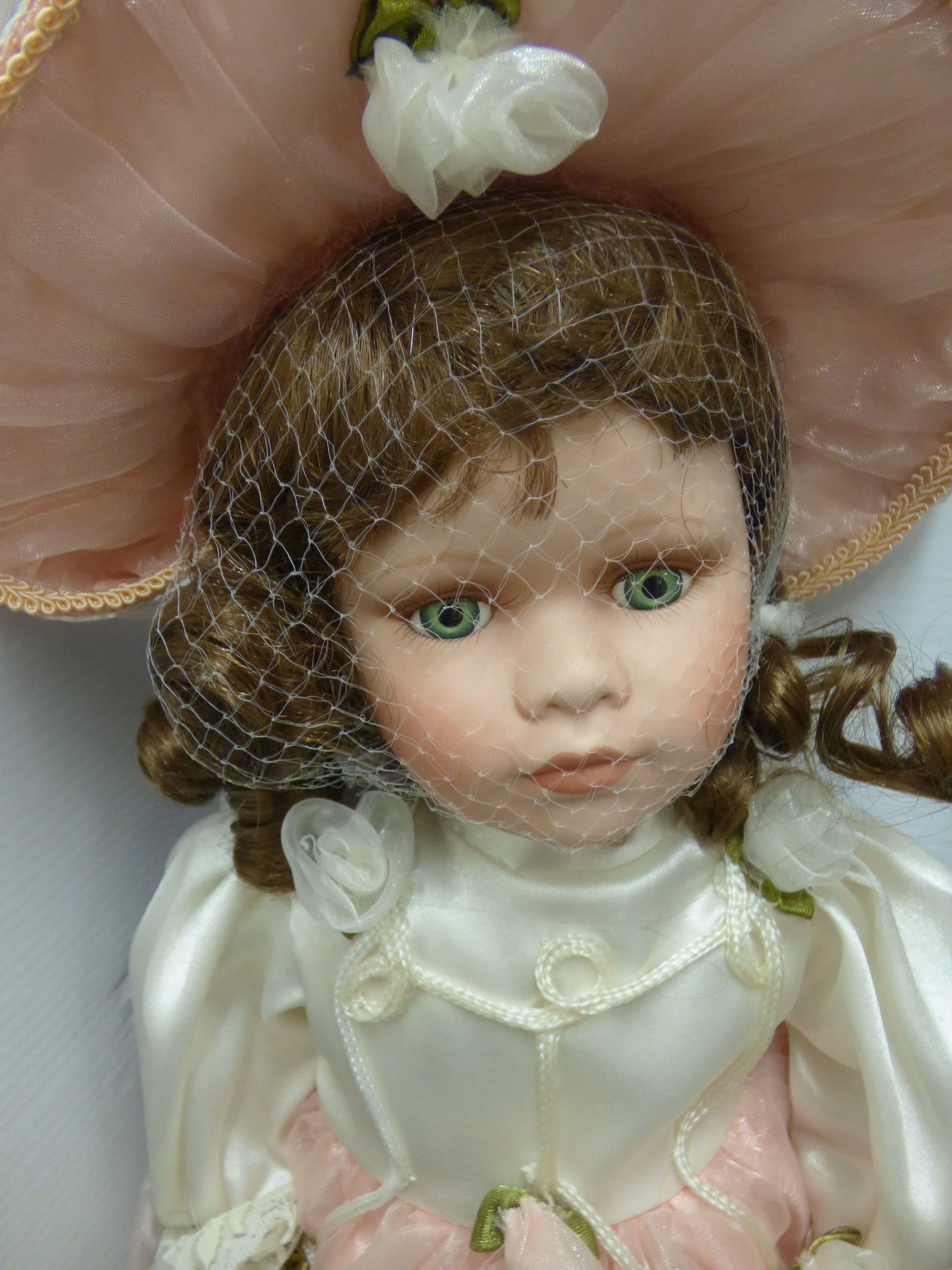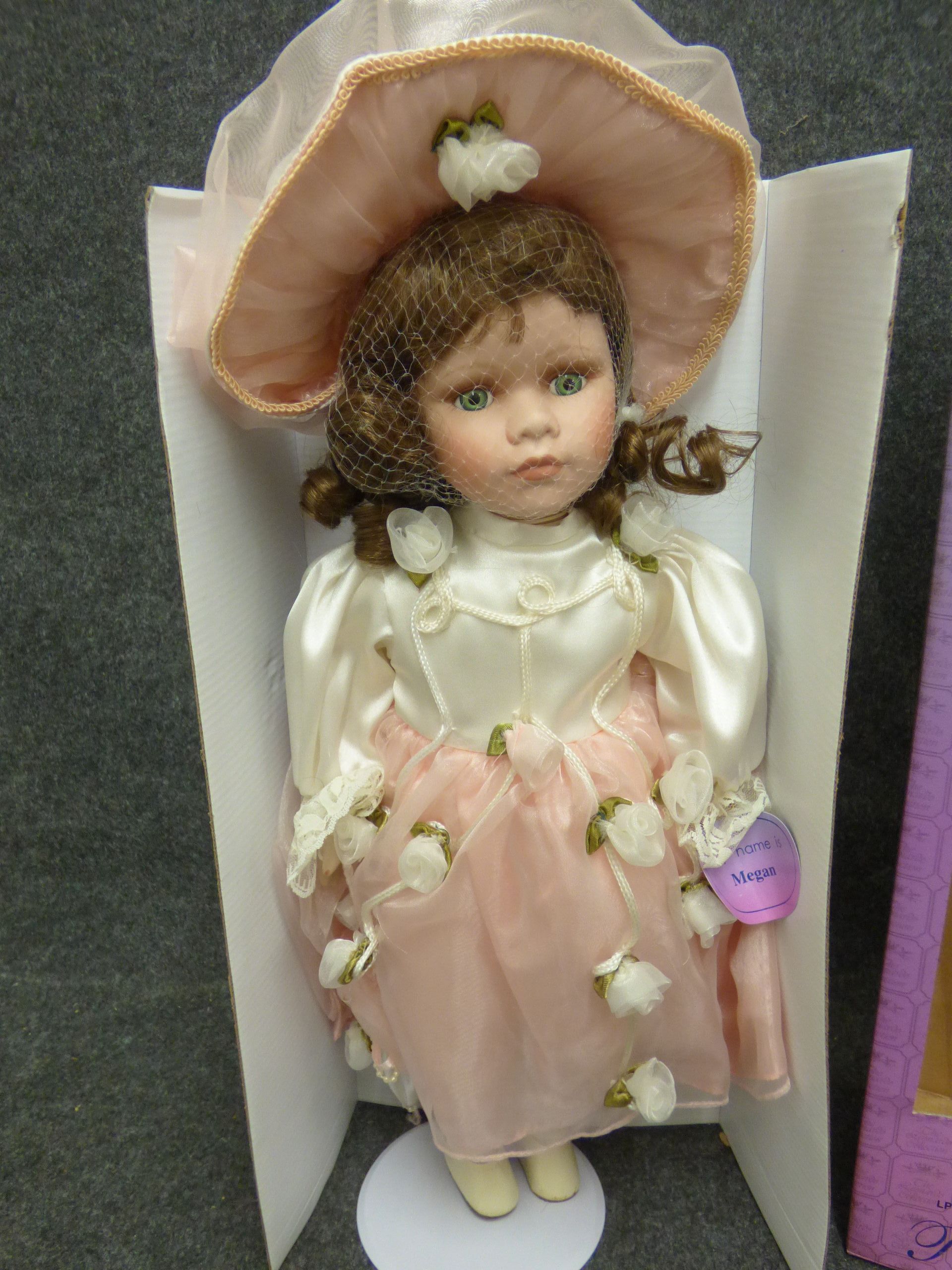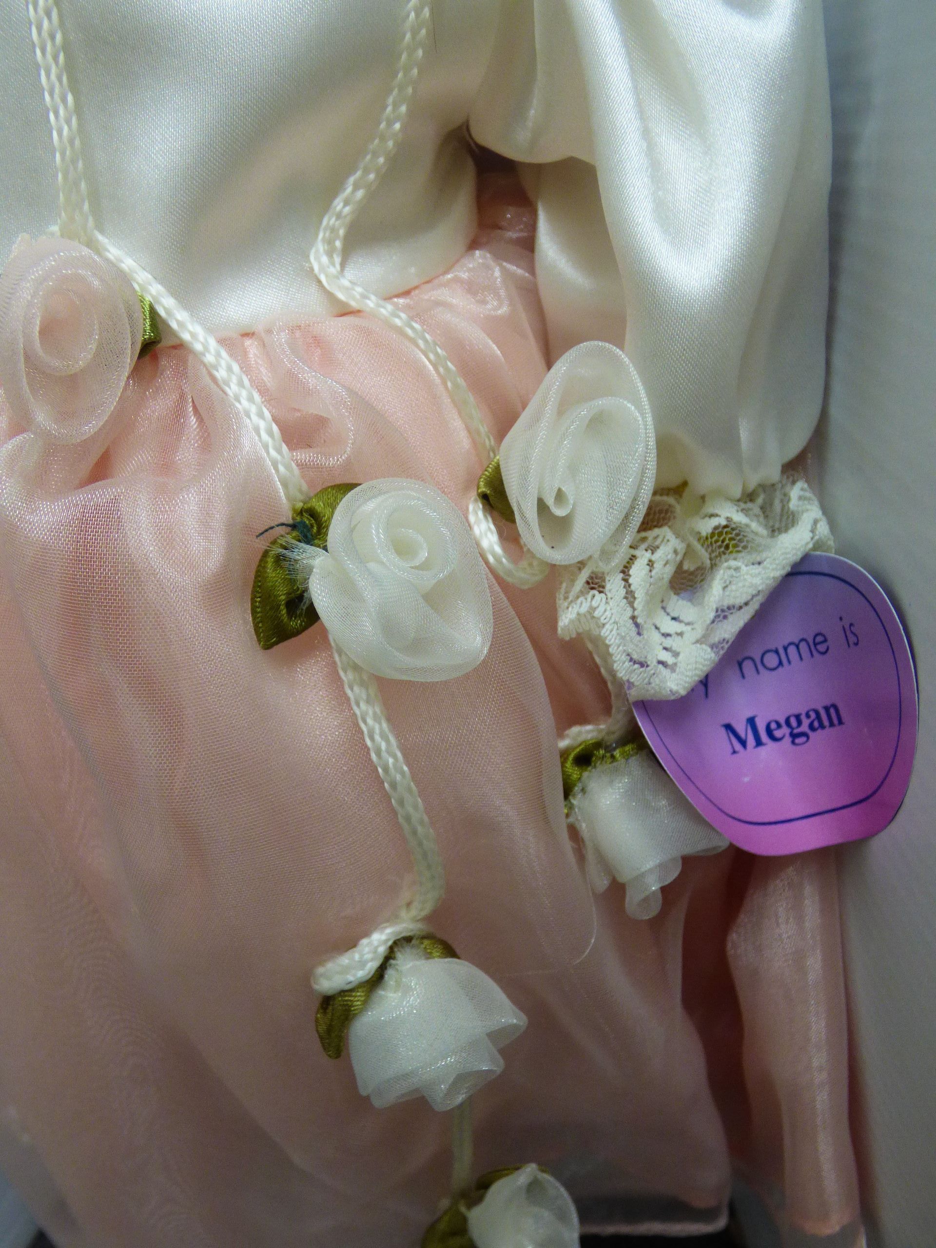 A porcelain doll named Megan from The Leonardo Collection wearing a white and pink floral-accented gown with a matching hat and including its original box marked LP4261. 48cm tall