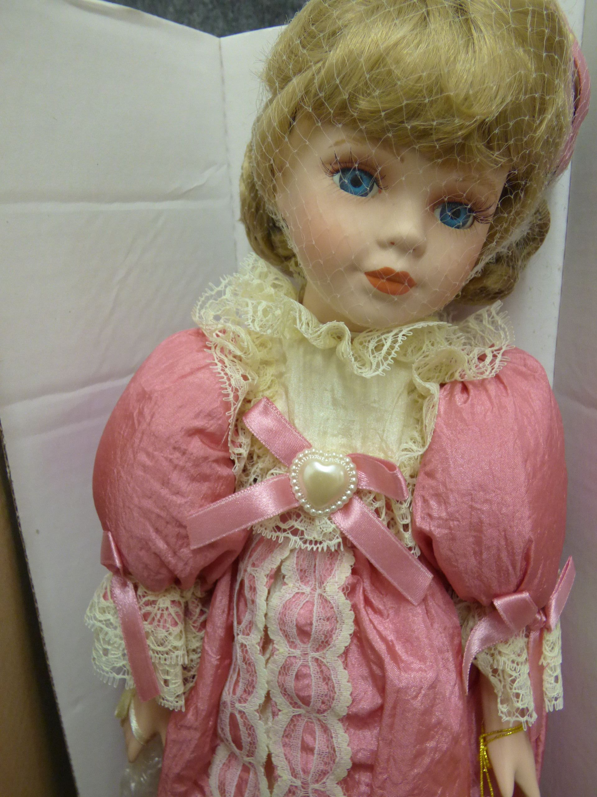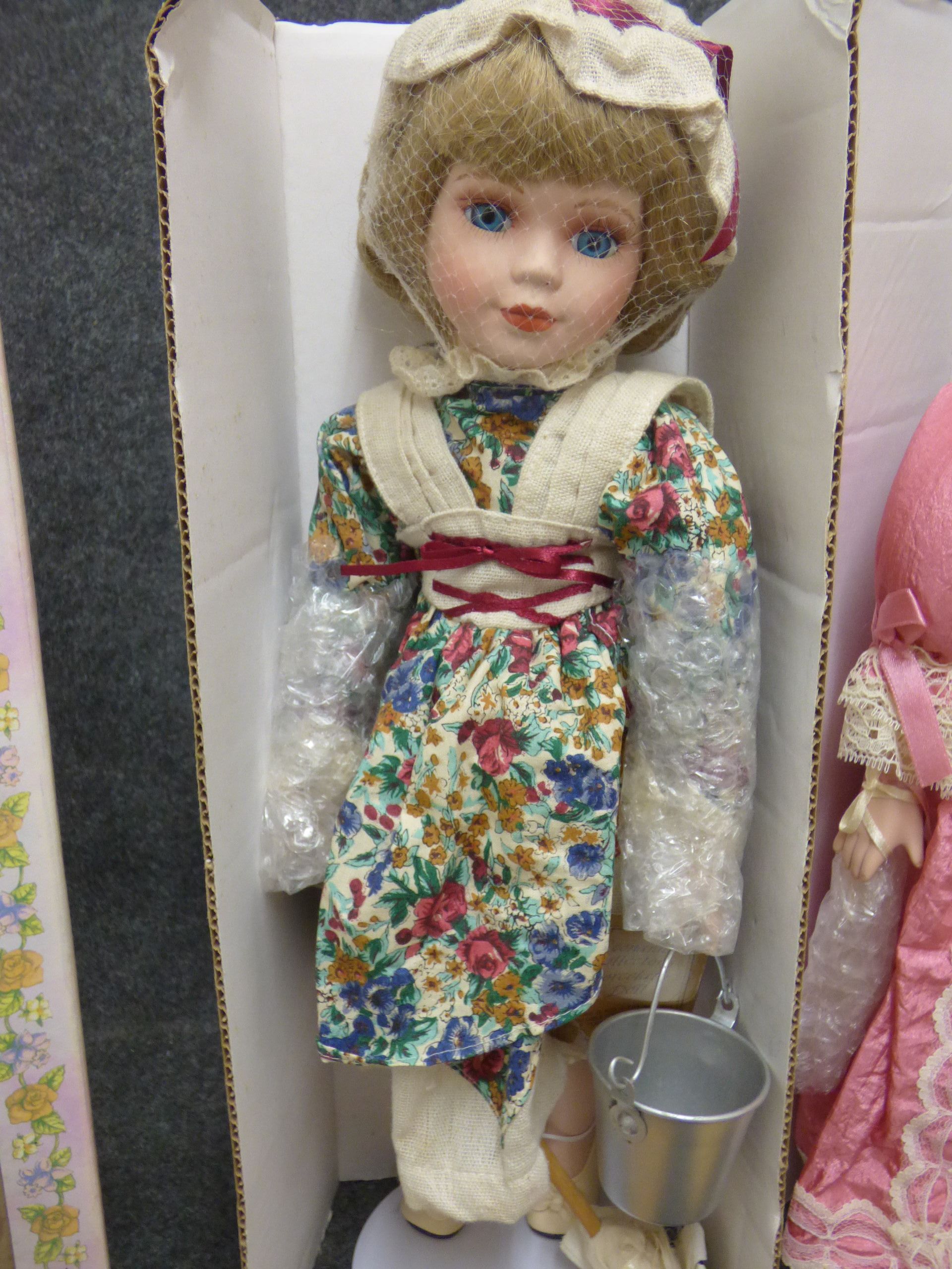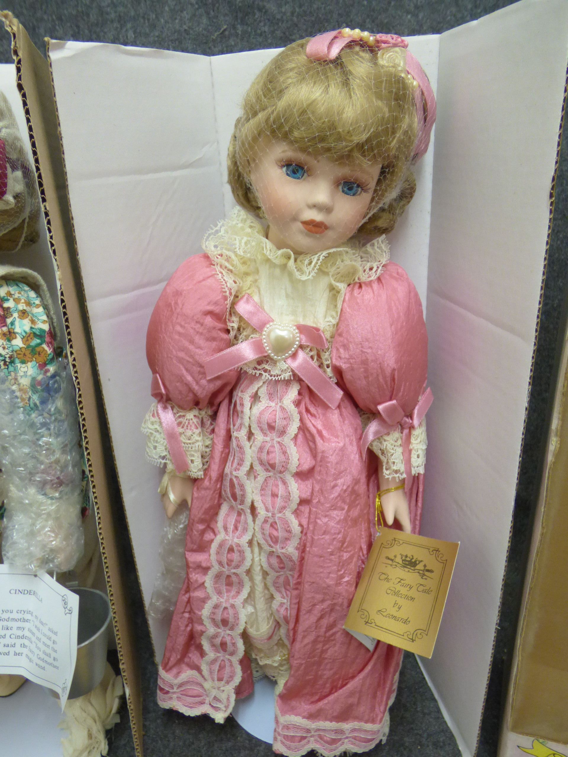 Two porcelain dolls depicting Cinderella in her work clothes and ball gown, featuring original boxes and certificates of authenticity. 40cm tall