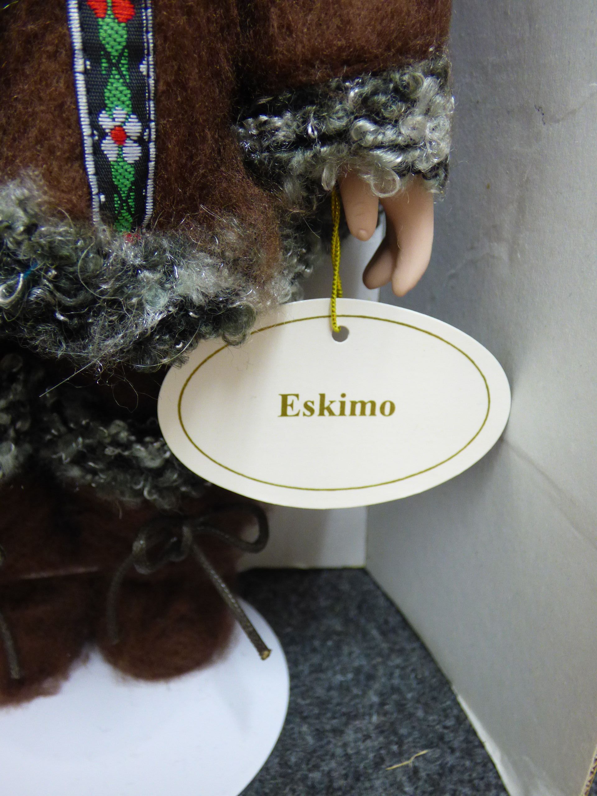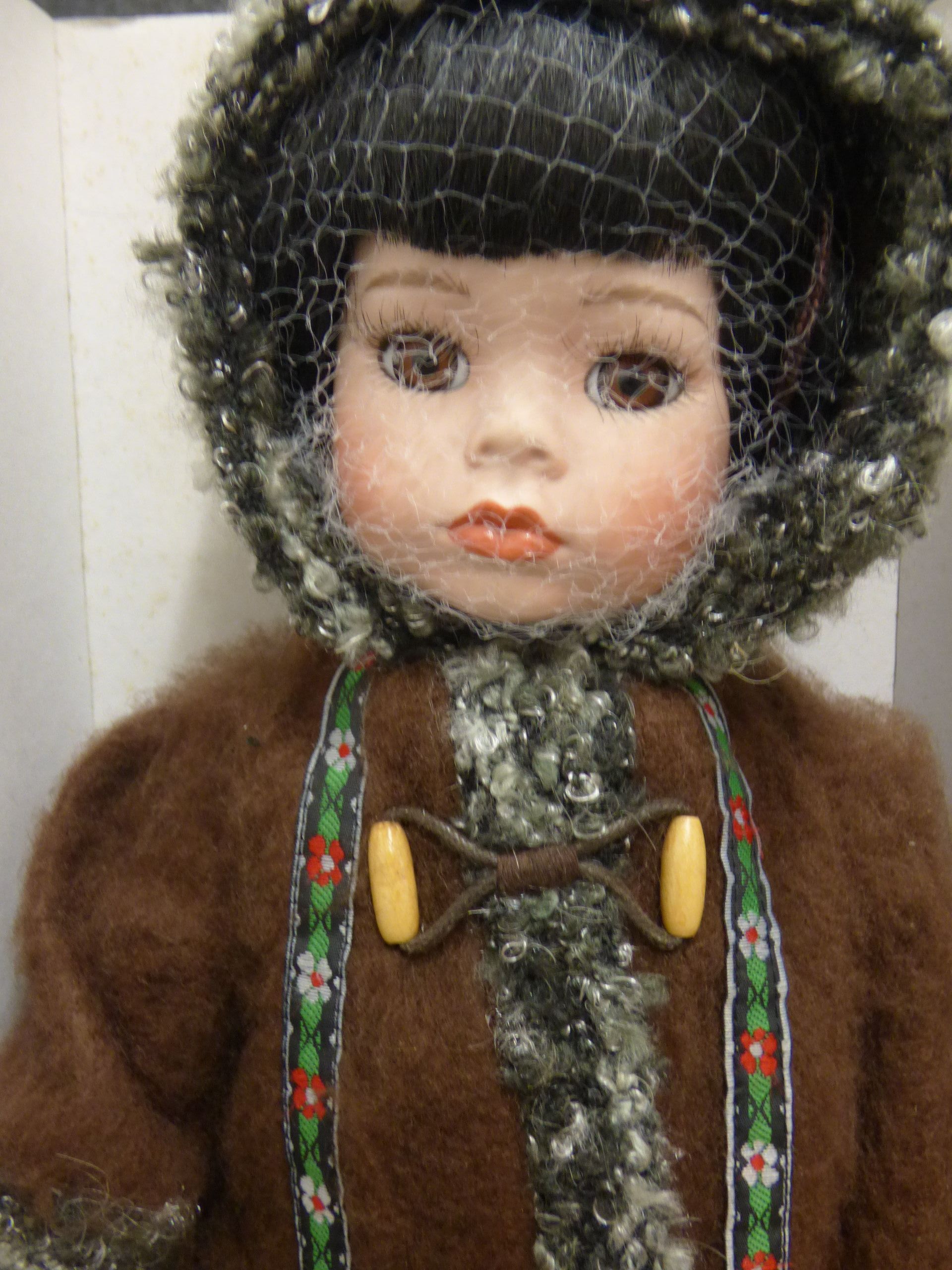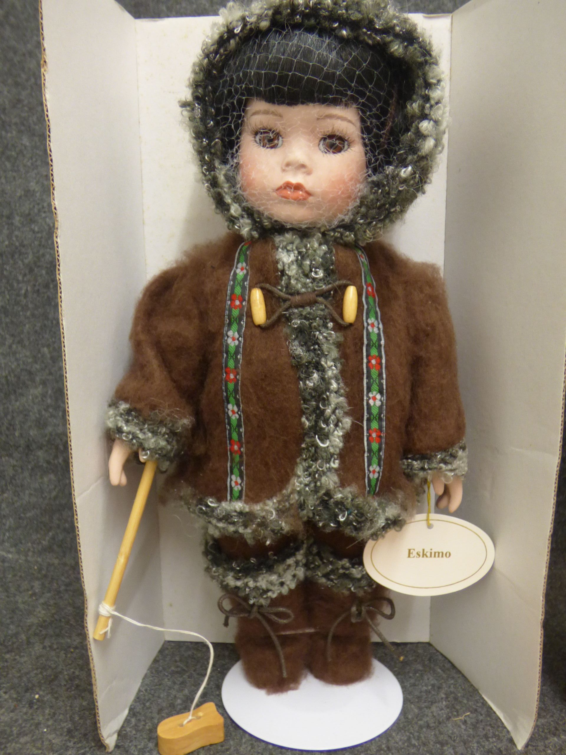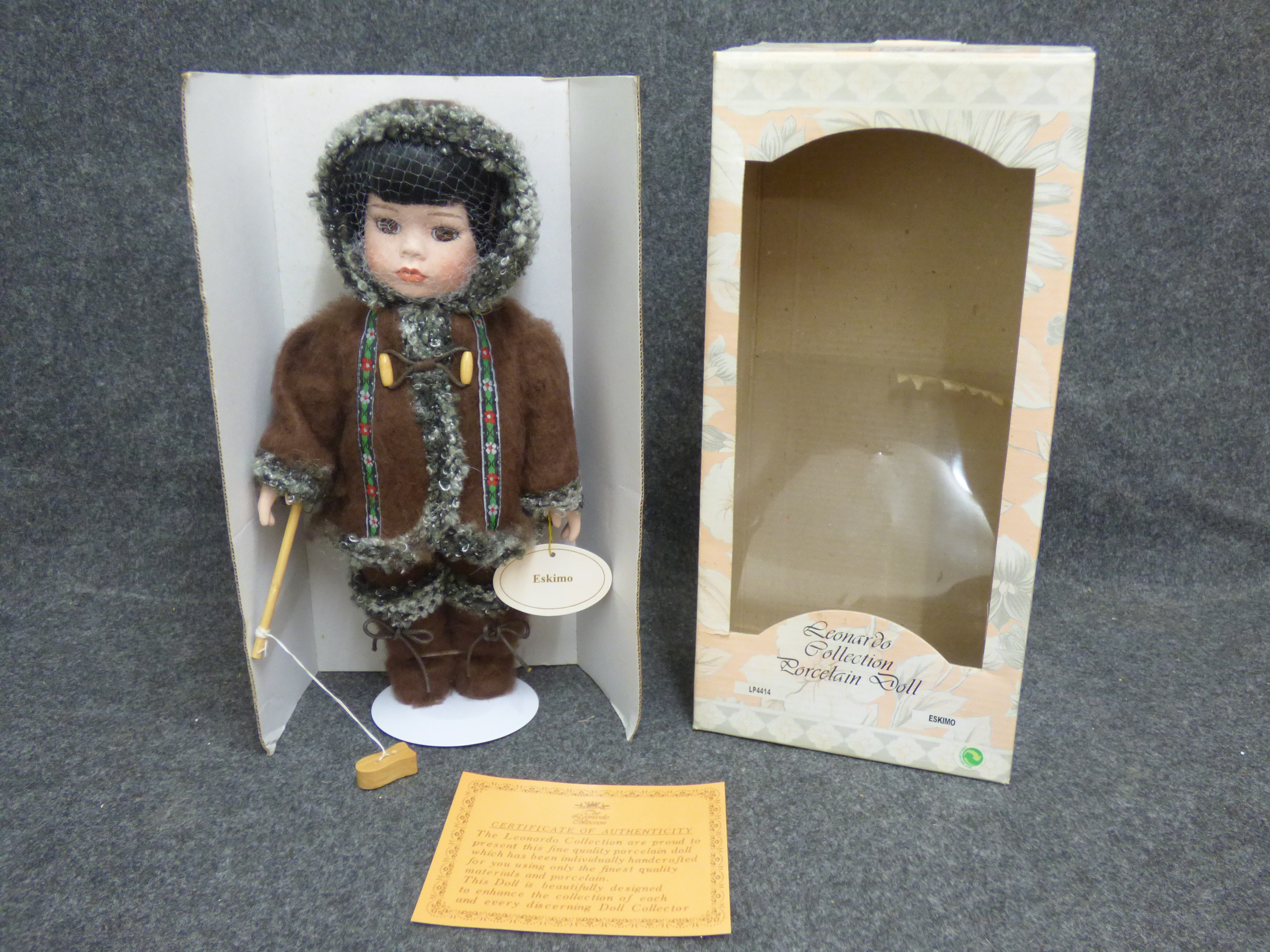 A Leonardo Collection porcelain doll titled Eskimo dressed in a brown faux-fur outfit with grey trim, accompanied by its original box and a certificate of authenticity. 32cm tall