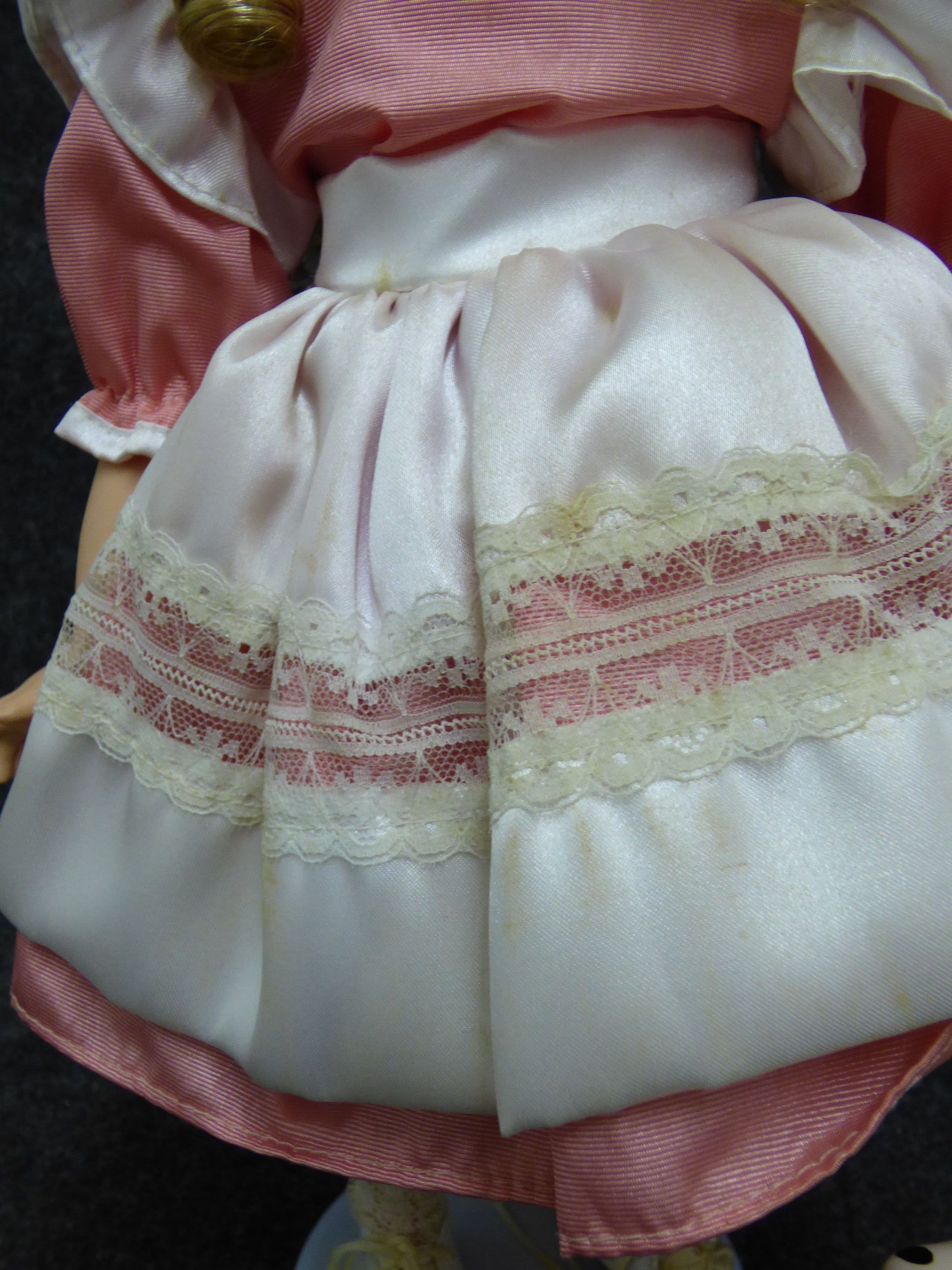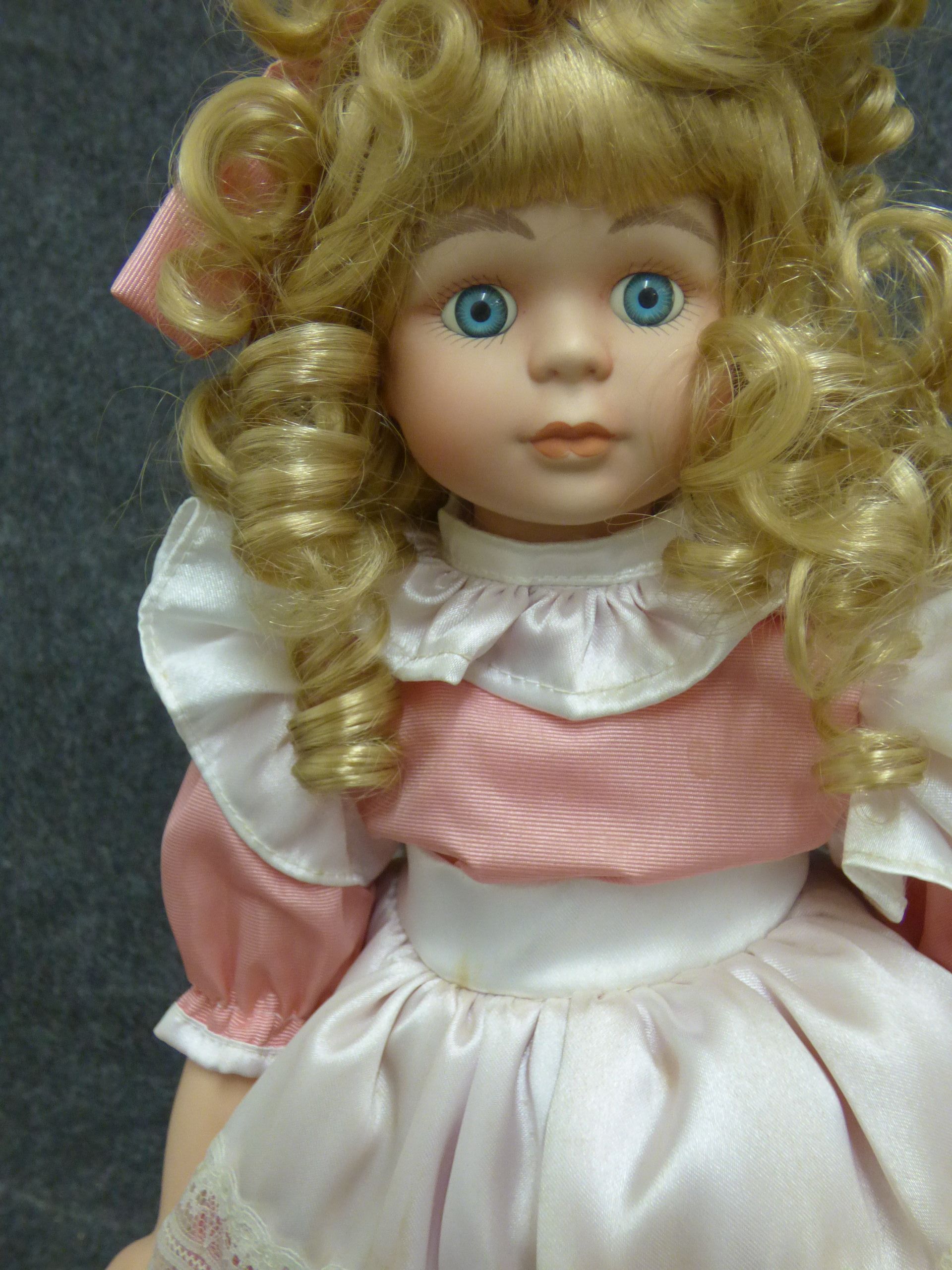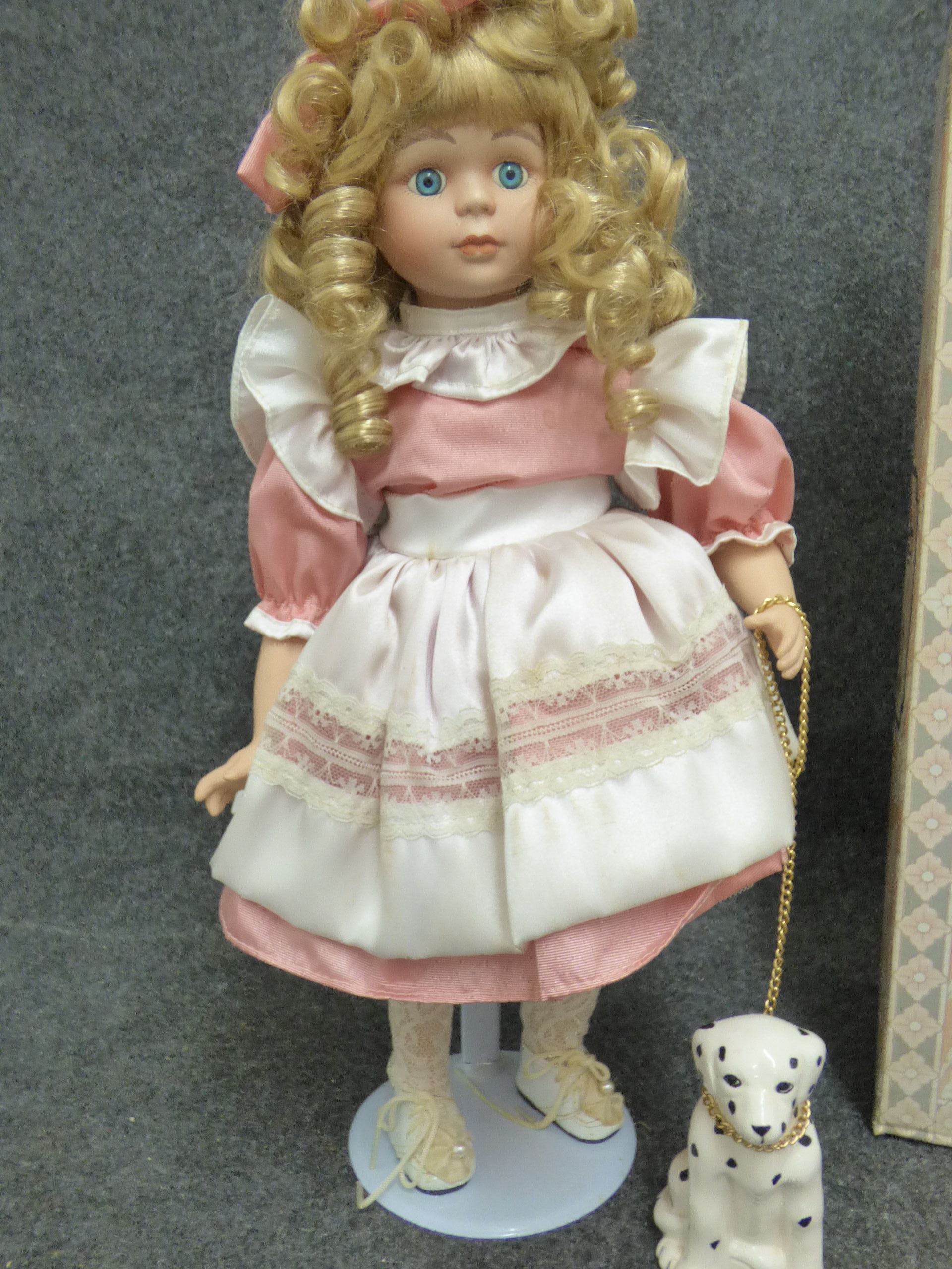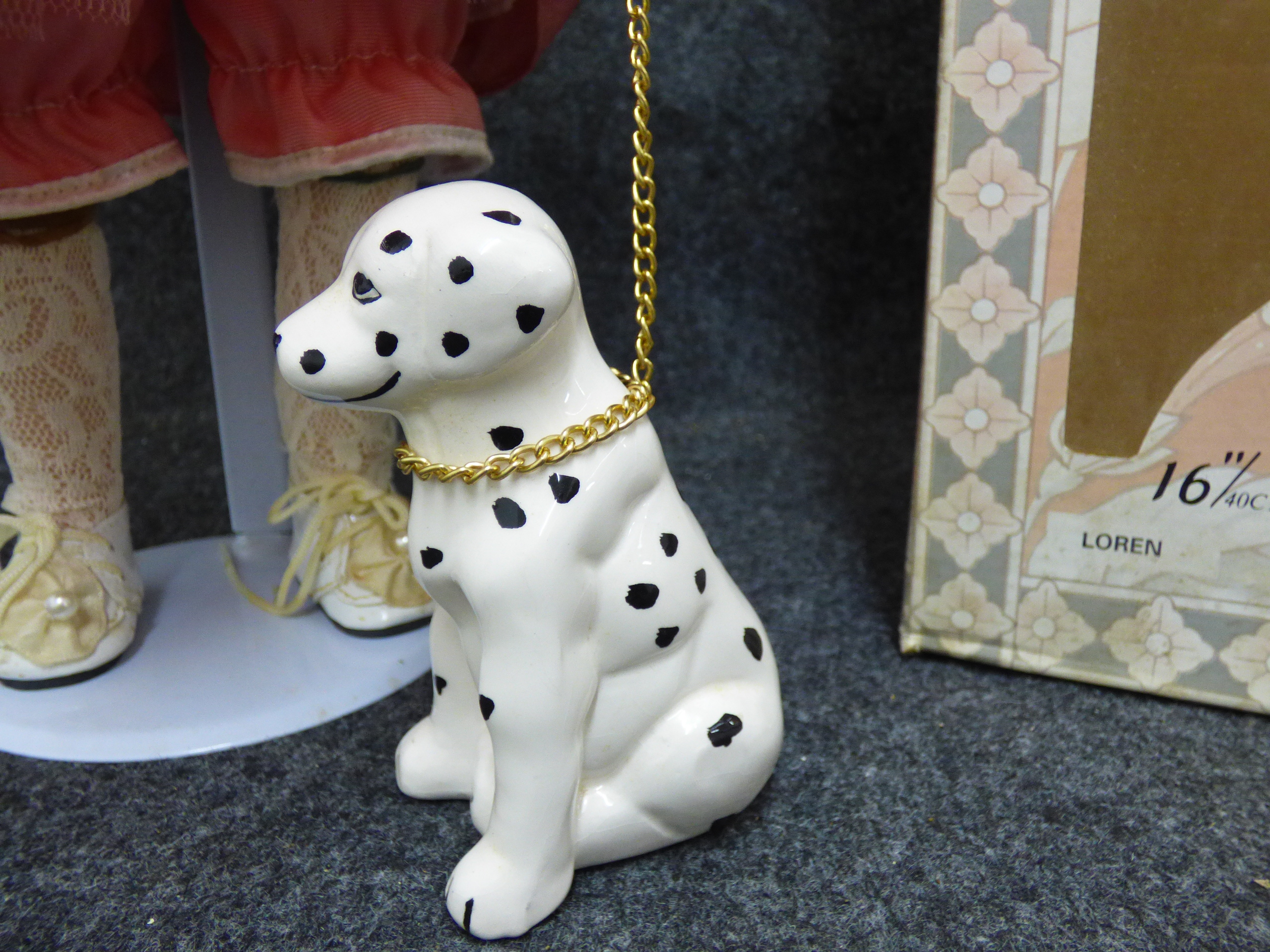 A 16-inch porcelain doll named Loren wearing a pink and white dress accompanied by a porcelain dalmatian dog on a gold-tone chain and original box. 40cm tall