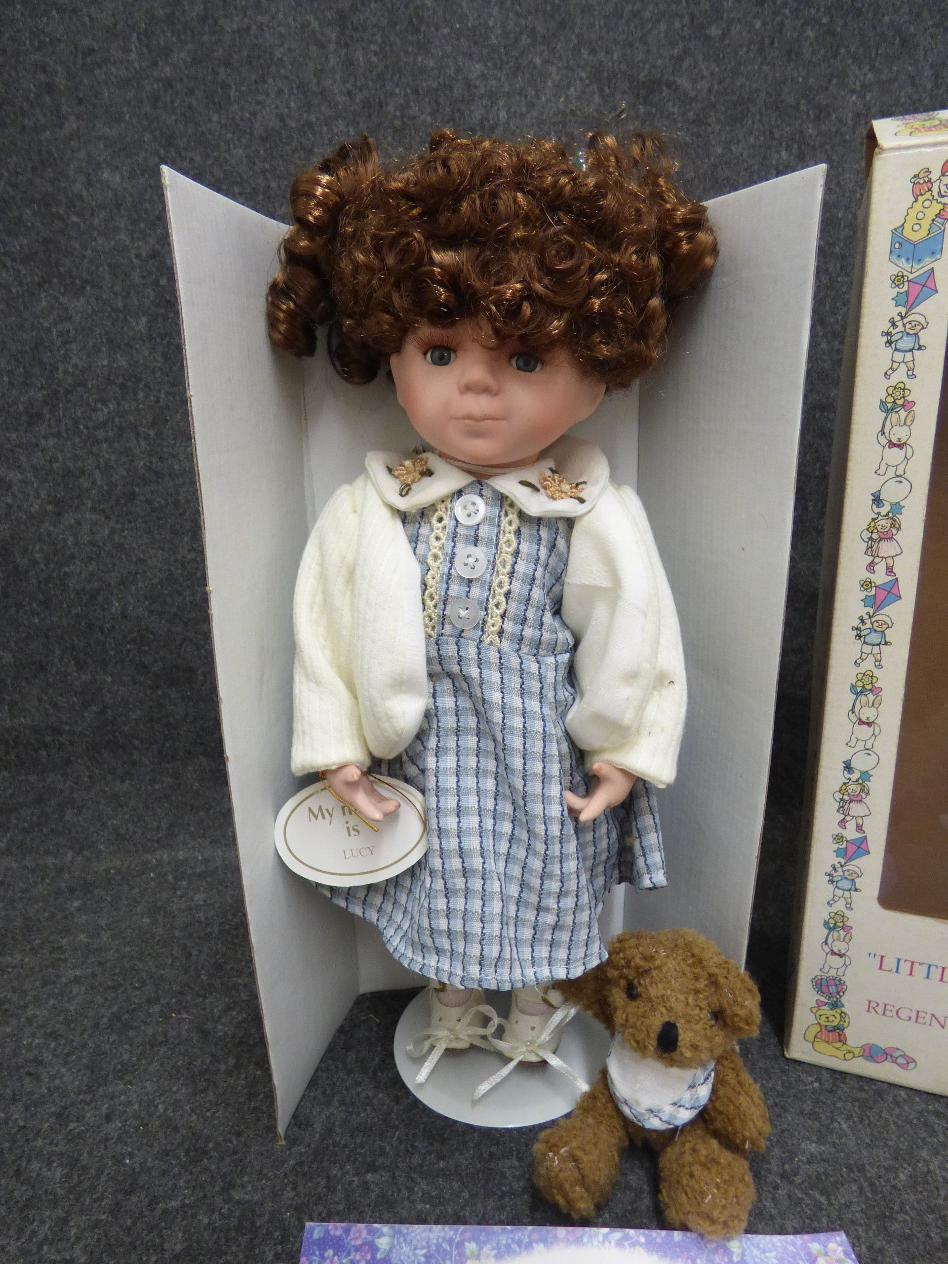 A brown-haired porcelain doll named Lucy wearing a blue checkered dress and white cardigan, accompanied by a small teddy bear, original box, and Certificate of Authenticity. 37cm tall