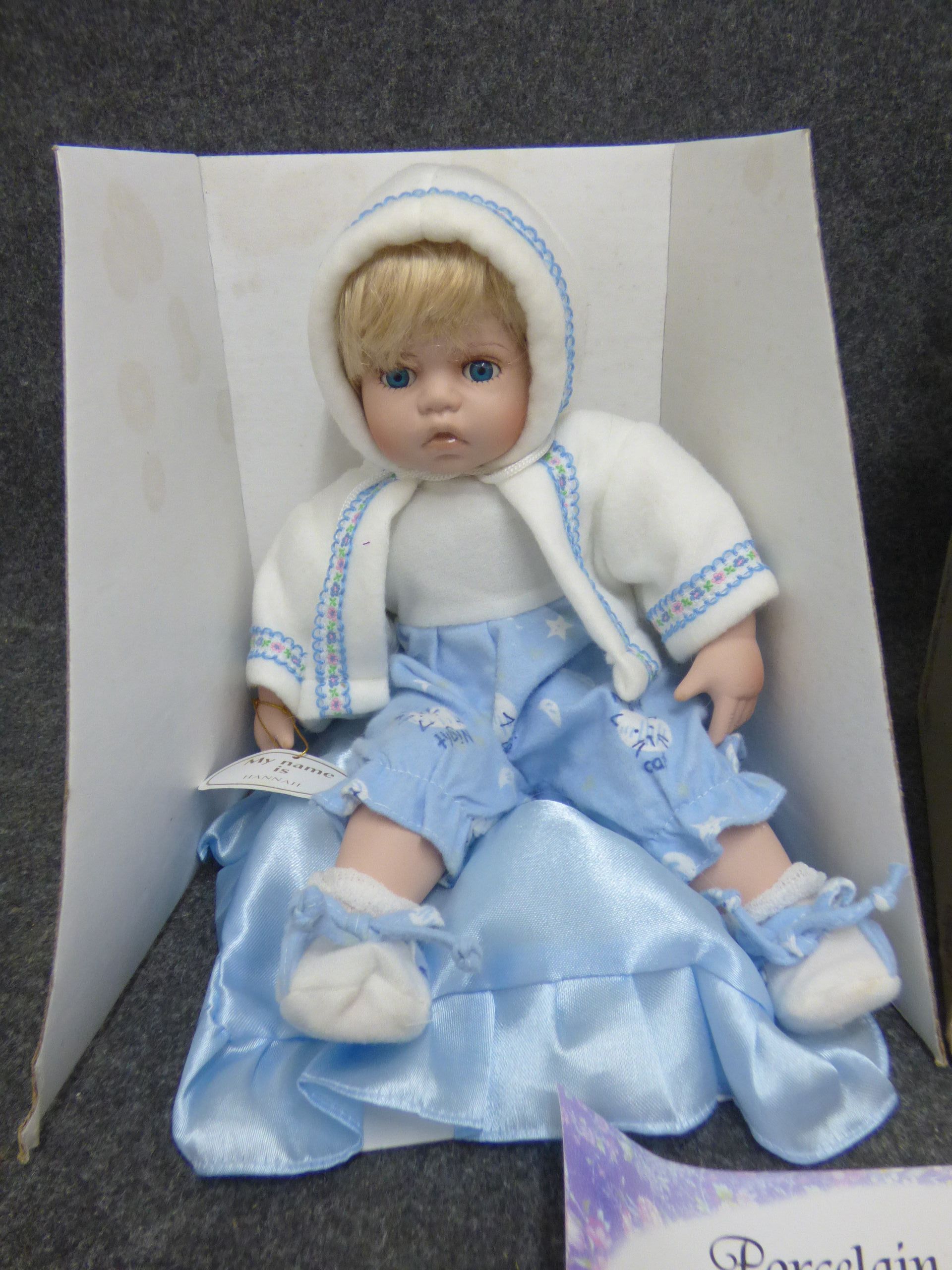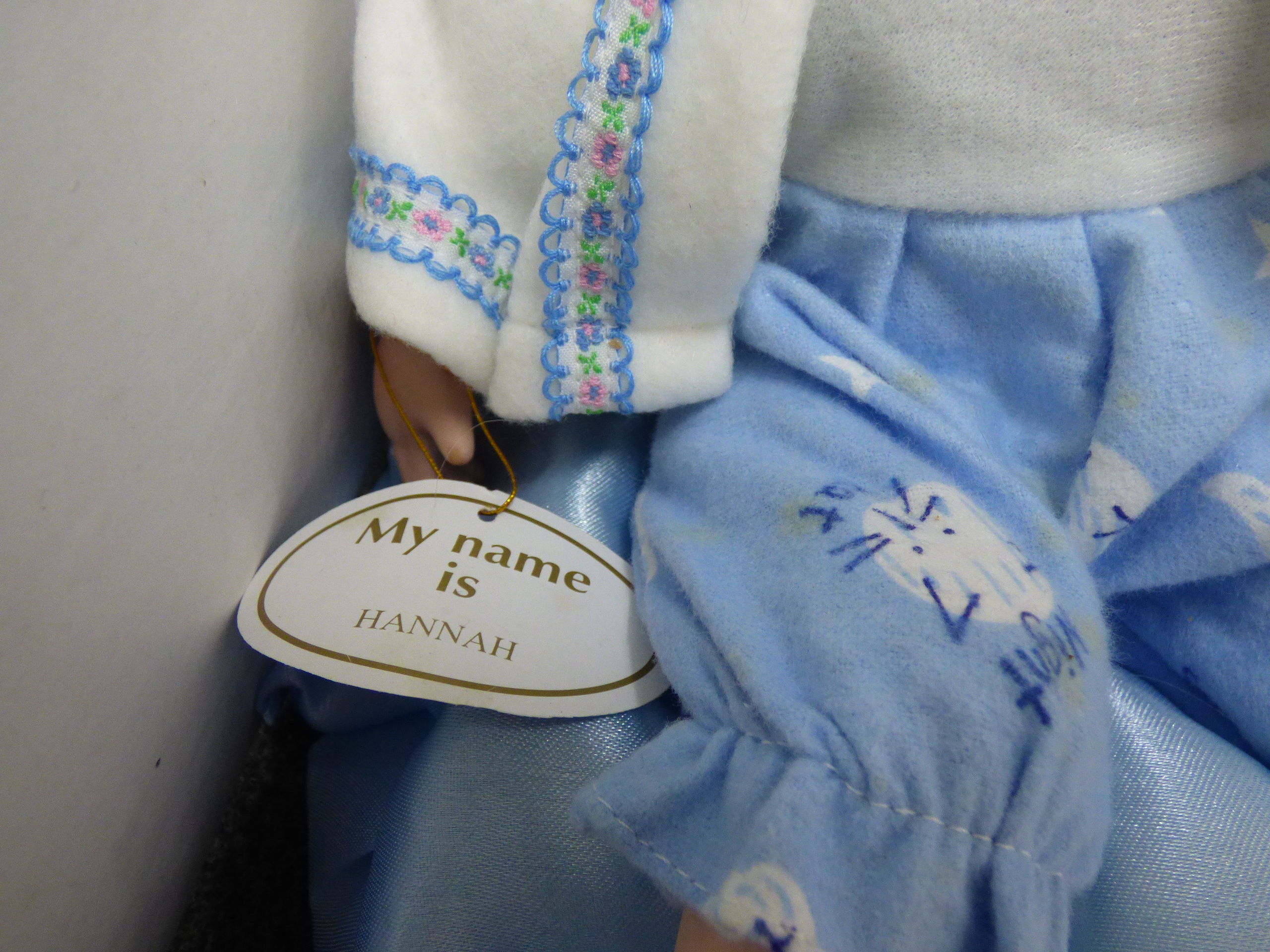 A Regency Fine Arts porcelain baby doll named Hannah wearing blue and white clothing, accompanied by its original box and certificate of authenticity. 24cm tall