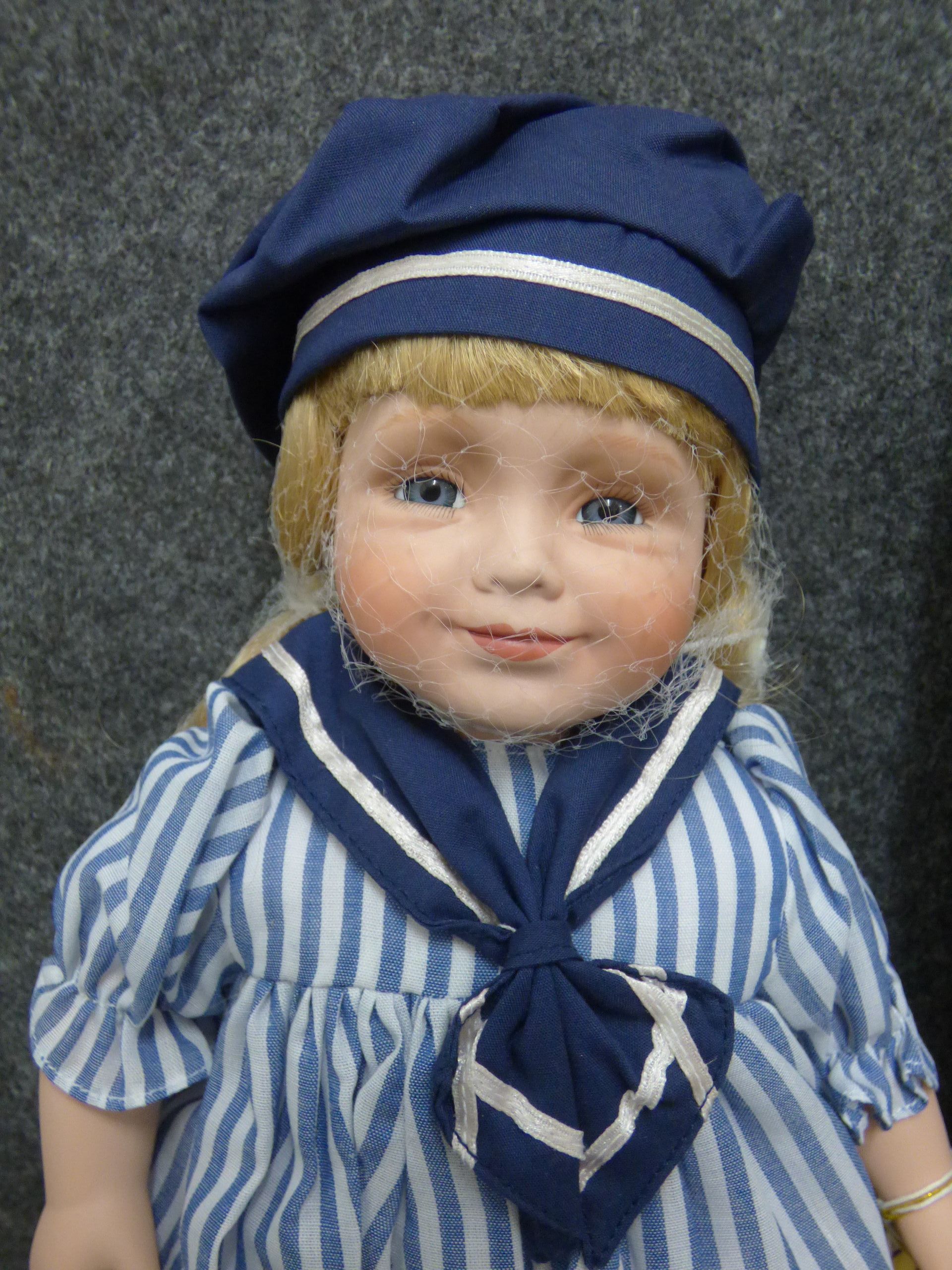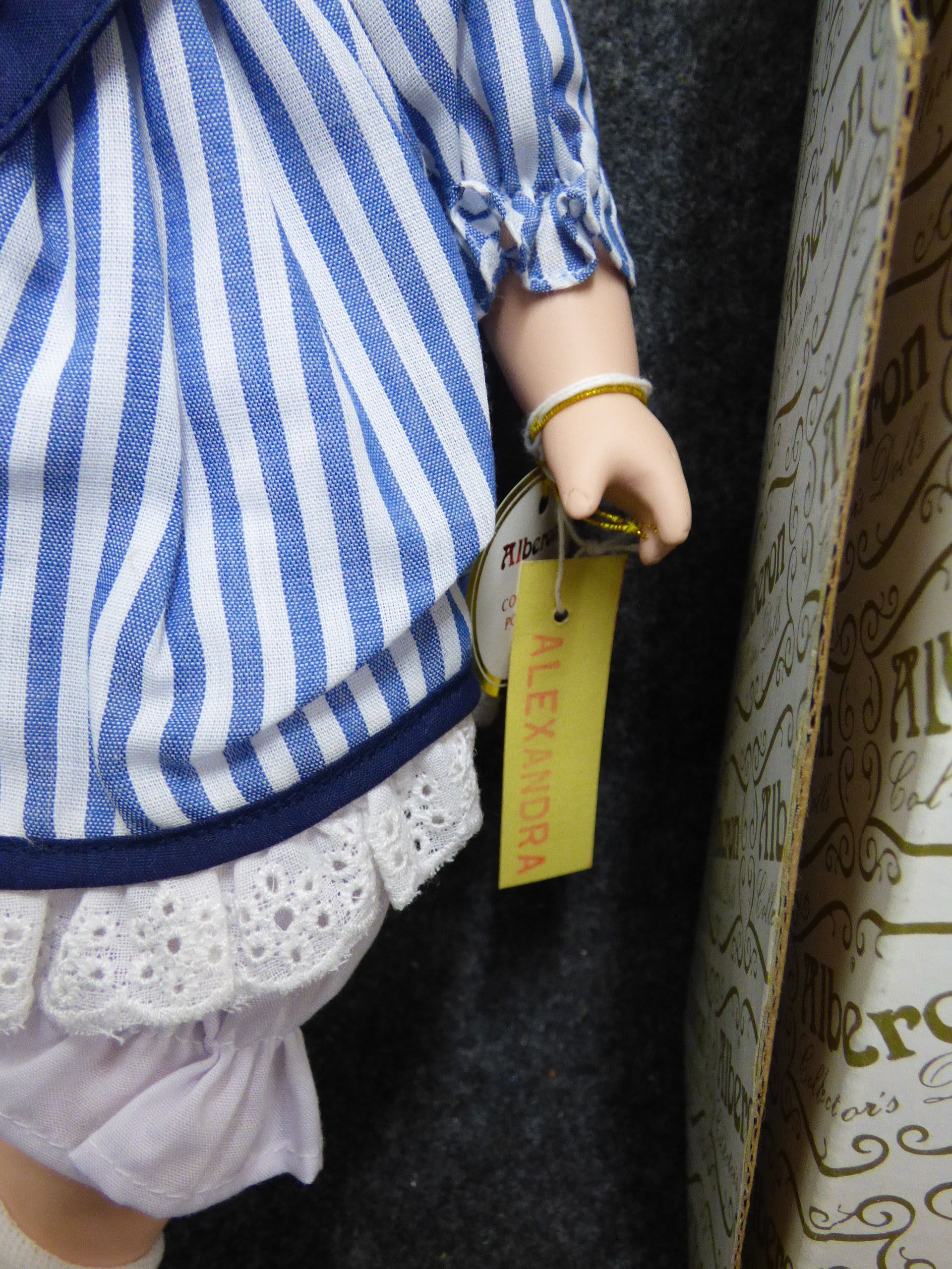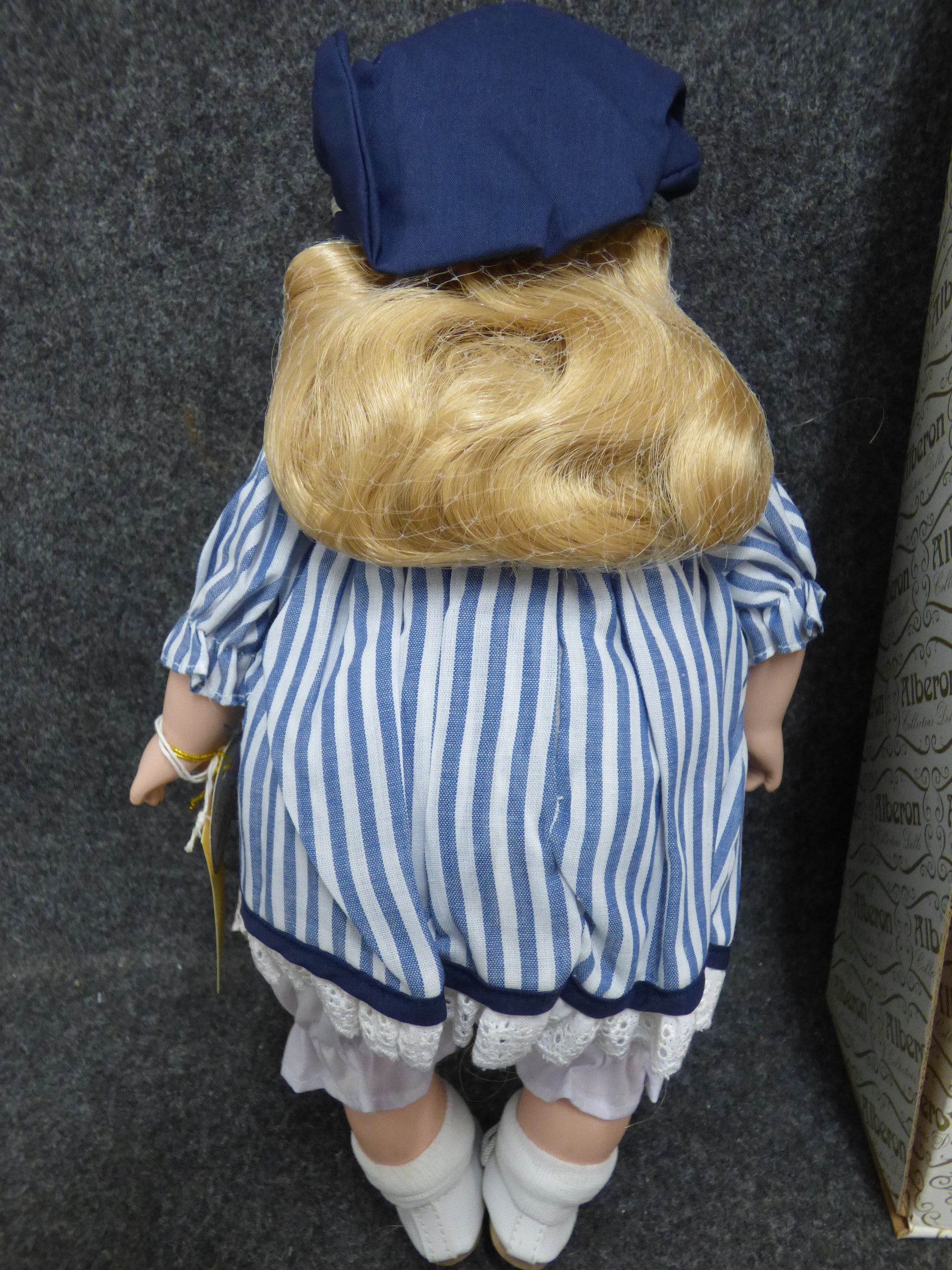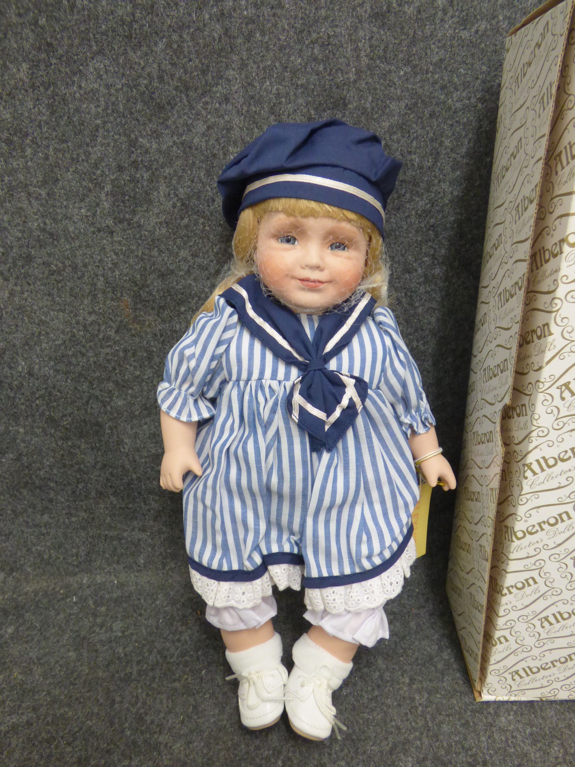 An Alberon porcelain collector doll named Alexandra wearing a blue and white striped sailor outfit with a matching hat, accompanied by its original patterned box. 34cm tall