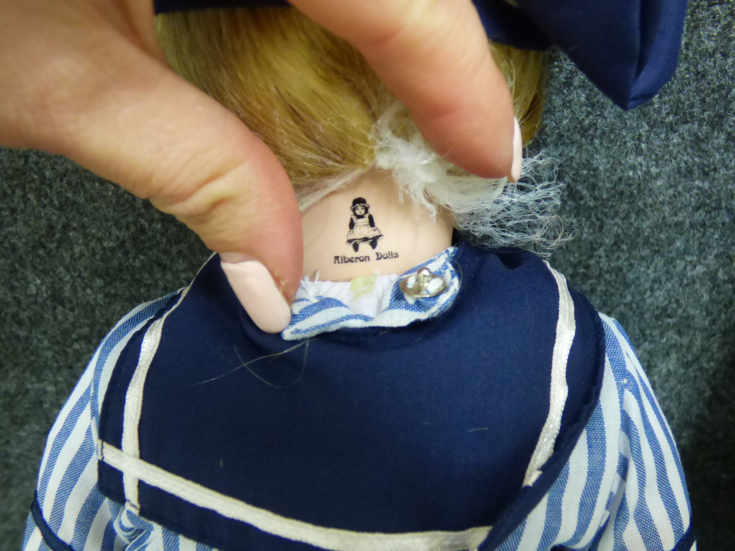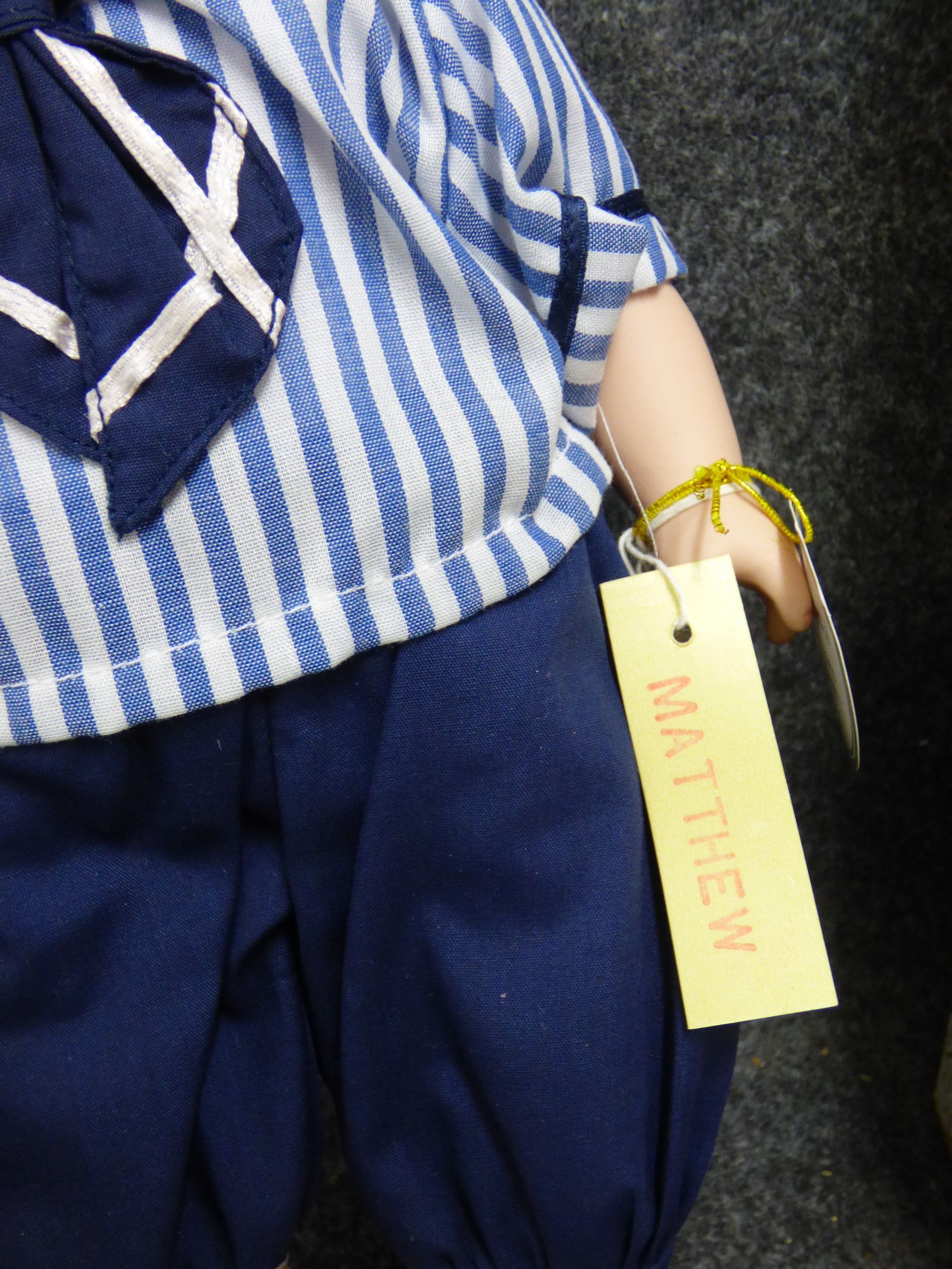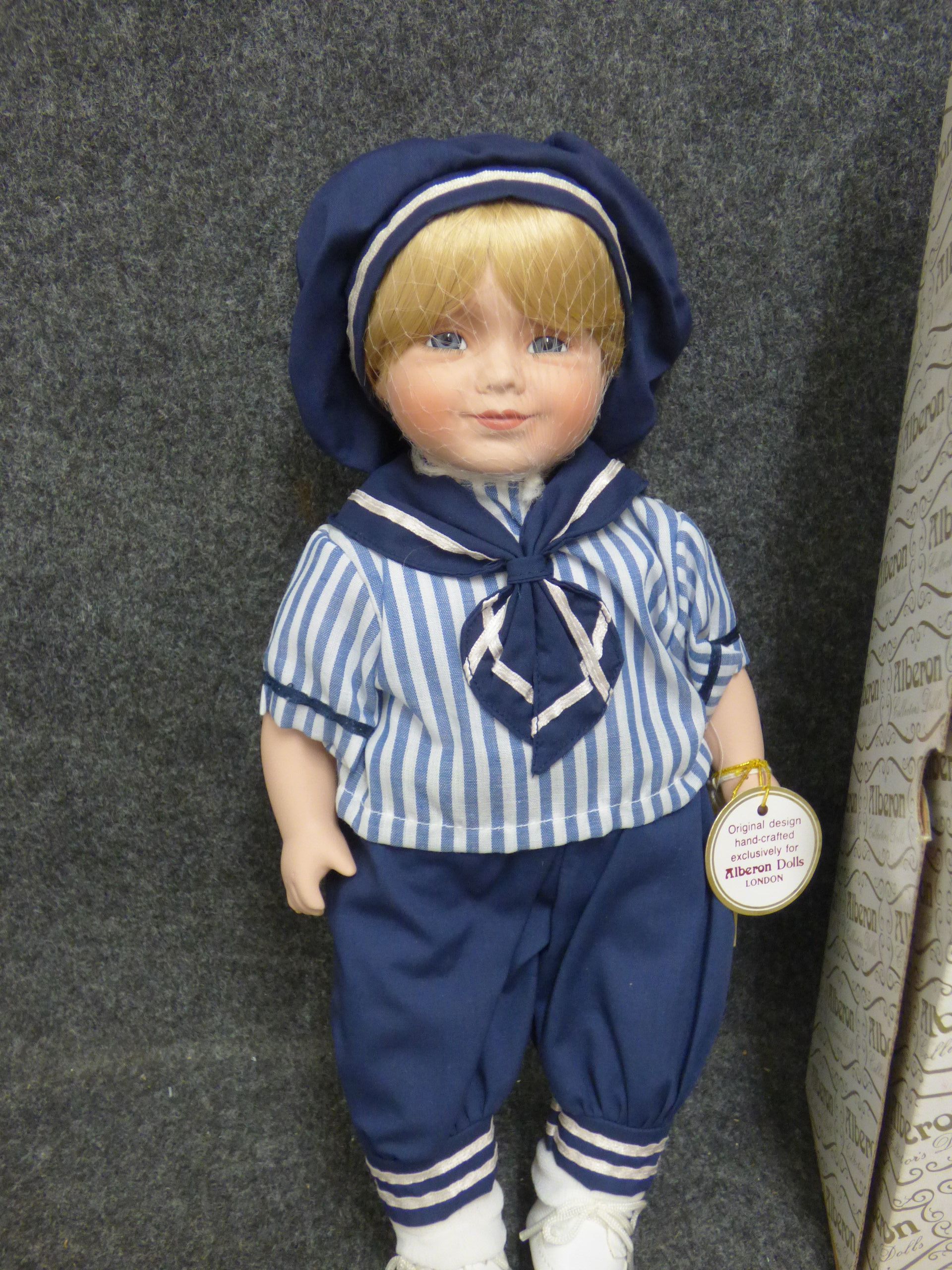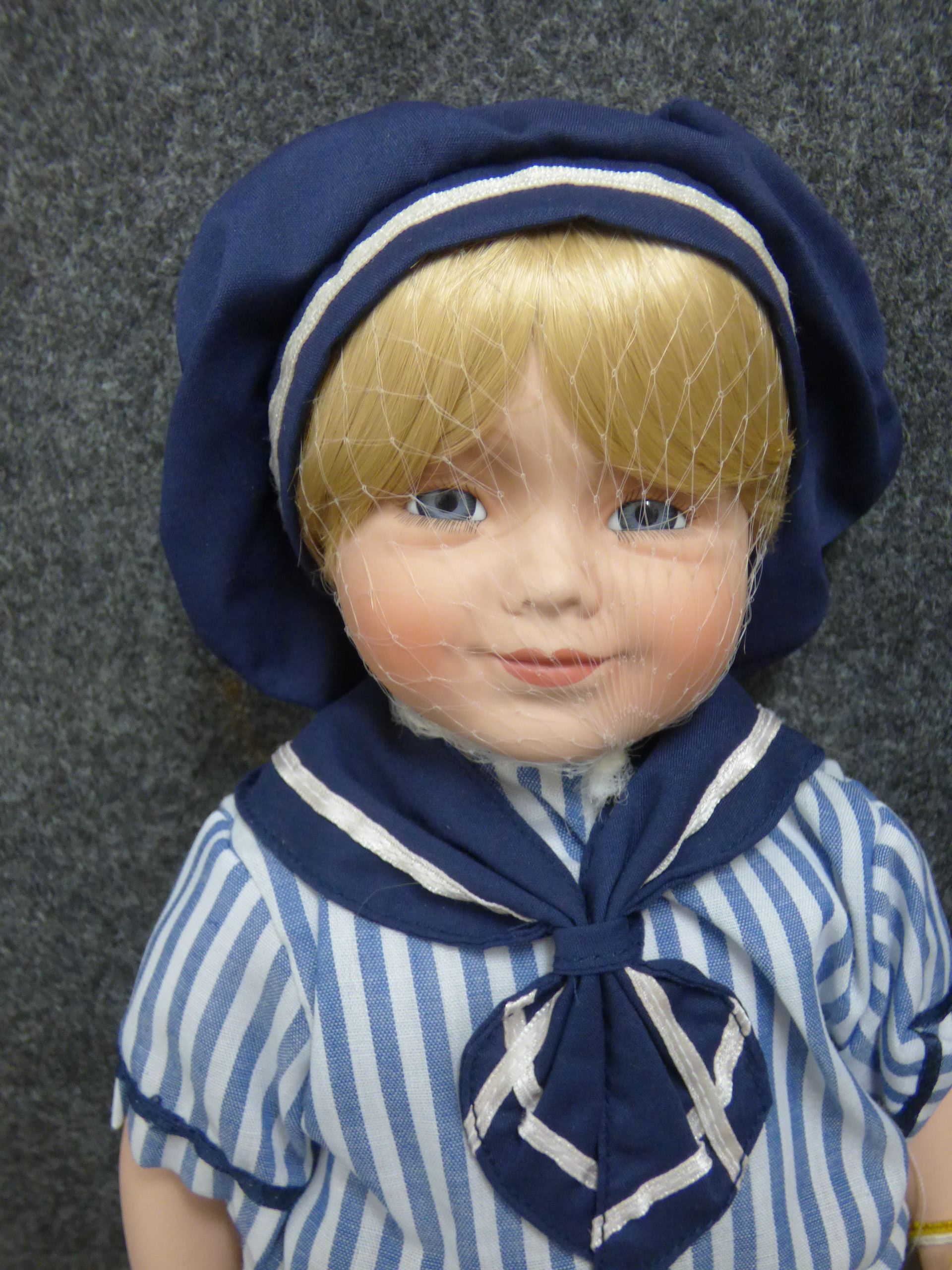 A porcelain collector doll named Matthew wearing a blue and white sailor outfit, complete with original hang tags and branded presentation box. 34cm tall
