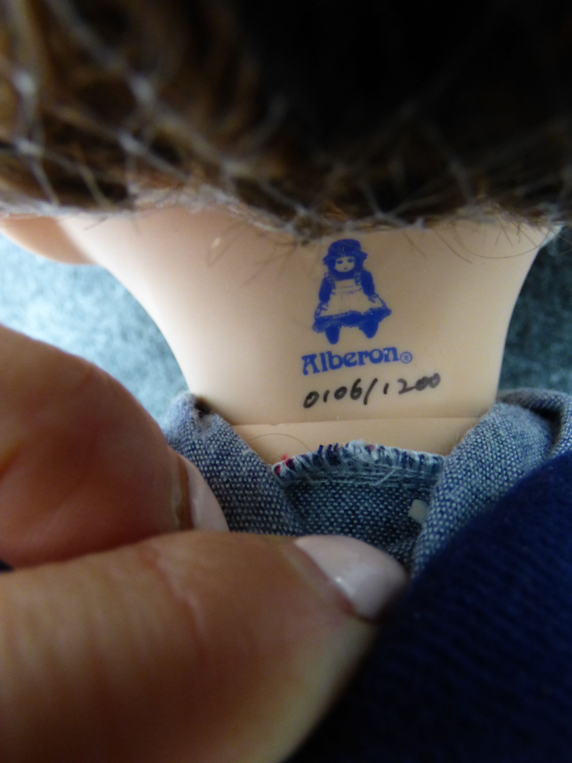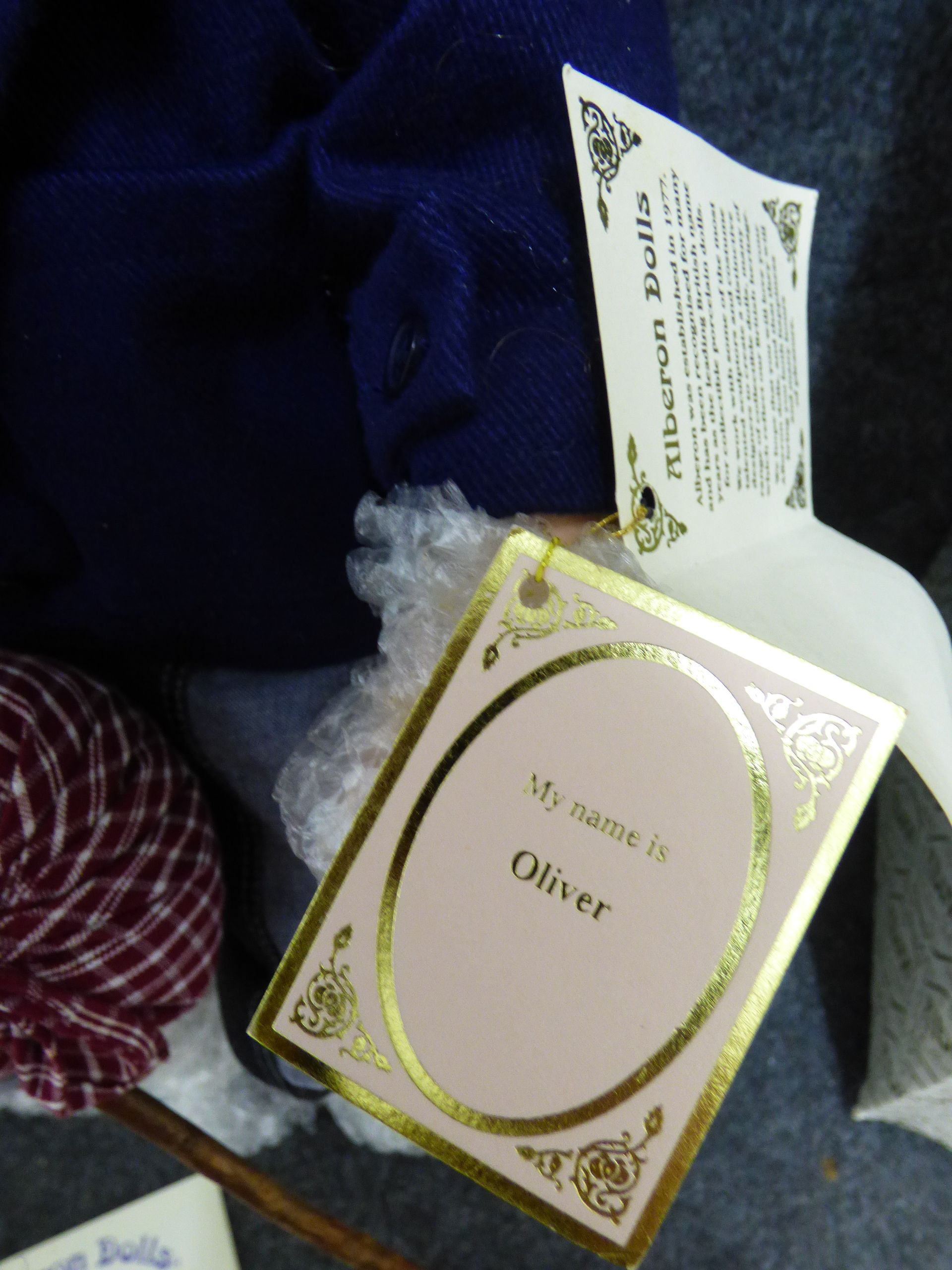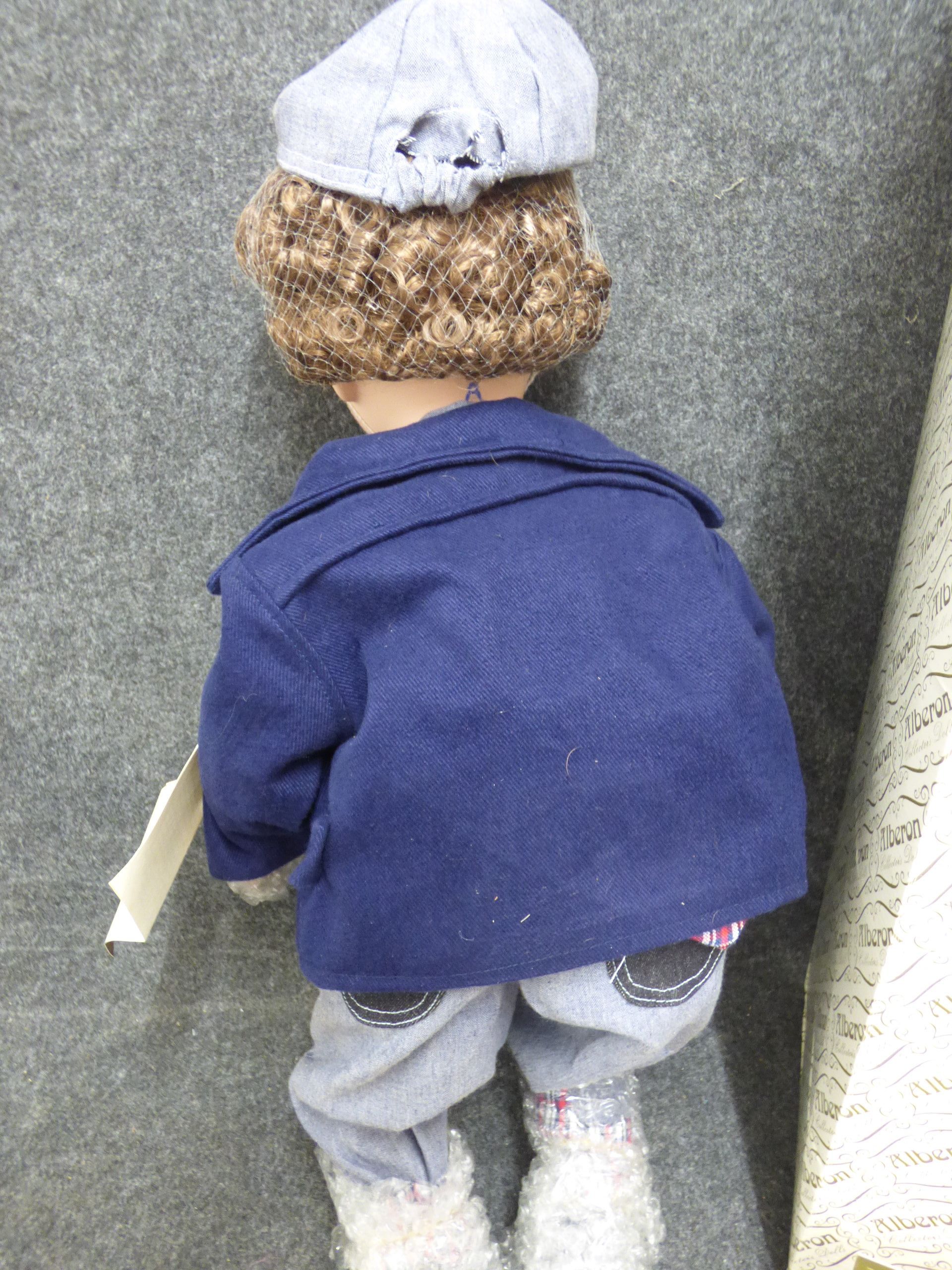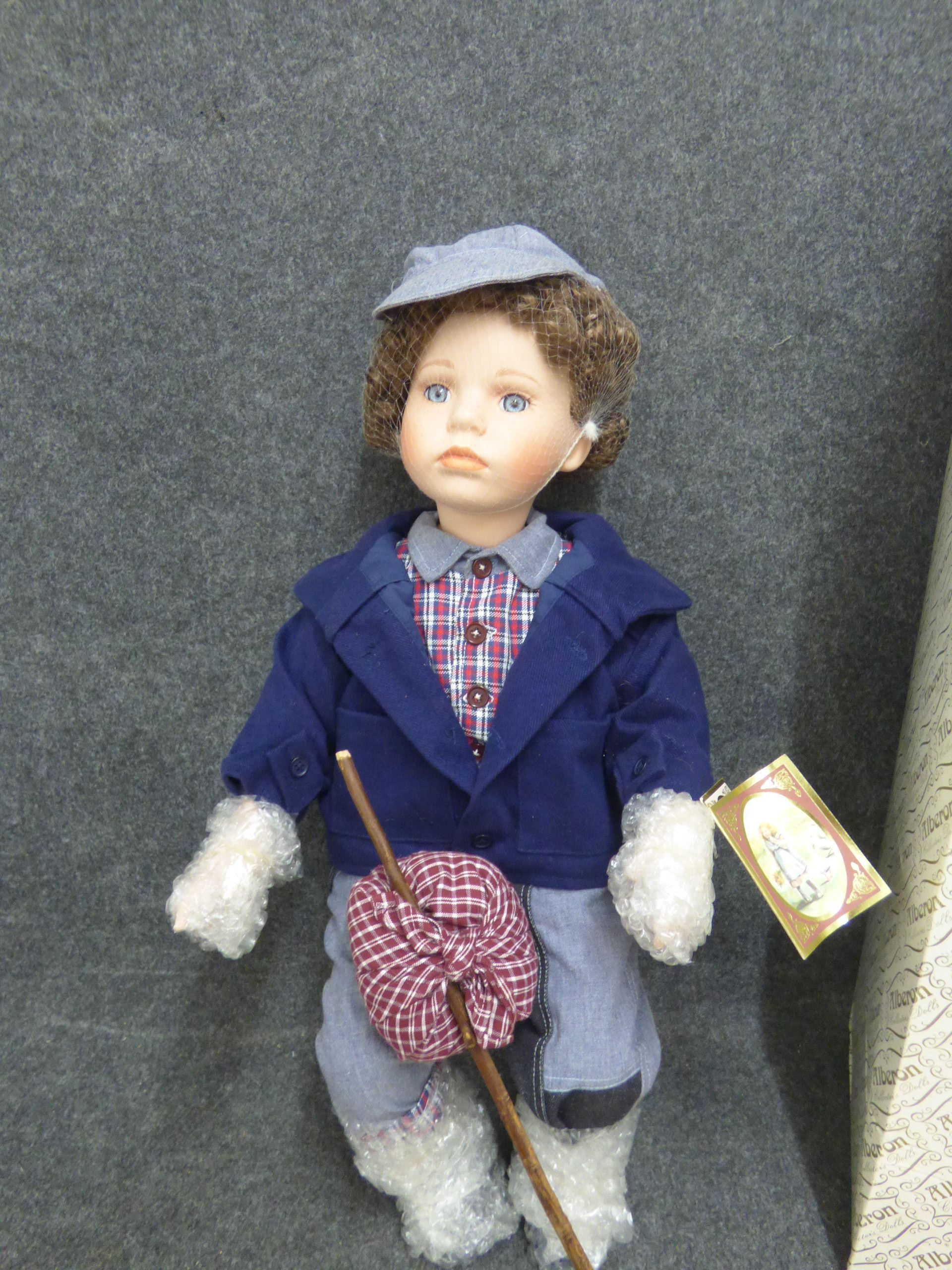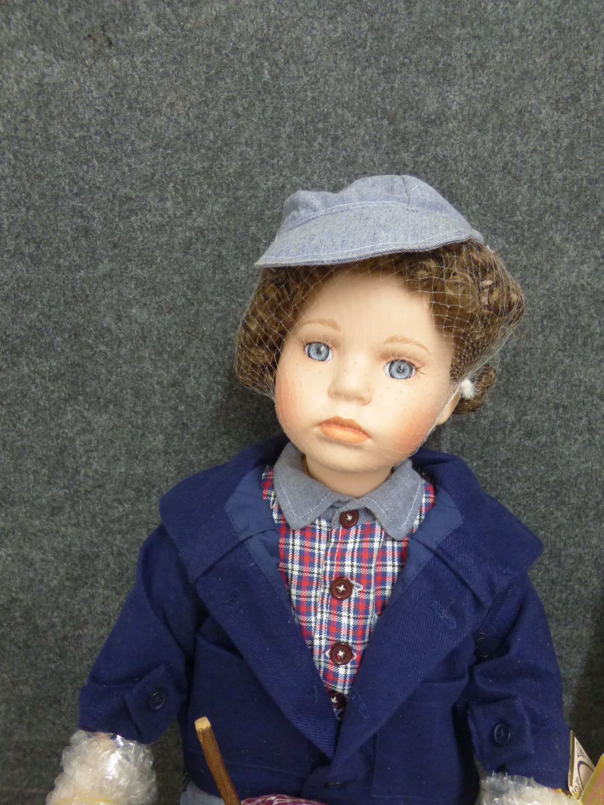 A limited edition porcelain boy doll named Oliver dressed in a navy blue jacket and plaid shirt, numbered 0106 of 1200, including original box and certificate of authenticity, weighing 2 lbs. 52cm tall