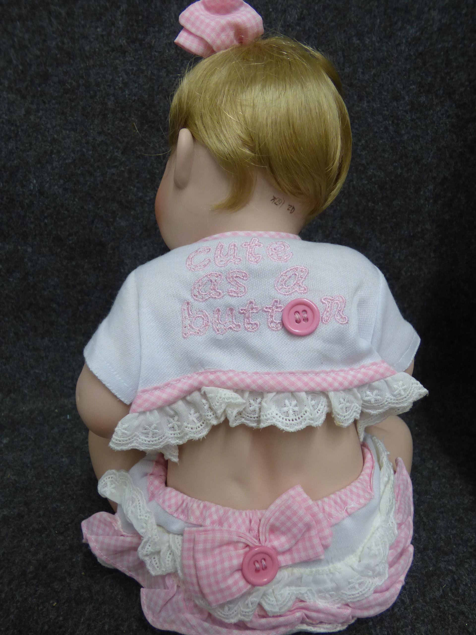 A 1993 Ashton-Drake Galleries Barely Yours collection doll by artist Titus Tomescu wearing a white and pink gingham outfit with its original box.