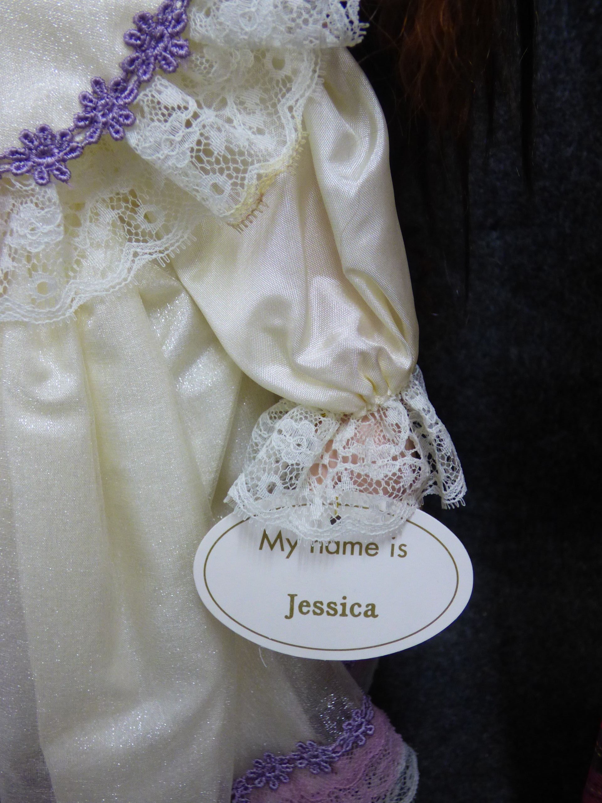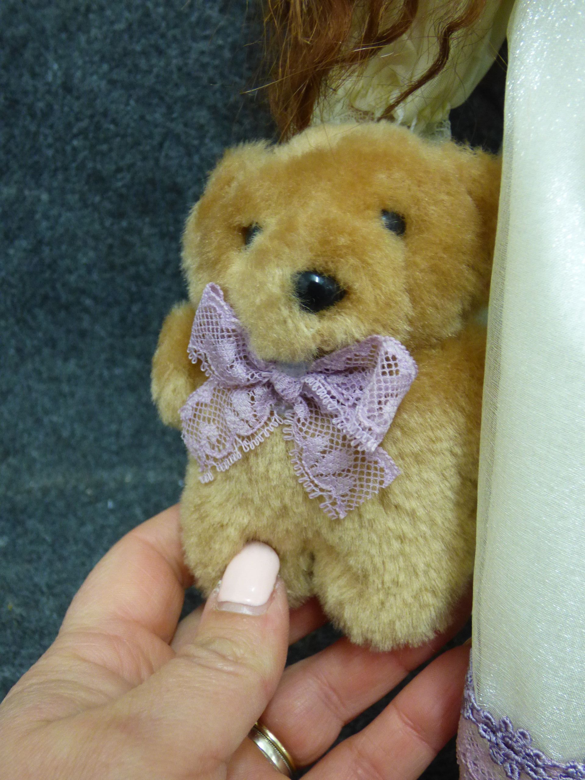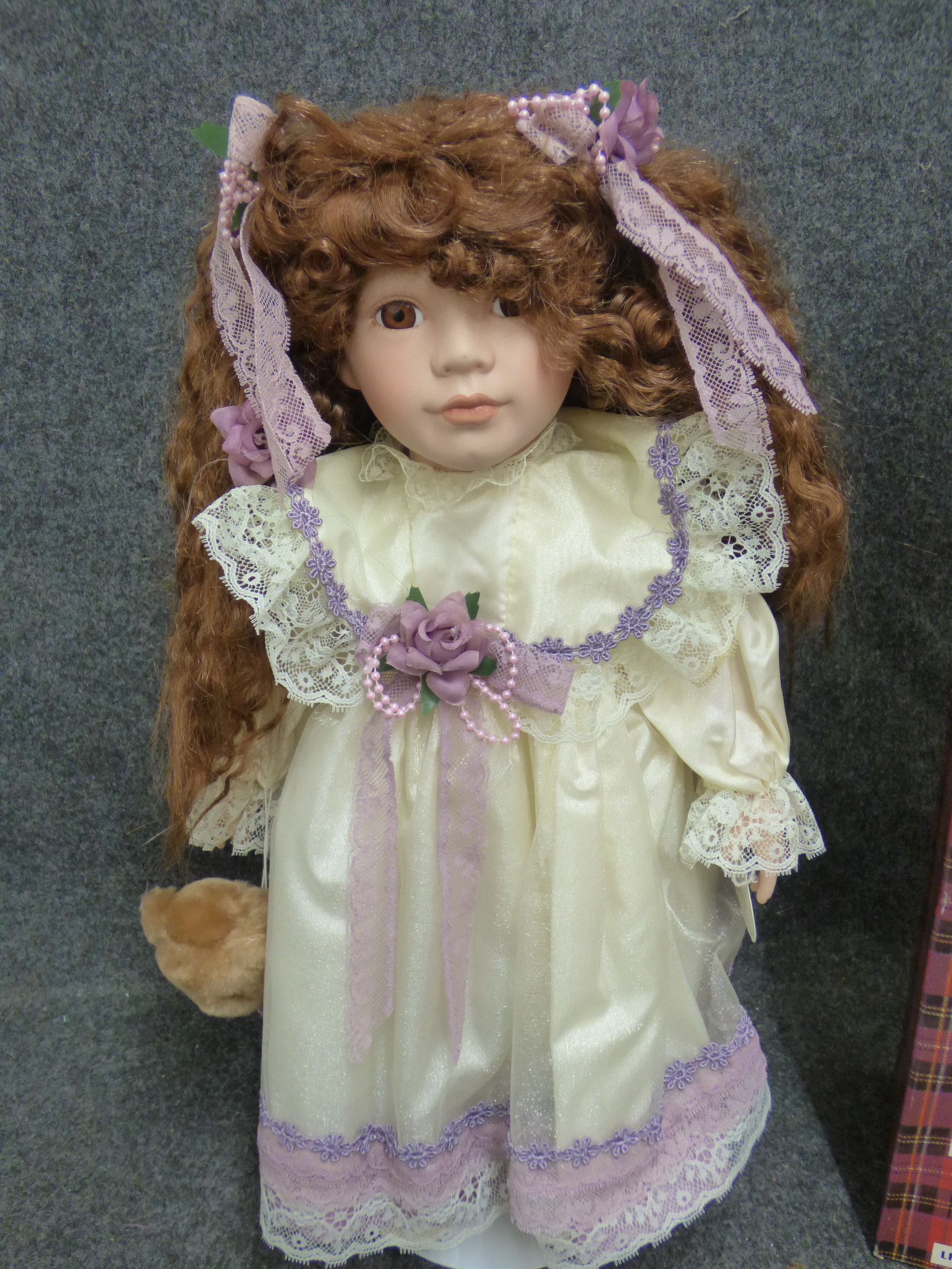 A Jessica porcelain doll from The Leonardo Collection wearing a cream lace gown with lavender accents, accompanied by a small brown teddy bear and original red plaid box. (Not original box) 40cm tall