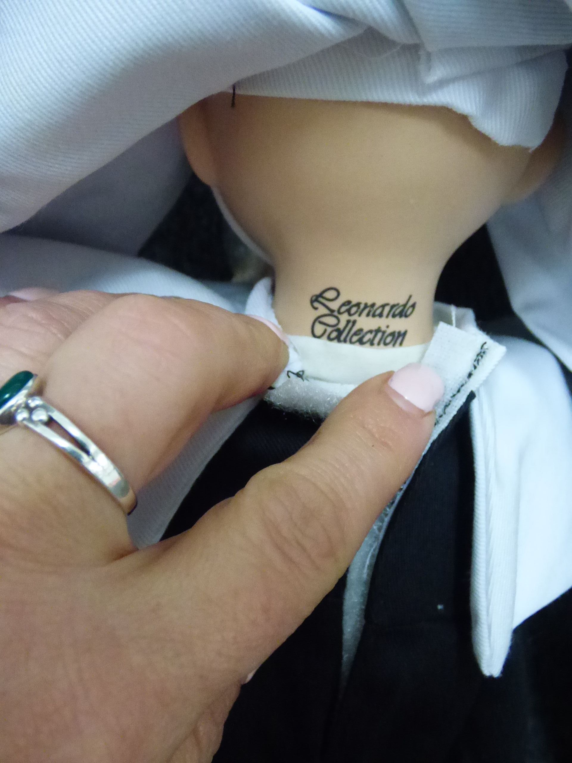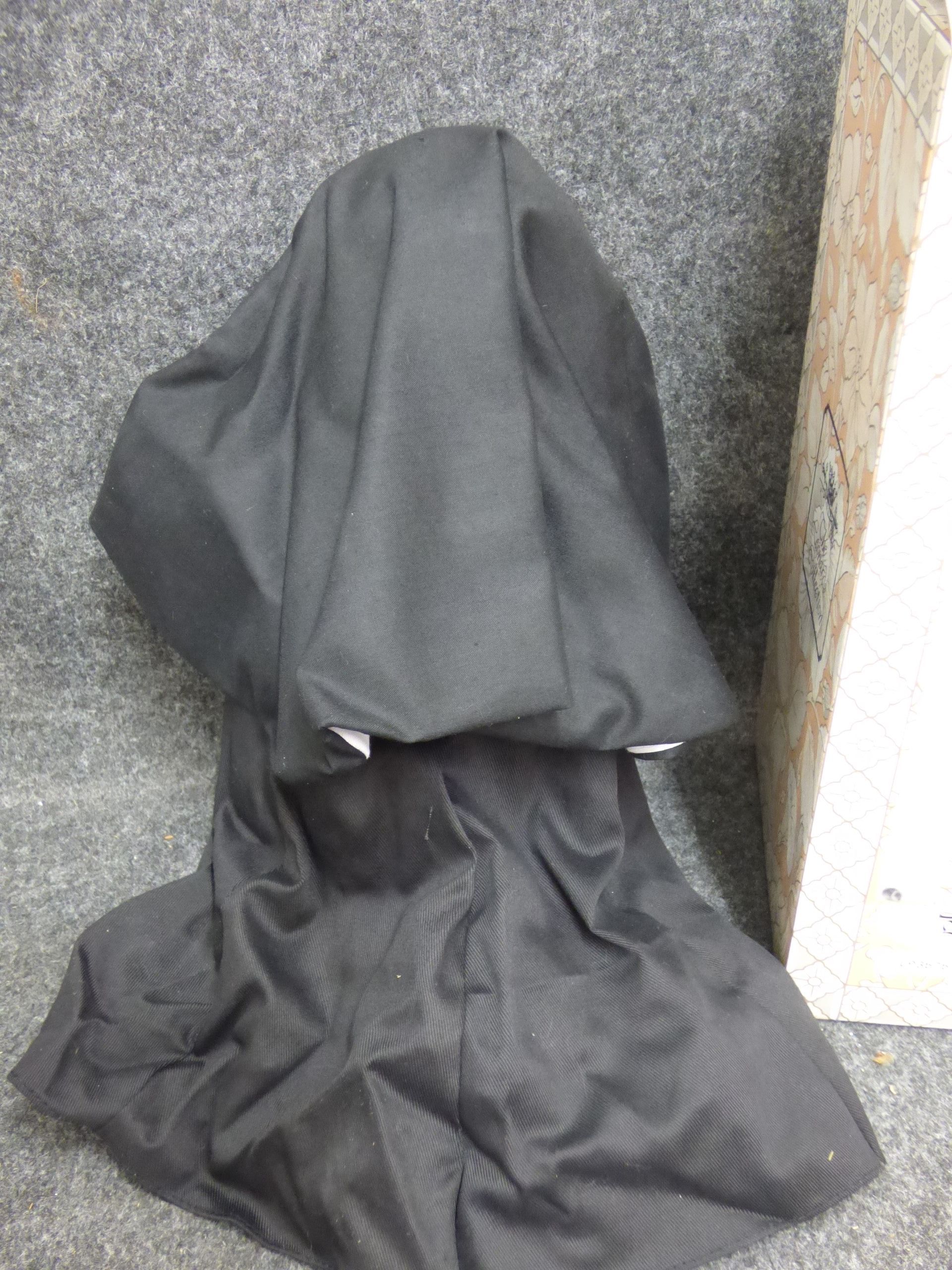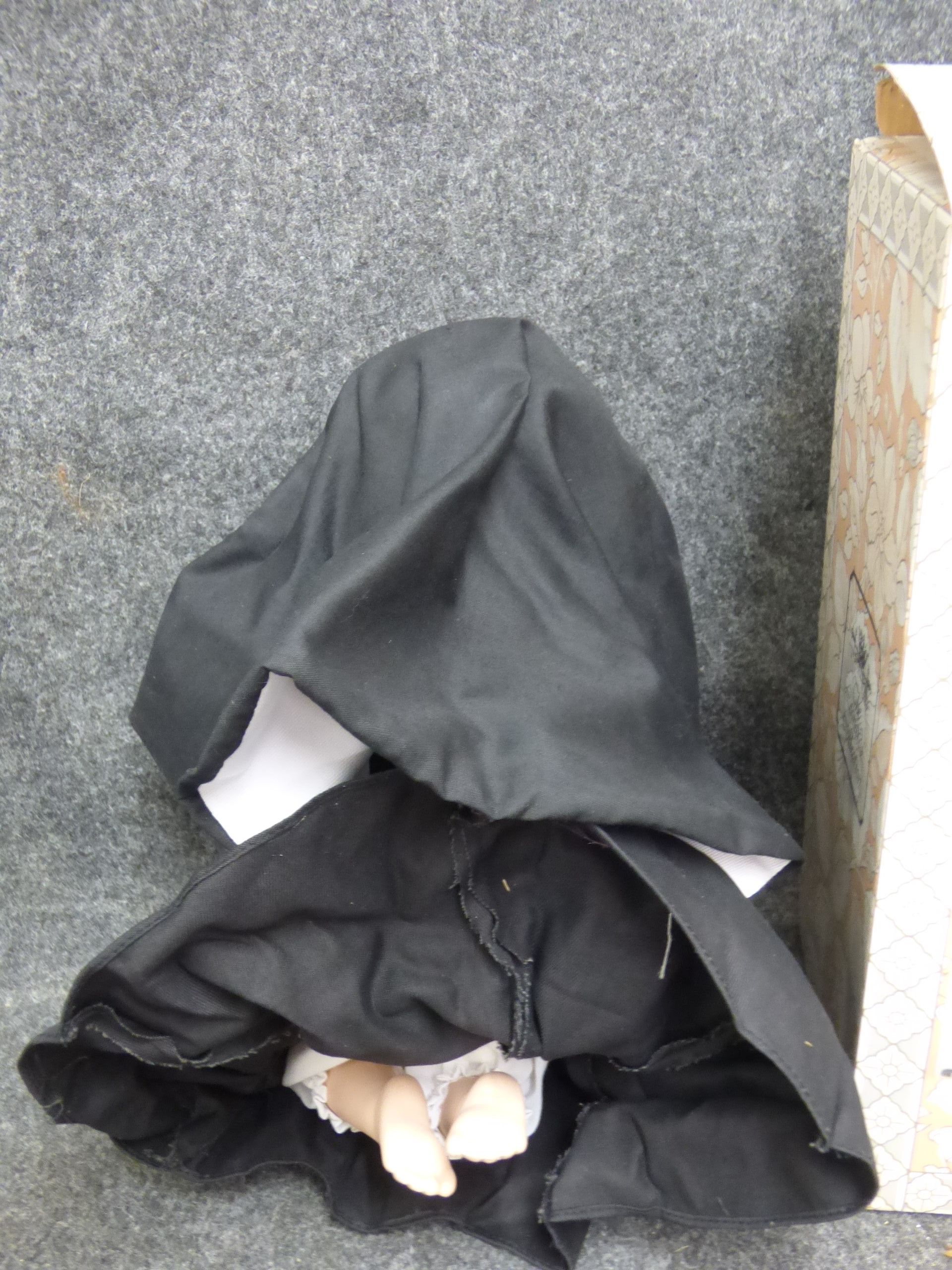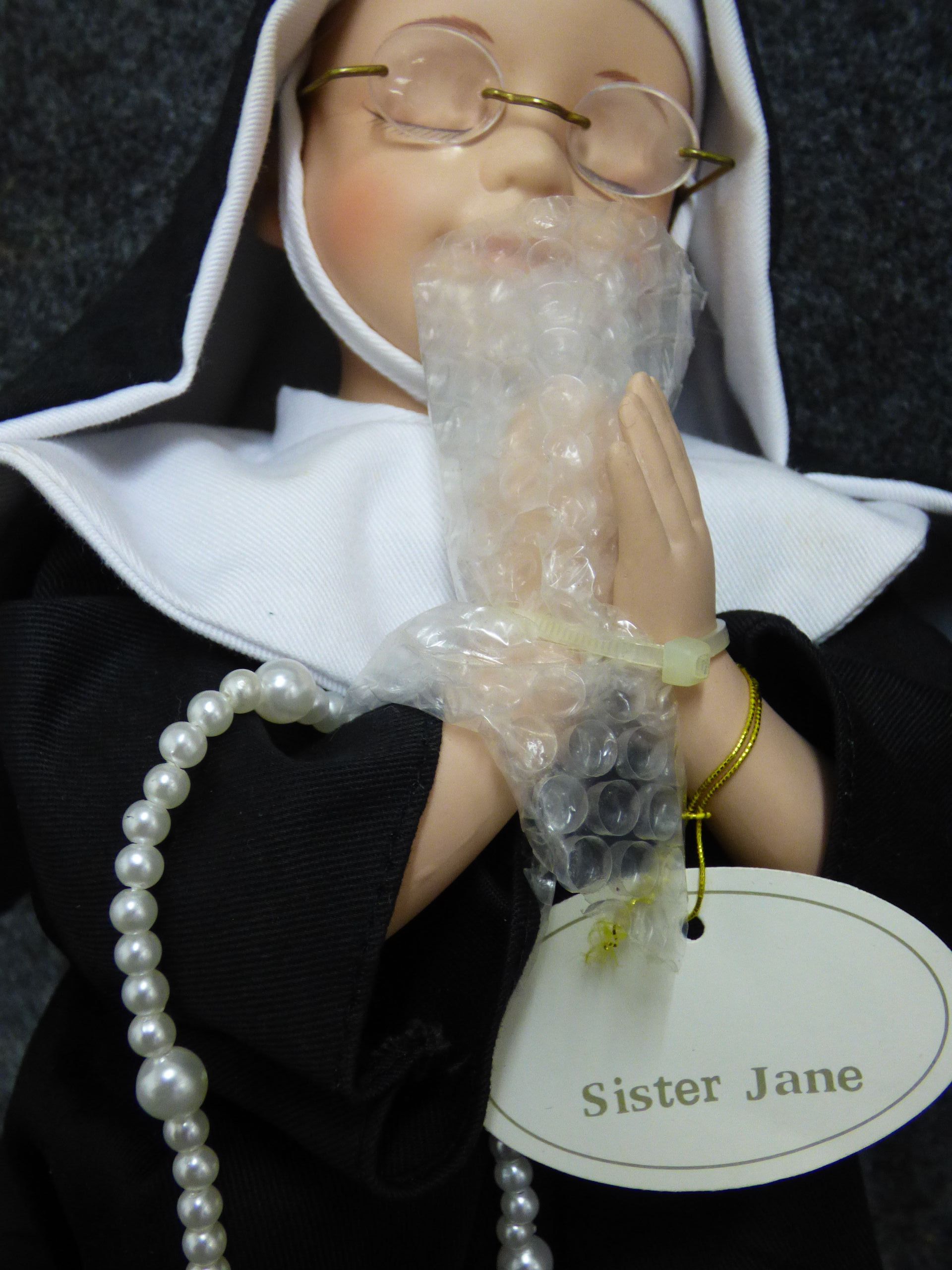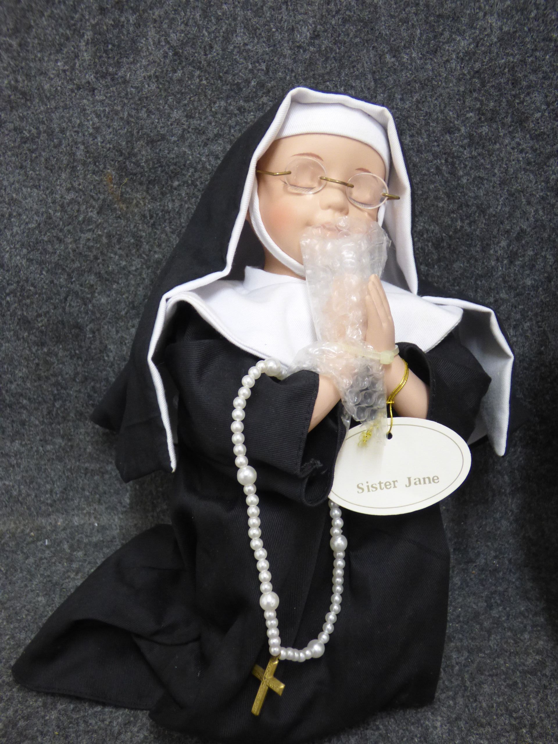 A porcelain nun doll named Sister Jane from The Leonardo Collection, featuring a black and white habit, wire-rimmed glasses, and faux pearl rosary beads, accompanied by its original decorative box marked LP3575. 28cm tall