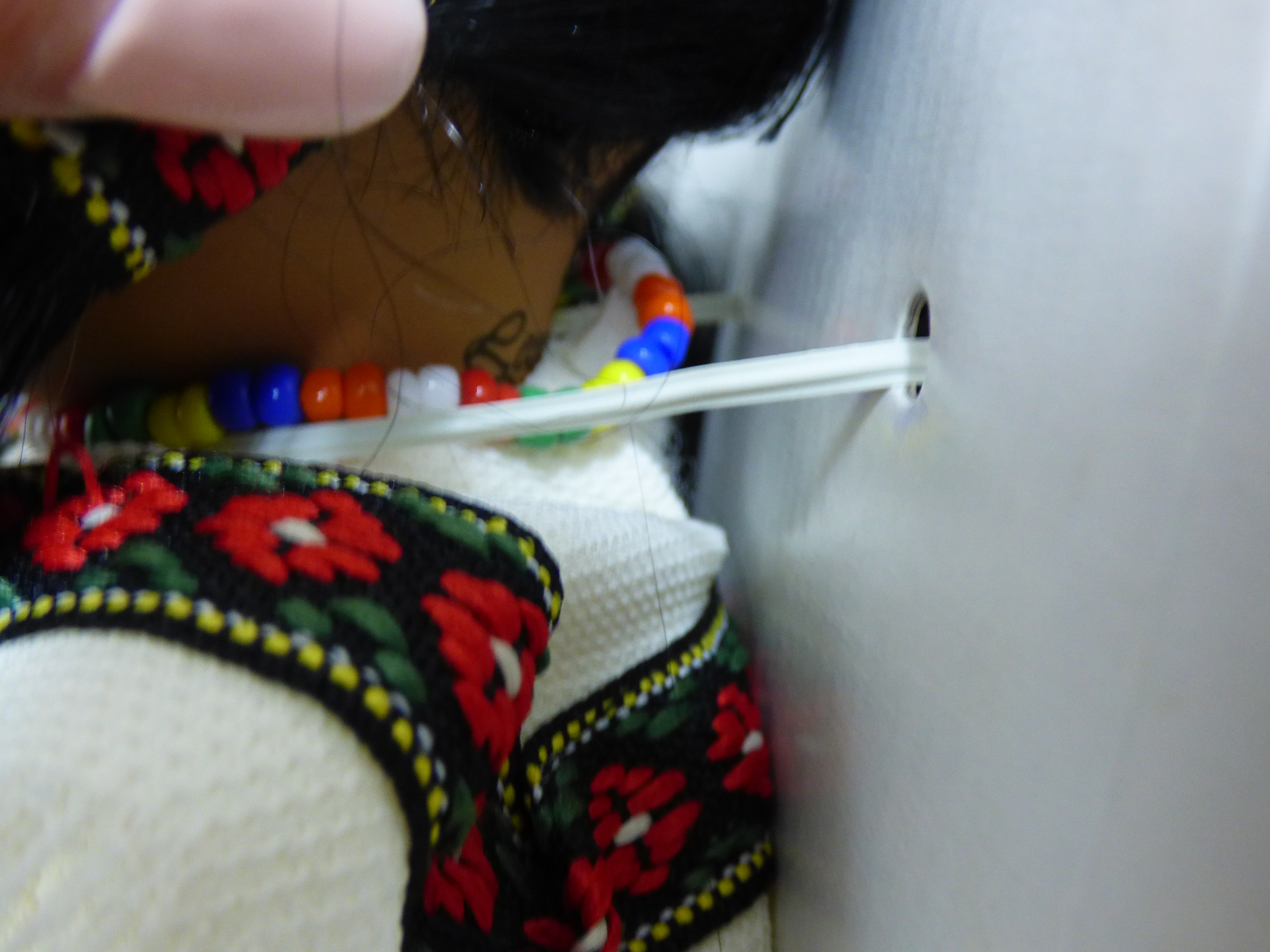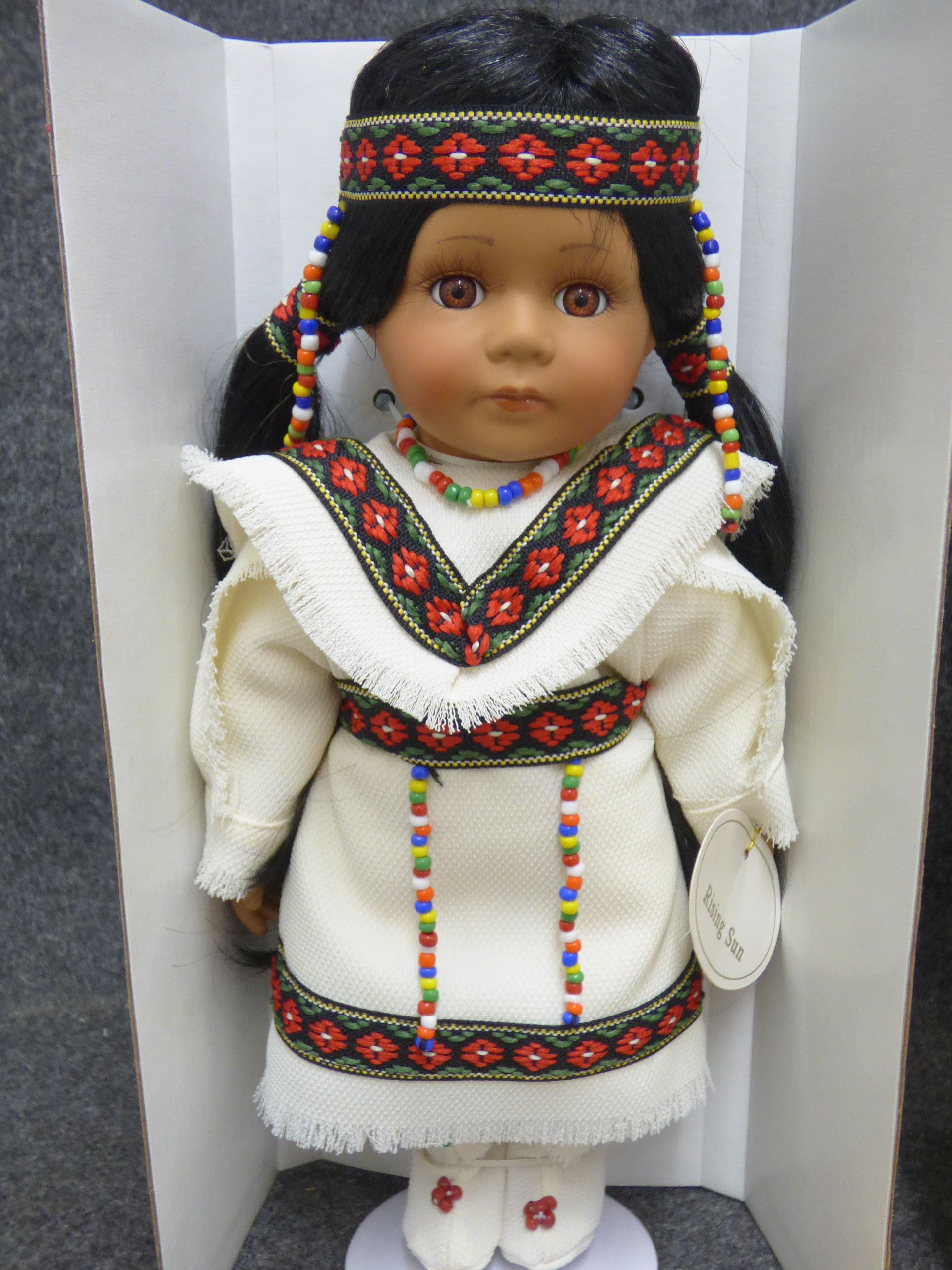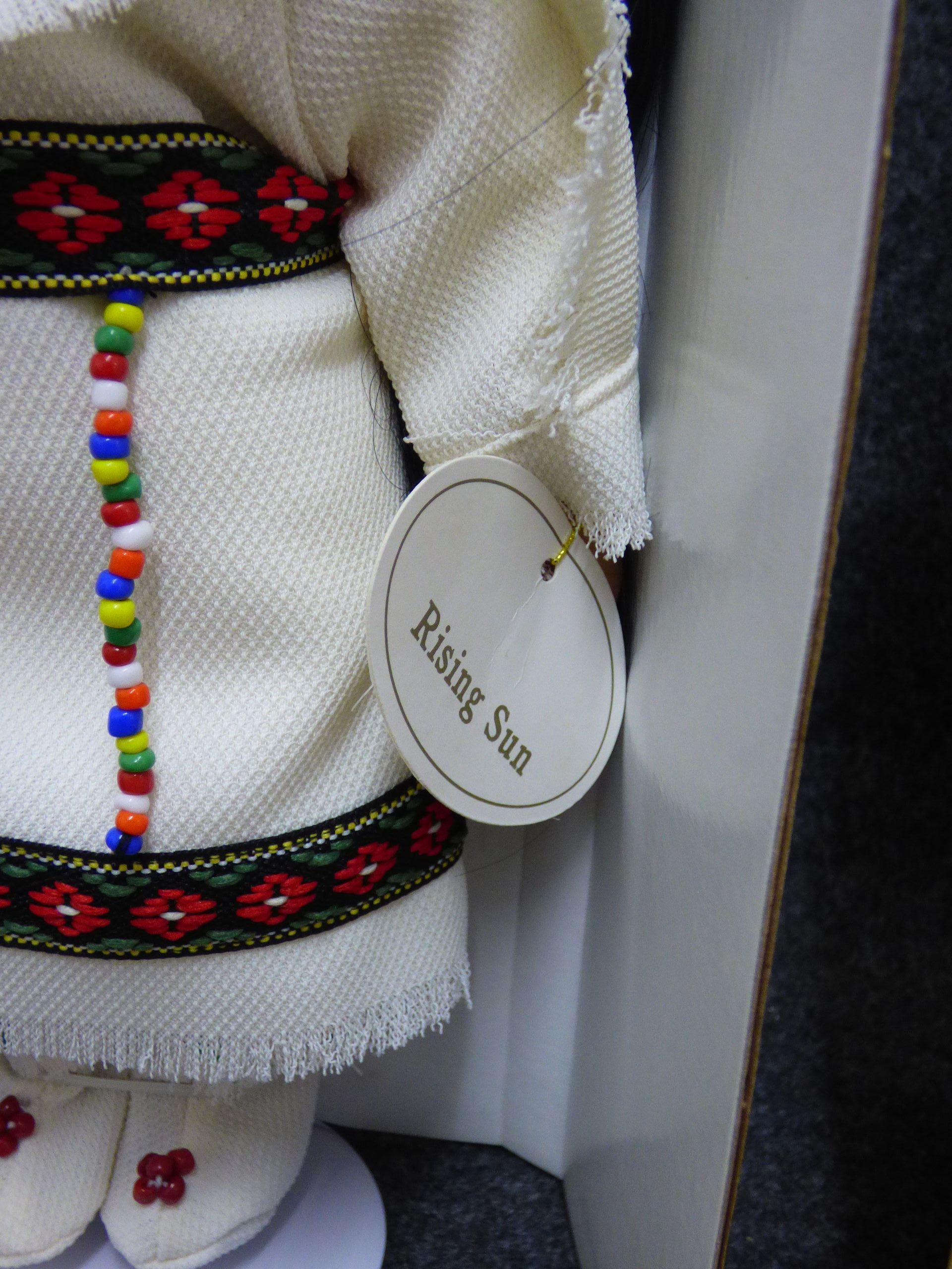 A porcelain doll named Rising Sun wearing a white fringed outfit with floral embroidery and bead accents, complete with its original box and certificate. 32cm tall