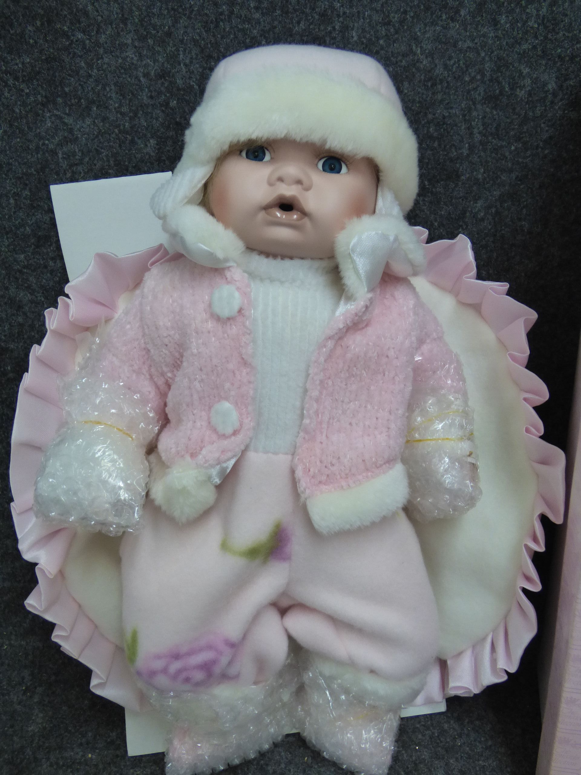 A porcelain baby doll wearing a pink and white outfit with a matching hat, accompanied by its original box and a certificate of authenticity. 43cm tall