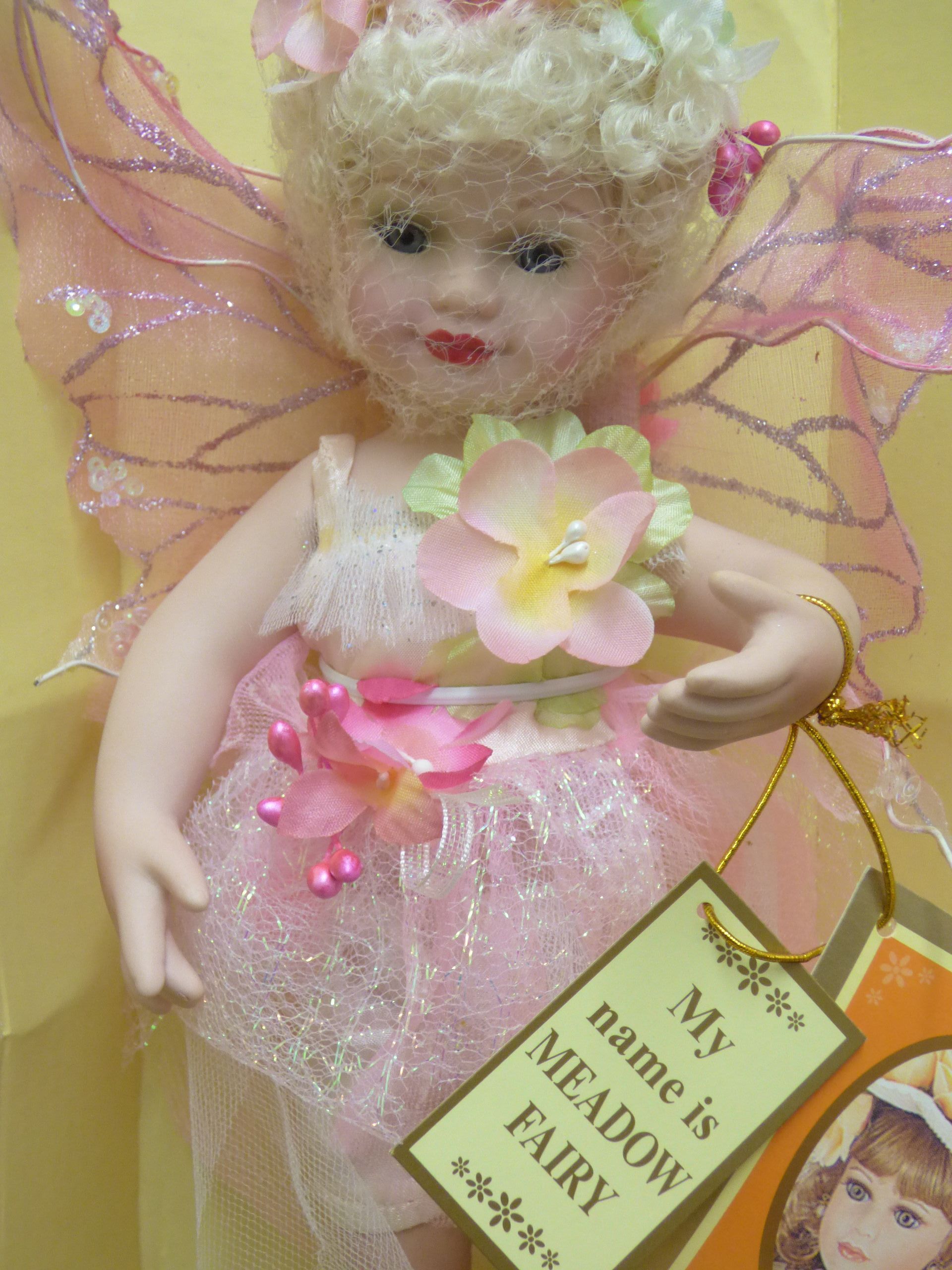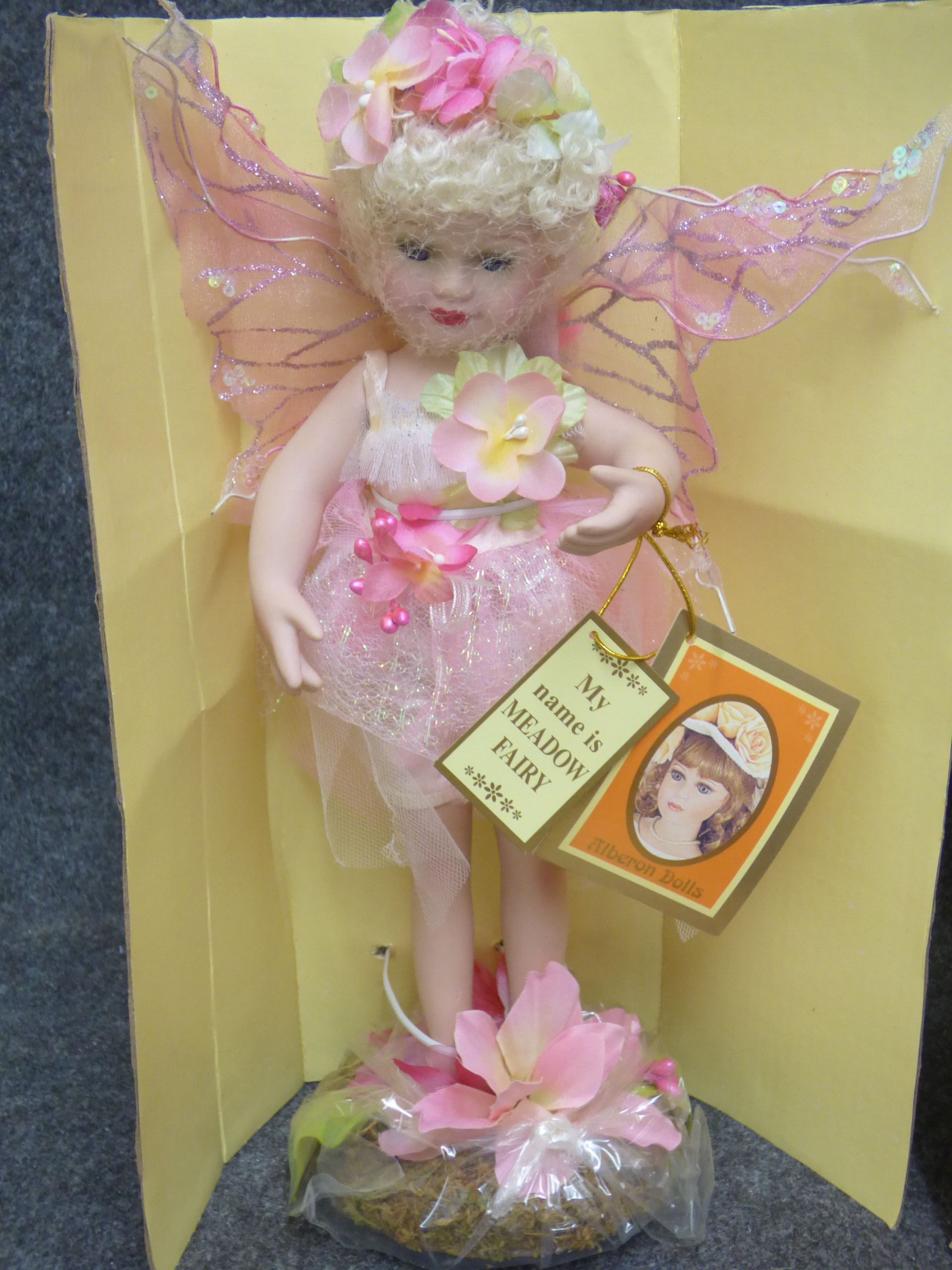 A pink and white porcelain fairy doll featuring blonde hair and wings, complete with its original orange box and Certificate of Authenticity. 33cm tall