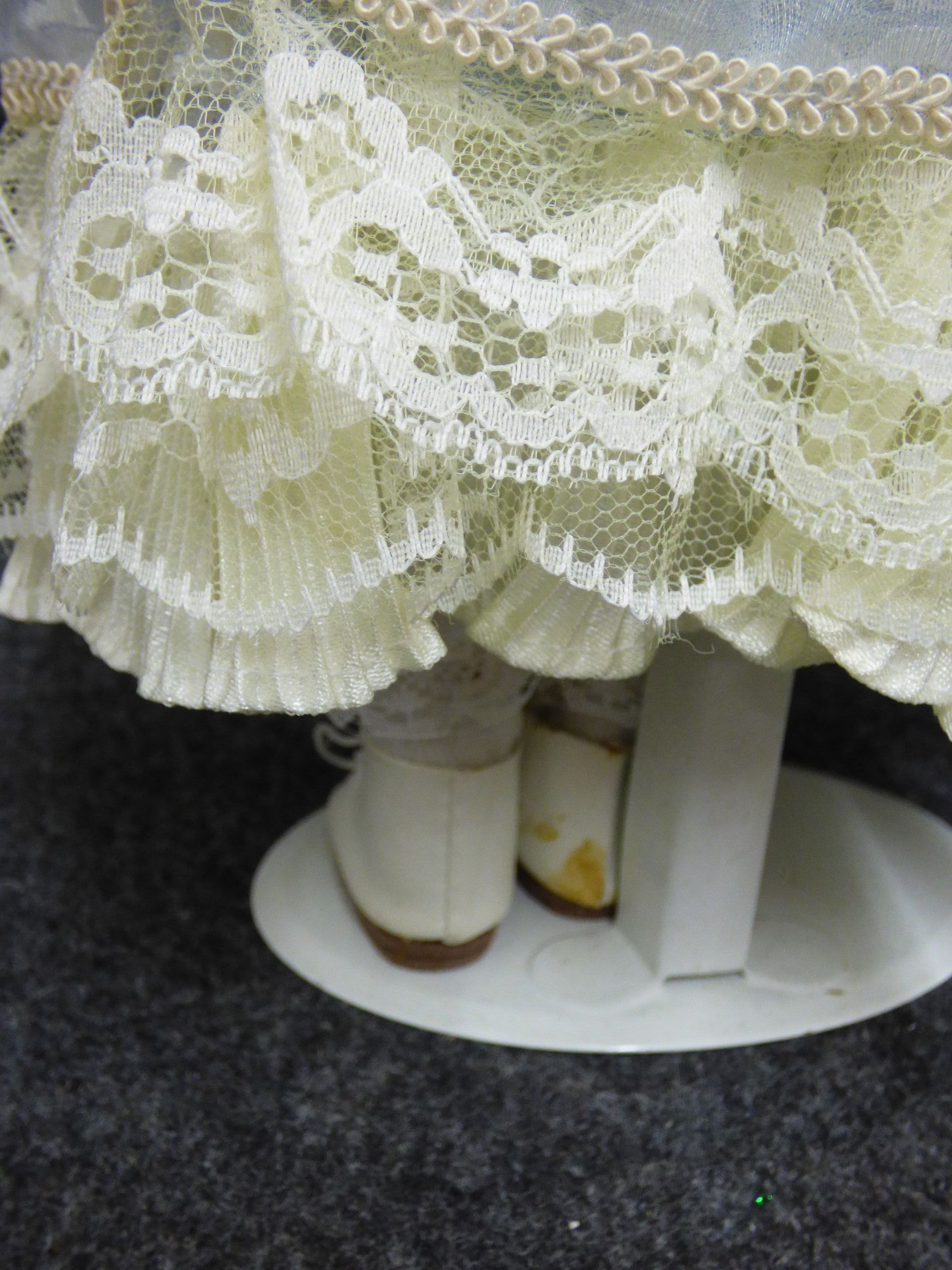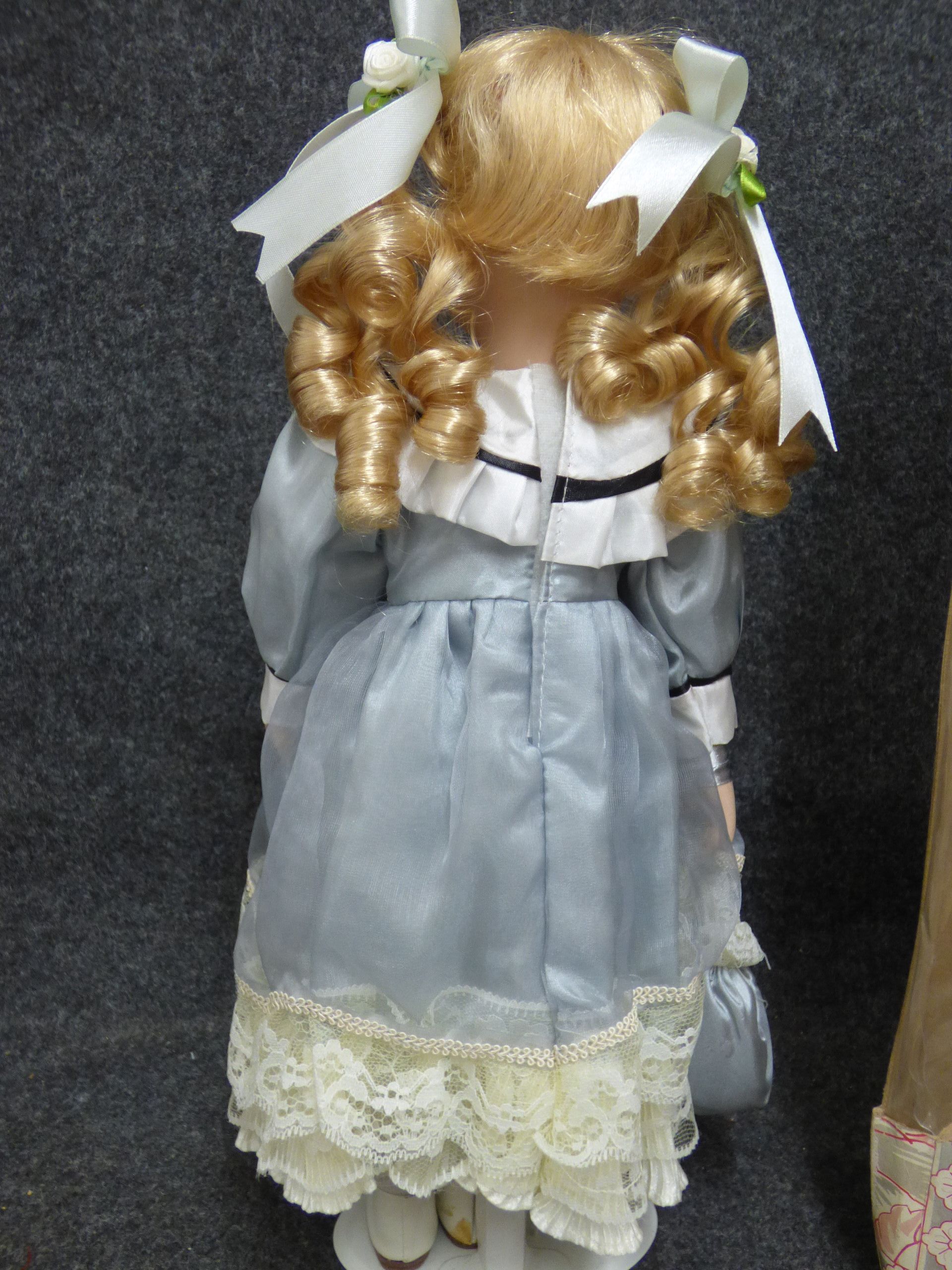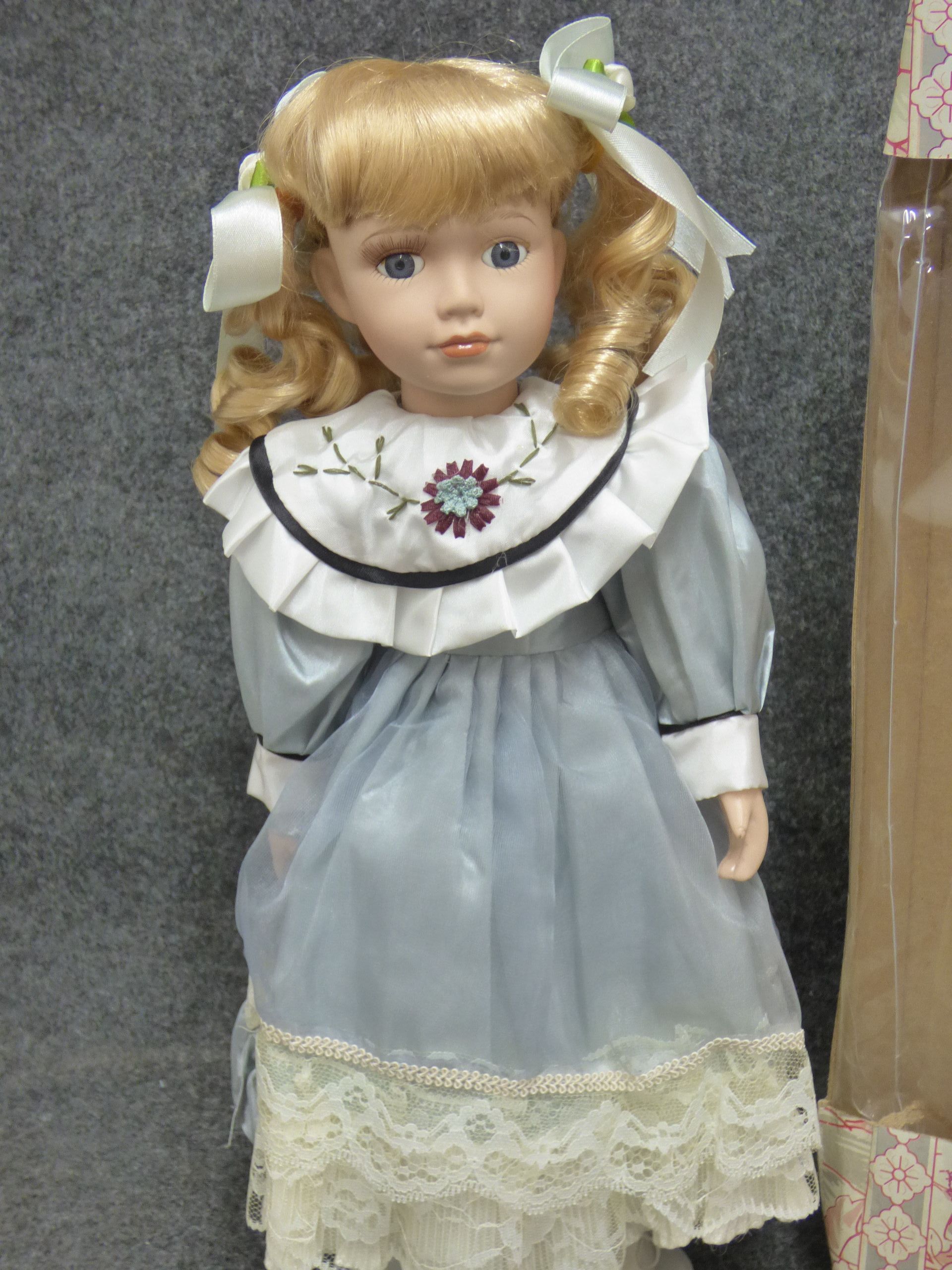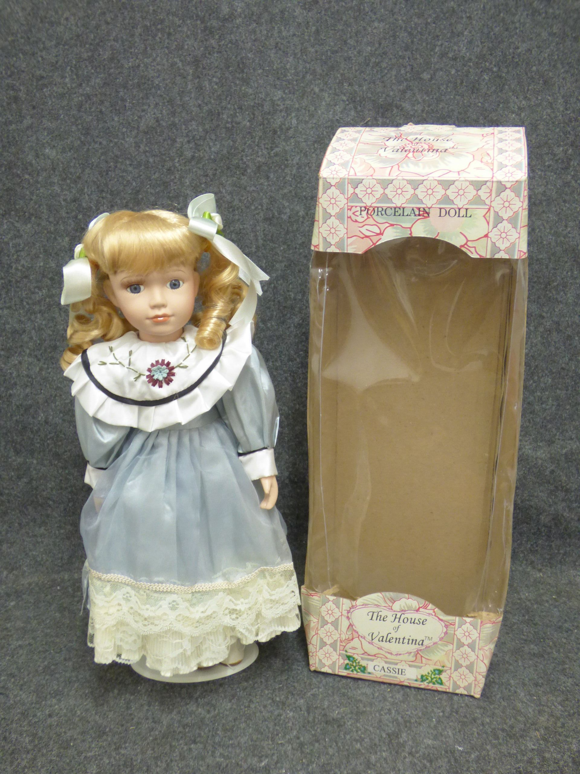A blonde porcelain doll named Cassie wearing a light blue and white lace-trimmed dress, accompanied by its original branded display box. 38cm tall