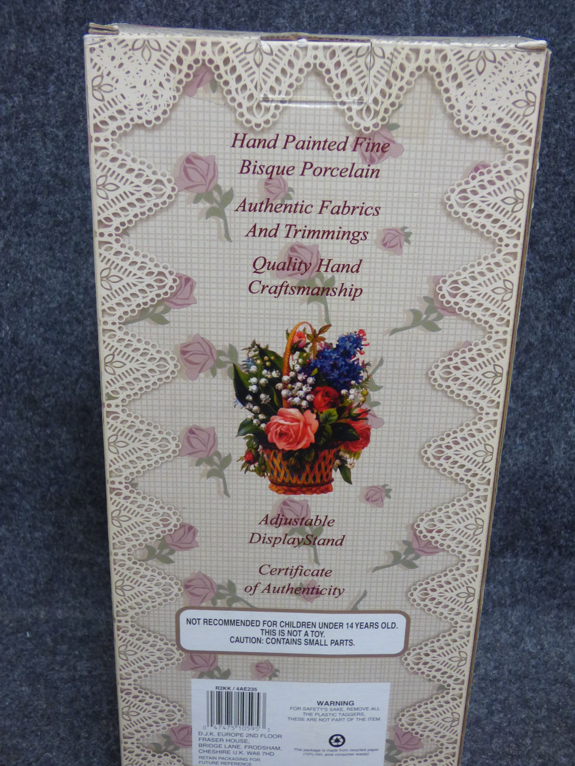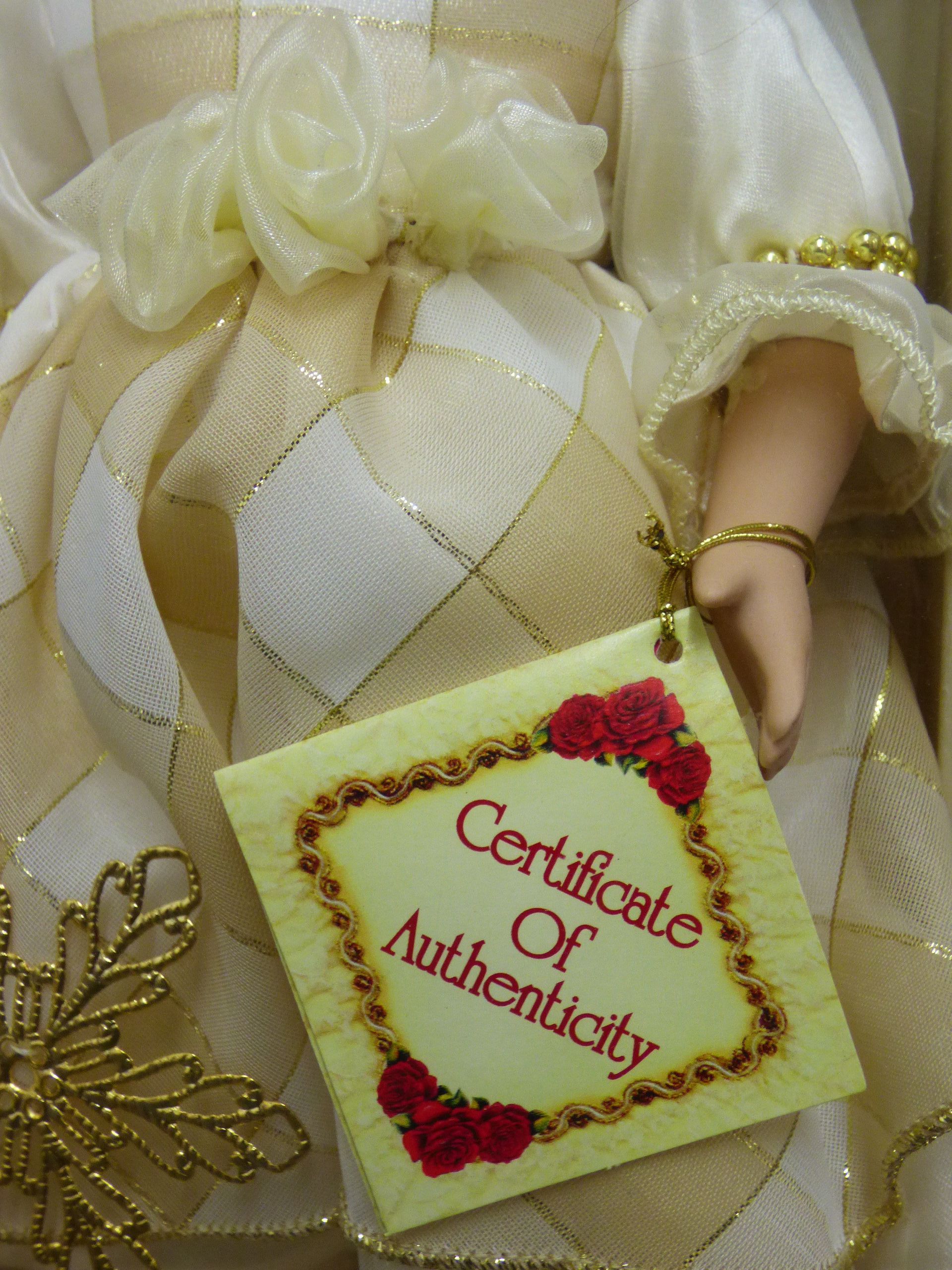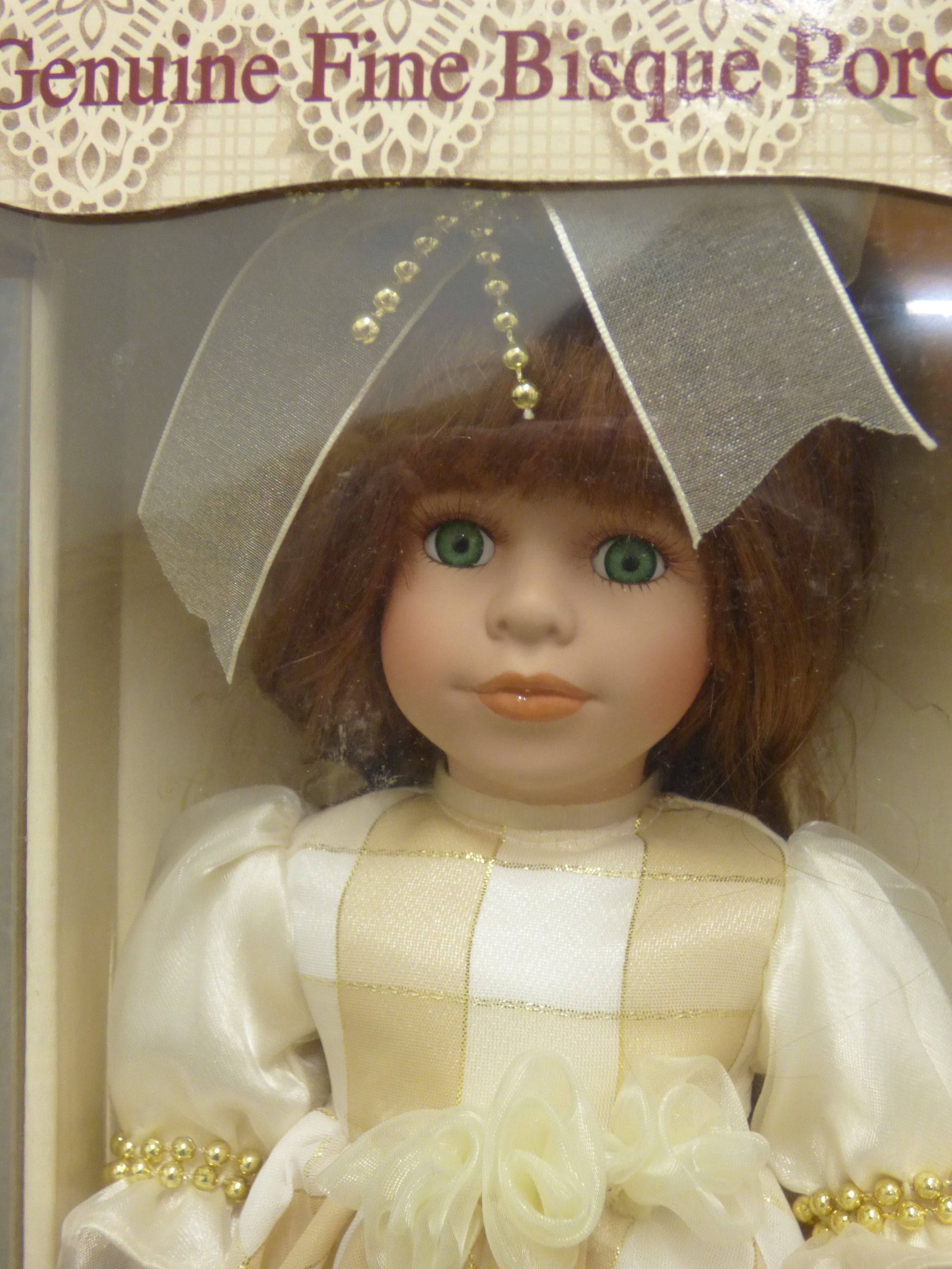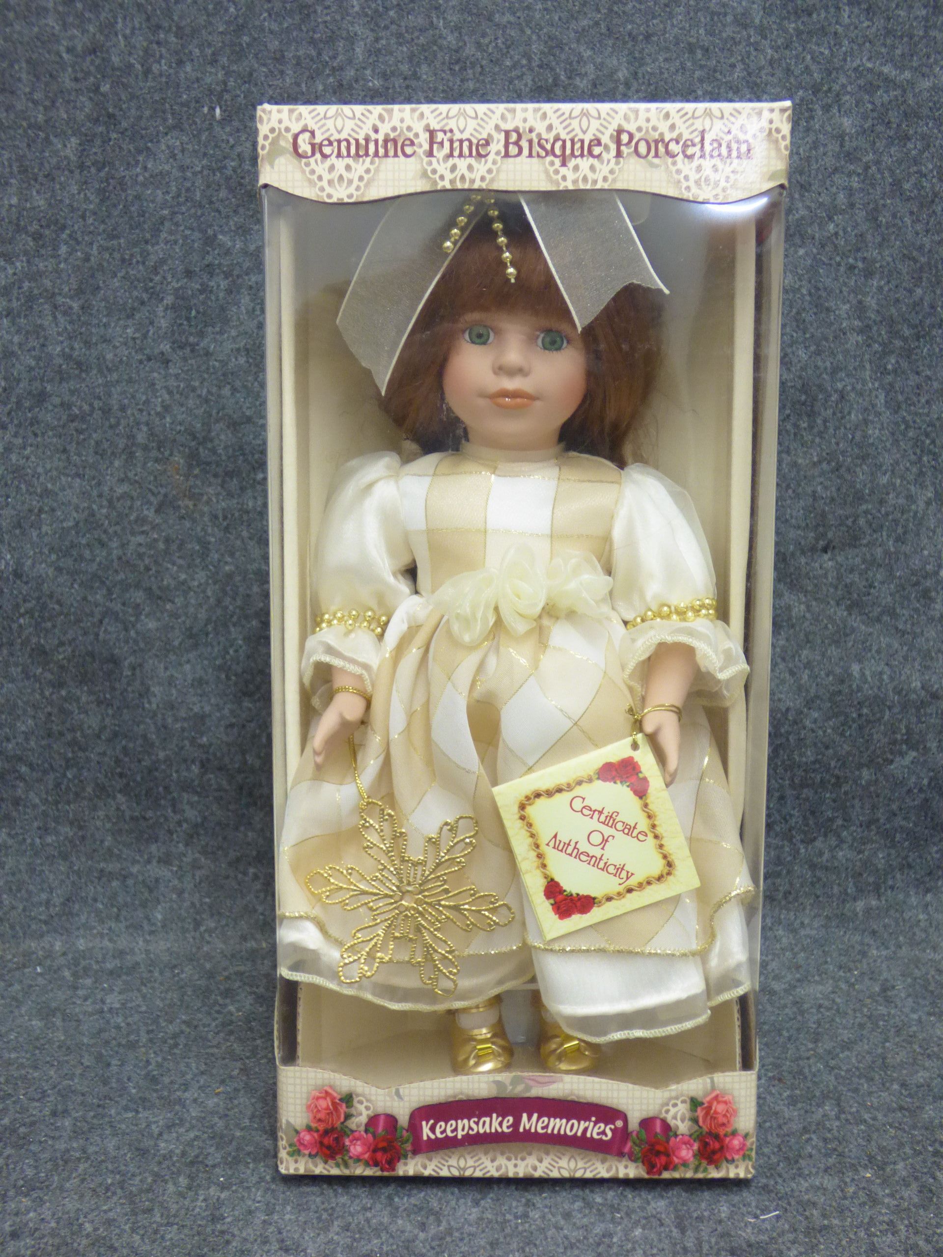A fine bisque porcelain doll featuring a cream and white dress with gold-toned accents, brown hair, and green eyes, housed in its original Keepsake Memories packaging with a Certificate of Authenticity. 32cm tall