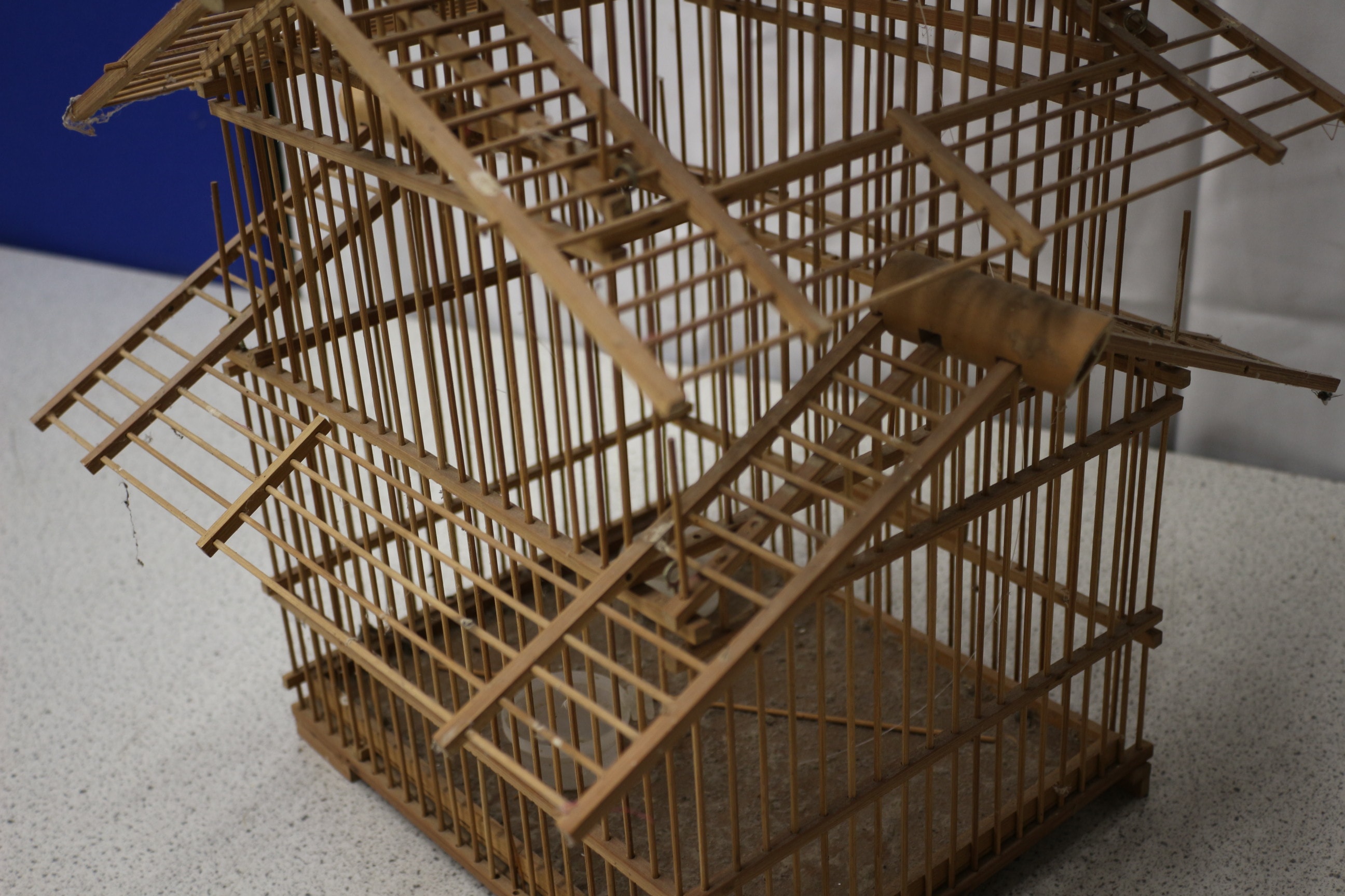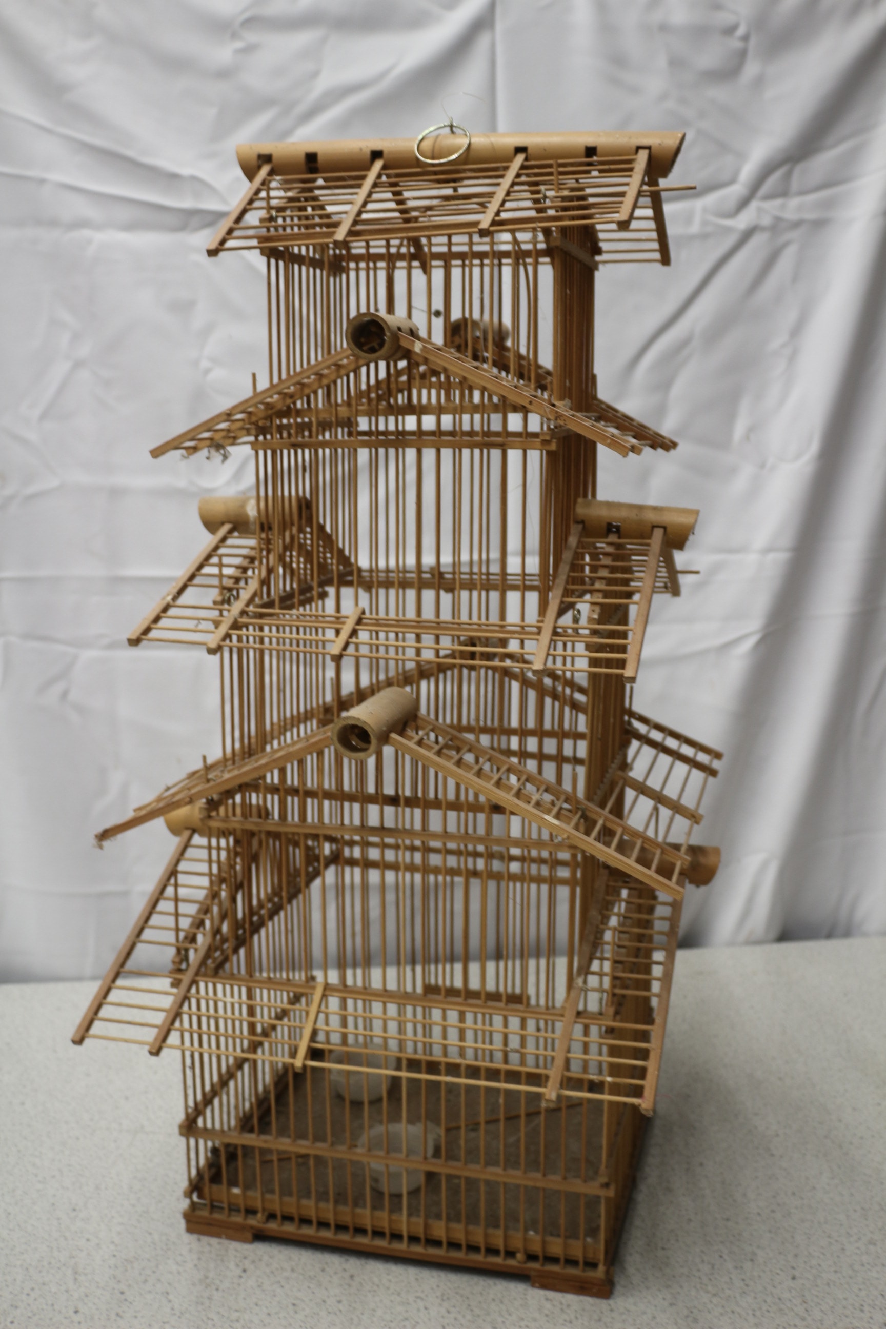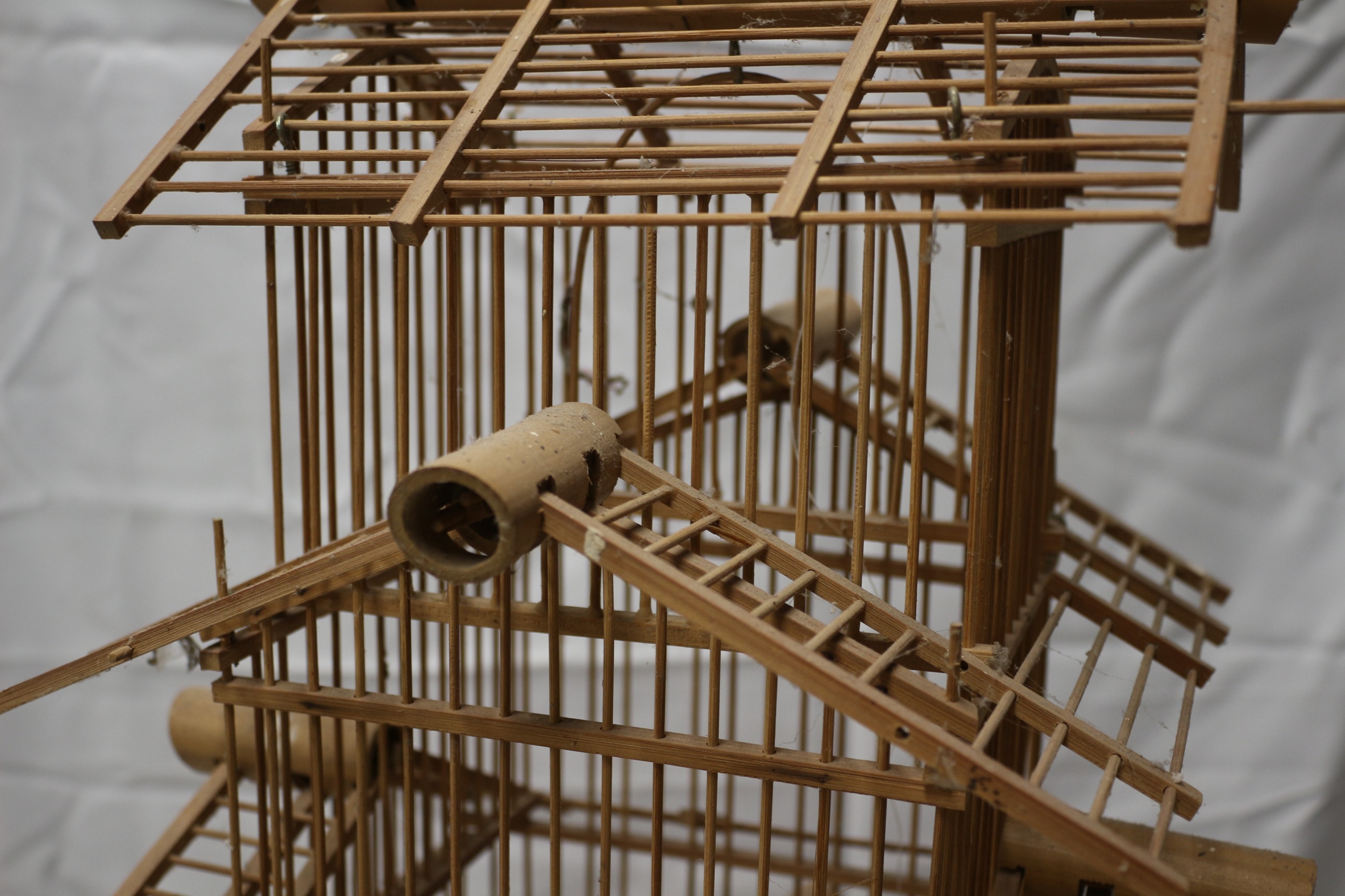 A large multi-tiered bamboo and wood birdcage in a natural light brown colour. Due to the fragile natural of this item it is collection only.