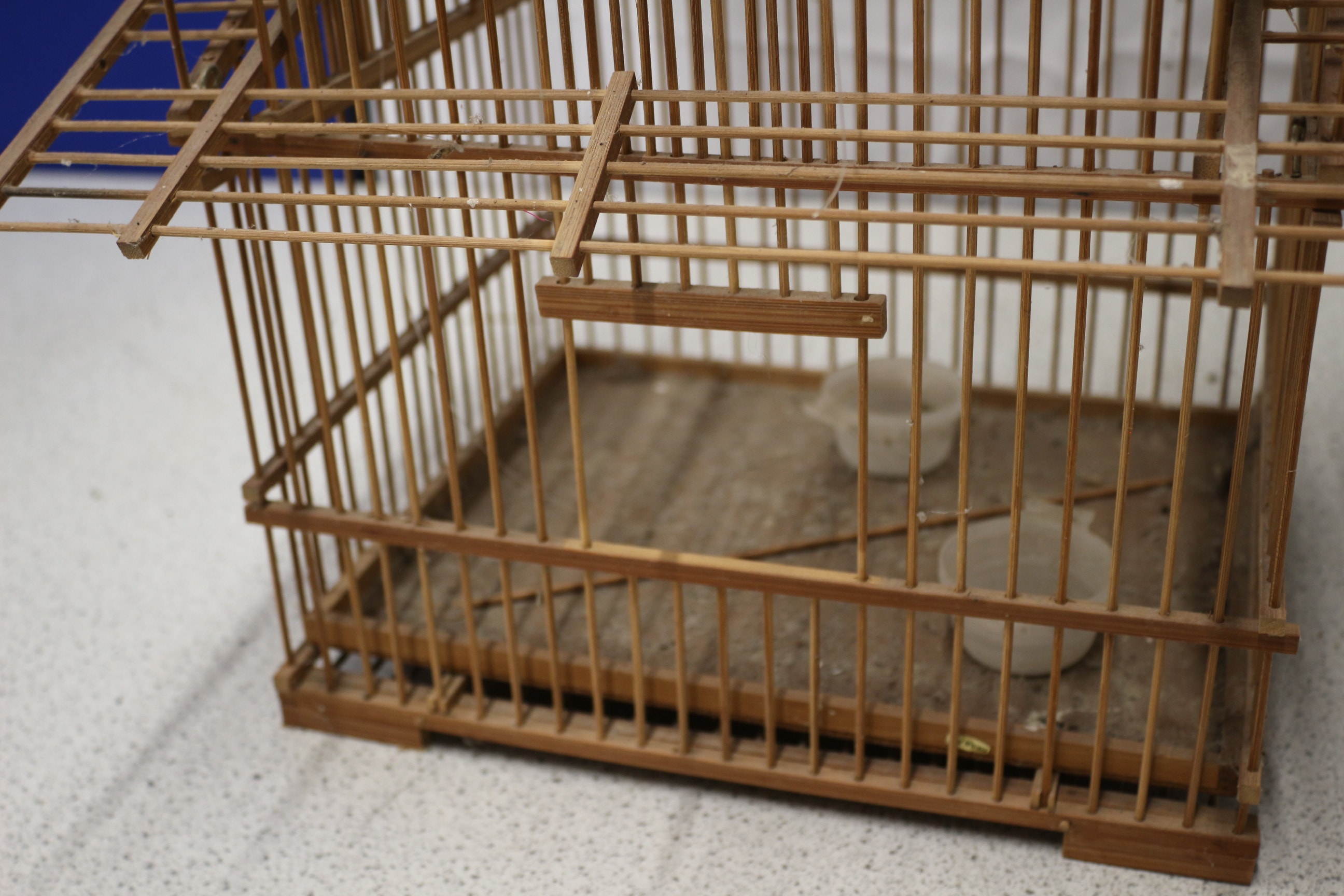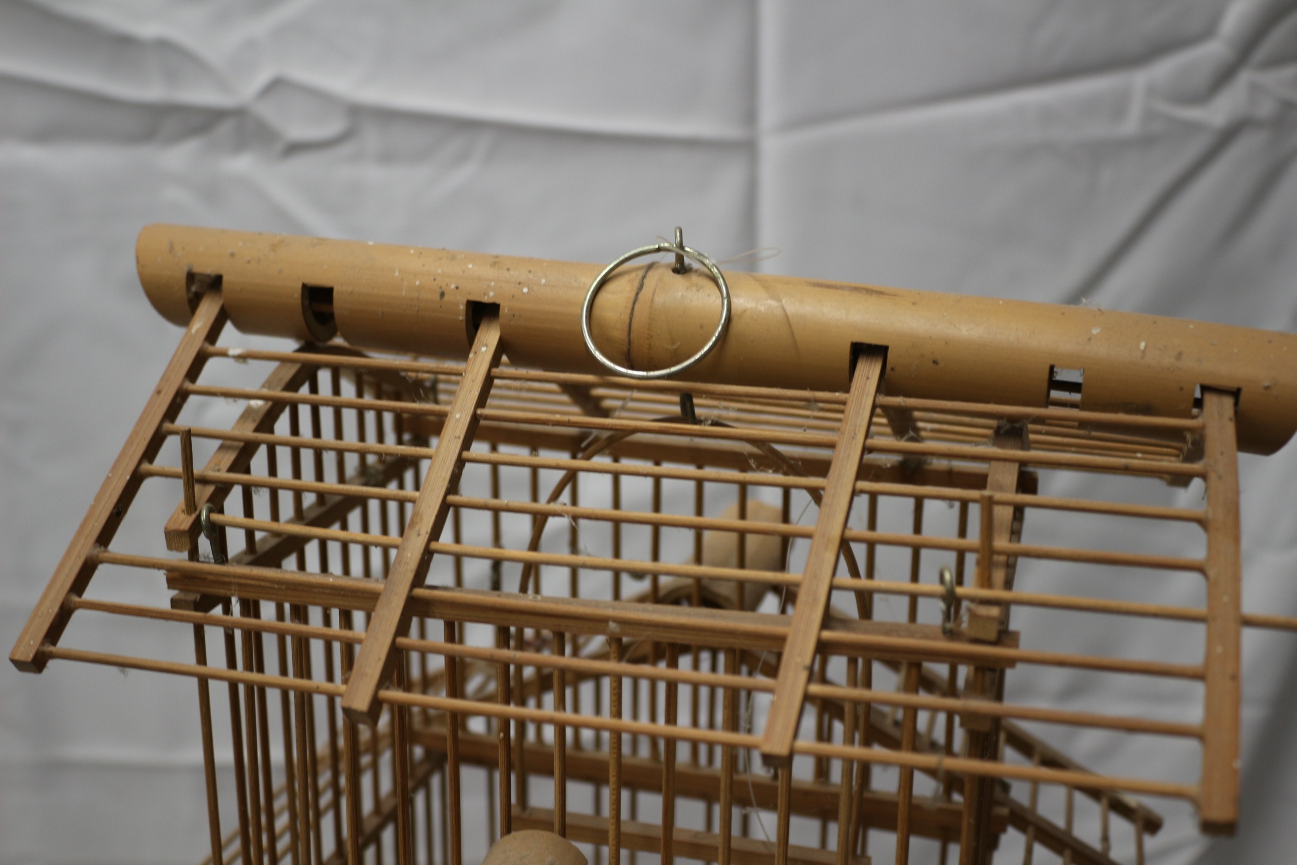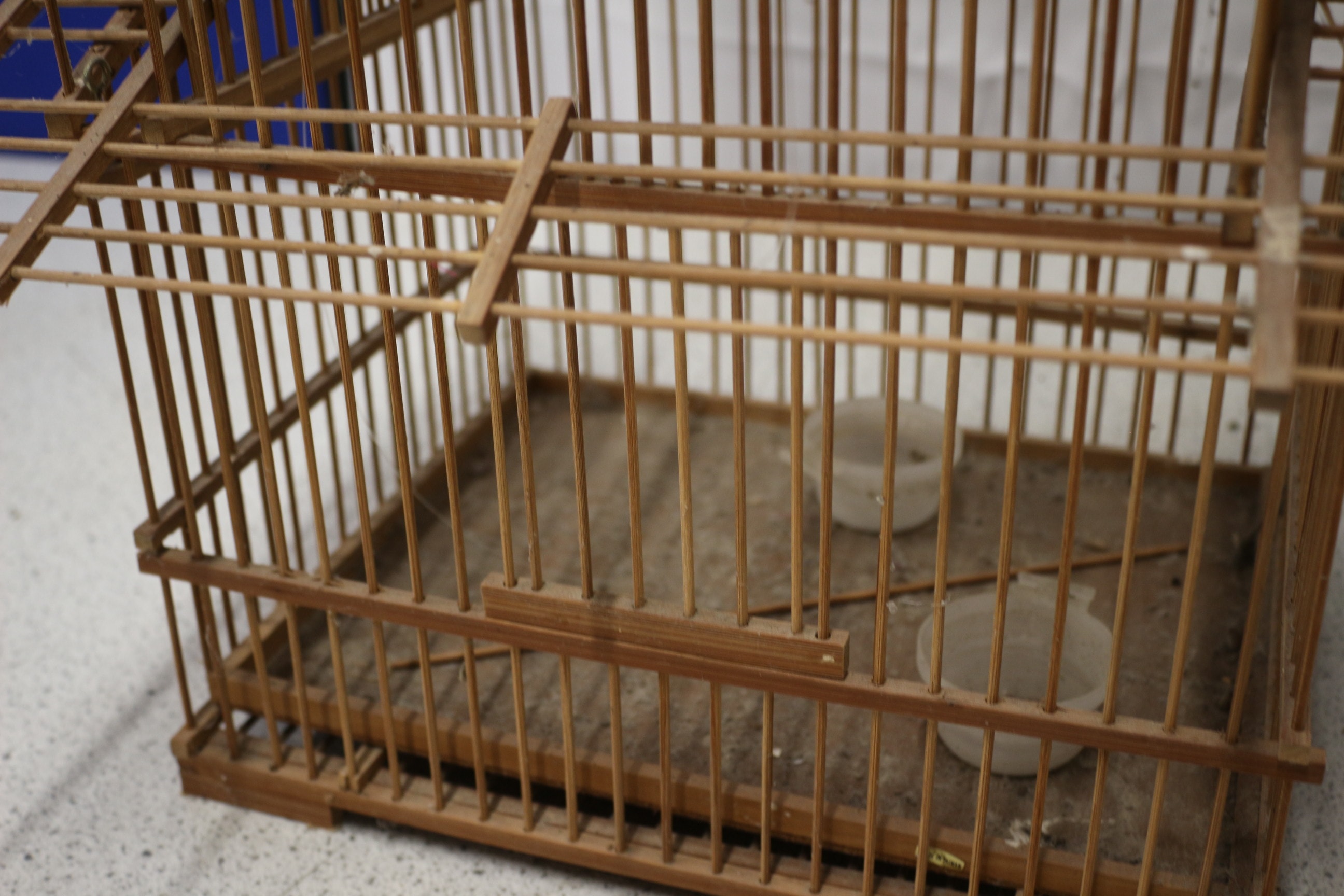 A large multi-tiered bamboo and wood birdcage in a natural light brown colour. Due to the fragile natural of this item it is collection only.