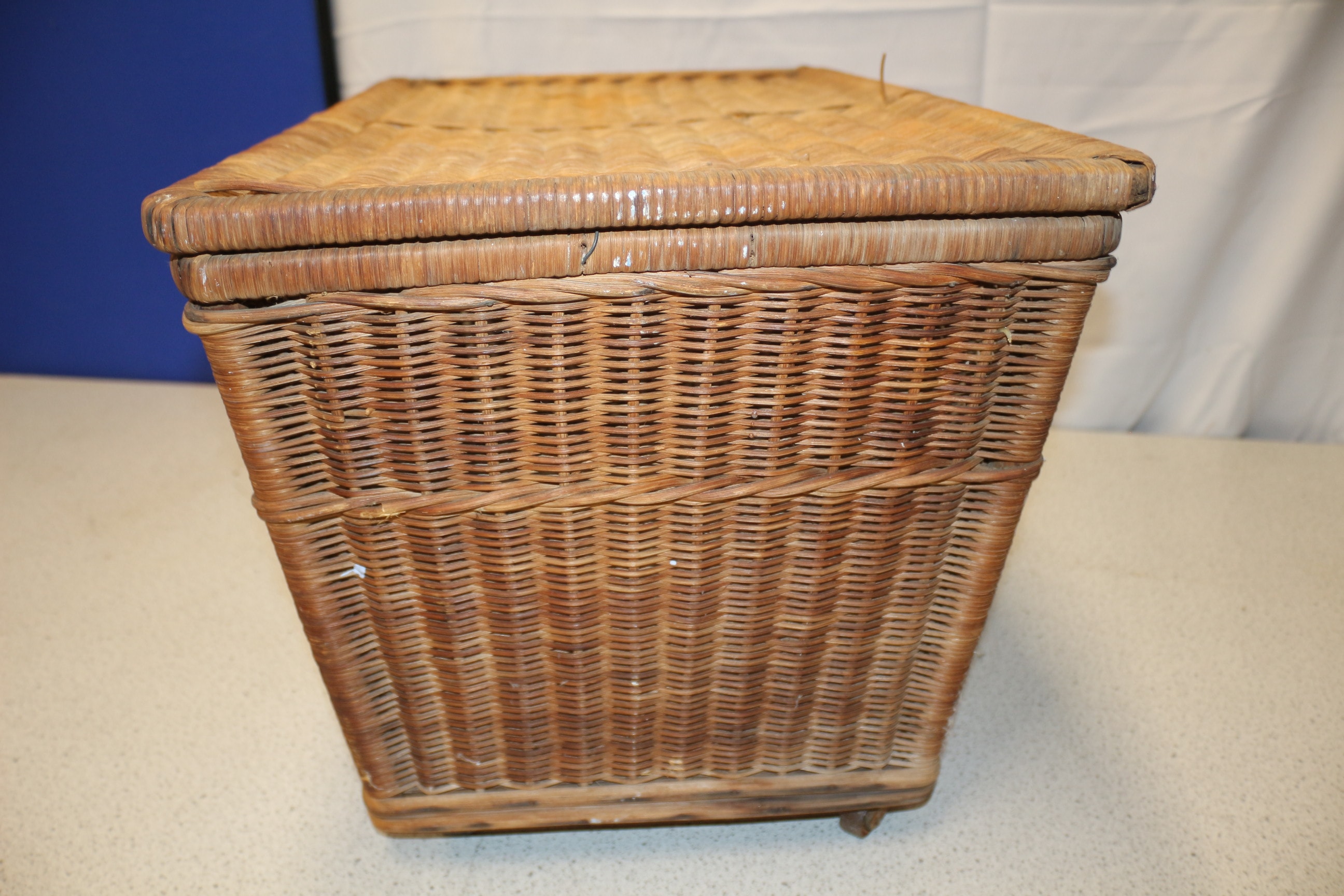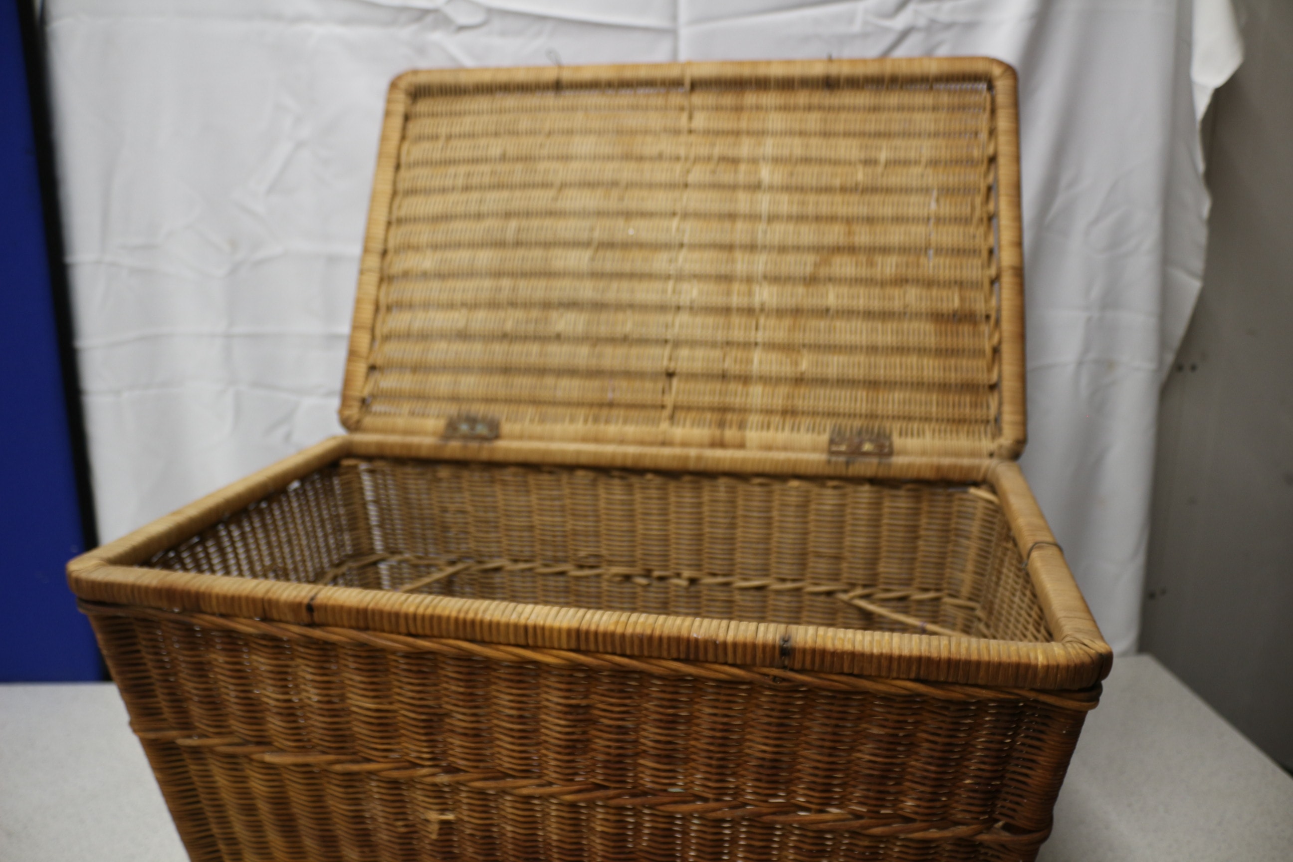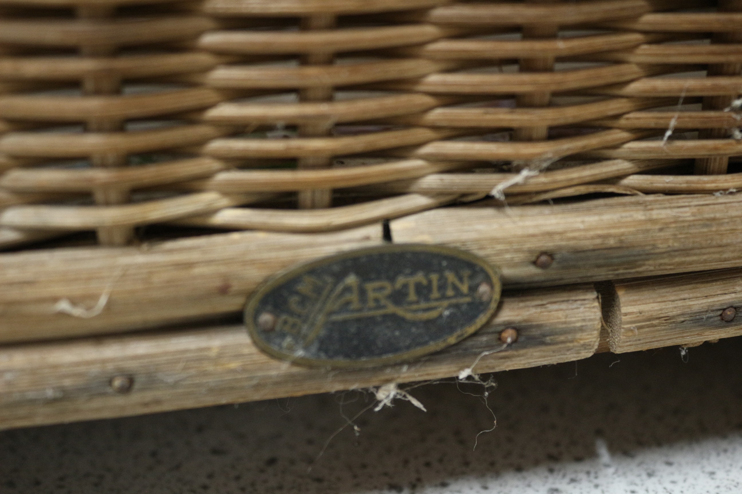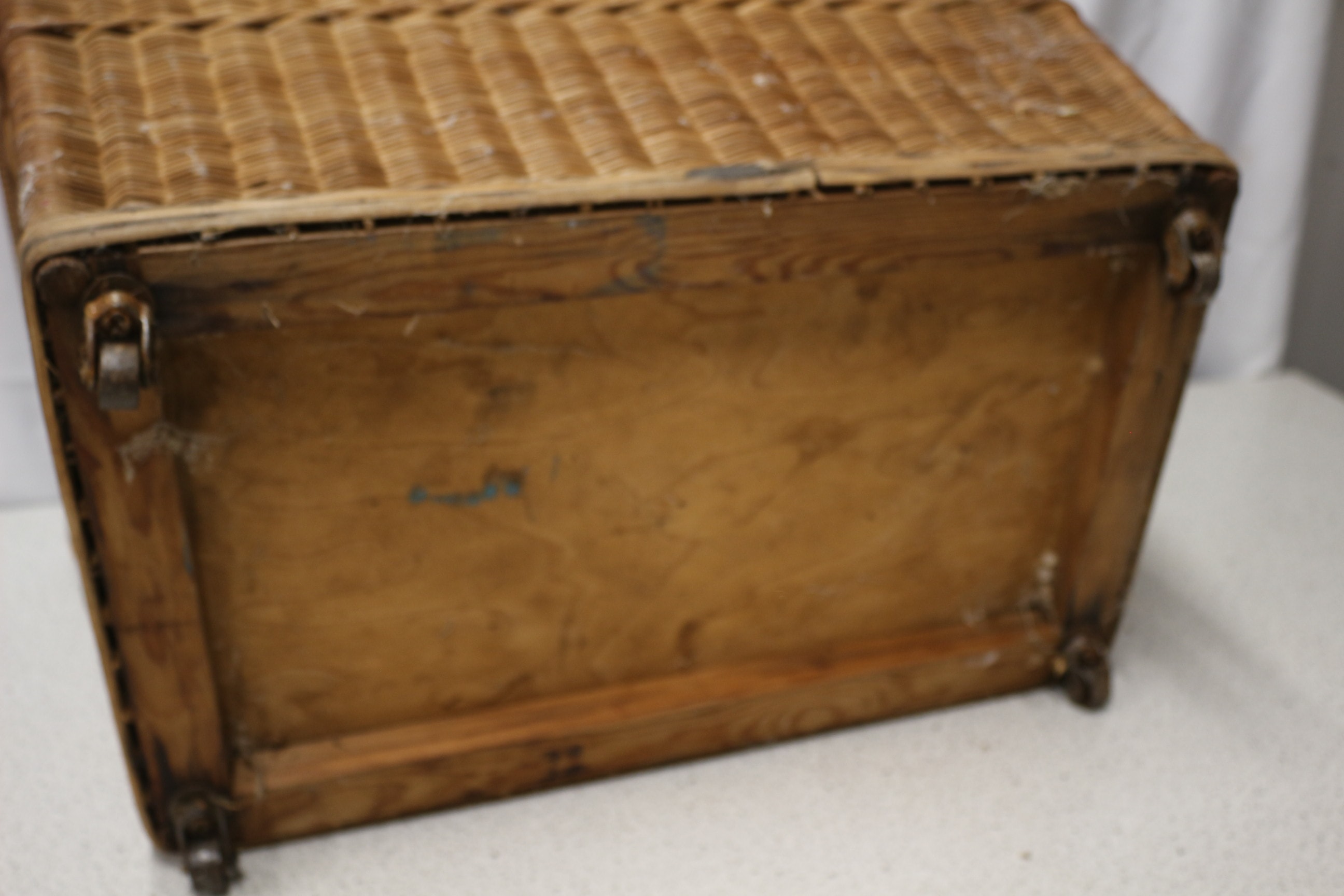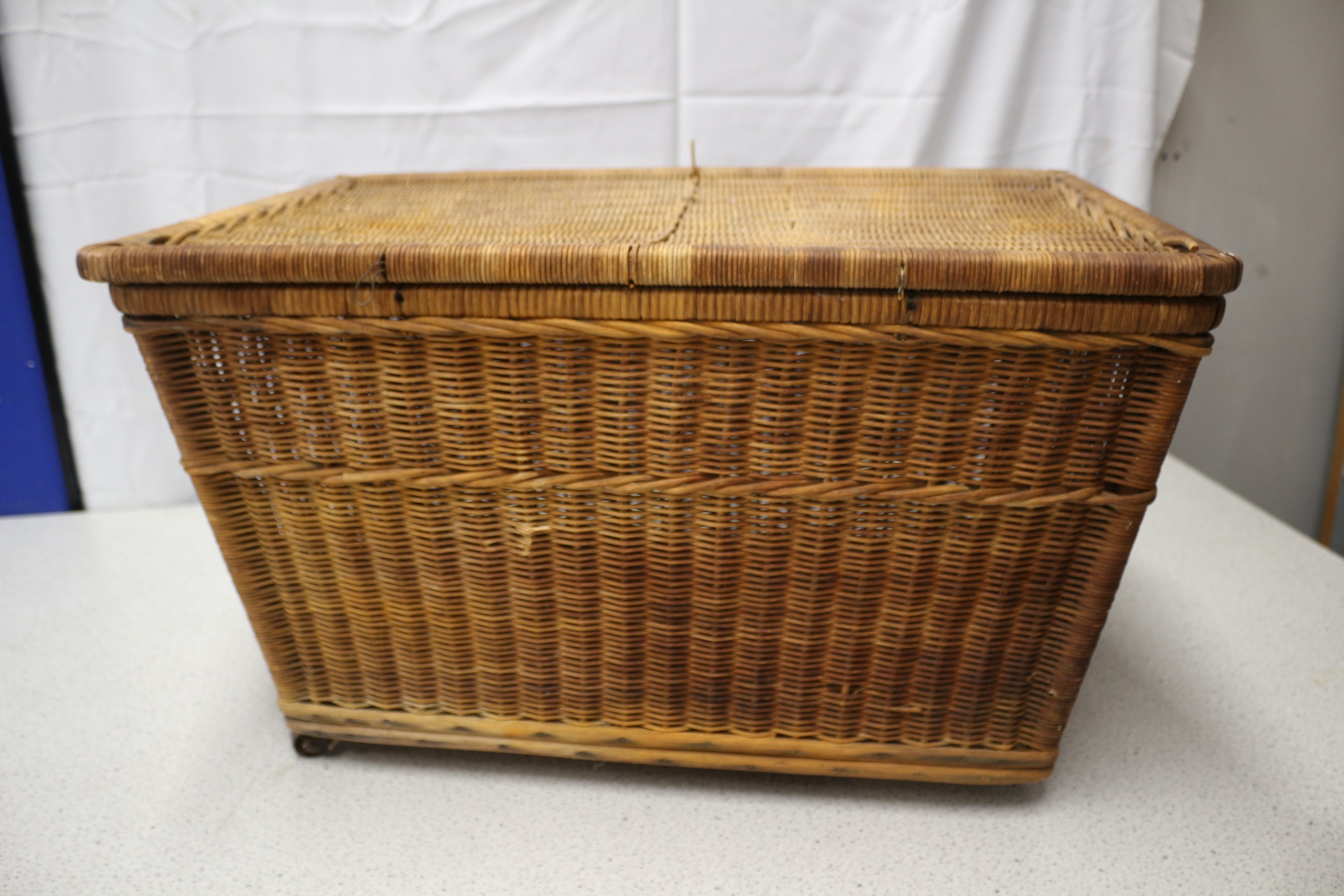 A light brown wicker basket with a hinged lid and wheels, featuring an oval metal plaque inscribed ‘ARTIN’ on its side.37cm Tall, 62.5x40cm