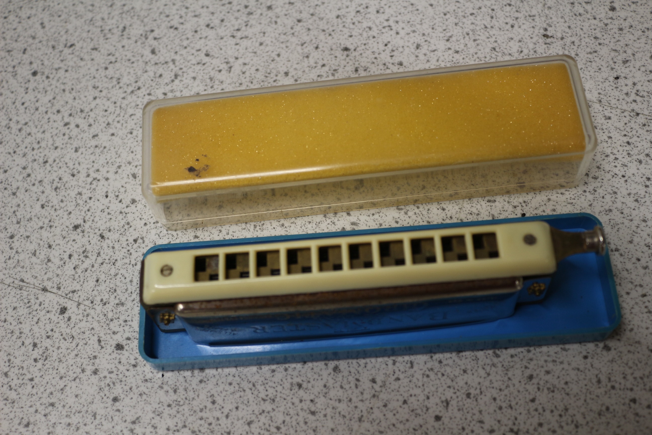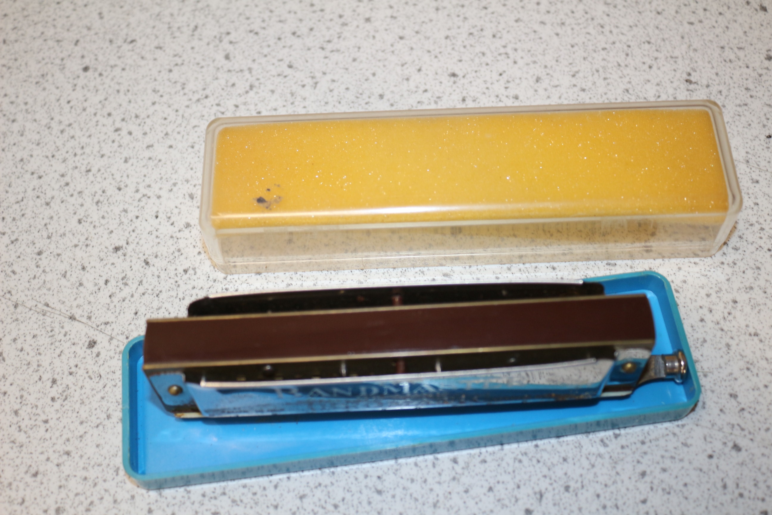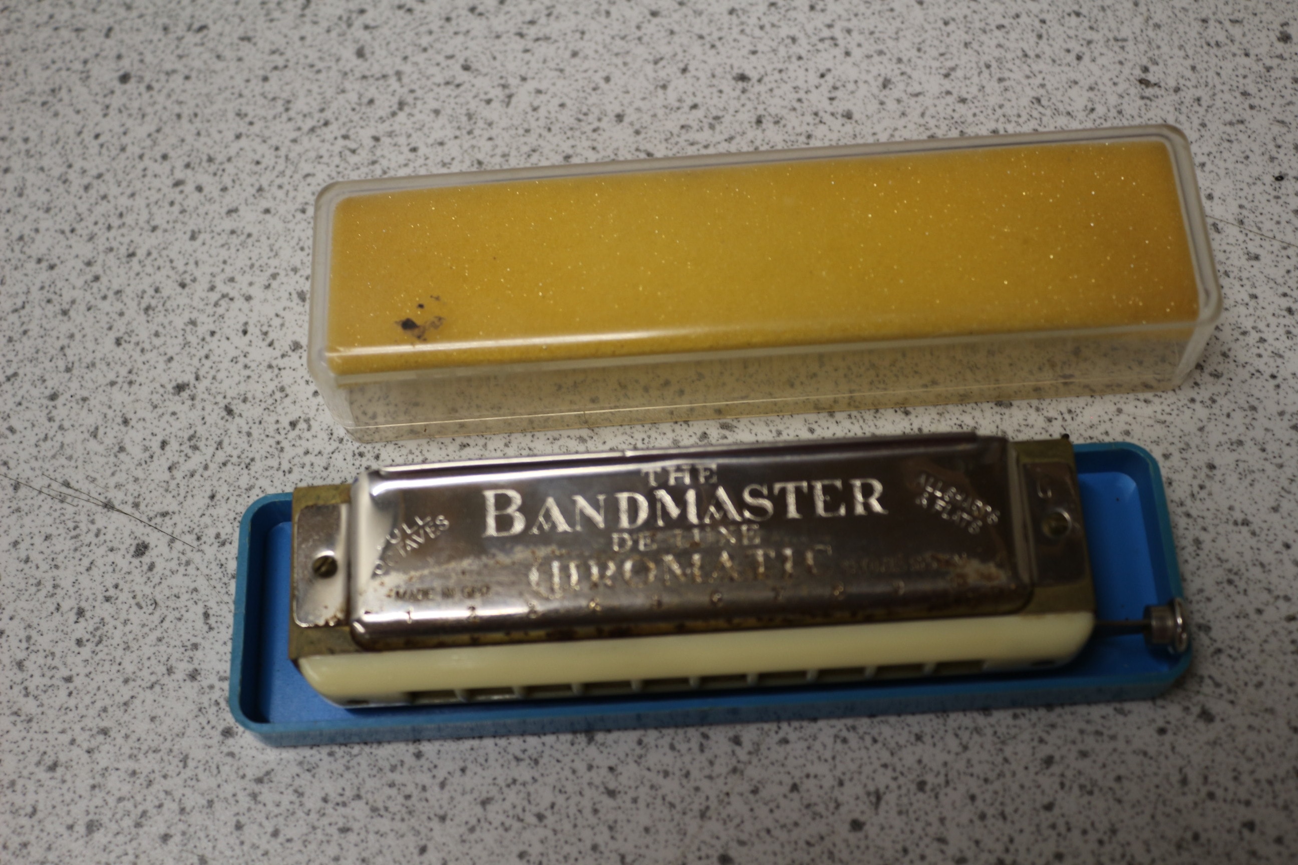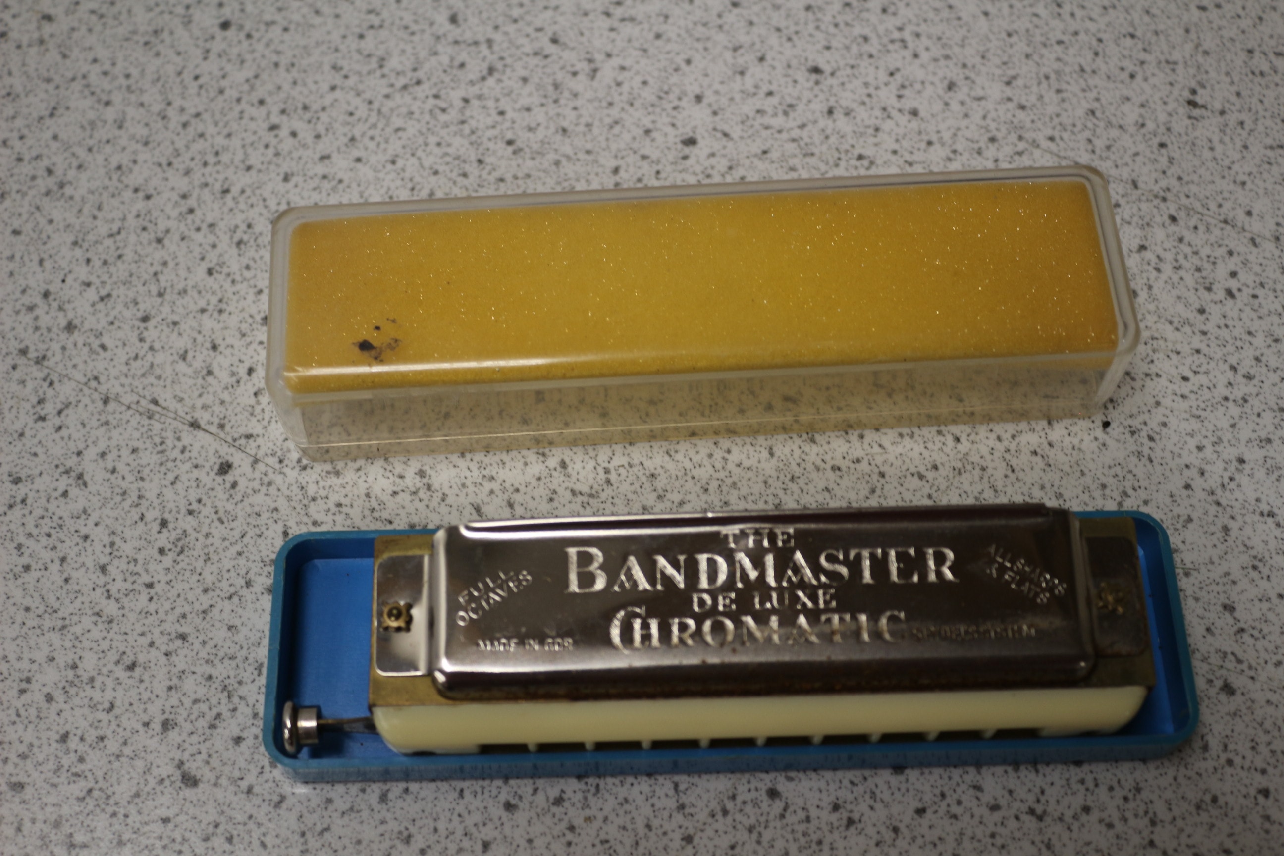 A Bandmaster De Luxe Chromatic harmonica, silver-colored with a cream body and brown top plate, labeled ‘FULL OCTAVES’ and ‘MADE IN W. GERMANY’, resting in a blue plastic tray.