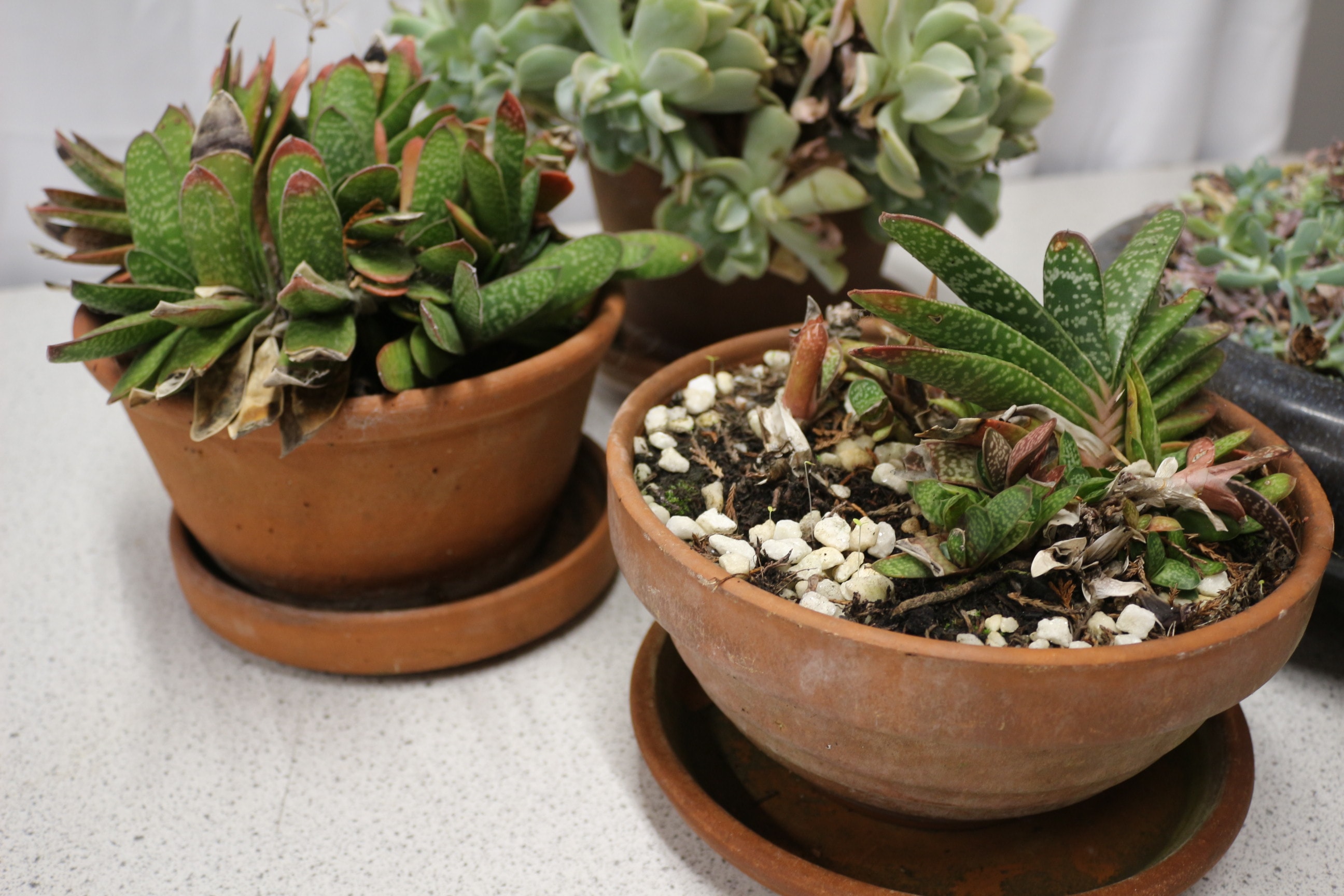 Four potted succulent arrangements feature various green and reddish-brown succulents, one with orange flowers, in three terracotta pots and one dark grey marble planter.
