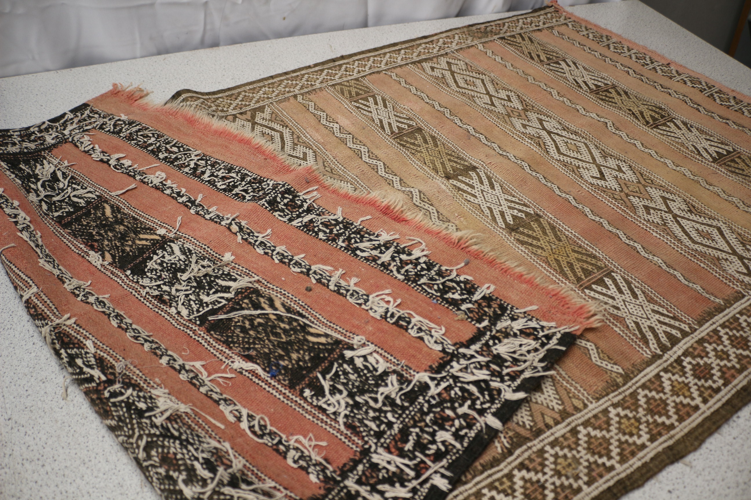 A rectangular rug or runner in shades of faded pink, brown, and cream, featuring striped geometric patterns. 80x142cm