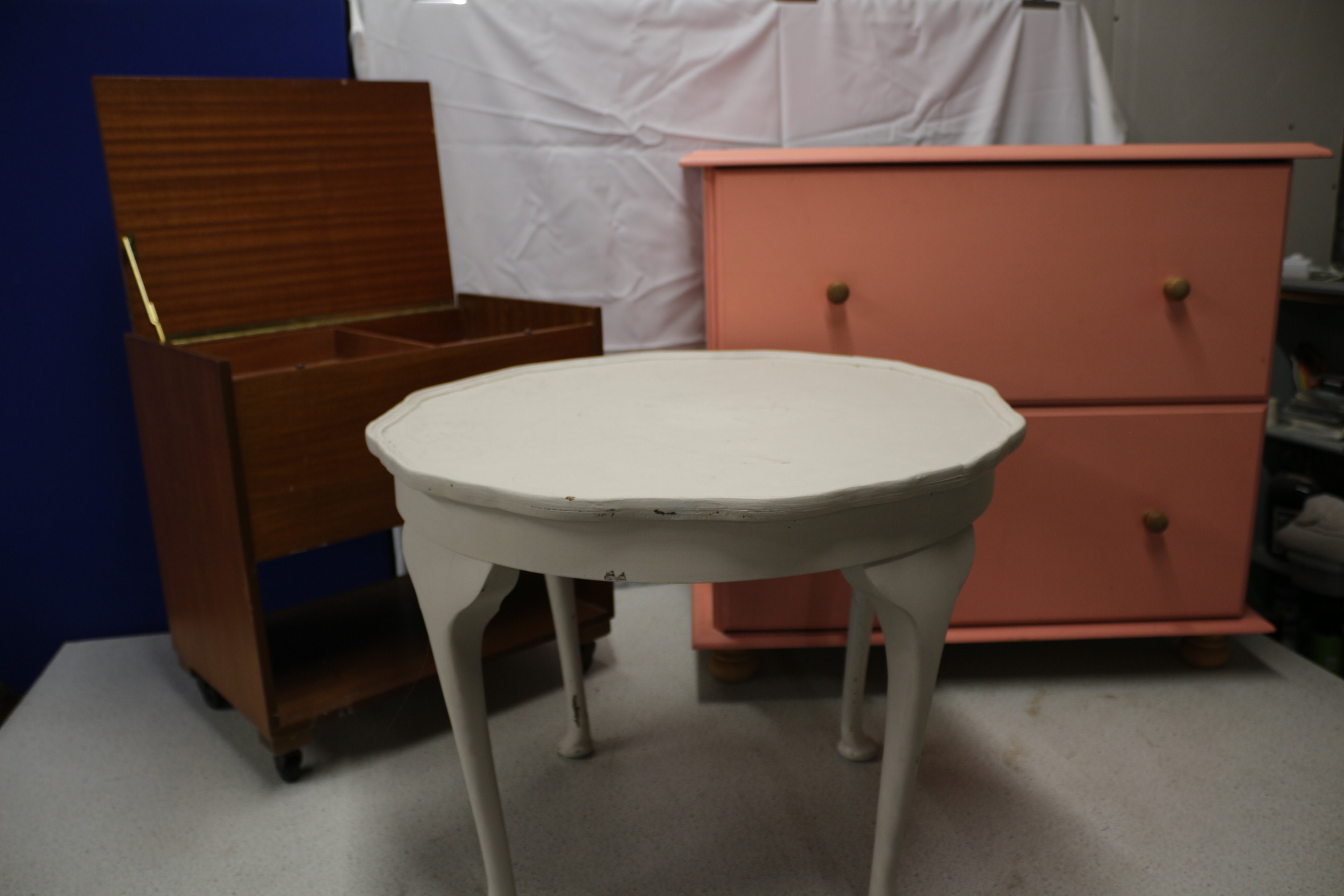 Painted pink 2 drawer wooden filling cabinet, 71.5cm Tall, 79x49cm. An off-white round coffee table with a scalloped edge, exhibiting visible surface wear, 48cm Tall, and sewing box.