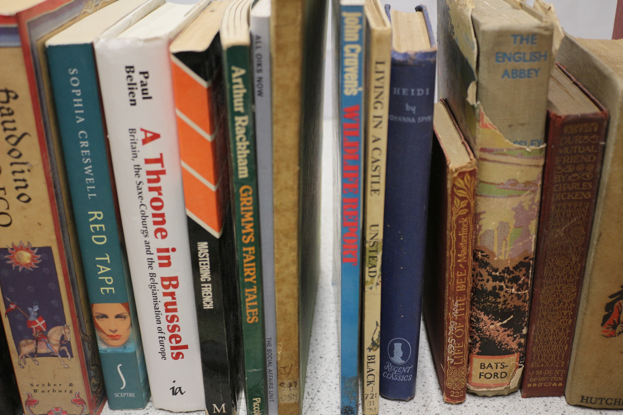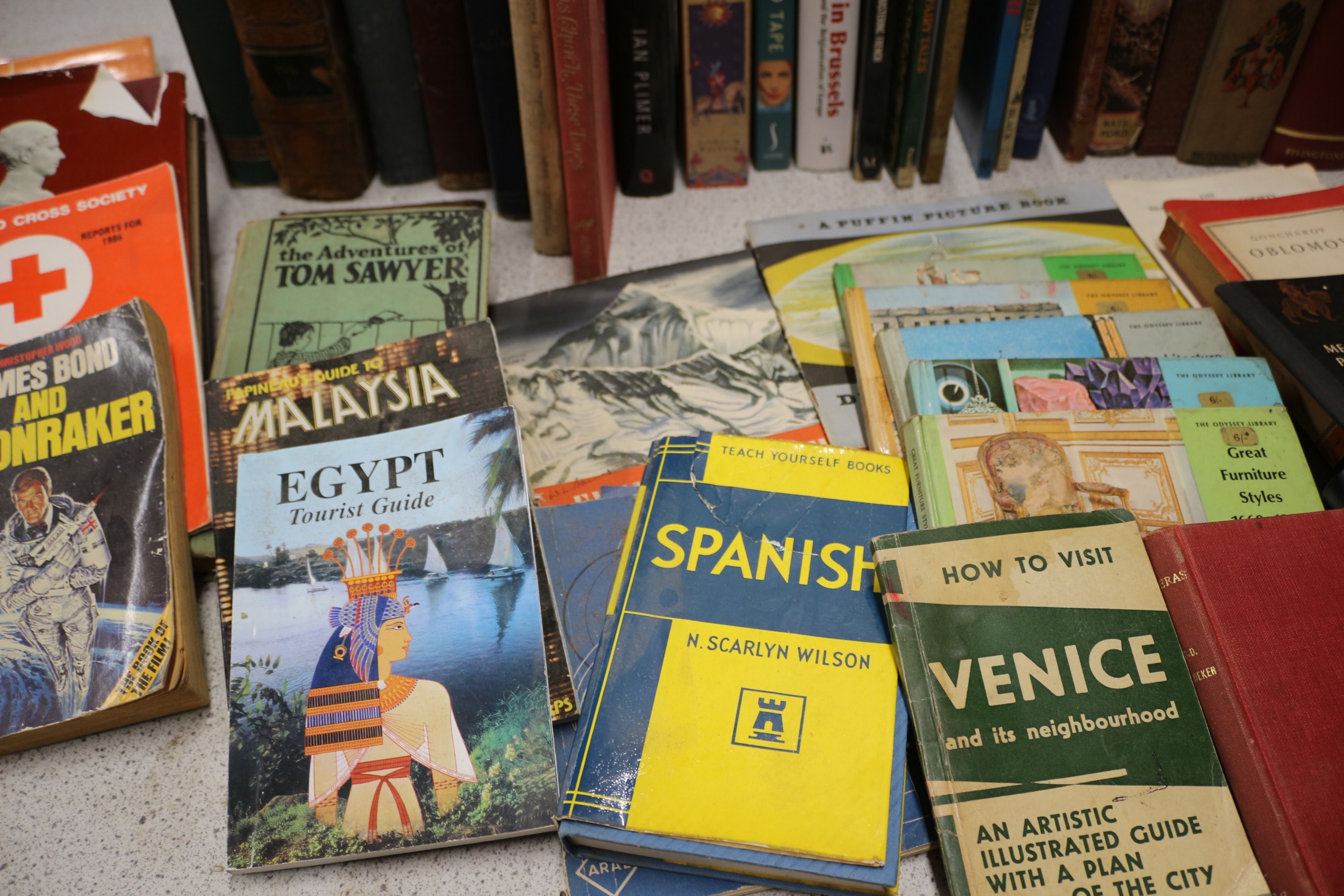 A group of approximately 20-30 various hardback and paperback books in multiple colours including red, orange, yellow, green, and cream, featuring titles such as “BRITISH RED CROSS SOCIETY YEARBOOK 1987,” “JAMES BOND AND MOONRAKER, ” and “THE ADVENTURES OF TOM SAWYER.”