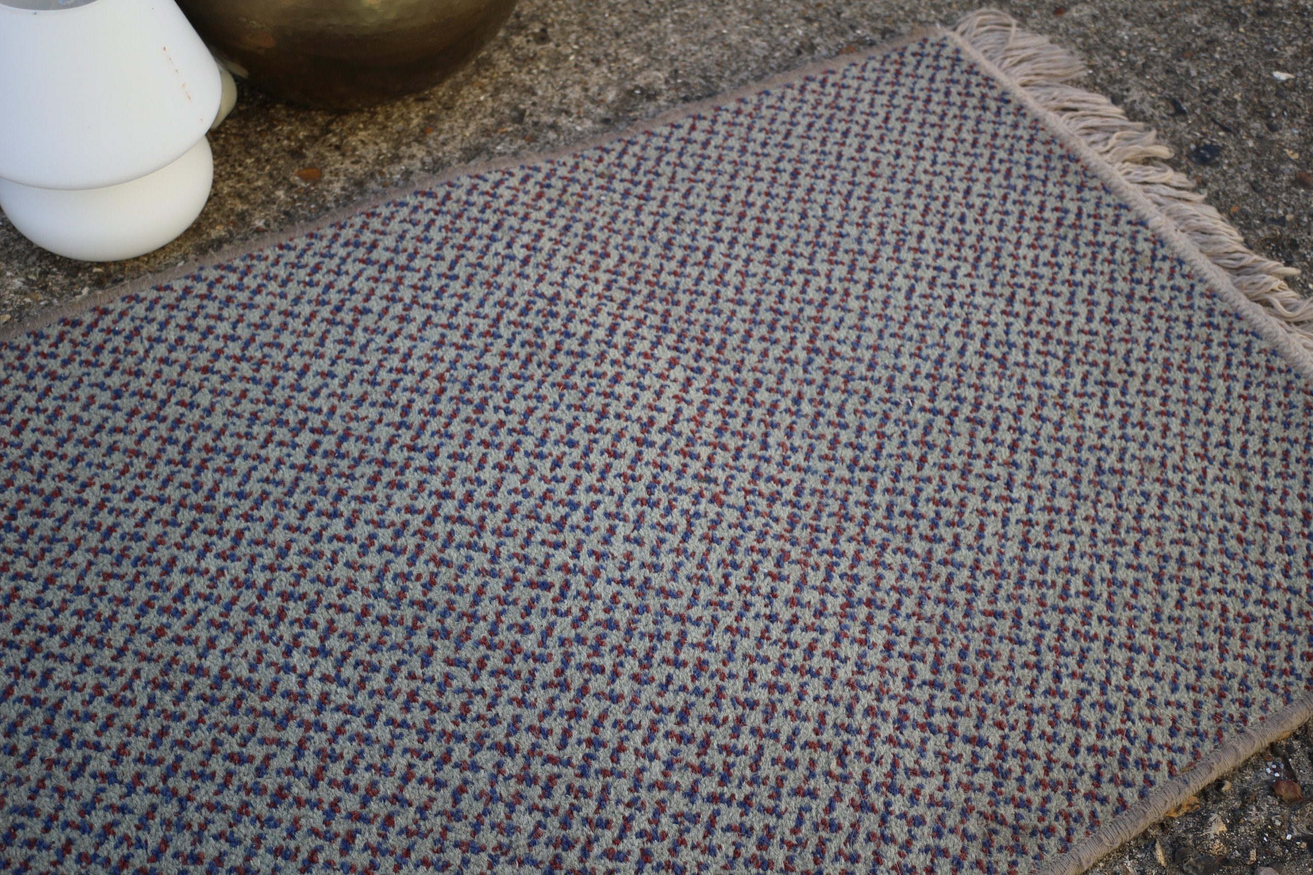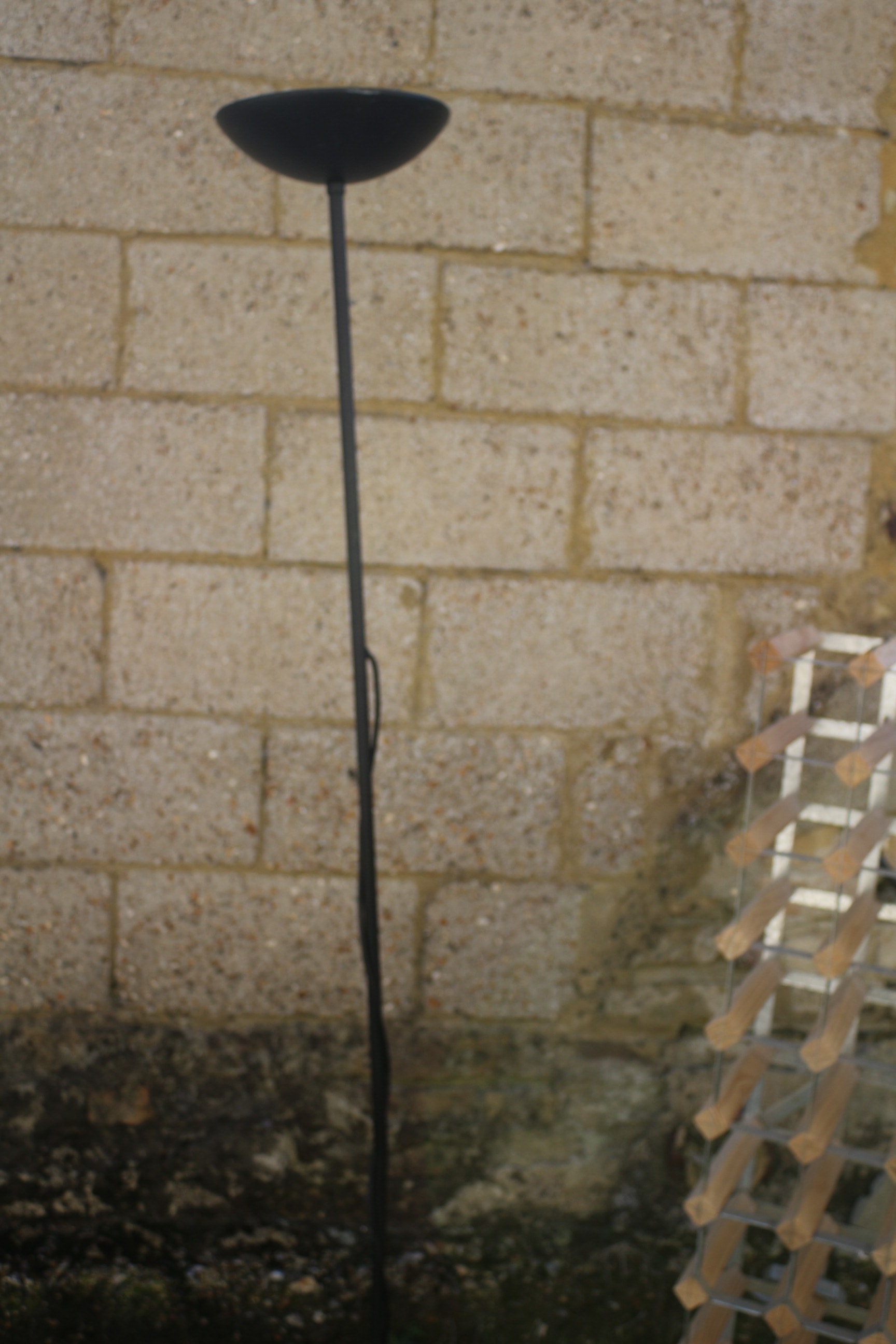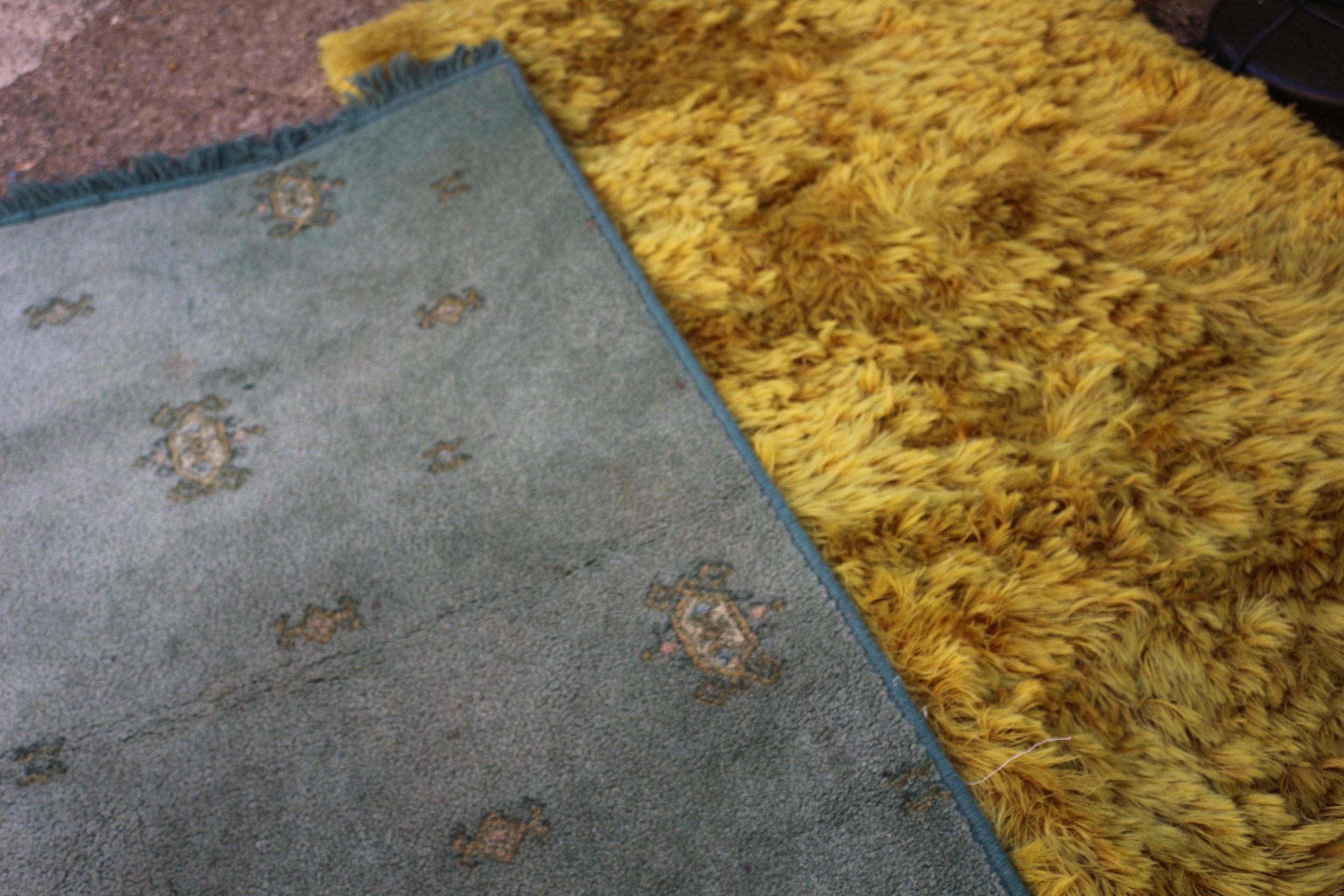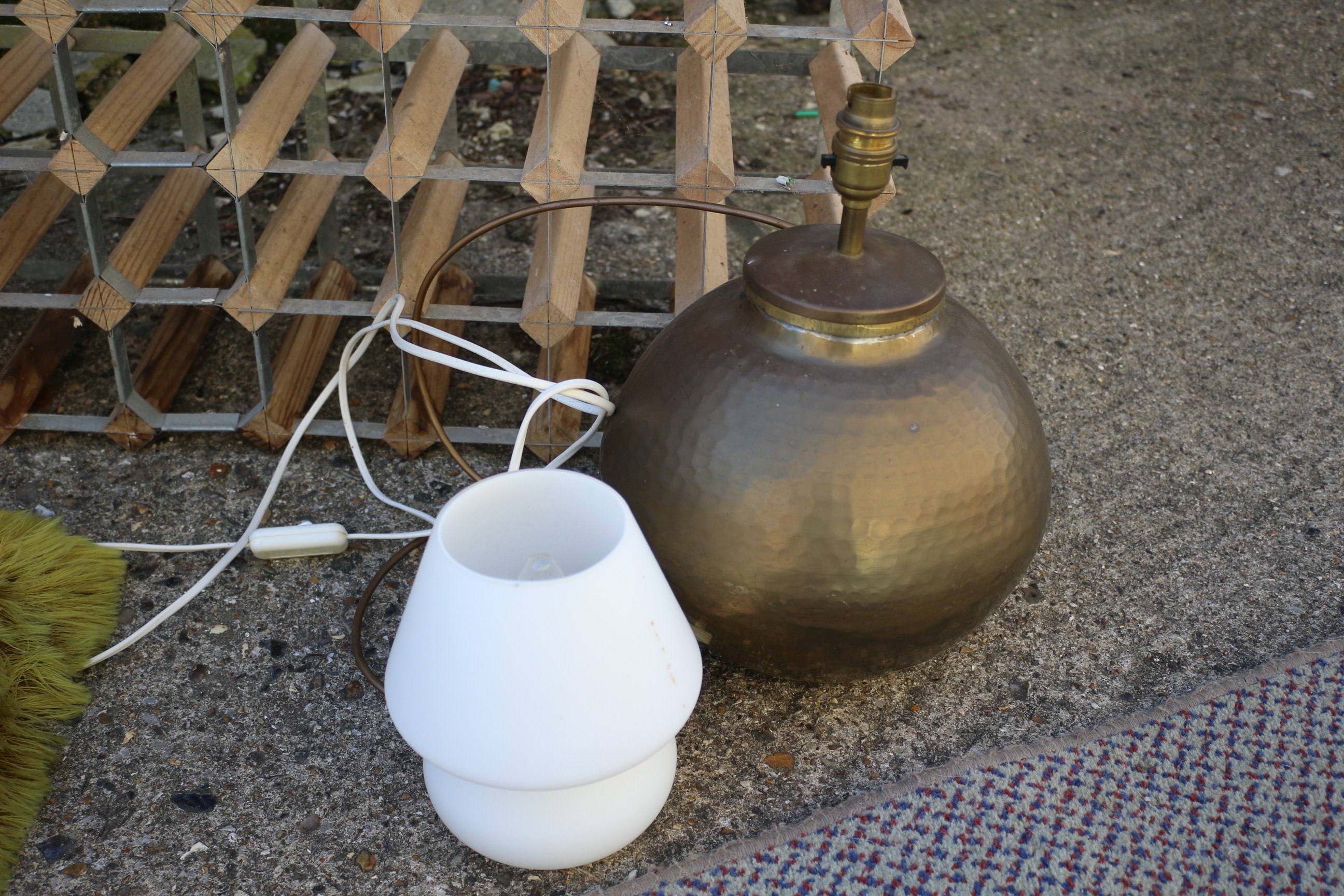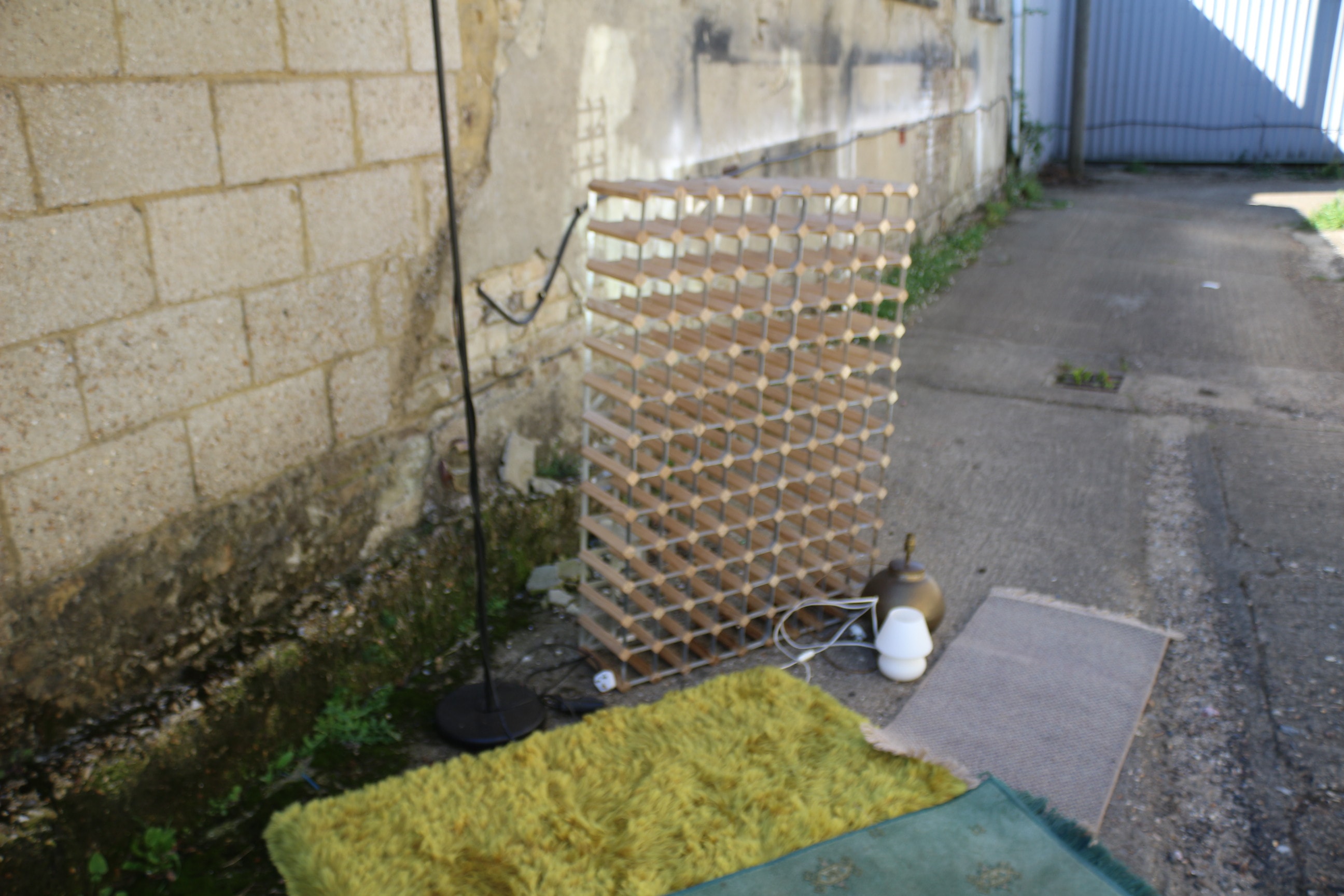 A collection of household items including a large wooden wine rack, a black floor lamp, two table lamps, and three assorted rugs.