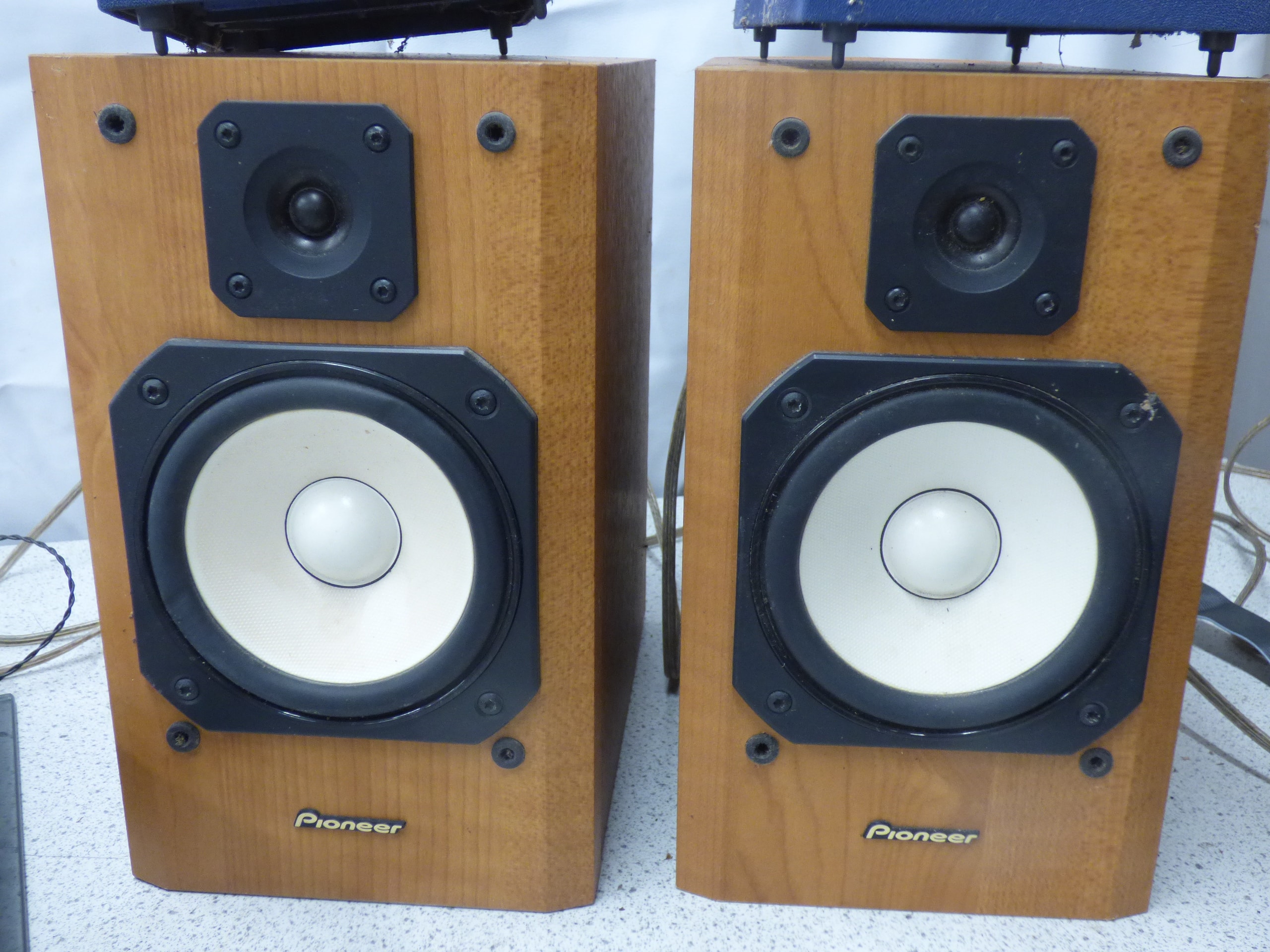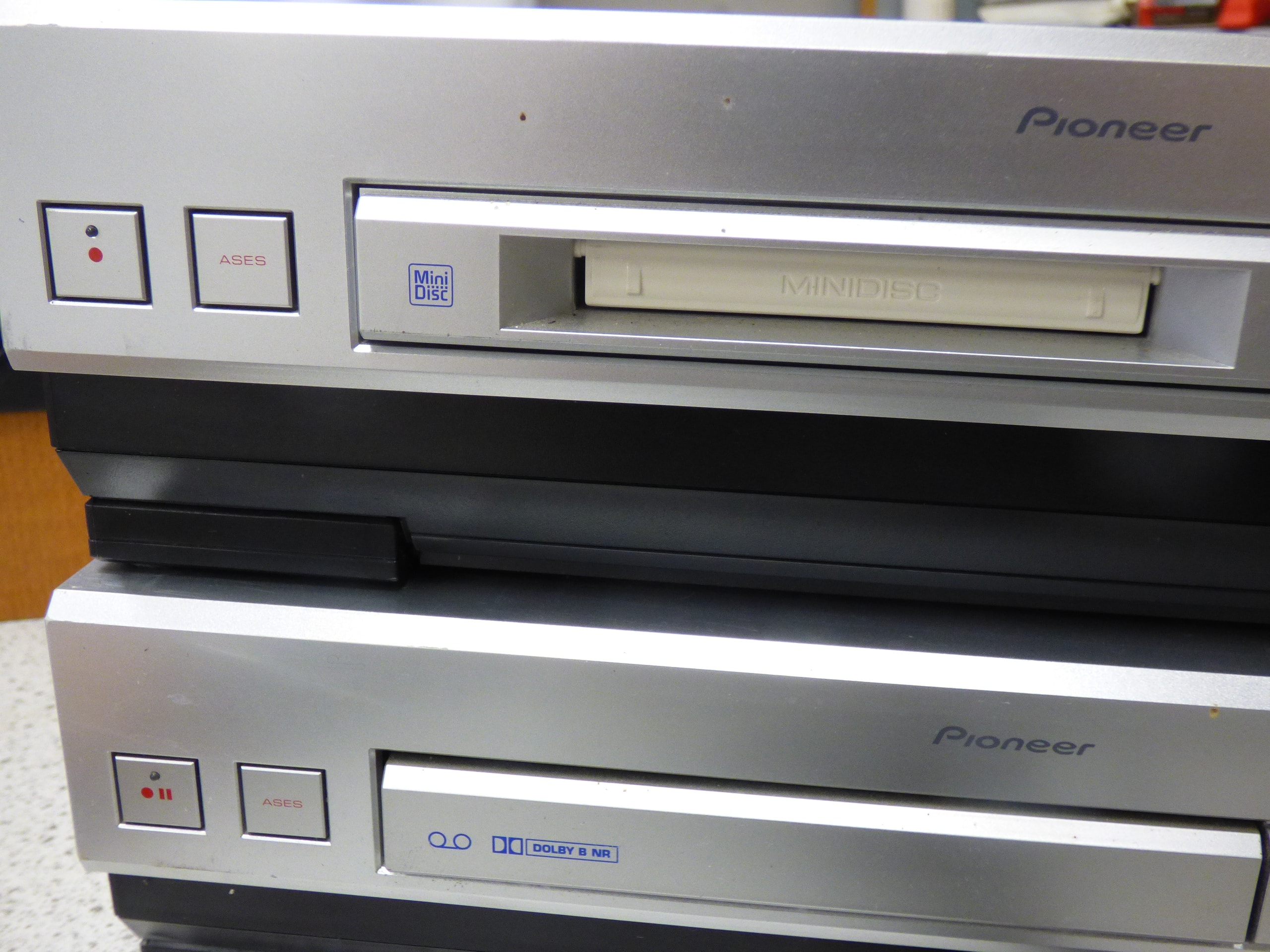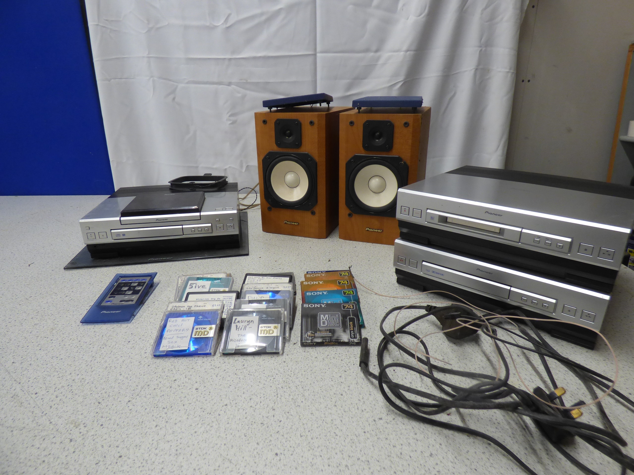 A collection featuring two silver Pioneer audio component stacks (CD player ‘DIGITAL AUDIO’ ‘RD-S’, MiniDisc player ‘MINIDISC’ ‘ASES’, cassette deck ‘DOLBY B NR’ ‘ASES’), two wooden Pioneer speakers, a blue Pioneer X-EM11 portable MiniDisc player, and approximately 20 Sony and TDK MiniDiscs. Untested