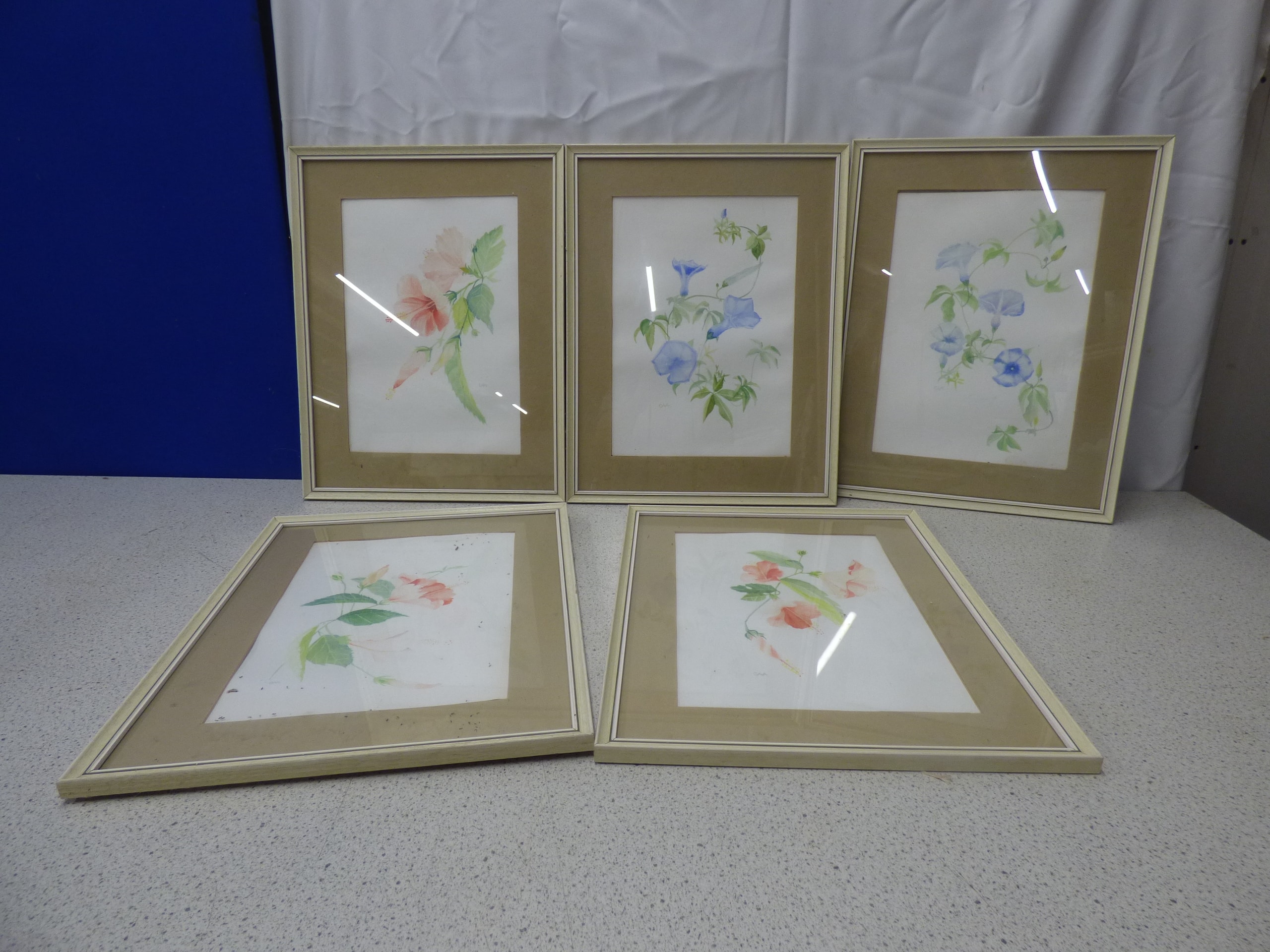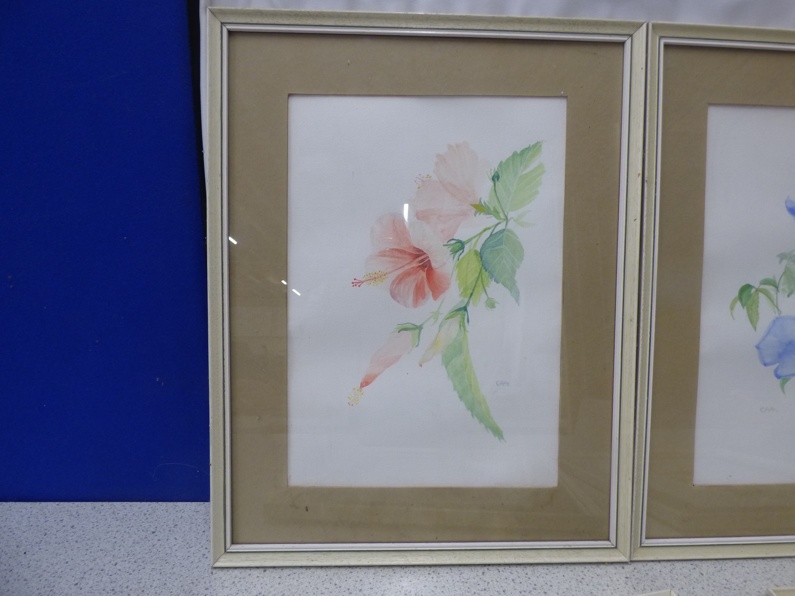 Five framed floral watercolor paintings featuring various flowers in shades of pink, red, and blue with green leaves; two are signed ‘CAA.’ Carole Andrews. 47x37cm AF