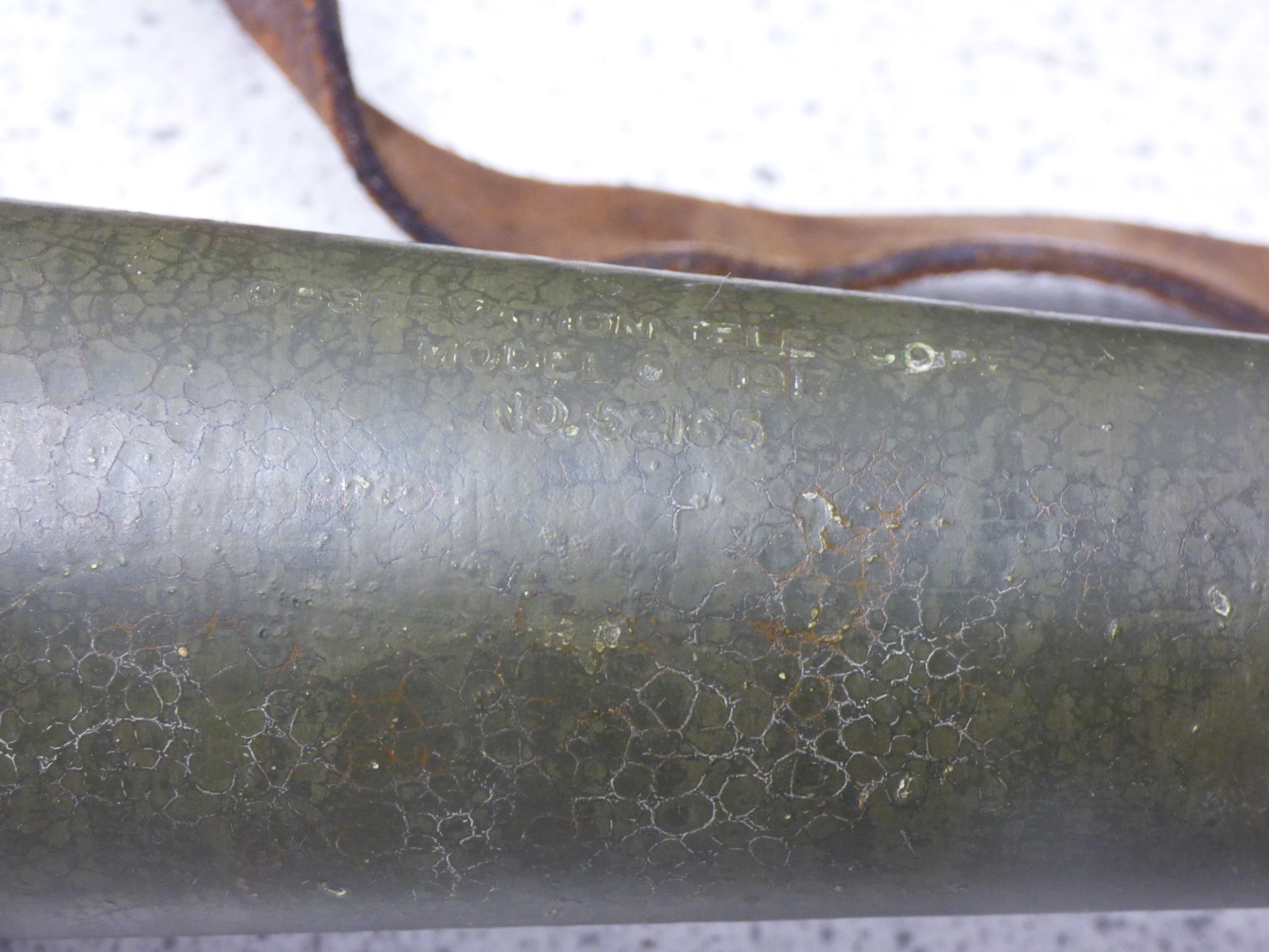 An antique military observation telescope by A. JOBIN, Paris, MODEL M.O.P.M.T., primarily dark green with brass accents, accompanied by a dark brown leather carrying case and a dark green lens cap. 1917, No.52165