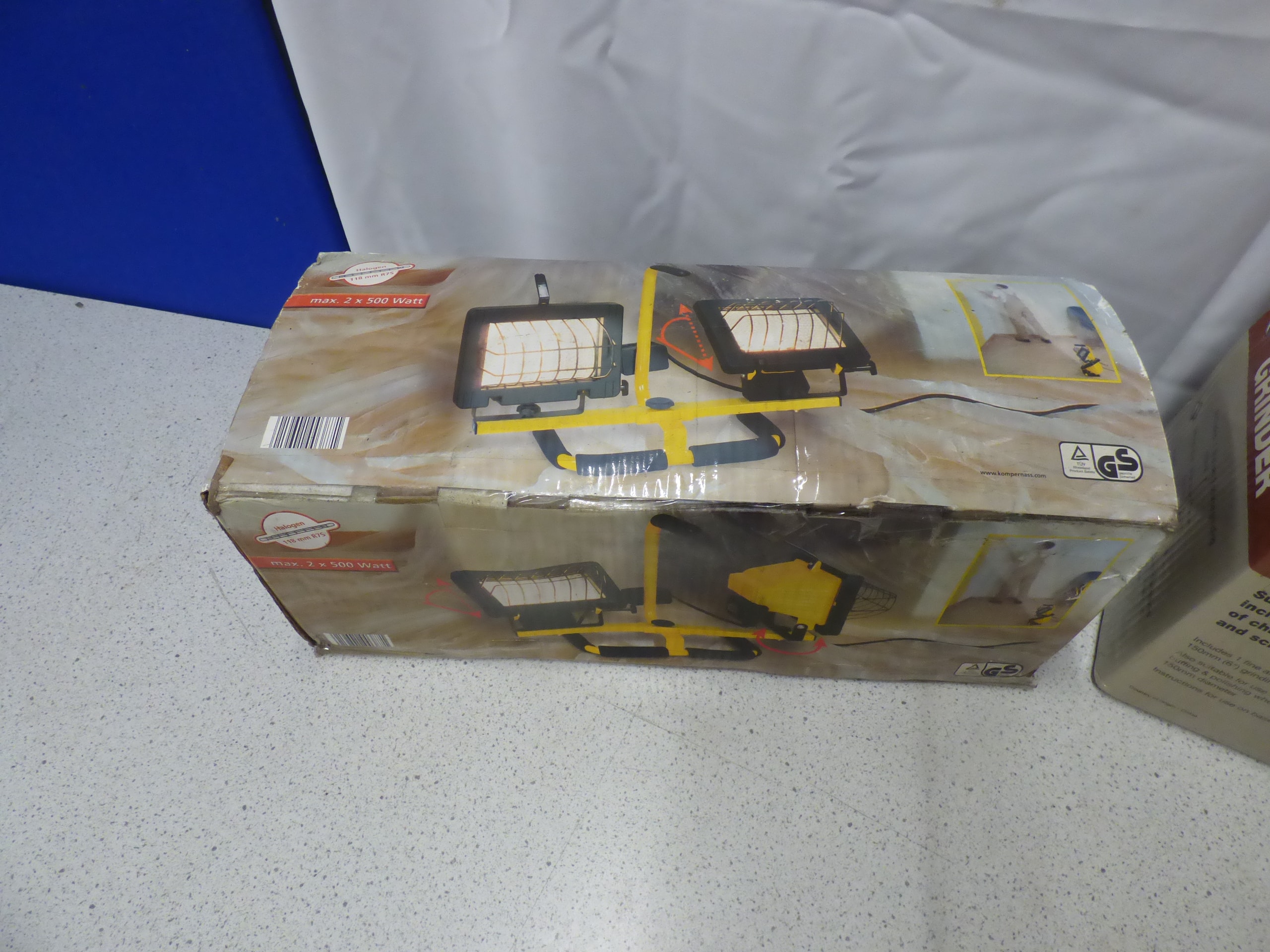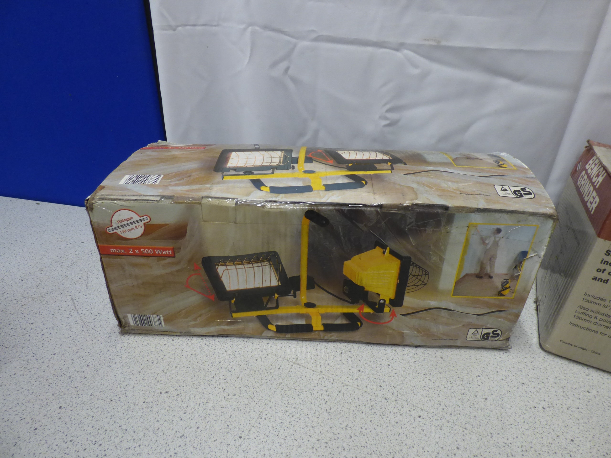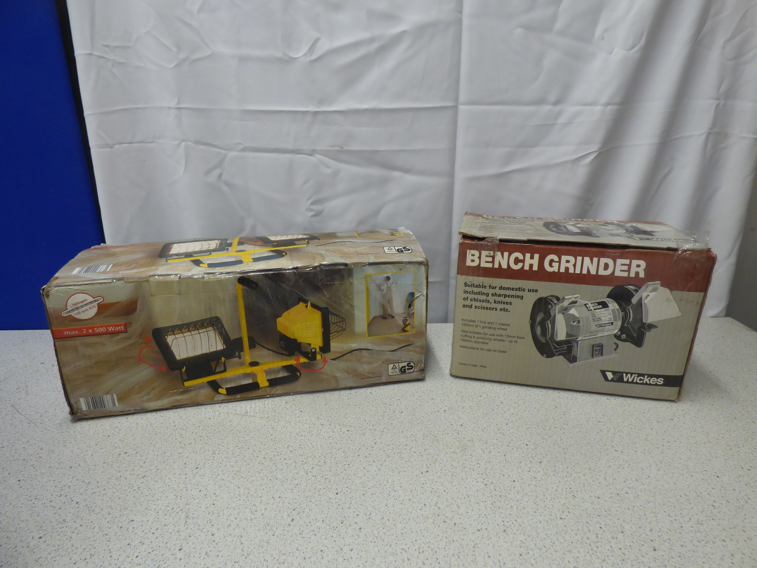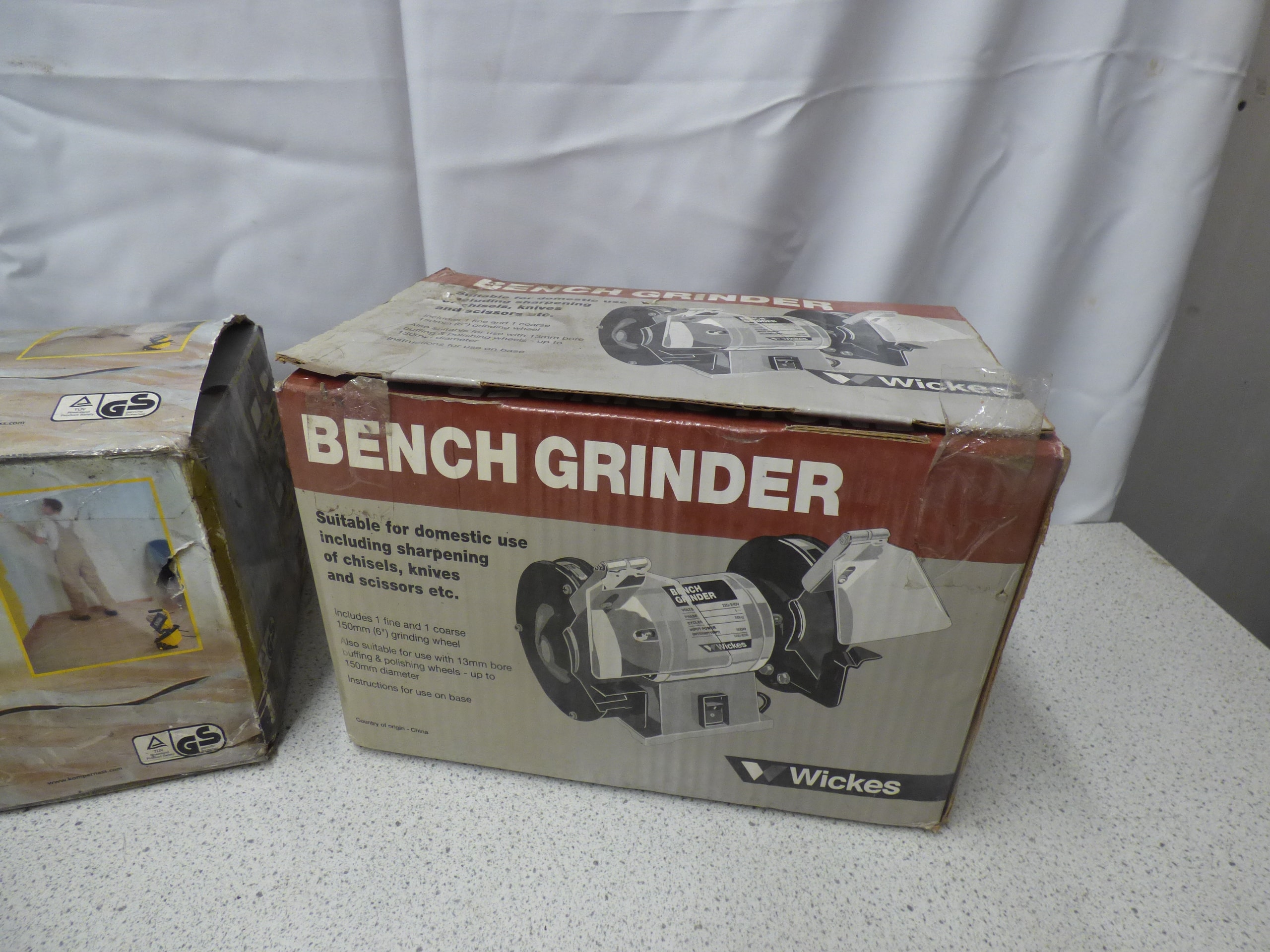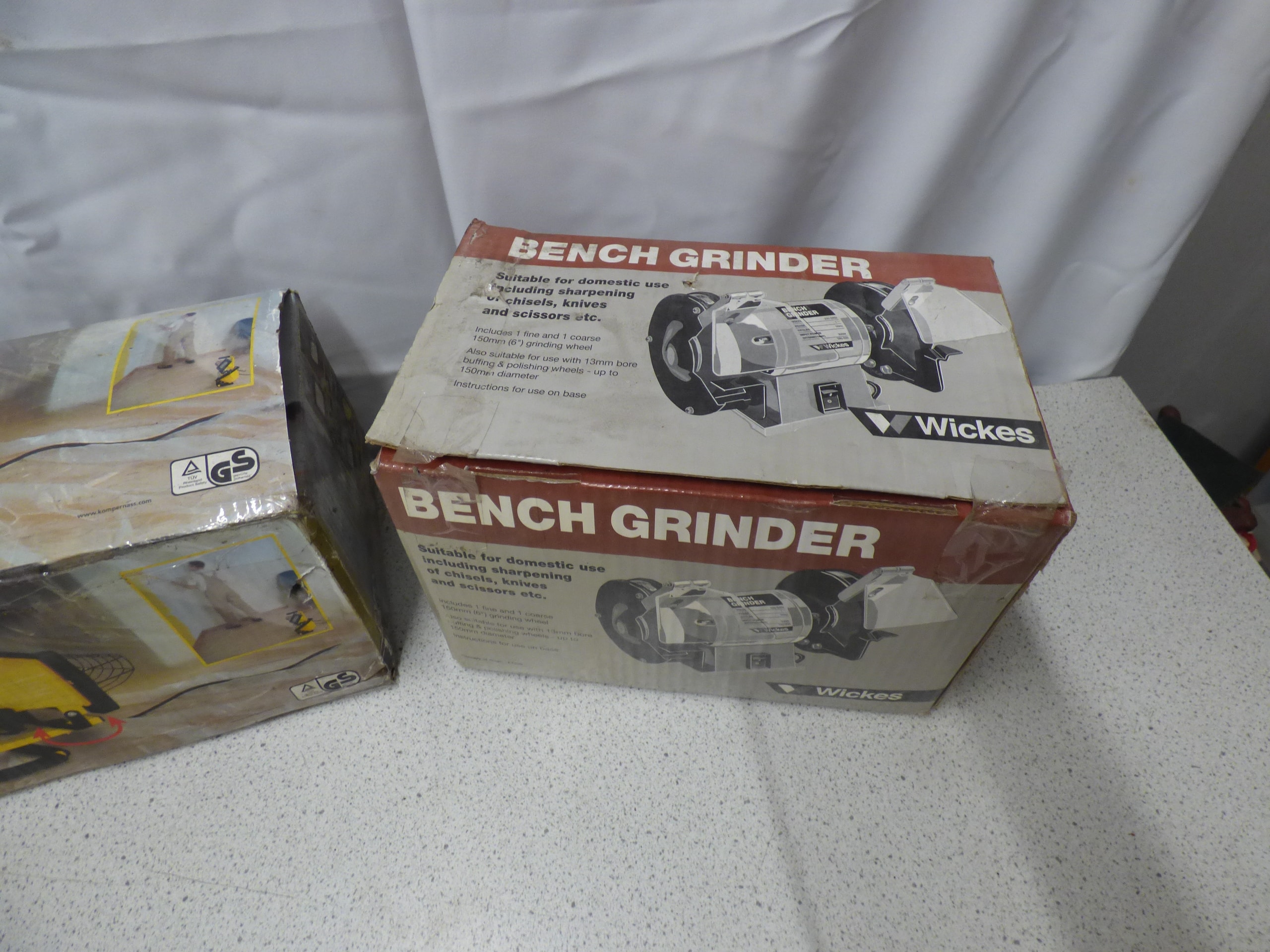 Both New in Original Boxes. A brown boxed Wickes Bench Grinder, depicted as a silver and black power tool, suitable for domestic use including sharpening of chisels, knives and scissors etc., includes 1 fine and 1 coarse 150mm (6″) grinding wheel. Site Light. Untested