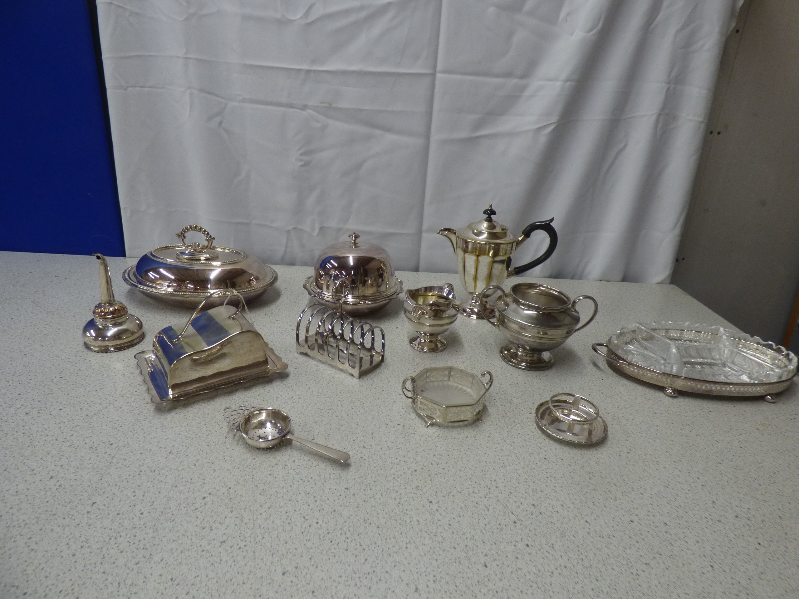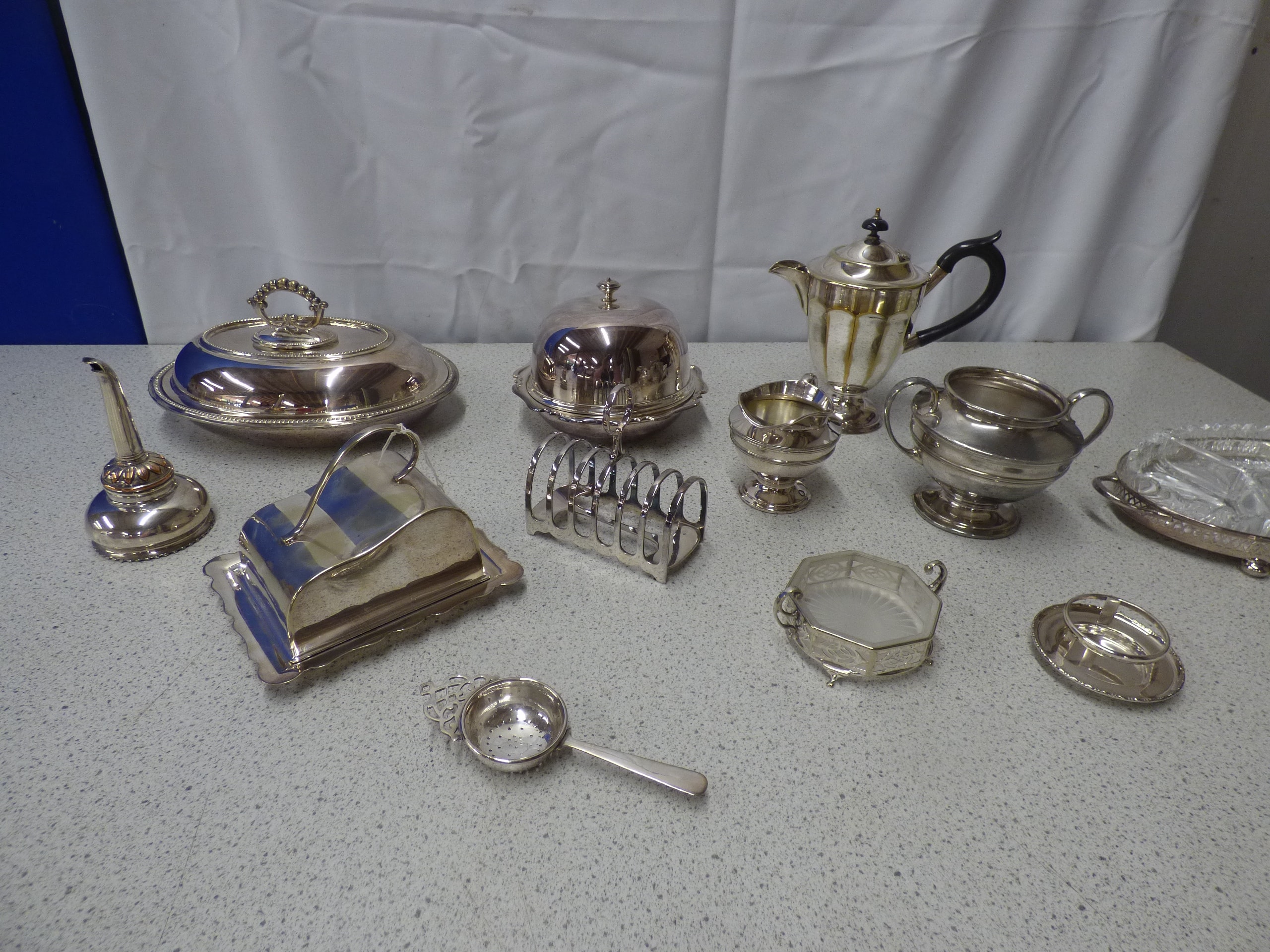A collection of silver-coloured metal tableware, including a teapot, lidded dishes, and serving accessories.
