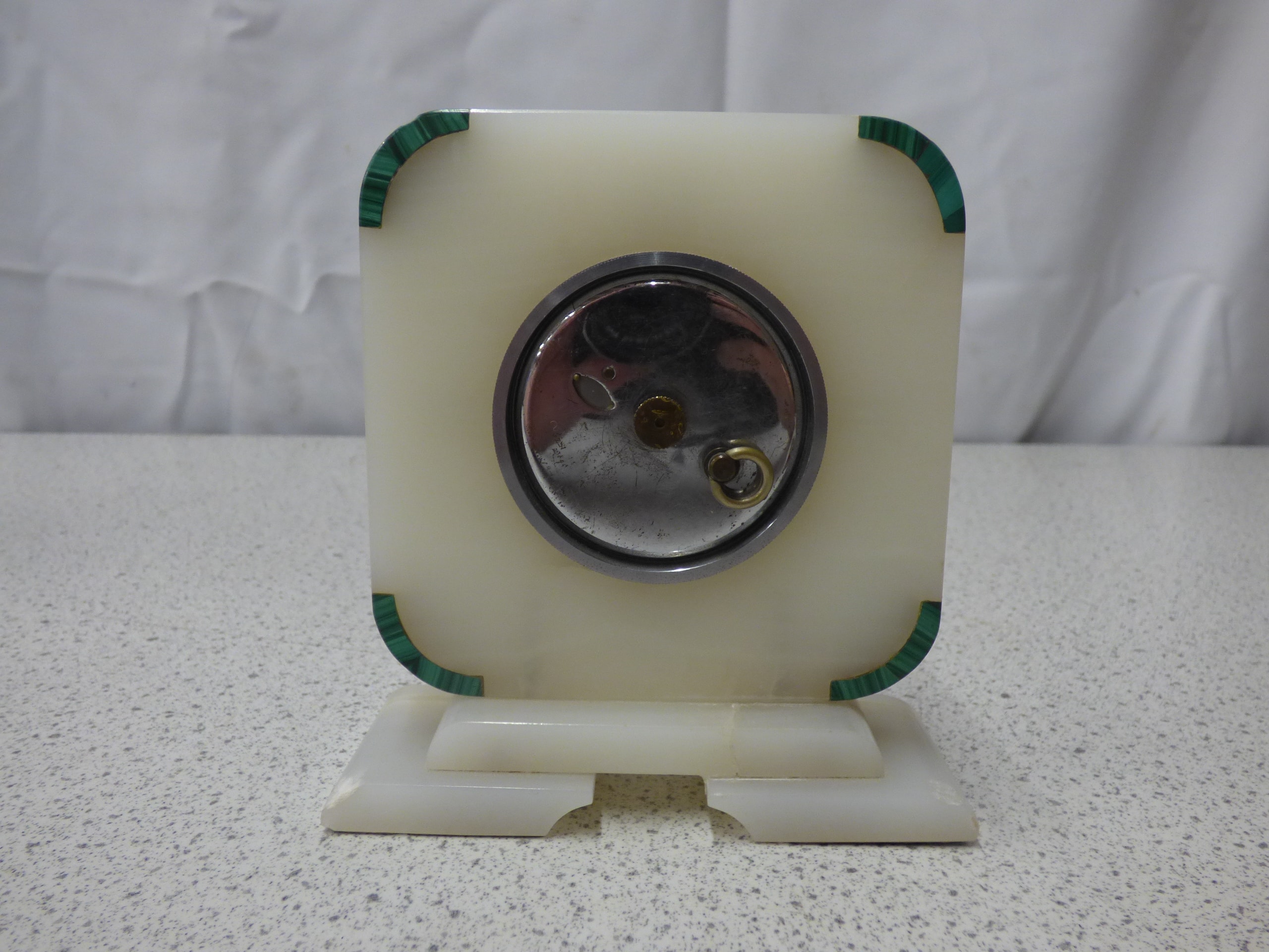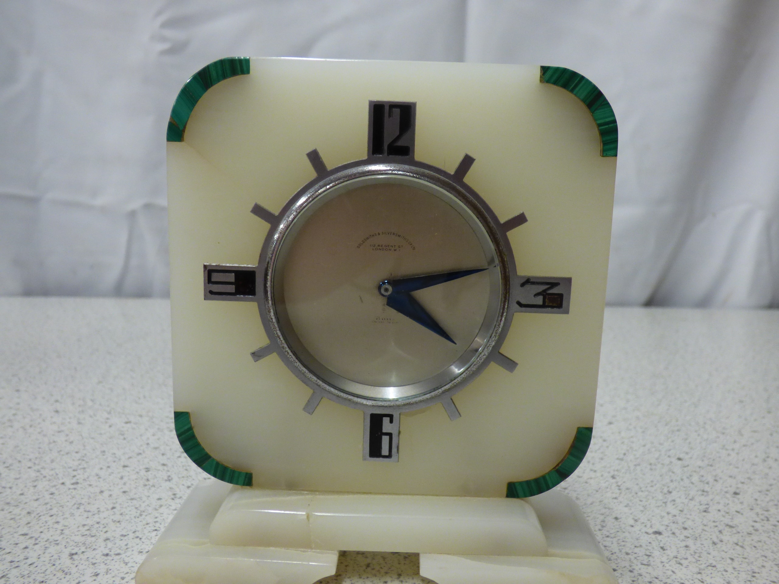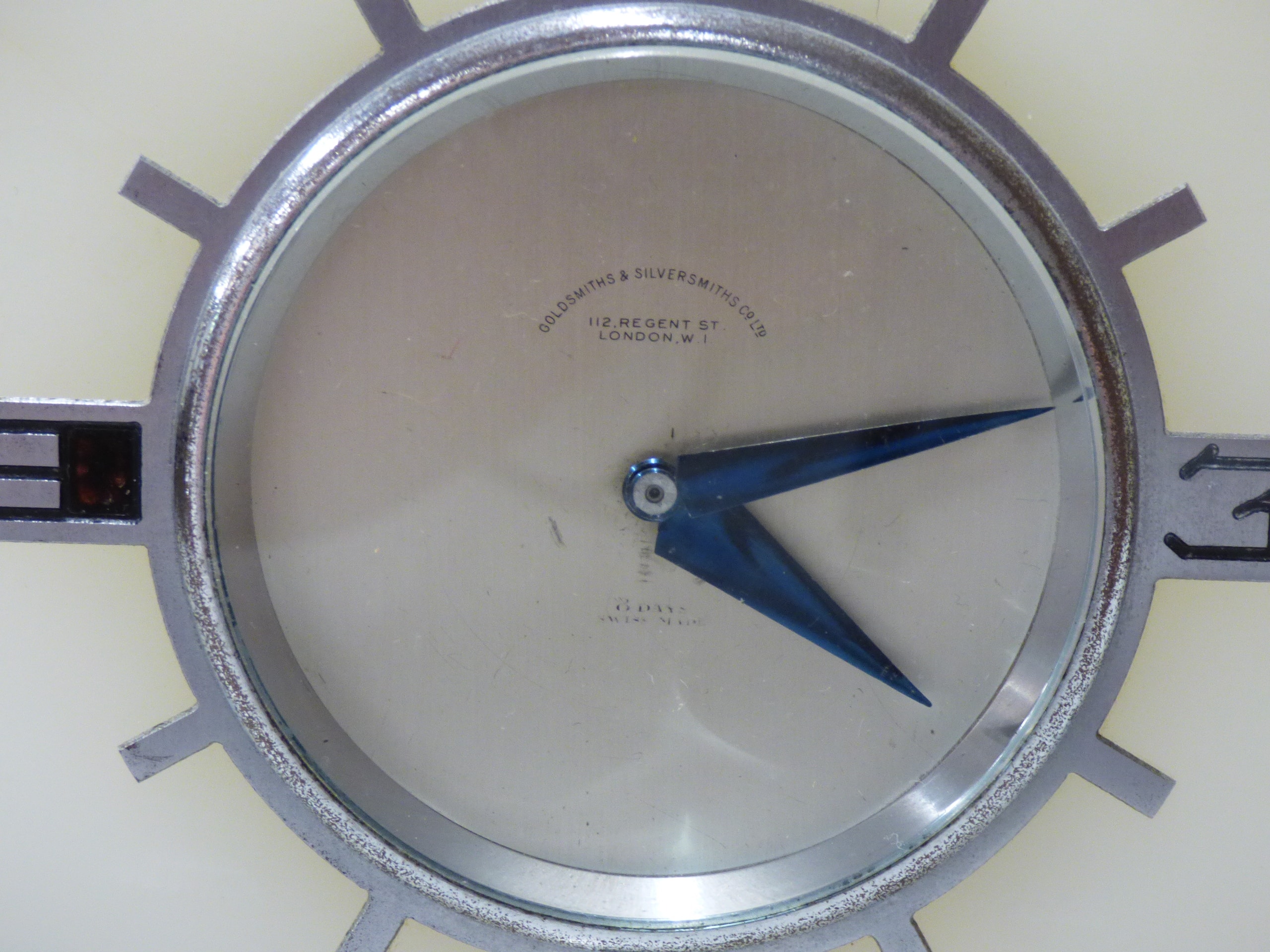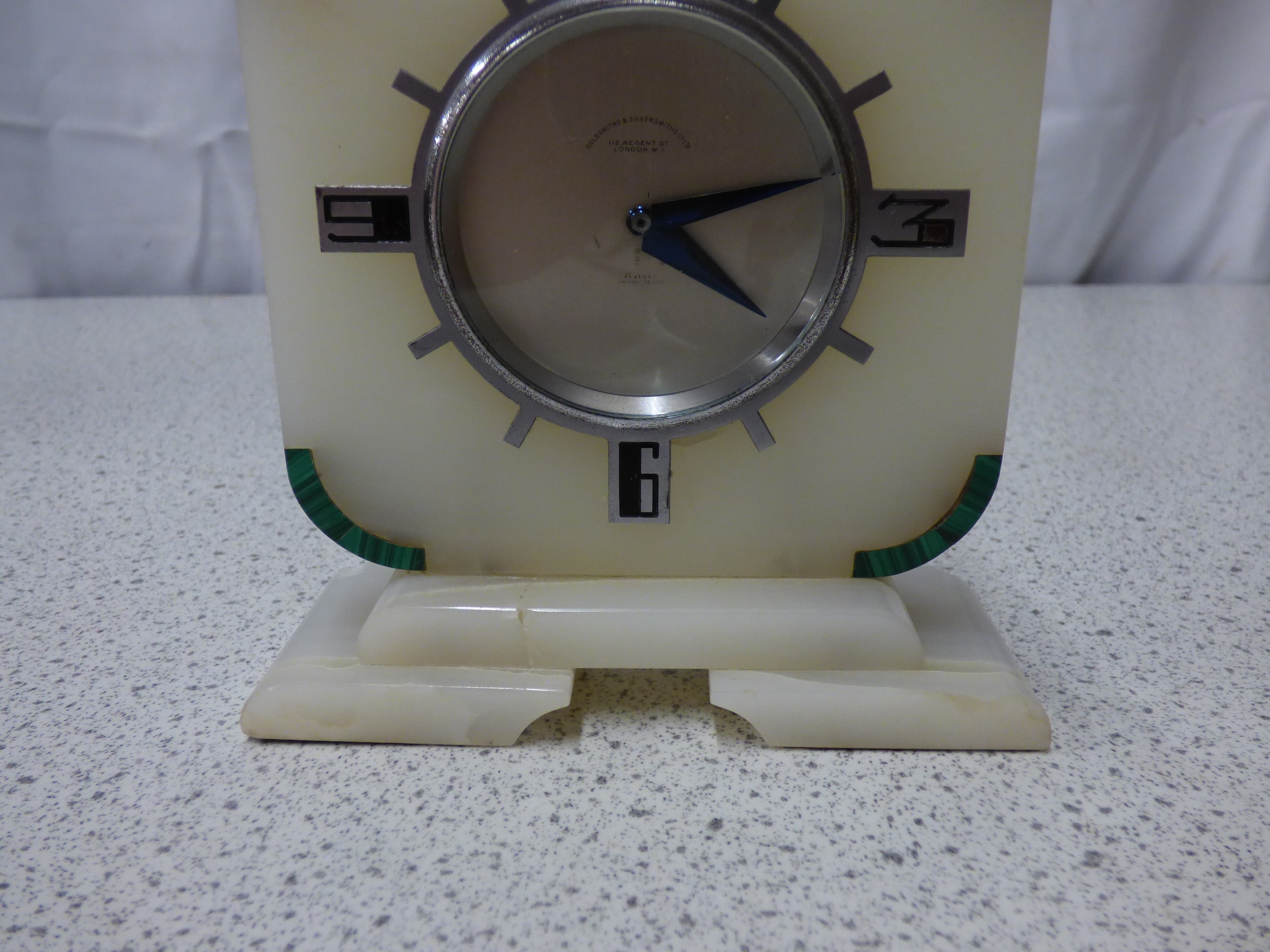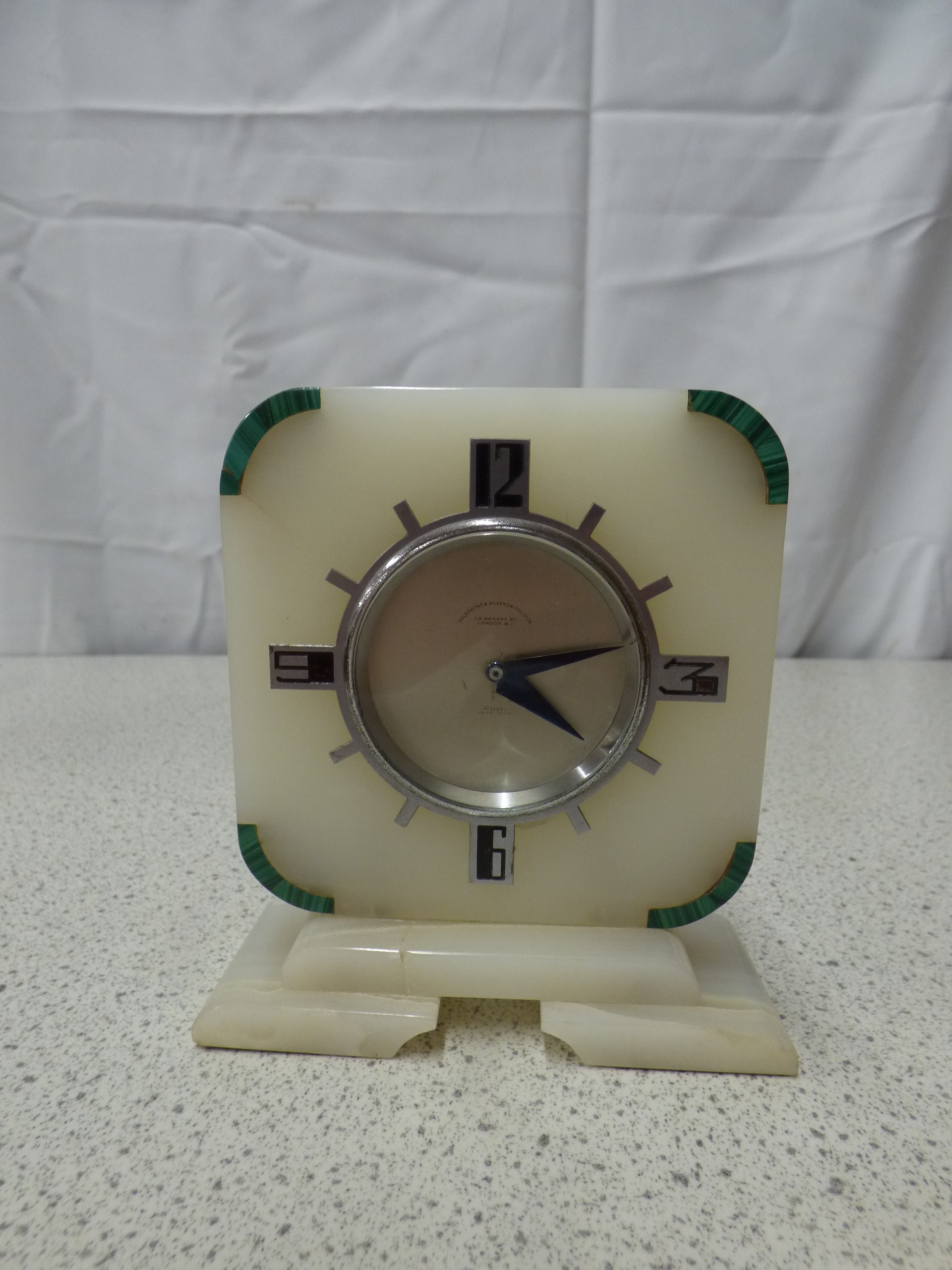 An Art Deco mantle clock, primarily creamy white with green accents, displaying ‘GOLDSMITHS & SILVERSMITHS CO. LTD’, ‘8 DAYS’, and ‘SWISS MADE’ on its silver-coloured face. 14cm Tall