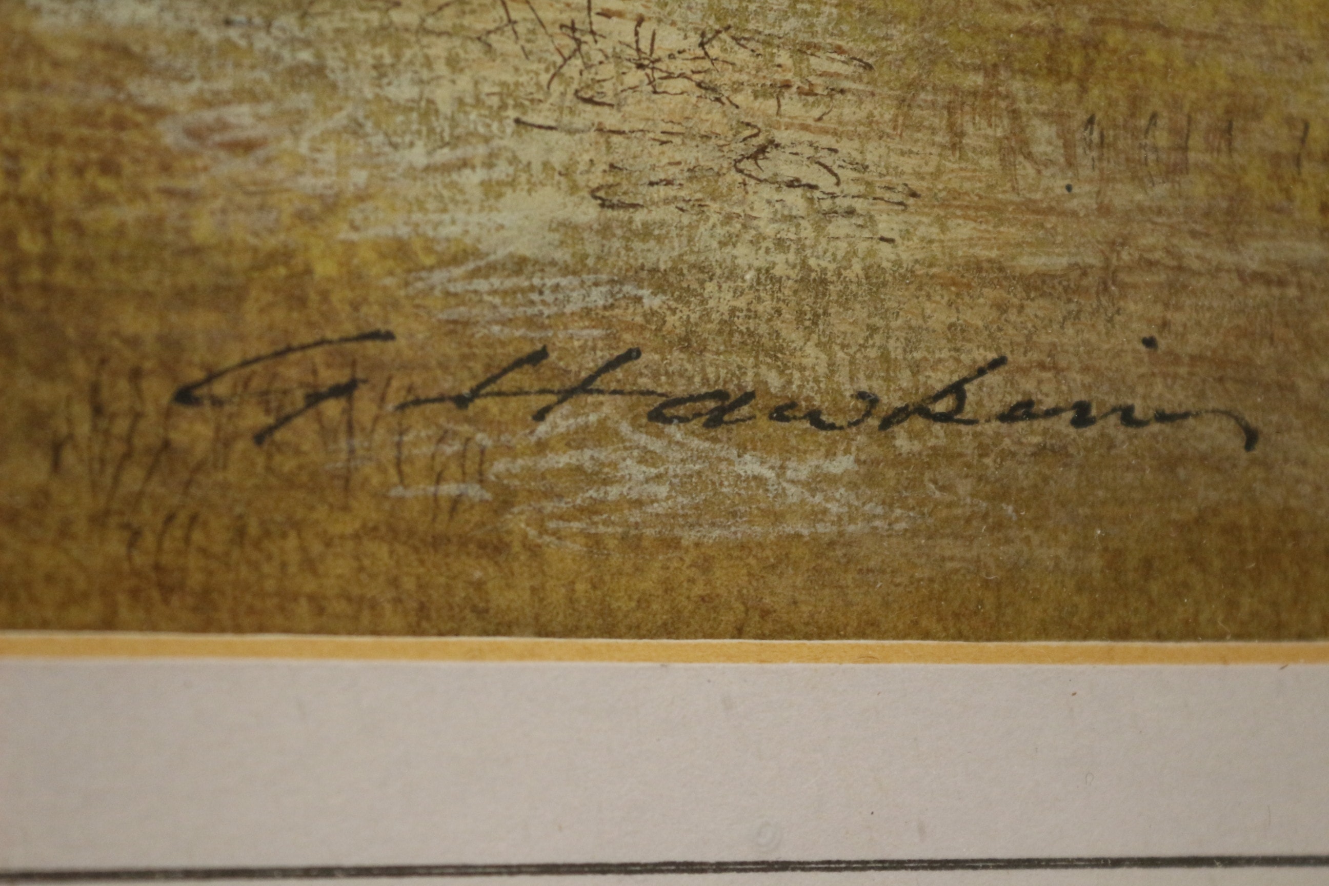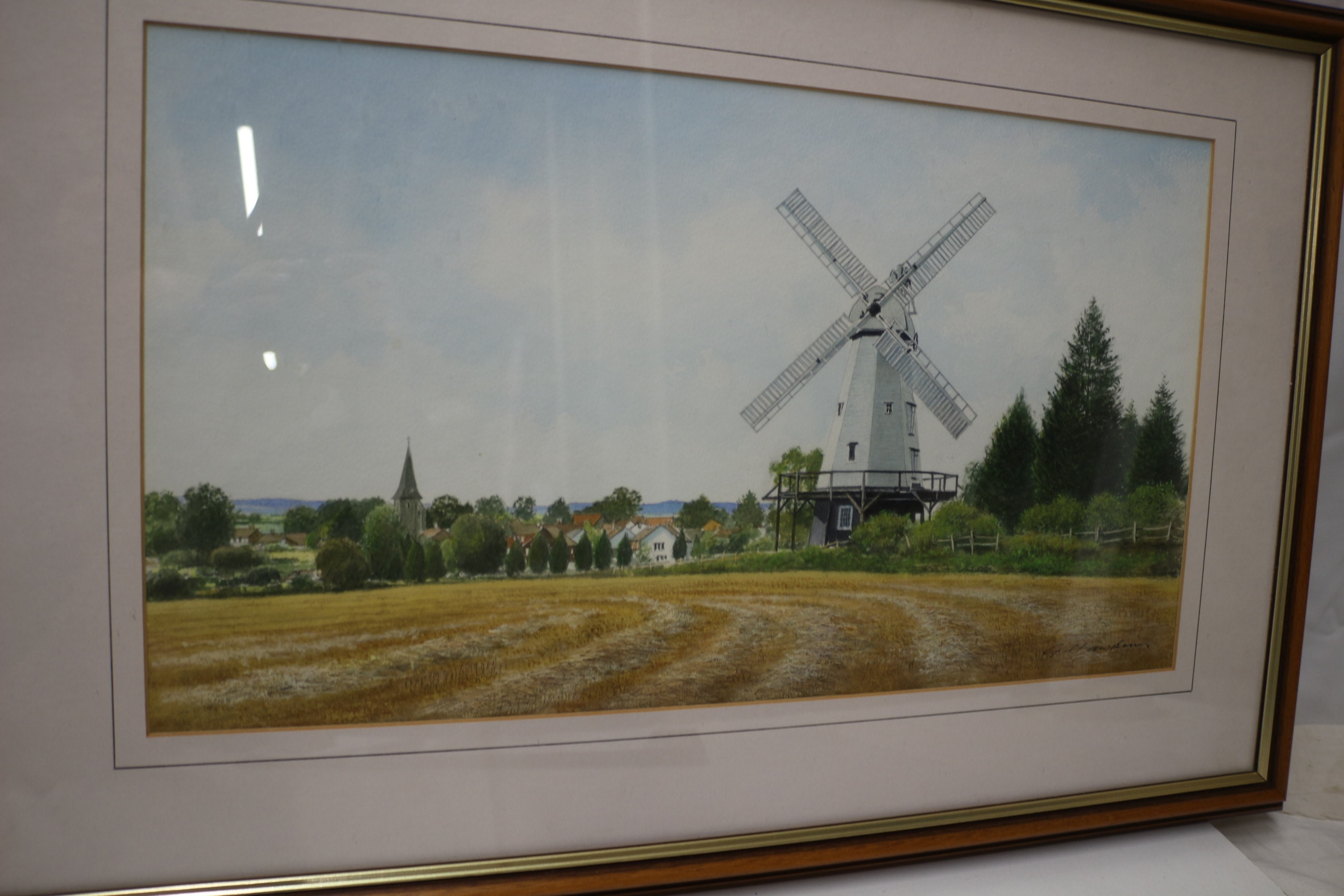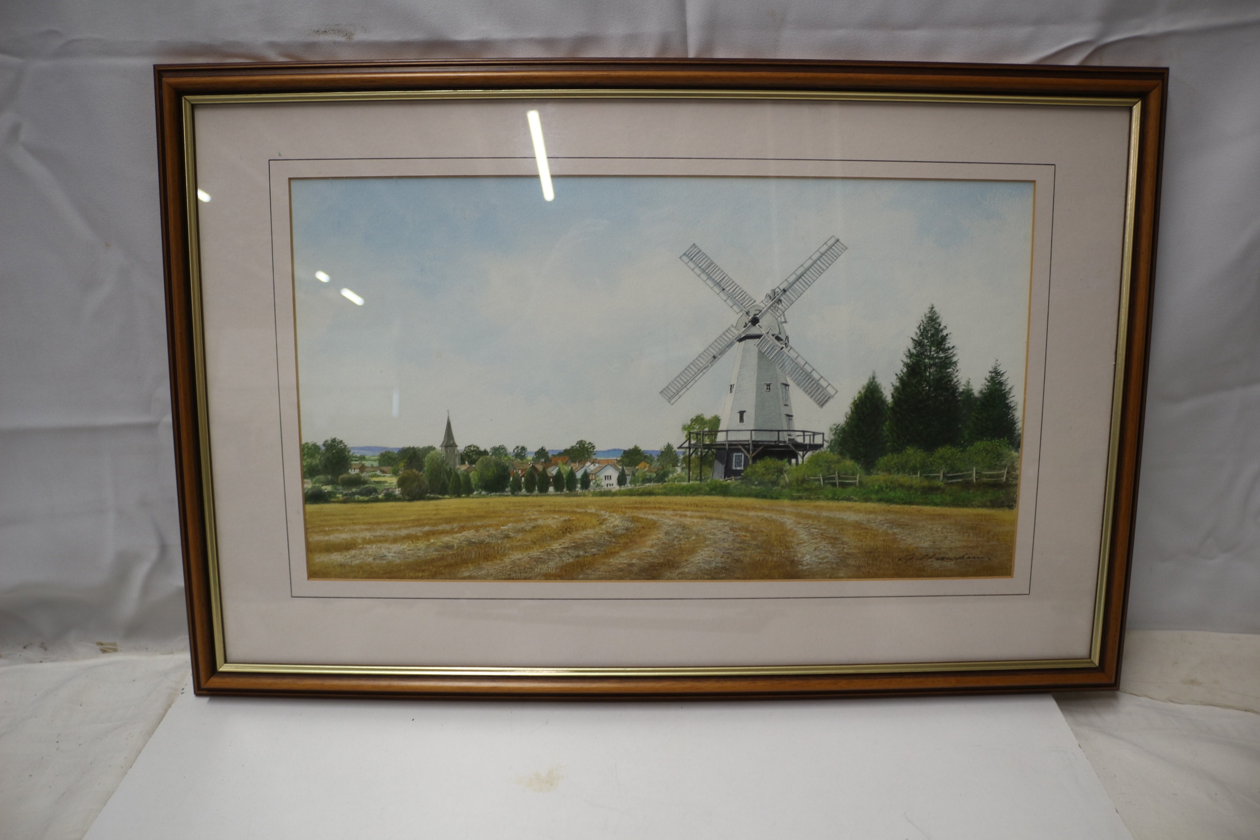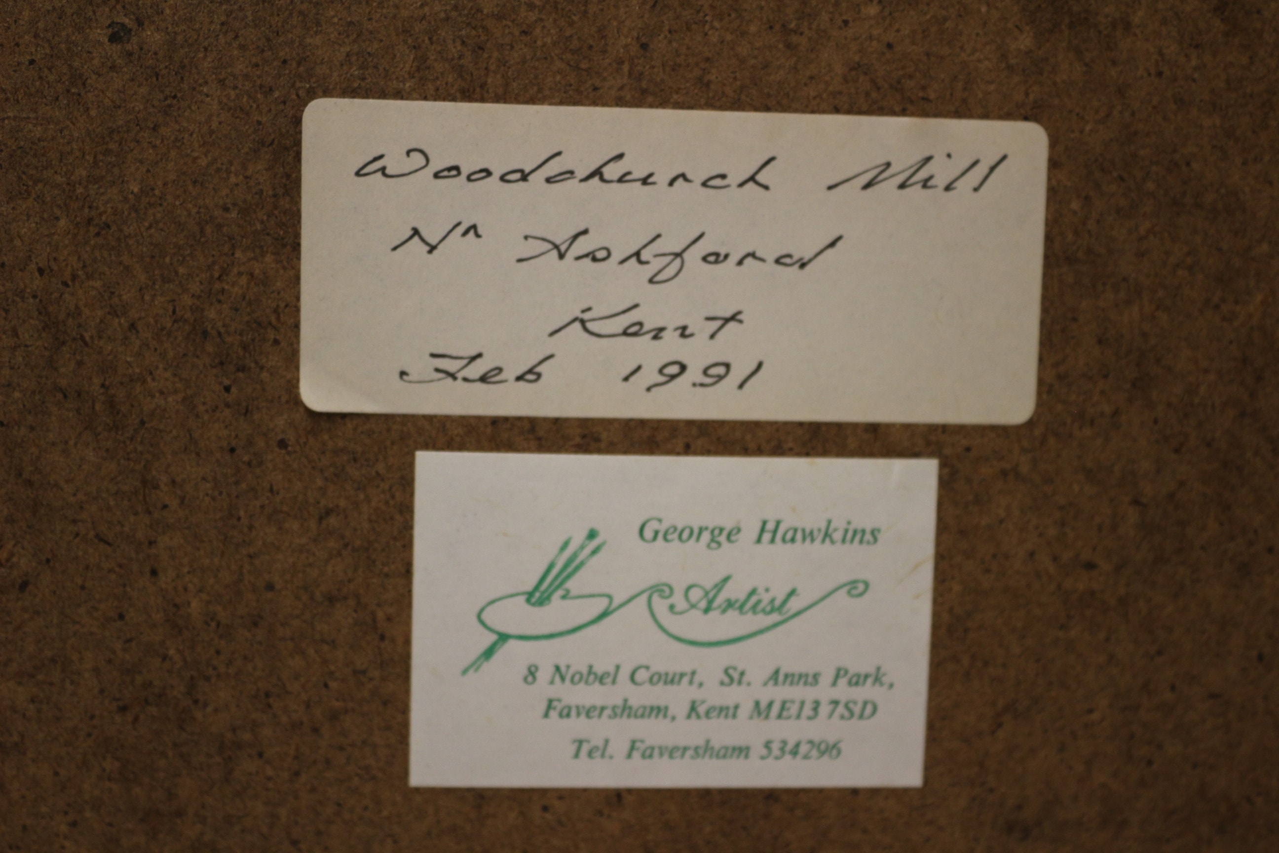A framed artwork by George Hawkins, titled ‘Woodchurch Mill, Nr Ashford, Kent’, dated February 1991. This watercolour or print, depicts a realistic rural landscape. A white post-mill with four sails and a dark base is positioned on the right, overlooking a harvested golden field in the foreground. In the background to the left, a village with a prominent church spire is visible among trees. The artwork is signed ‘G. Hawkins’ in the lower right corner. It is presented under glass, within a light-colored mat, and a gold-toned wooden frame. Labels on the reverse confirm the scene as ‘Woodchurch Mill, Nr Ashford, Kent, ‘ dated ‘Feb 1991,’ and identify the artist as ‘George Hawkins, ‘ with a contact address in Faversham, Kent.