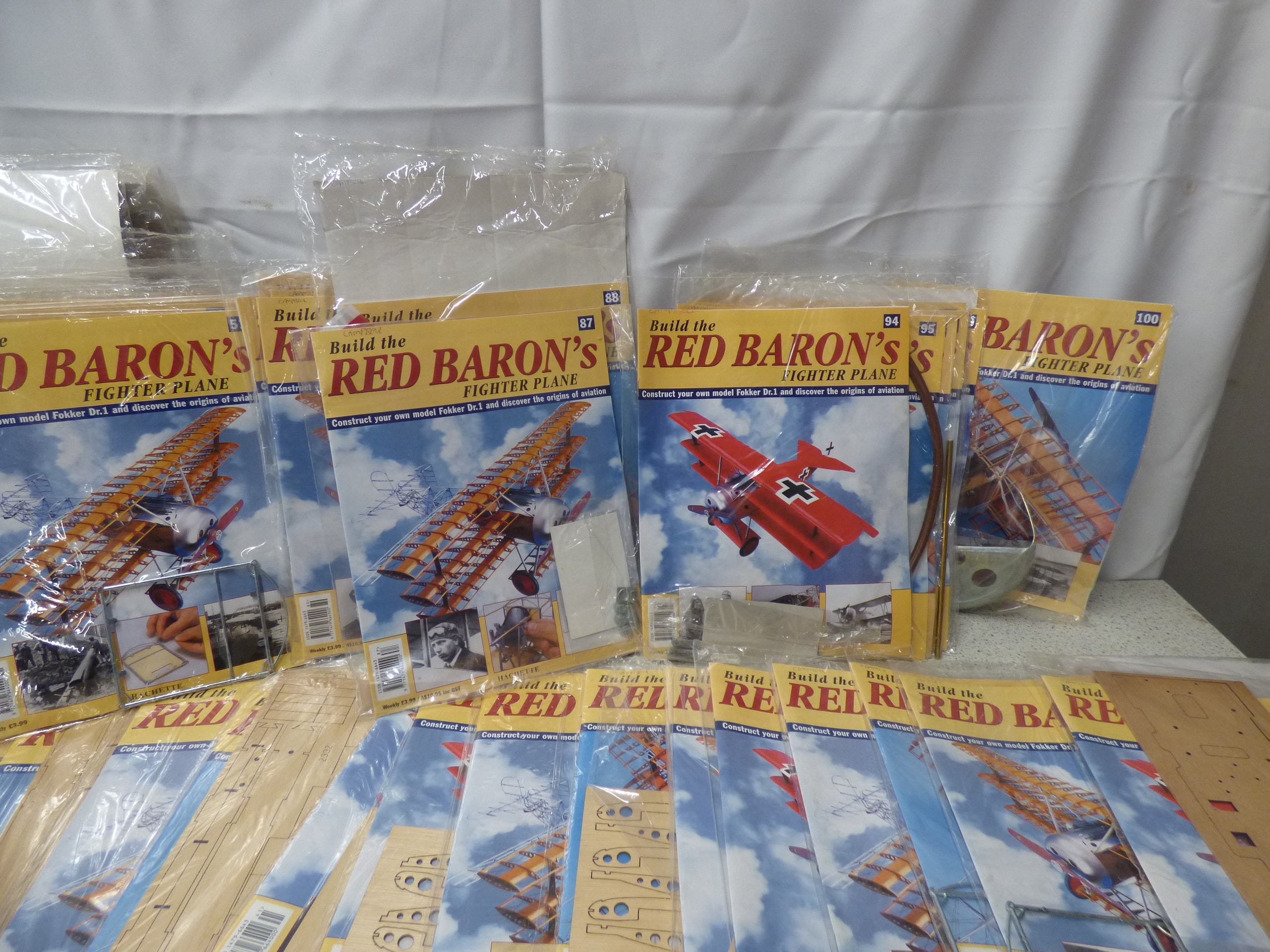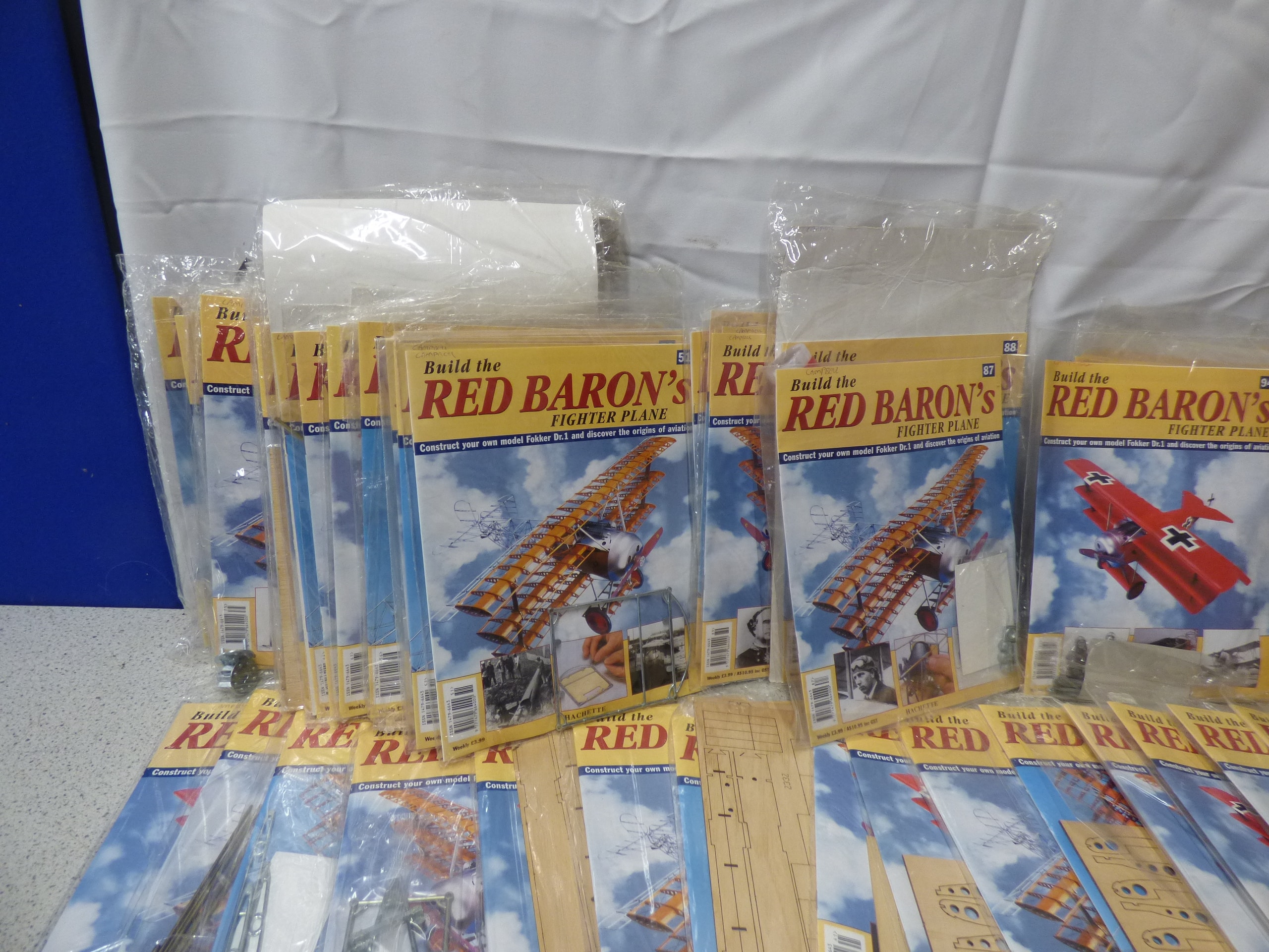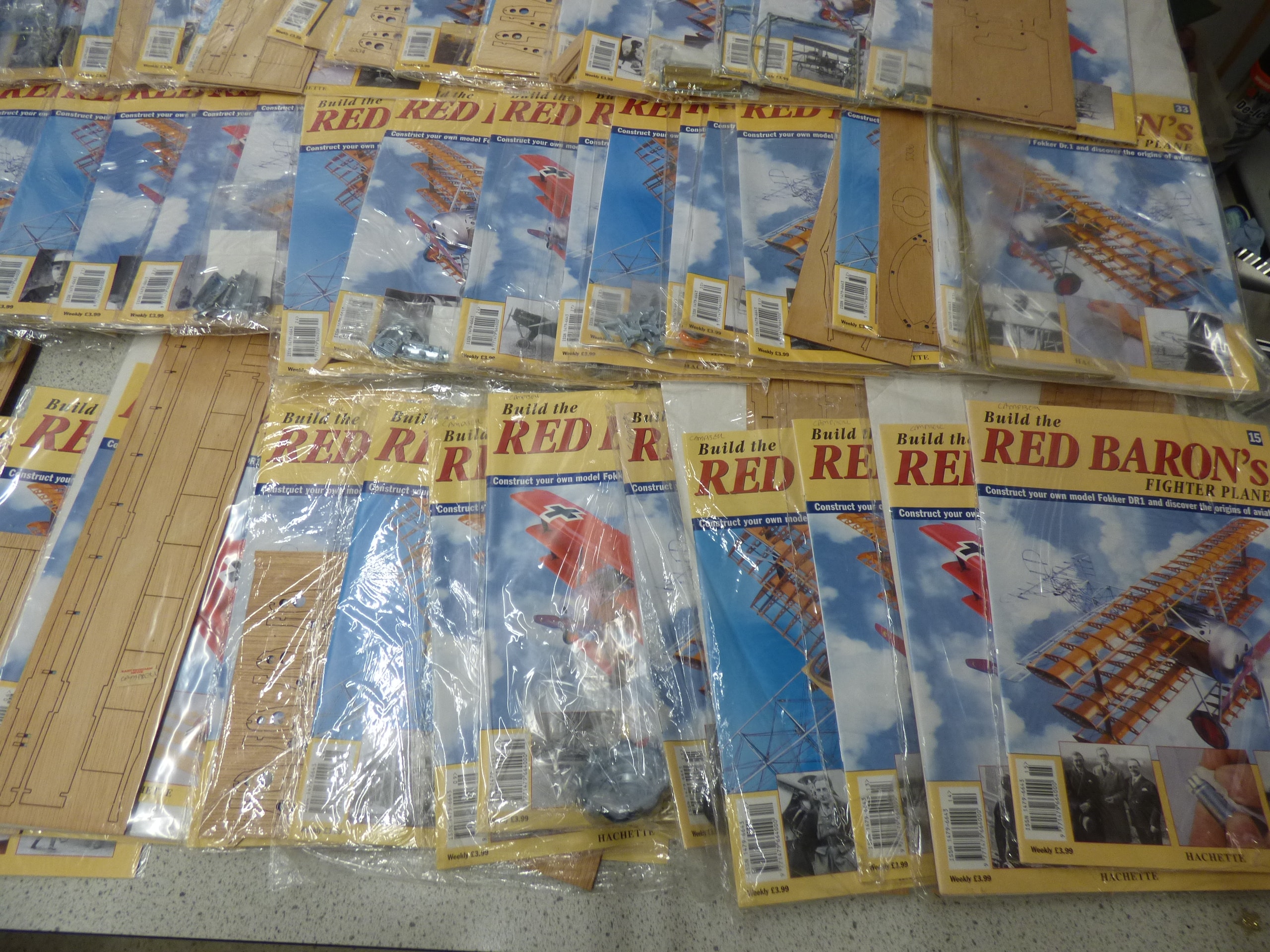 A collection of Hachette ‘Build the Red Baron’s Fighter Plane’ part-work magazines and model kits, individually packaged with laser-cut wooden parts, each marked ‘Weekly £3.99’. Full Set
