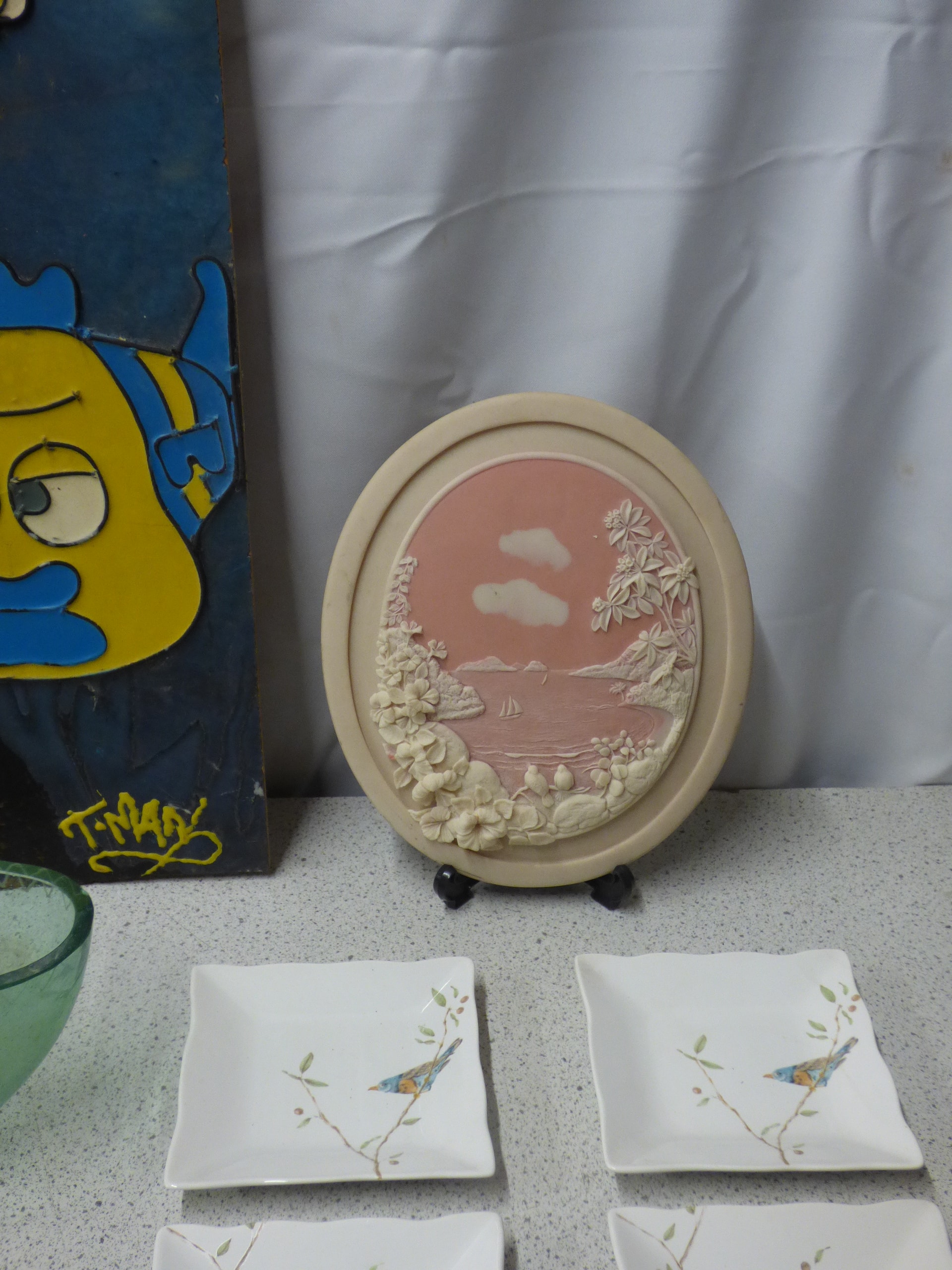 A varied collection including a signed ‘No Fishing’ painting, ceramic figurines, glass and ceramic bowls, a beaded handbag, framed art, vintage ‘The Bentley Drivers Club Review’ magazines, ‘Rolls Razor’ and ‘Wilkinson Sword’ razor blades, and other miscellaneous items.