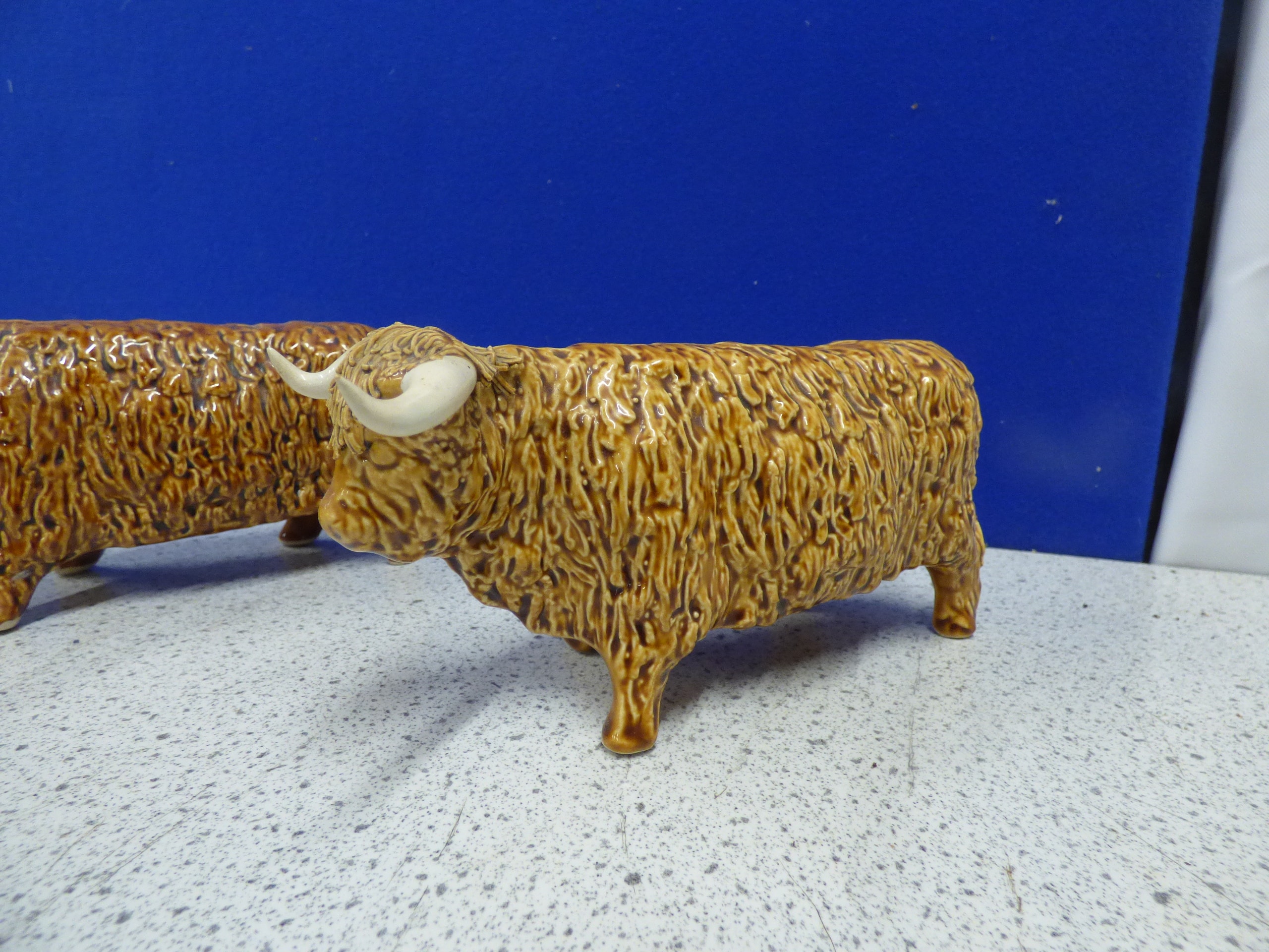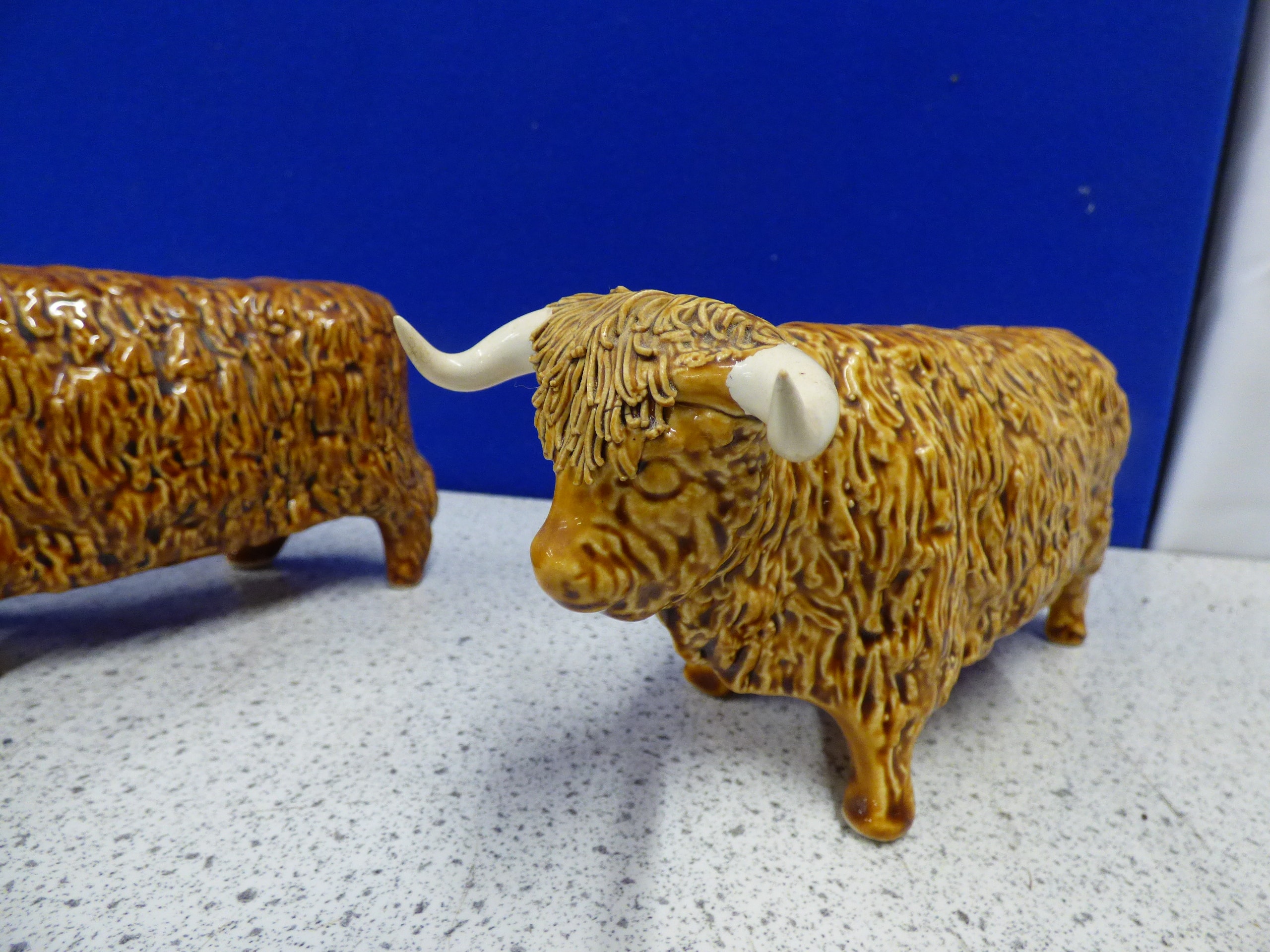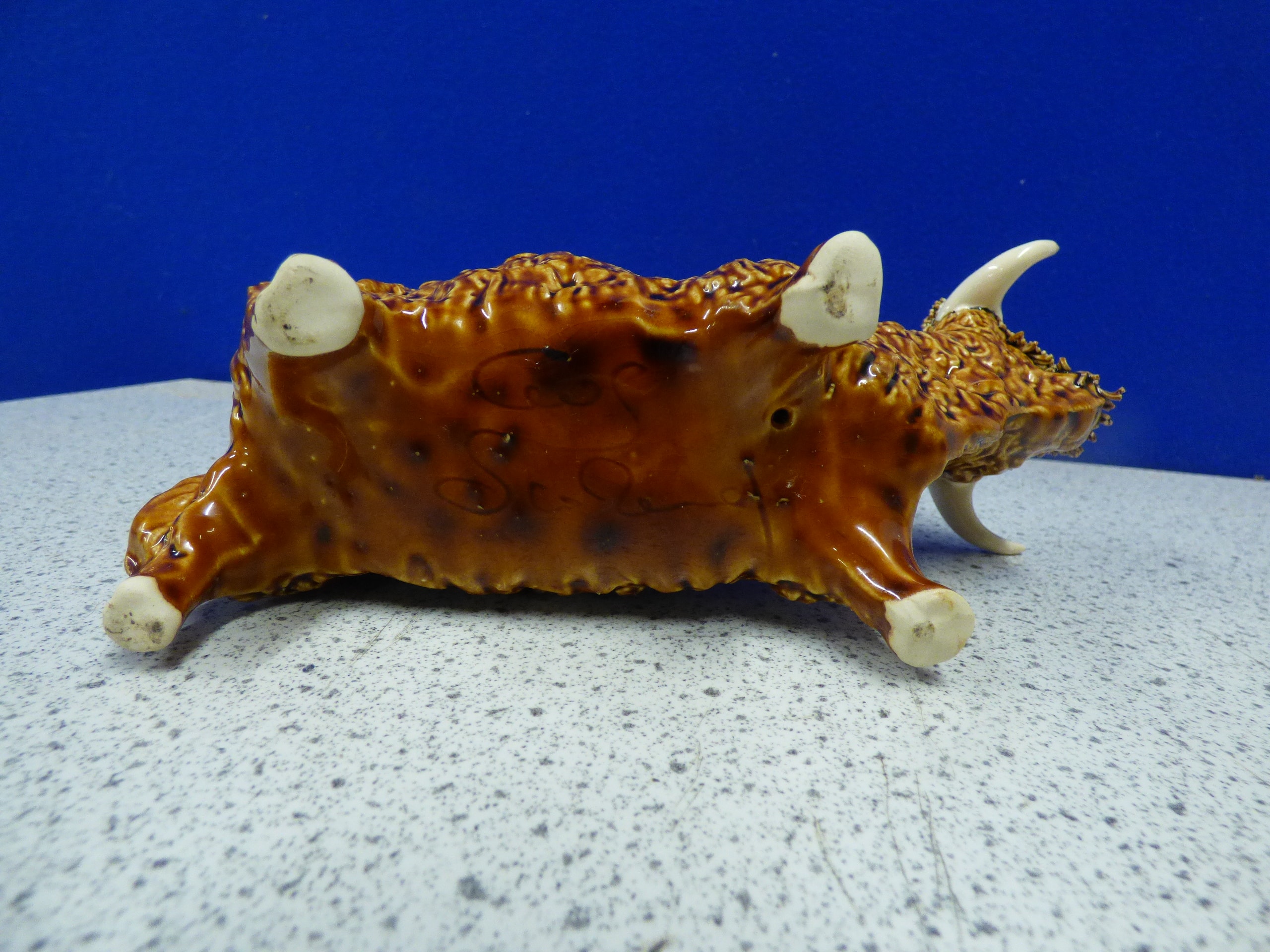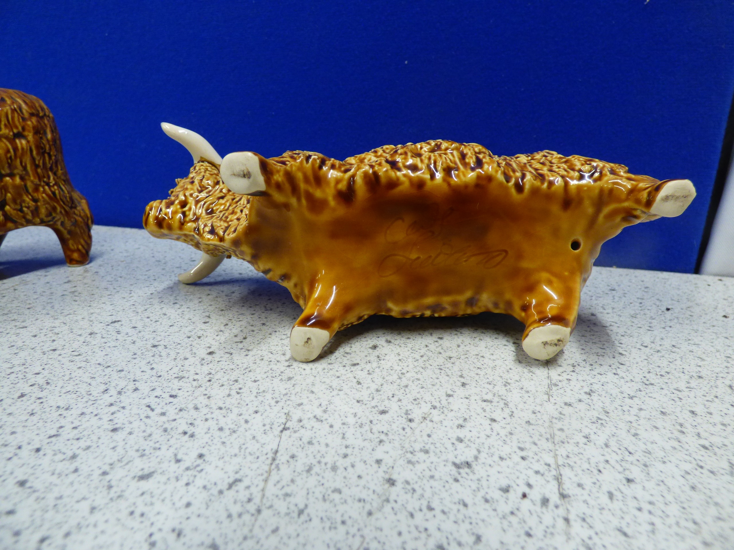 A pair of brown and white ceramic Highland cow figurines, signed on its underside. 20cm Long