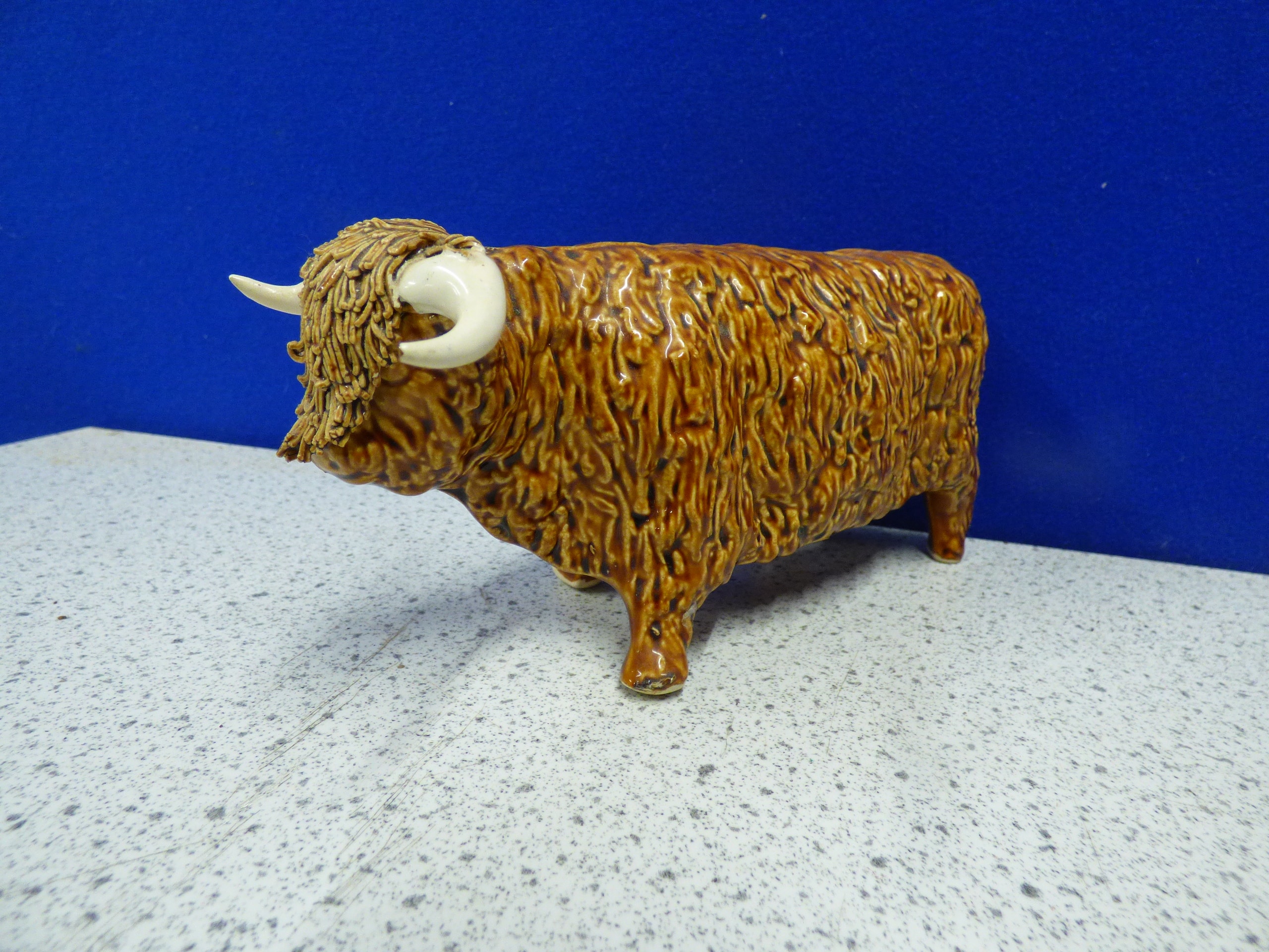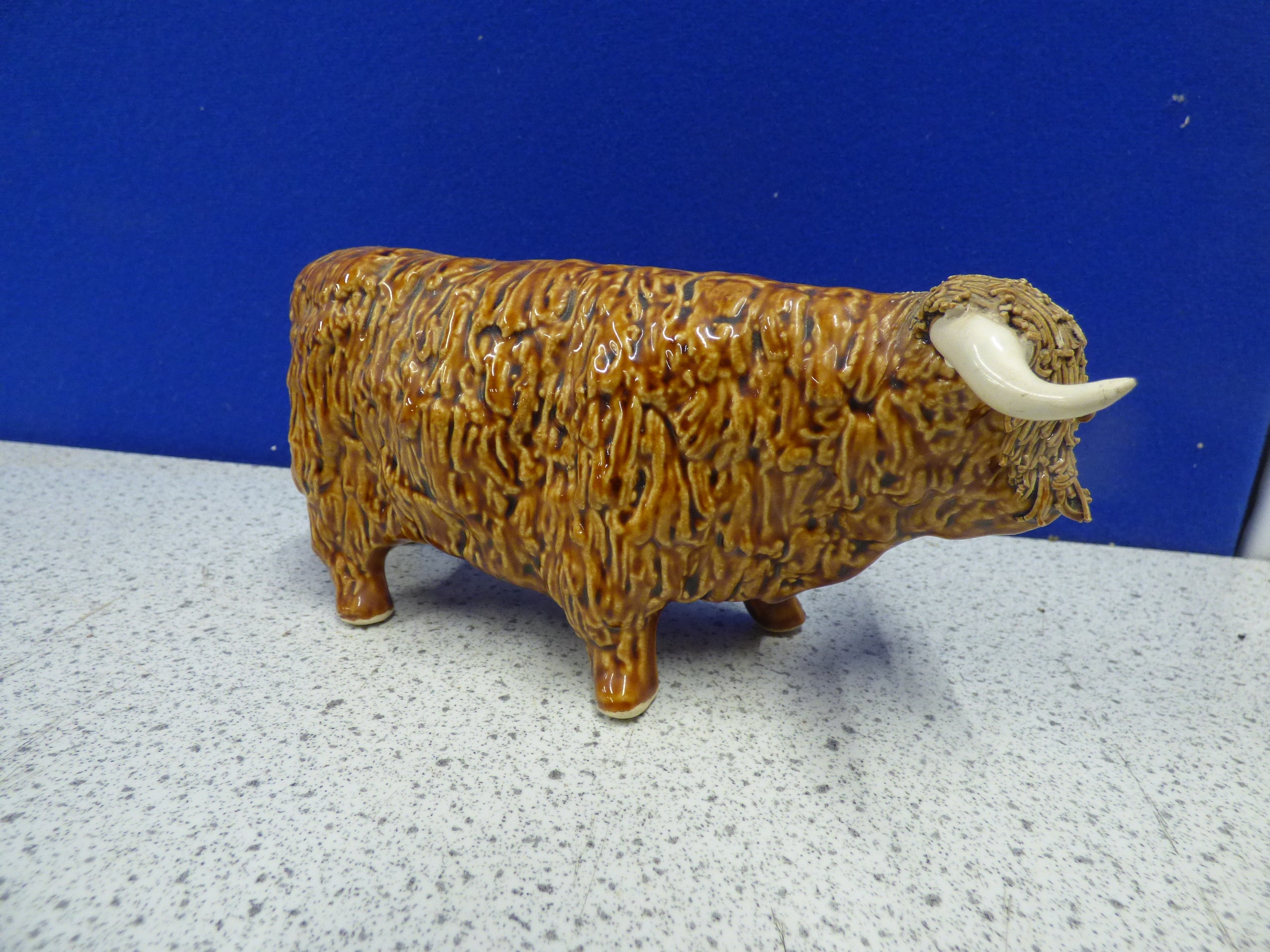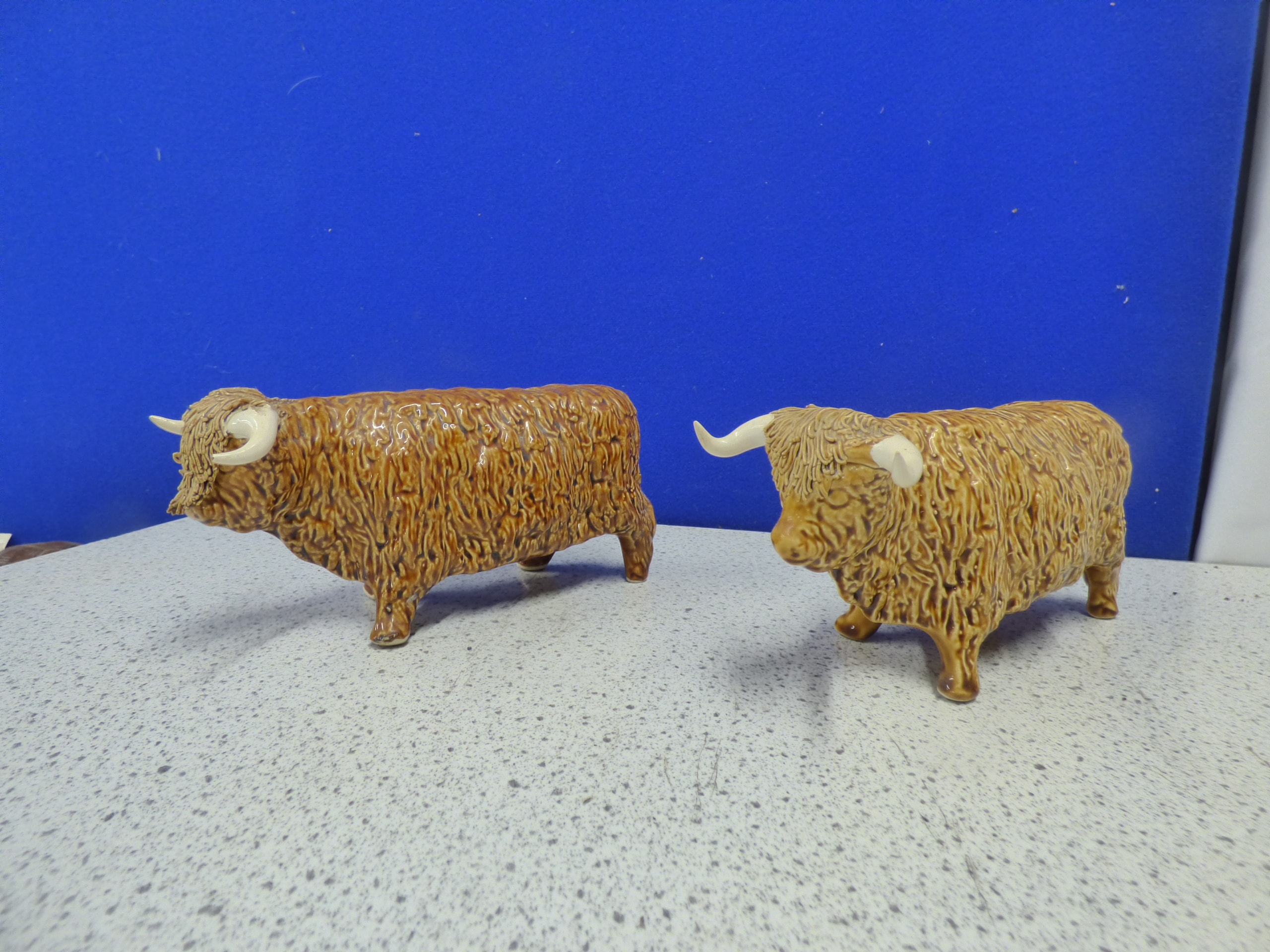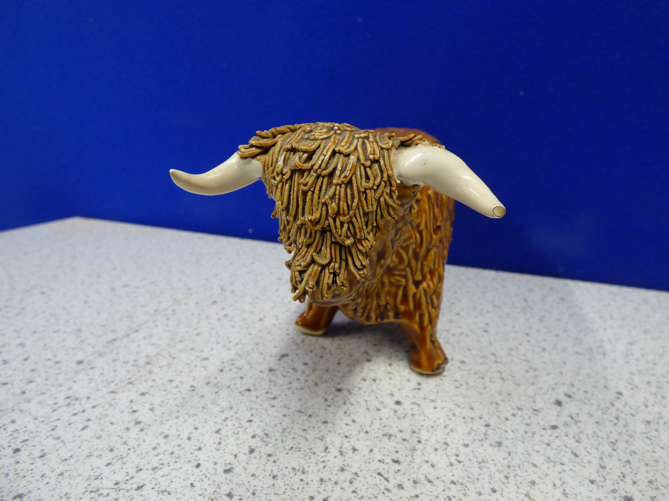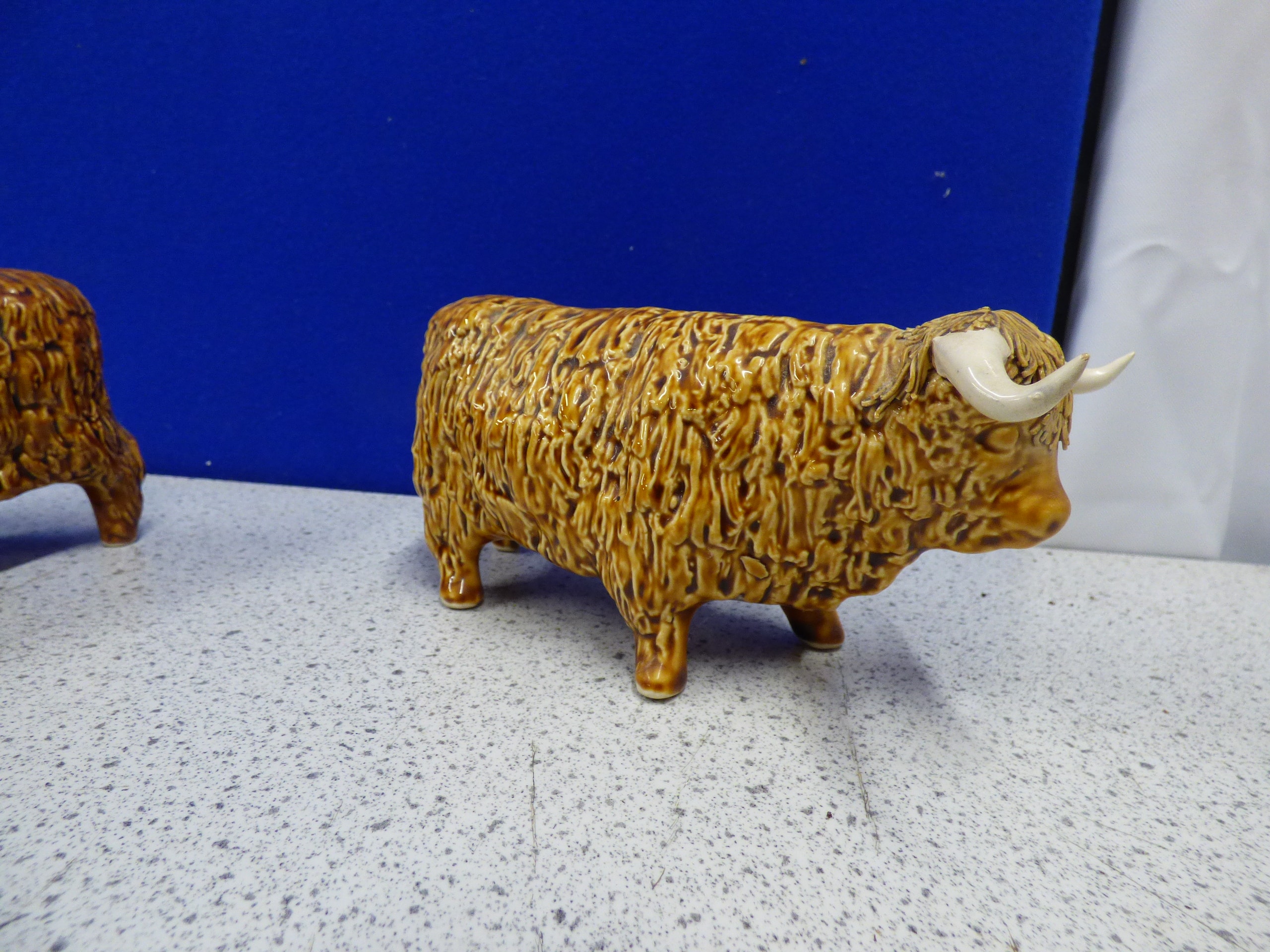 A pair of brown and white ceramic Highland cow figurines, signed on its underside. 20cm Long