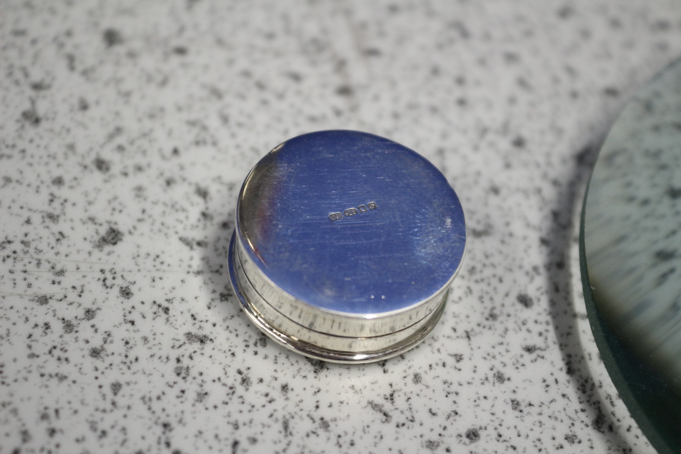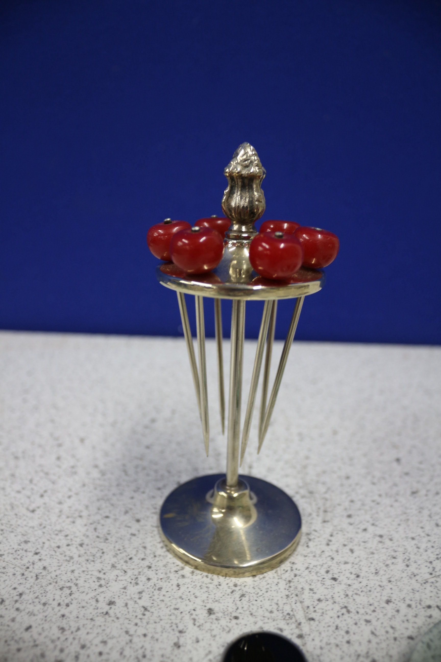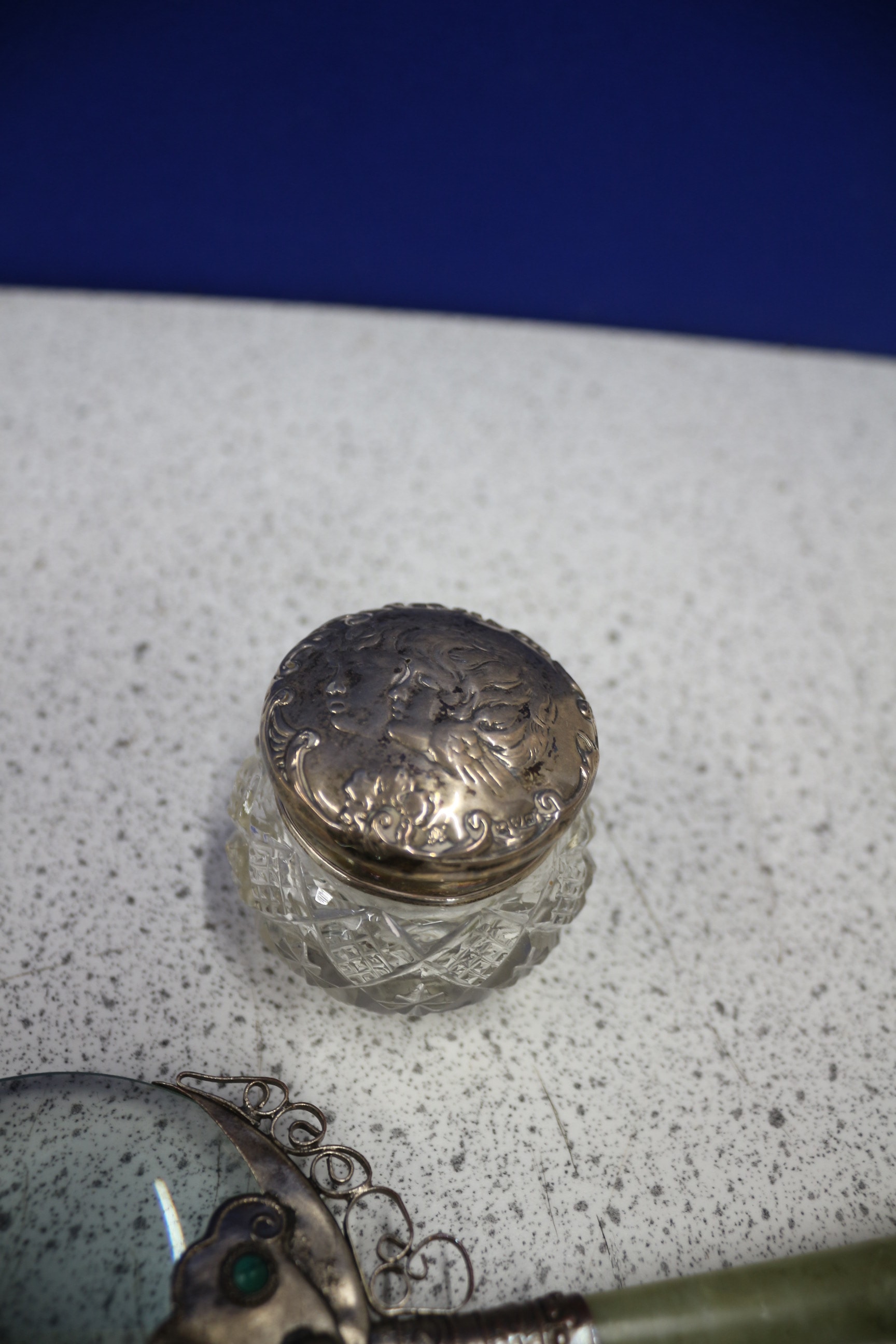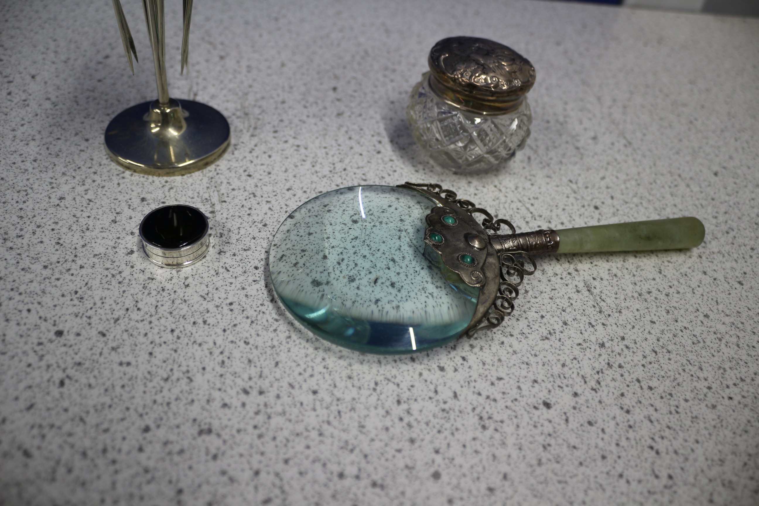 A silver-toned cocktail pick holder with six red apple-topped picks, a small silver lidded box with ‘G & S Co Ltd’ hallmarks, an ornate magnifying glass with a green jade-coloued handle, and a small clear cut-glass jar with a silver lid featuring lion passant, anchor, and date letter hallmarks.