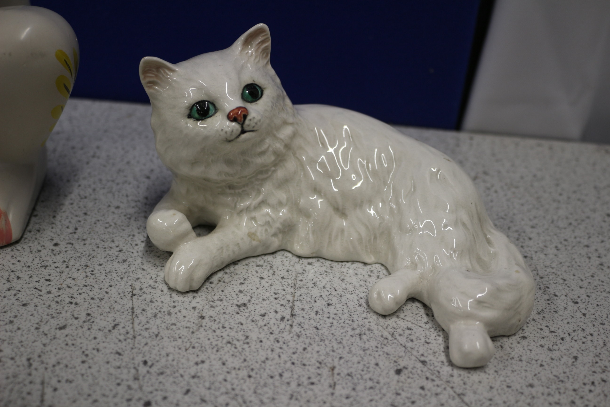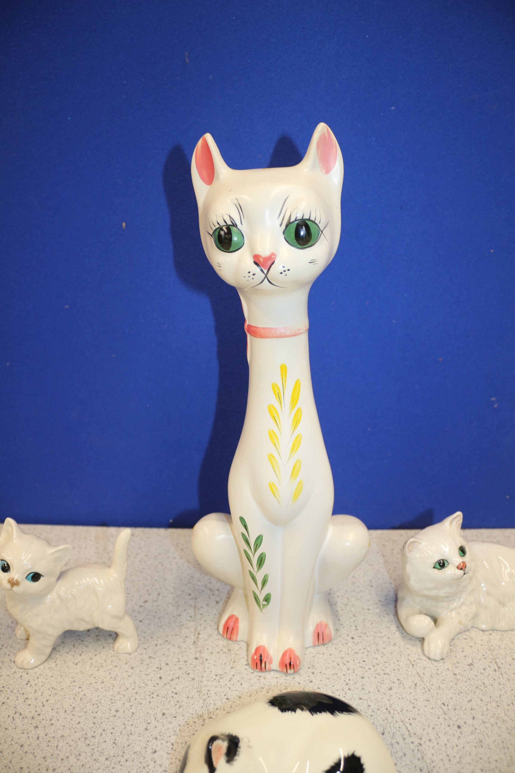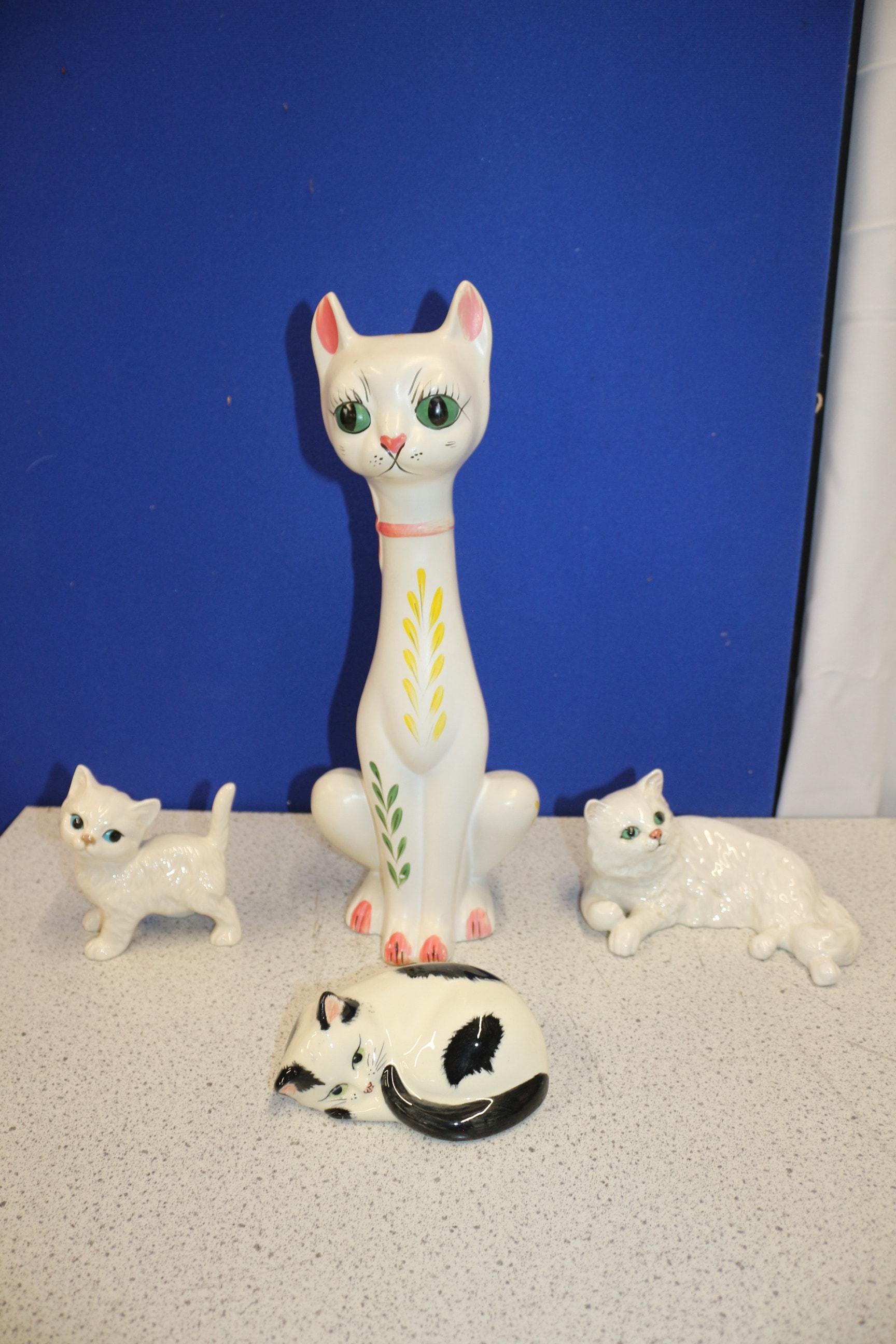 A collection of four ceramic cat figurines, including a tall white standing cat with pink, green, and yellow accents 37cm tall, a small white standing kitten with blue eyes, a white lying cat with green eyes marked “BESWICK ENGLAND” and embossed “1895”, and a black and white sleeping cat with green eyes marked “COSMOS BARBICALE POTTERY ENGLAND”.