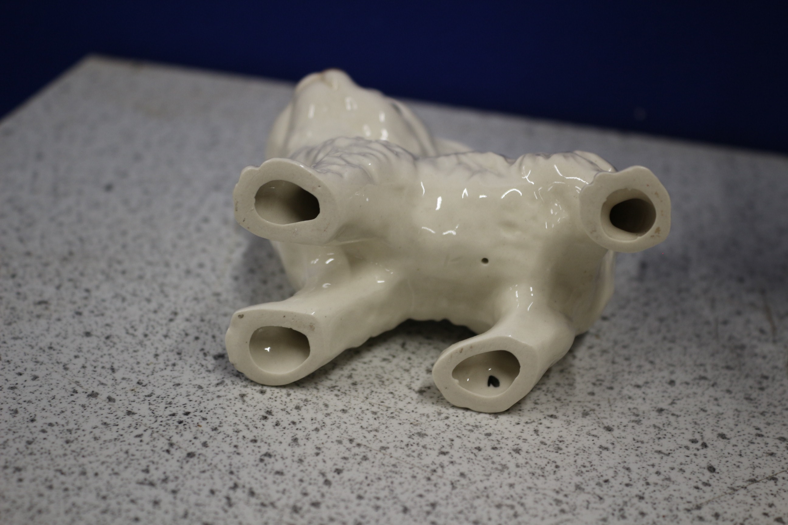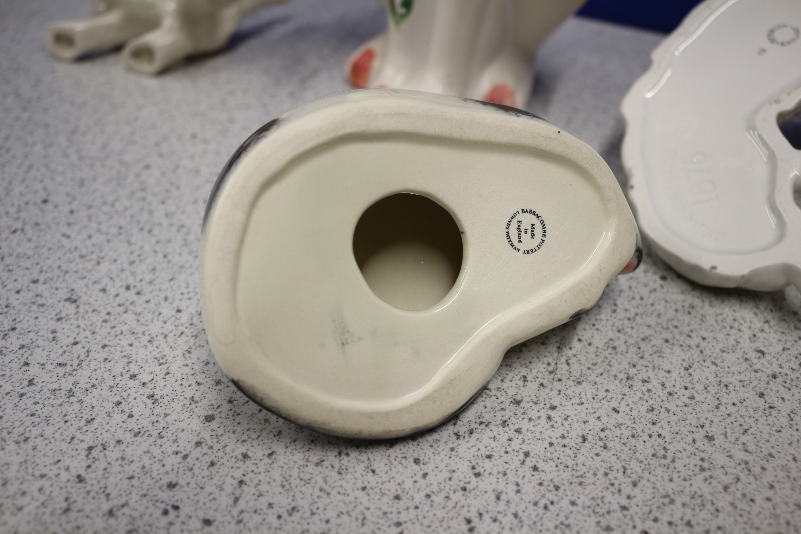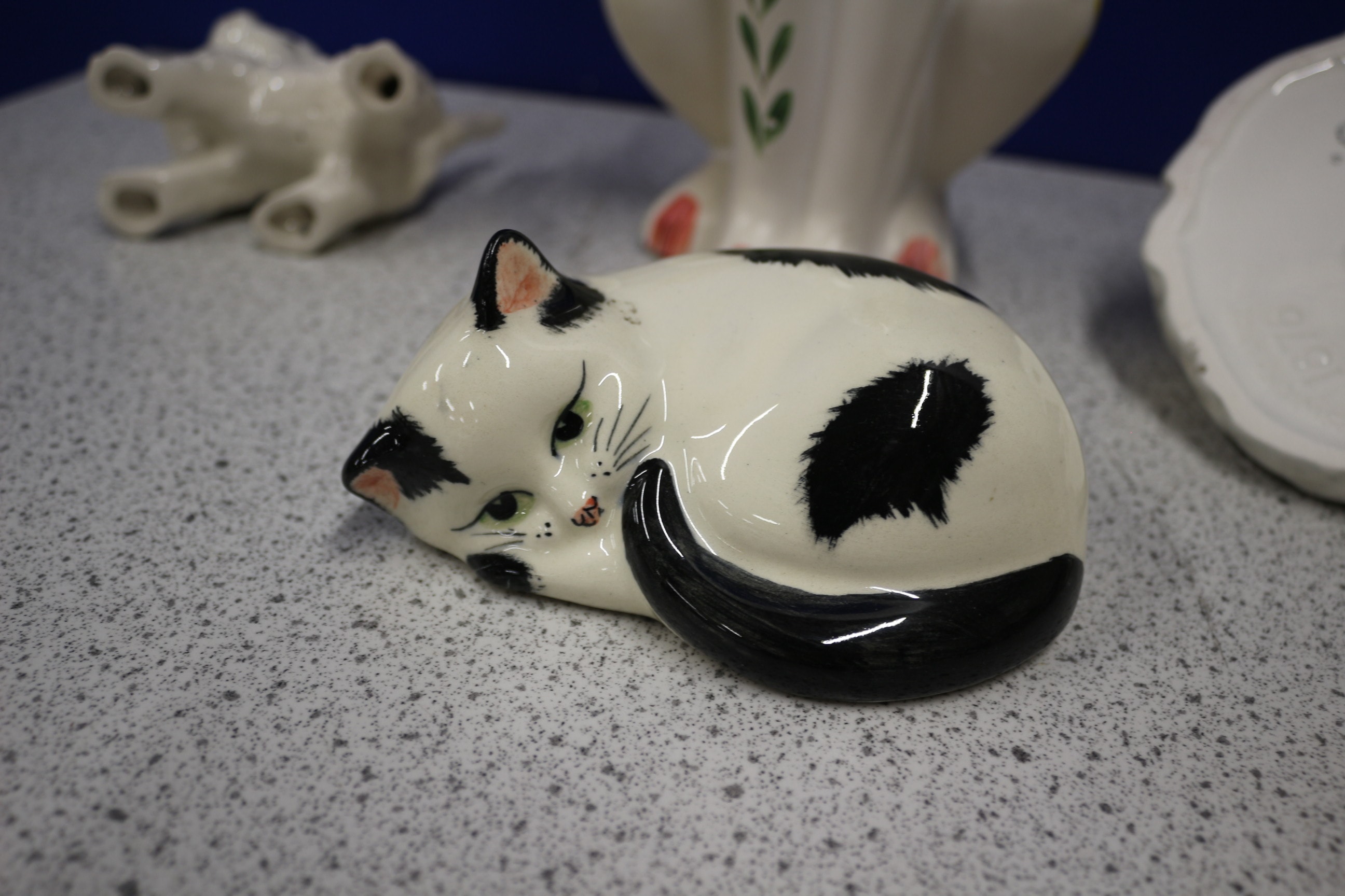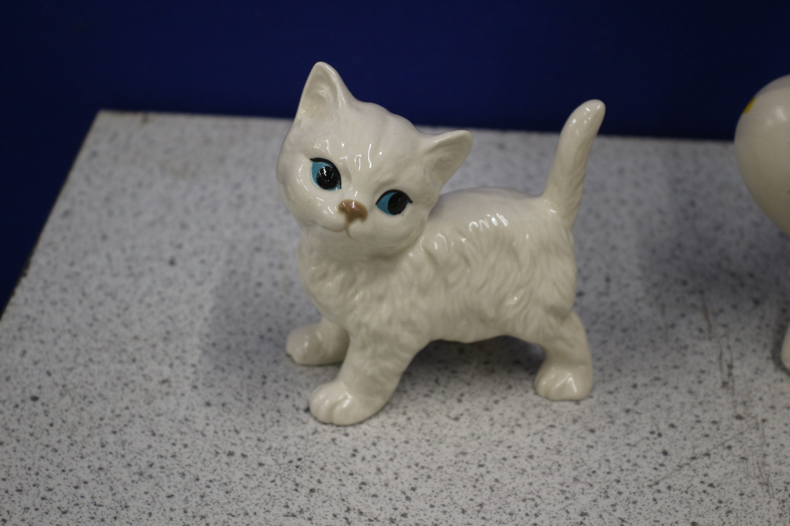 A collection of four ceramic cat figurines, including a tall white standing cat with pink, green, and yellow accents 37cm tall, a small white standing kitten with blue eyes, a white lying cat with green eyes marked “BESWICK ENGLAND” and embossed “1895”, and a black and white sleeping cat with green eyes marked “COSMOS BARBICALE POTTERY ENGLAND”.