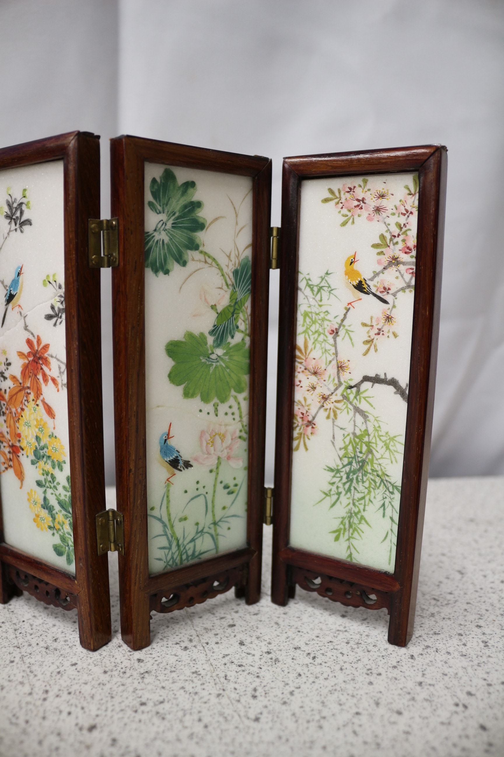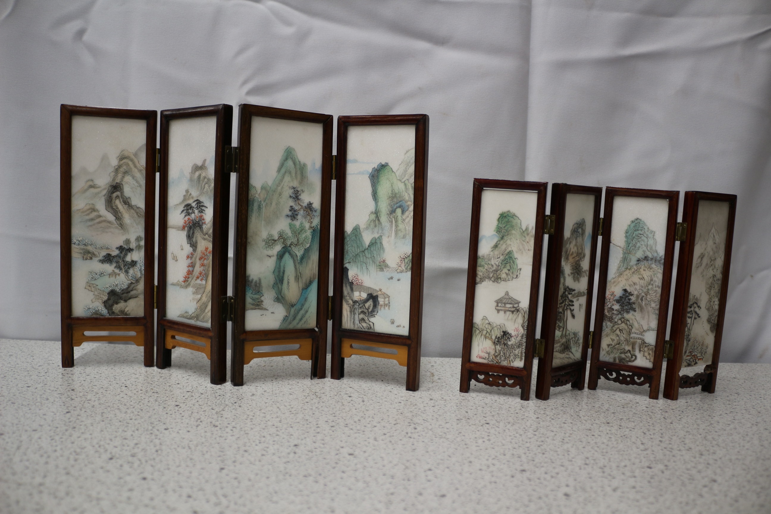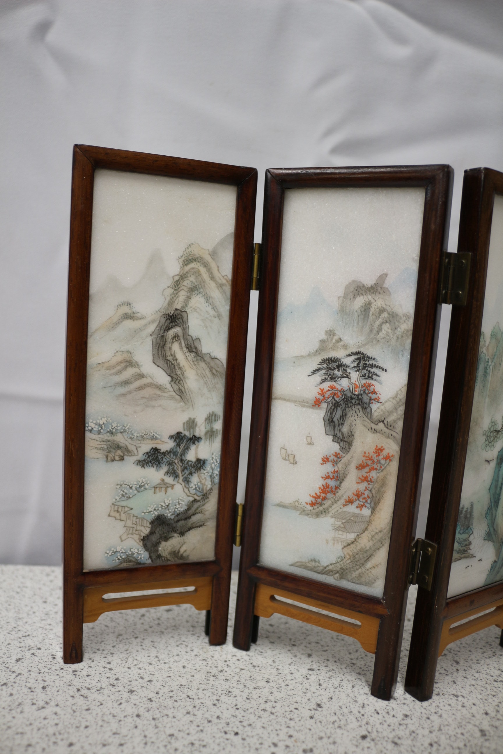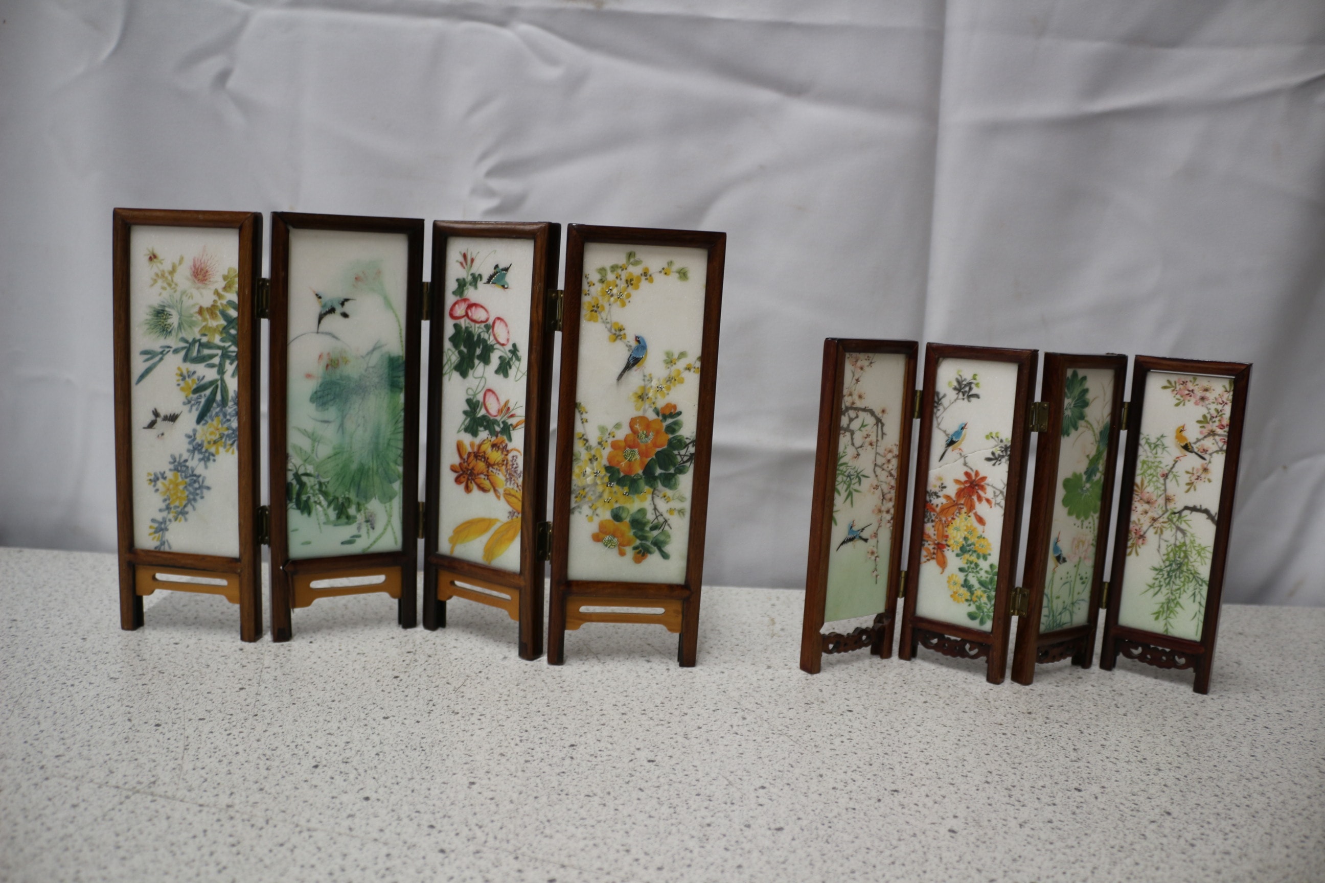 A pair of 4-panel miniature oriental decorative screens with dark brown wooden frames and white painted stone inserts, one featuring colourful floral and bird designs, the other traditional landscape scenes. Tallest 21cm AF