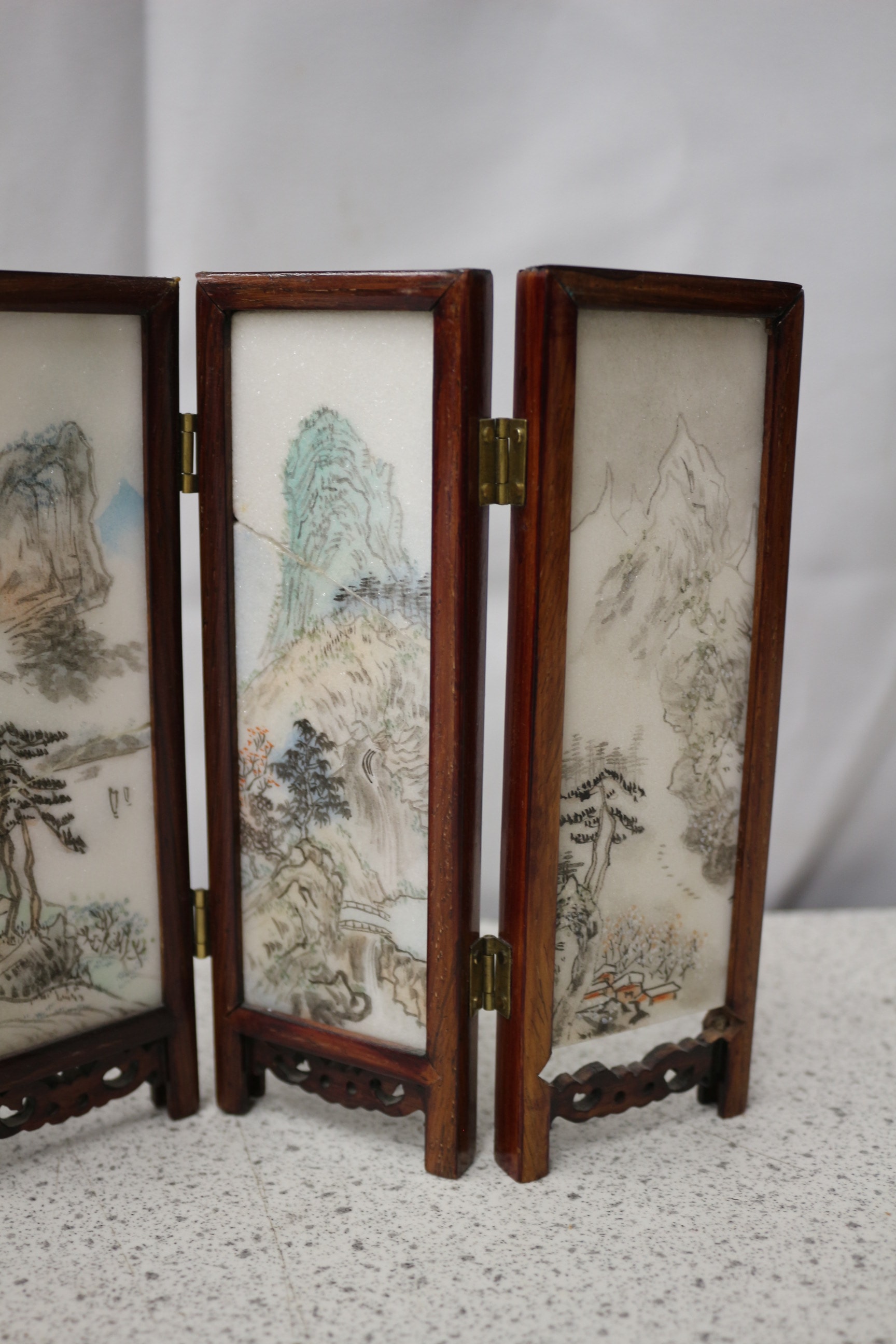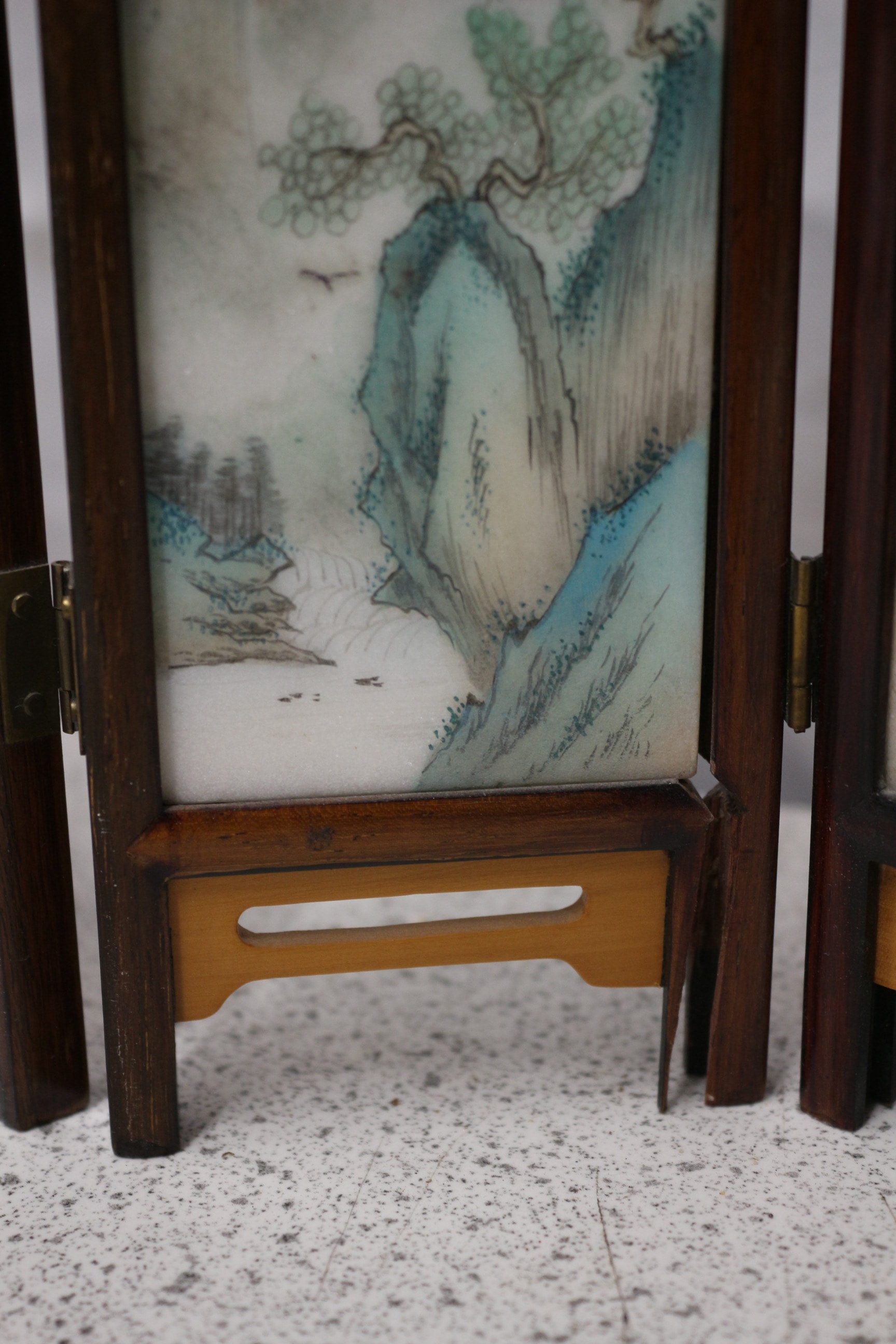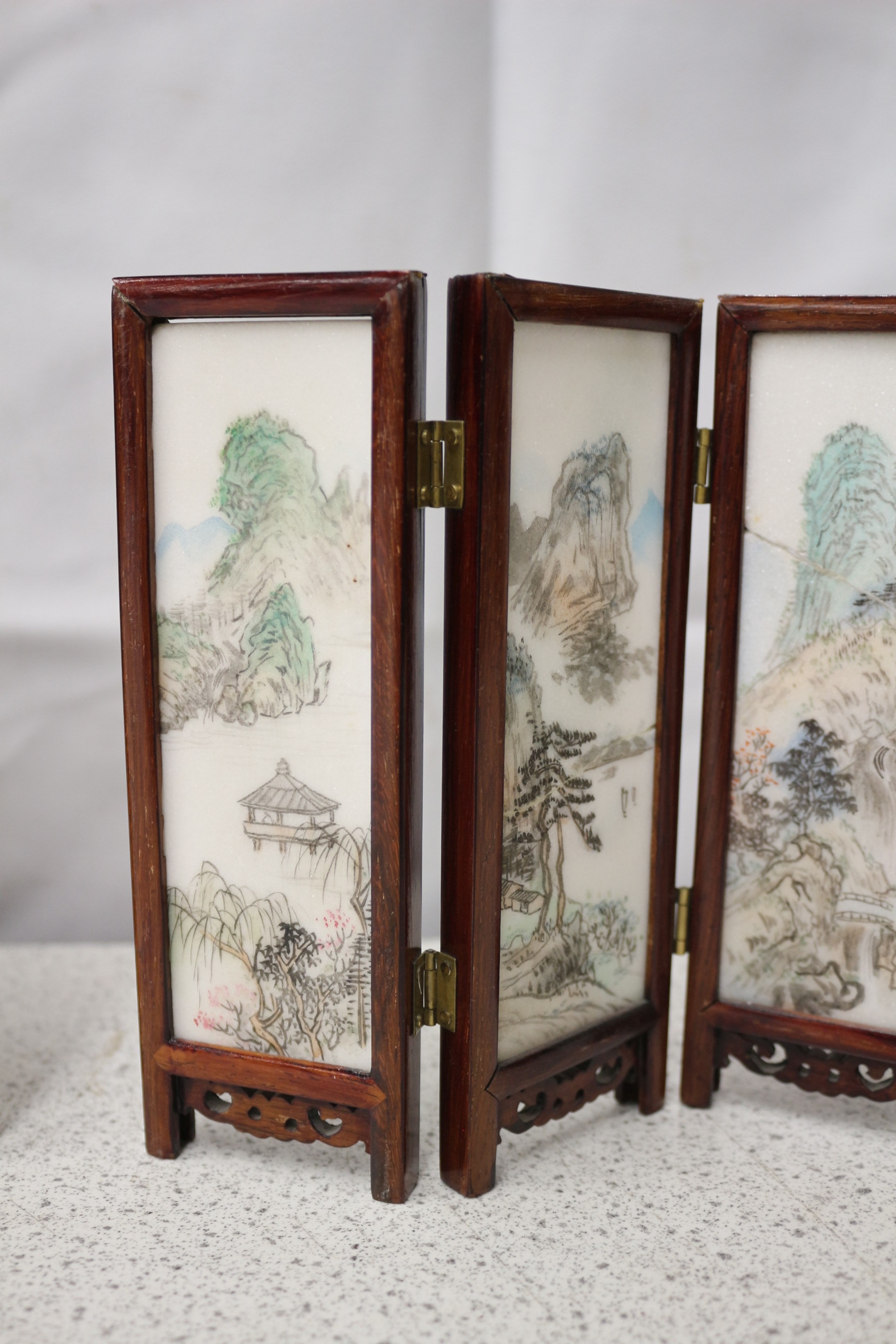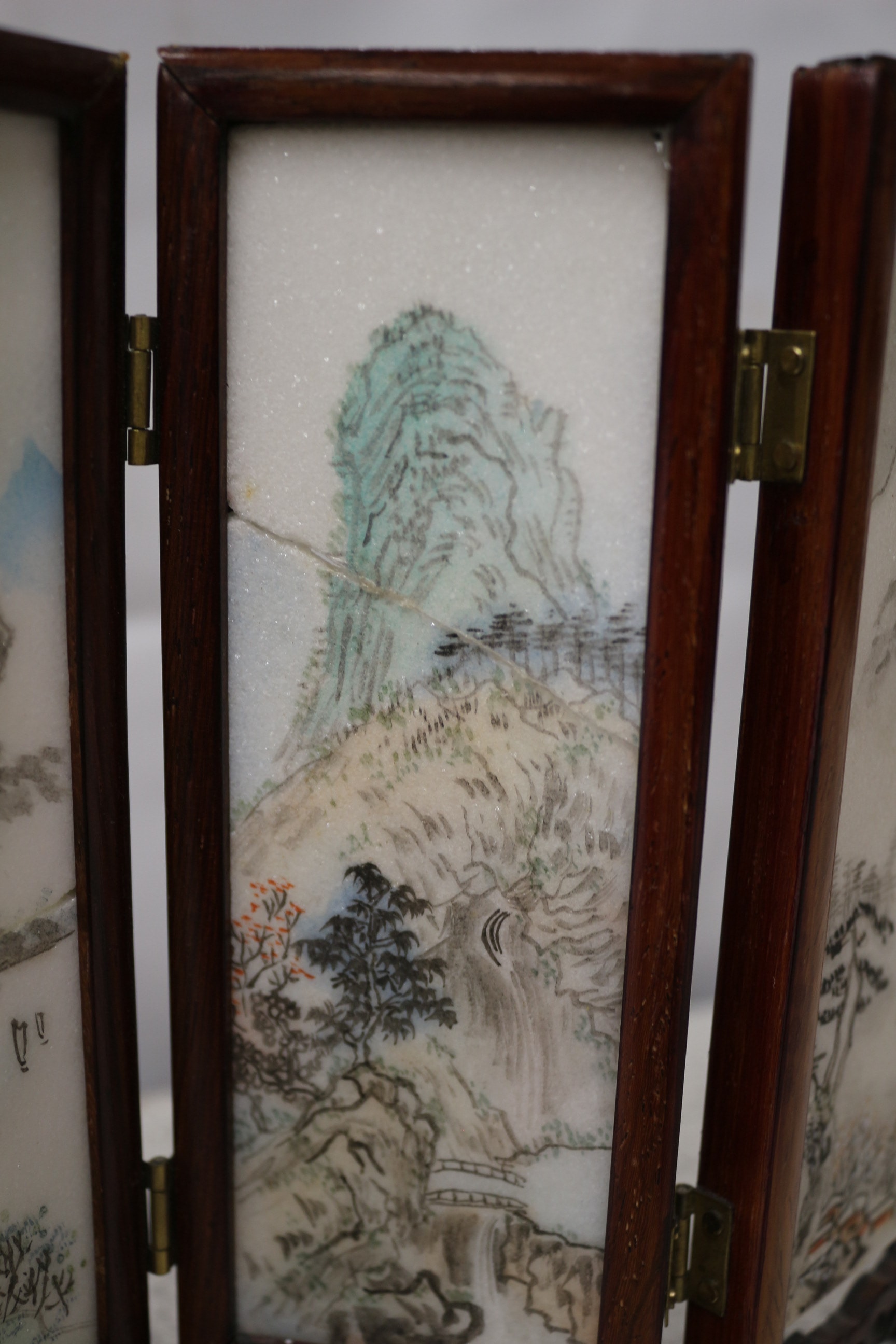 A pair of 4-panel miniature oriental decorative screens with dark brown wooden frames and white painted stone inserts, one featuring colourful floral and bird designs, the other traditional landscape scenes. Tallest 21cm AF