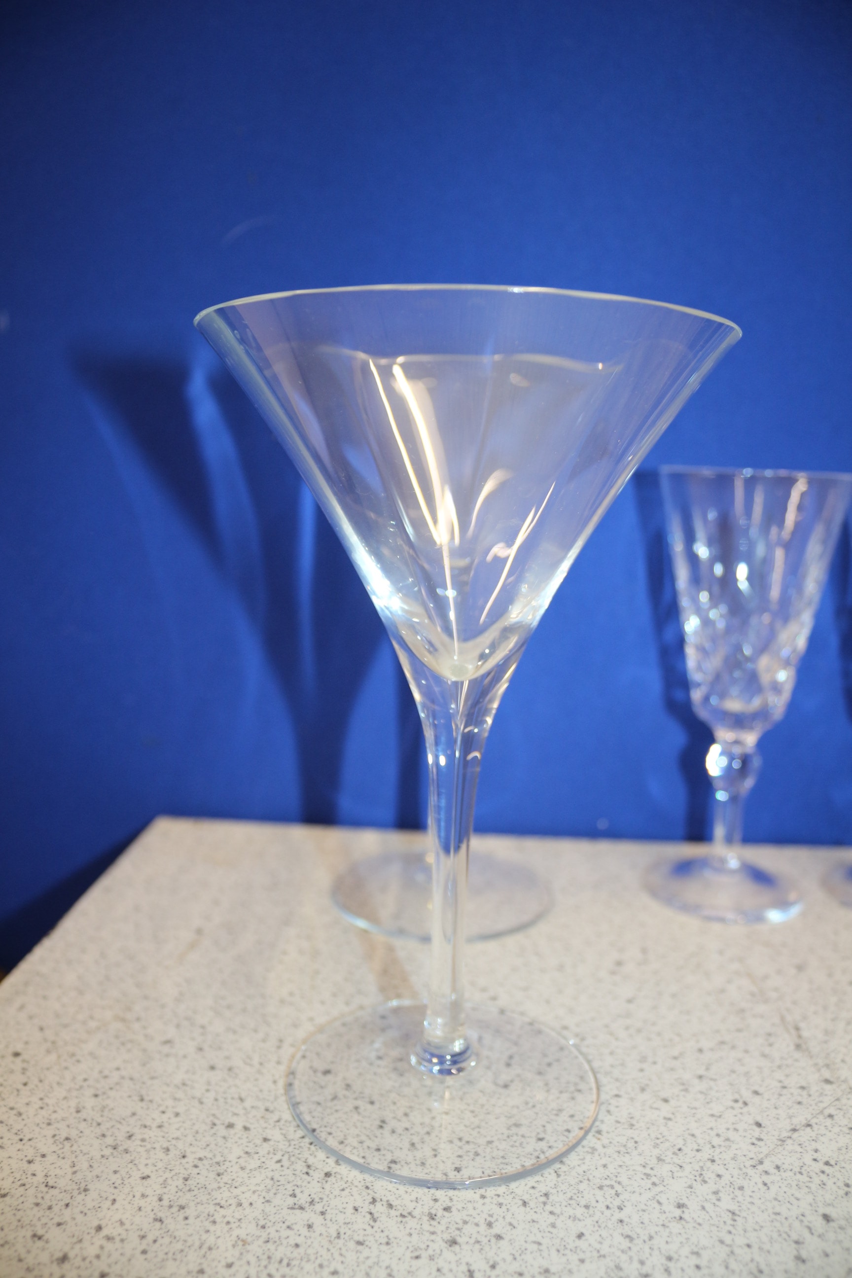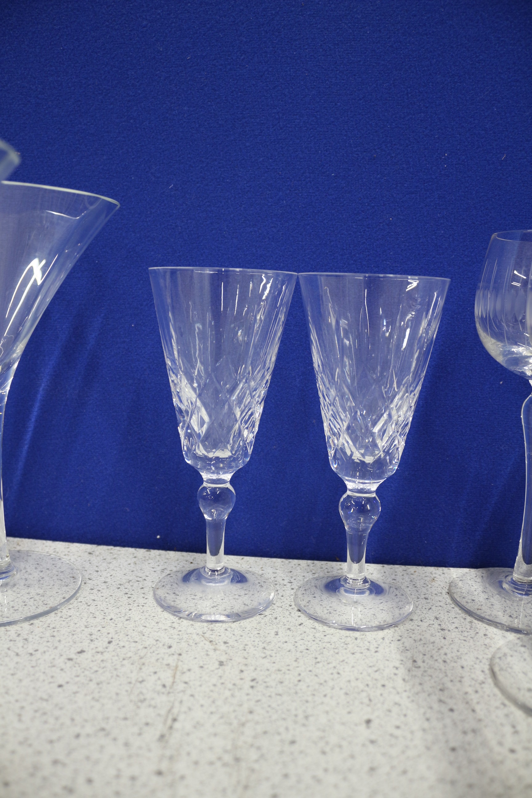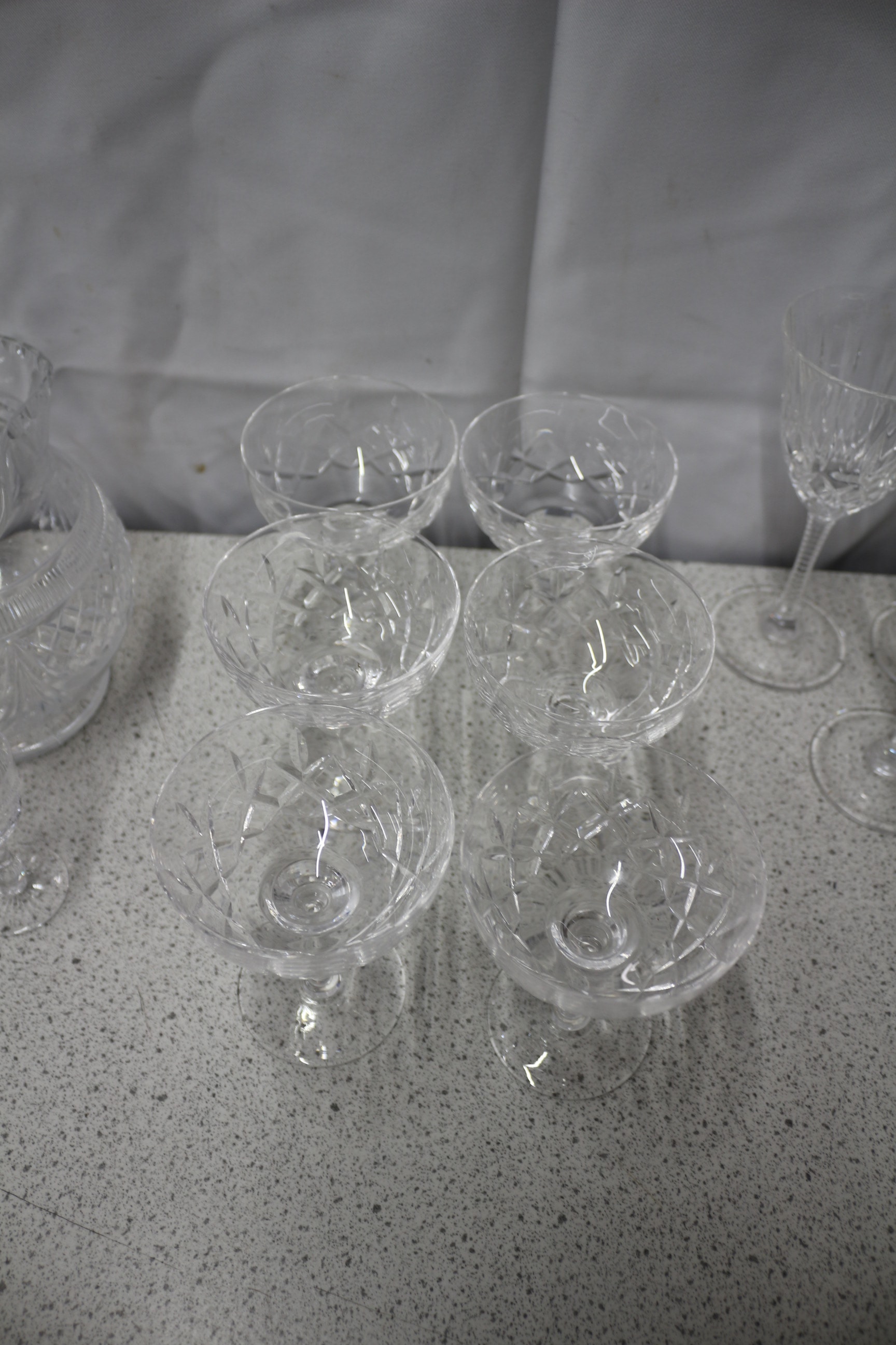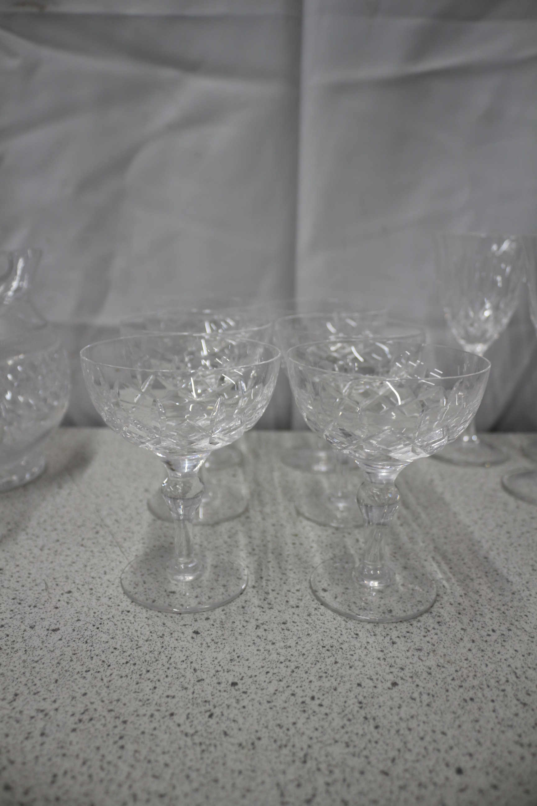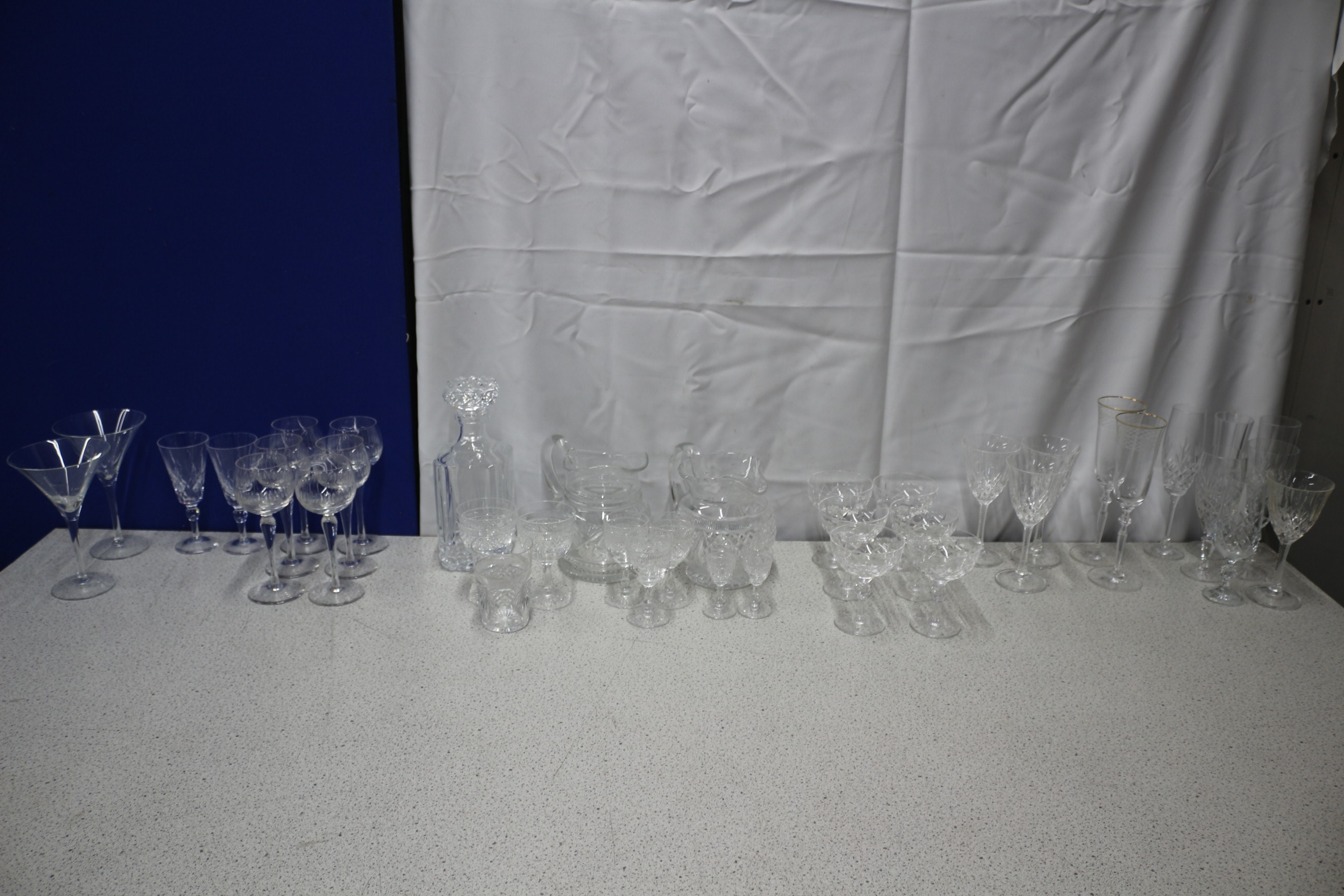 The lot features two martini glasses, numerous stemmed wine and champagne flutes (some with gold rims or cut patterns), a collection of cut crystal cordial or coupe glasses, one decanter with a stopper, and two pitchers, all made of clear glass. Inc Edinburgh Crystal Couple AF