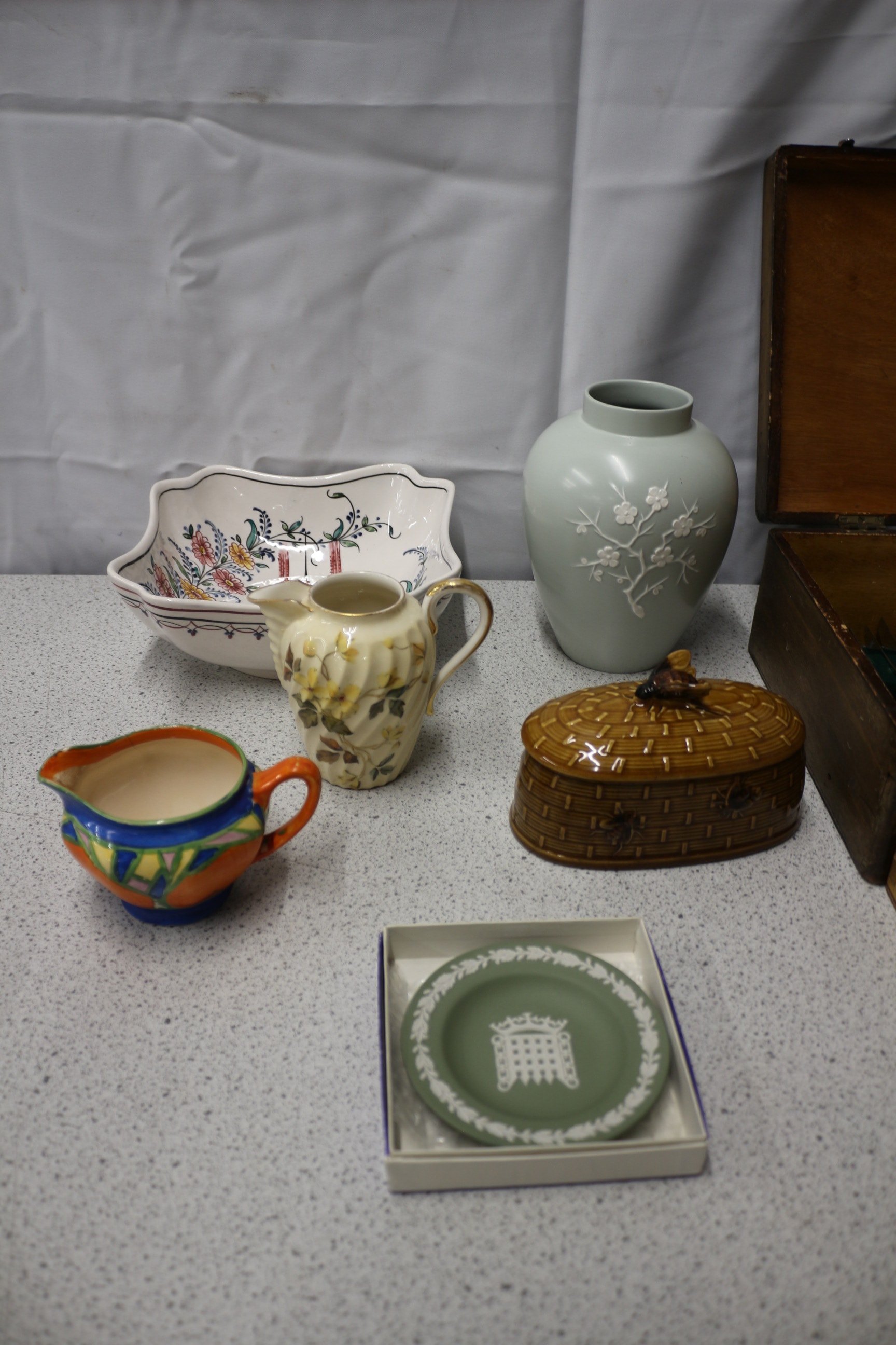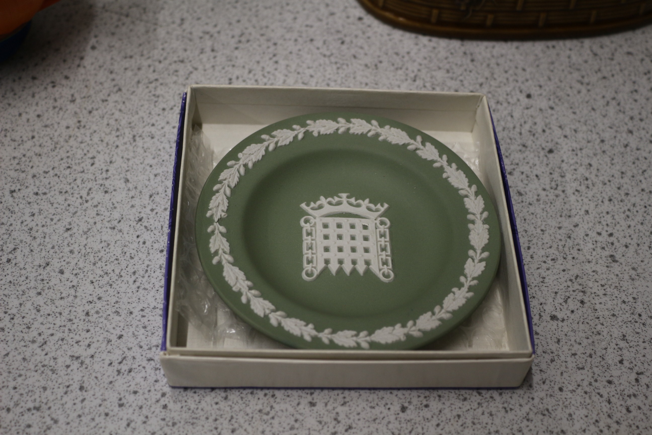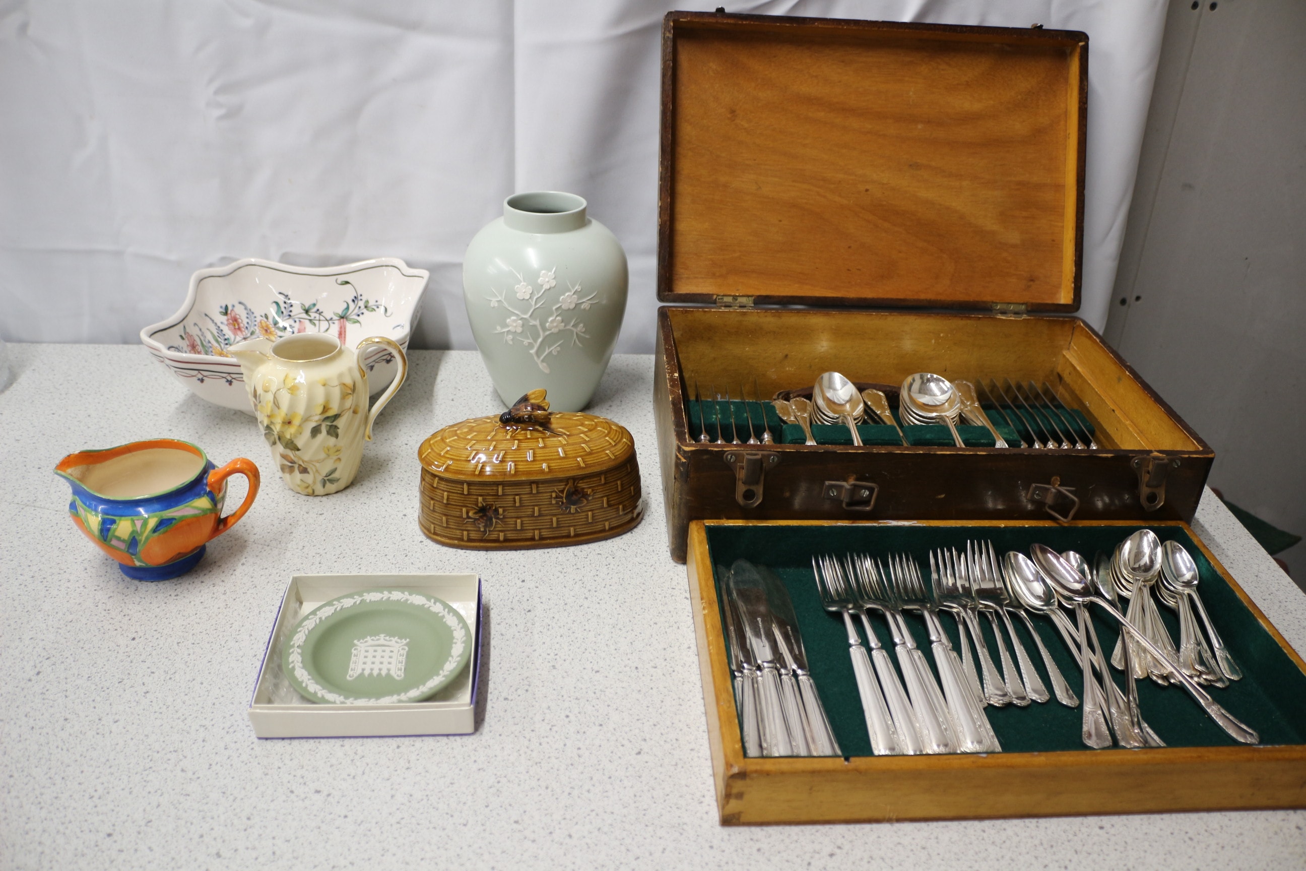 Mixed Lot inc a round, sage green Wedgwood Jasperware sweet dish decorated with a white portcullis and laurel wreath, canteen of cutlery