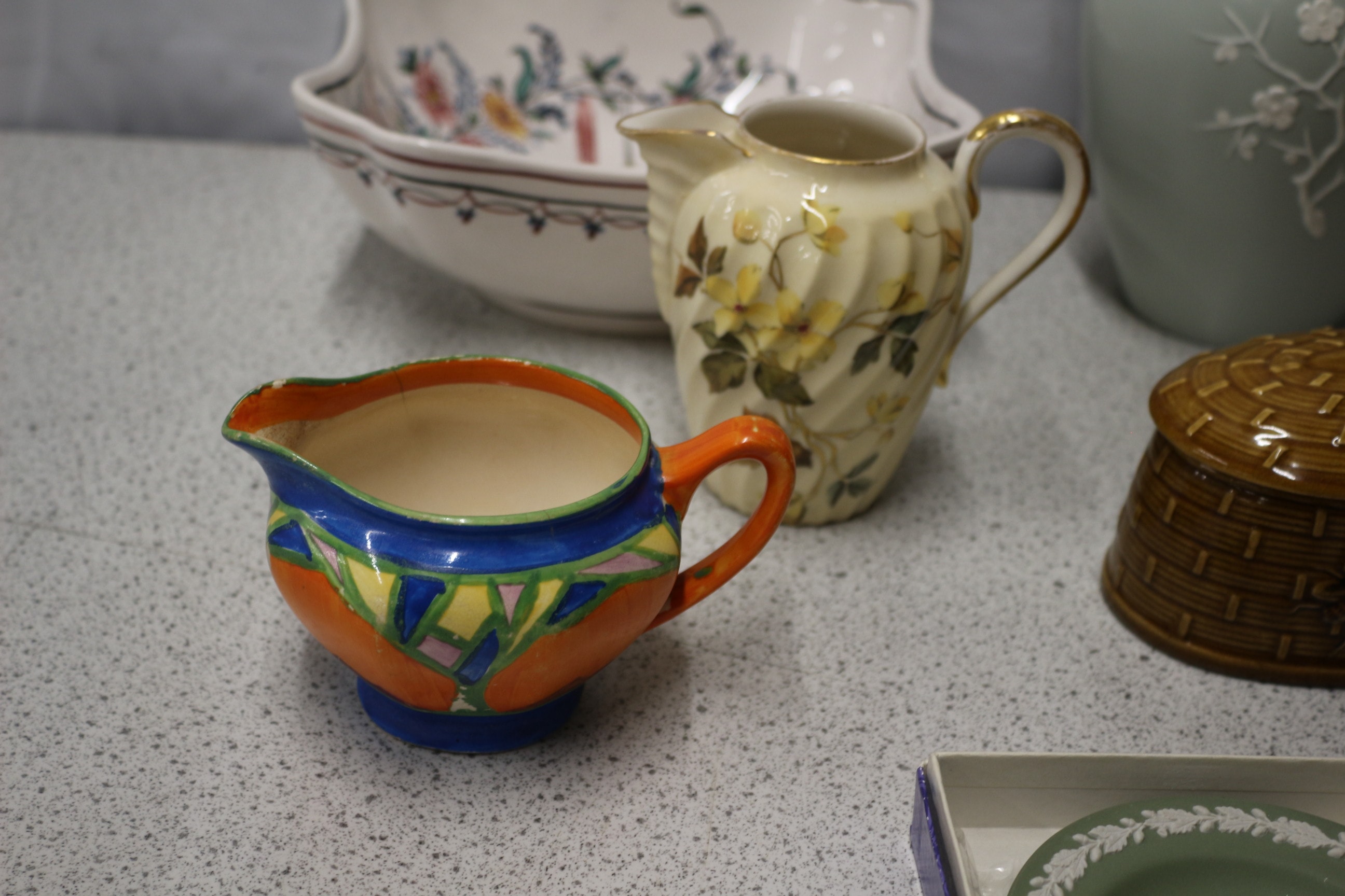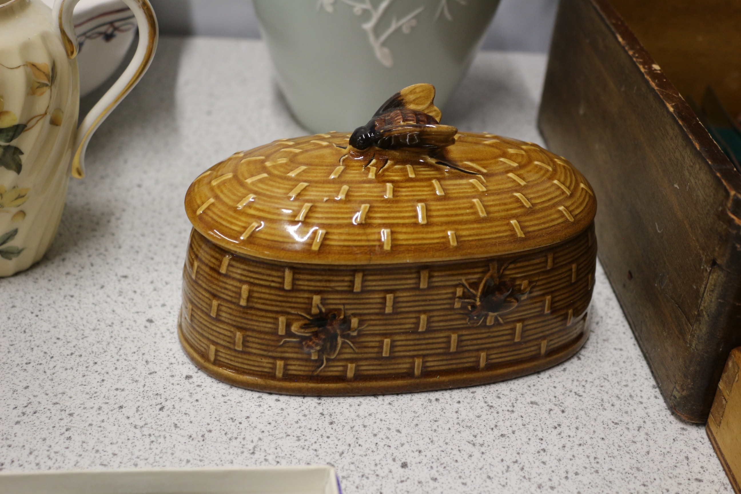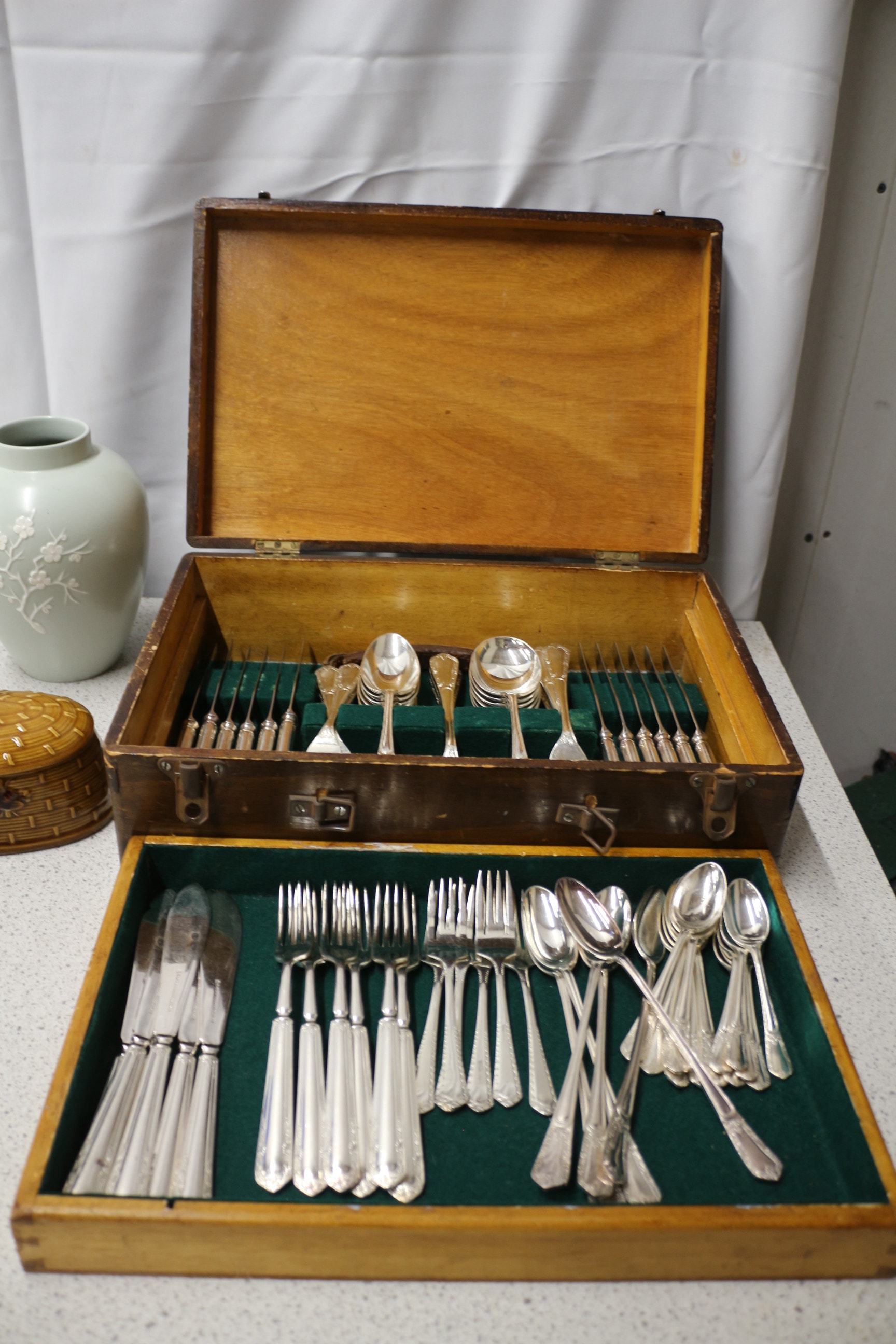 Mixed Lot inc a round, sage green Wedgwood Jasperware sweet dish decorated with a white portcullis and laurel wreath, canteen of cutlery