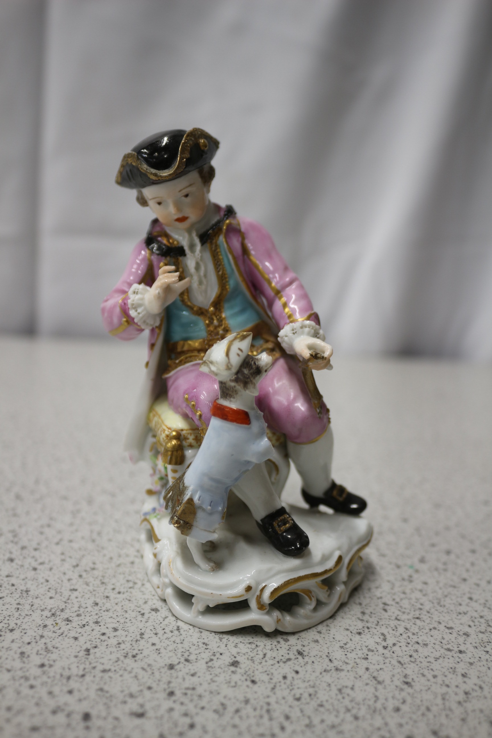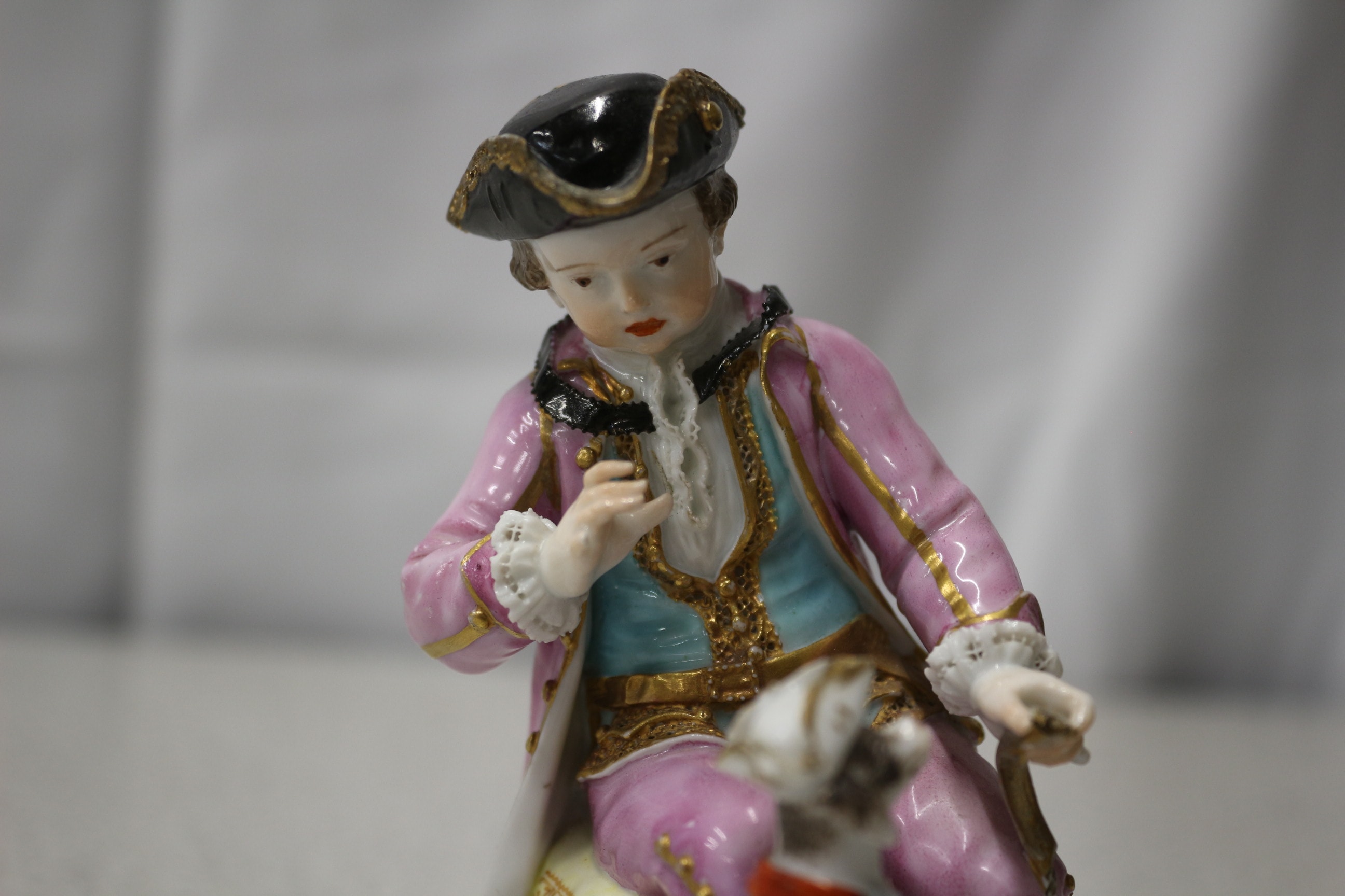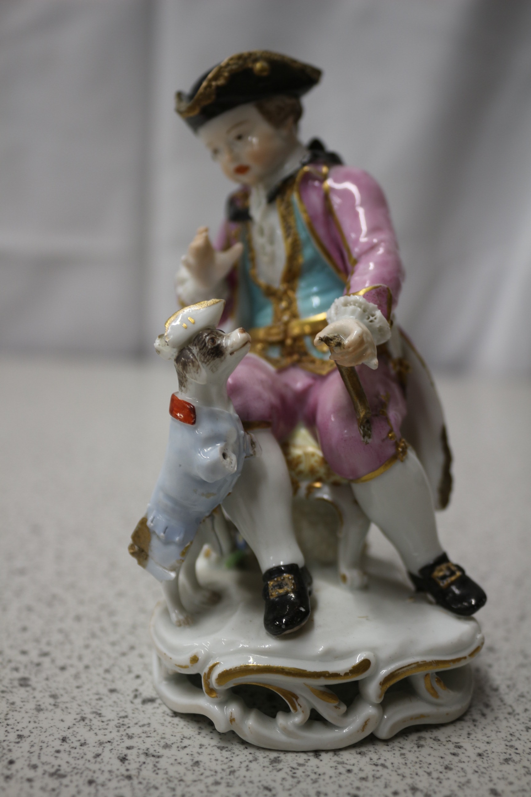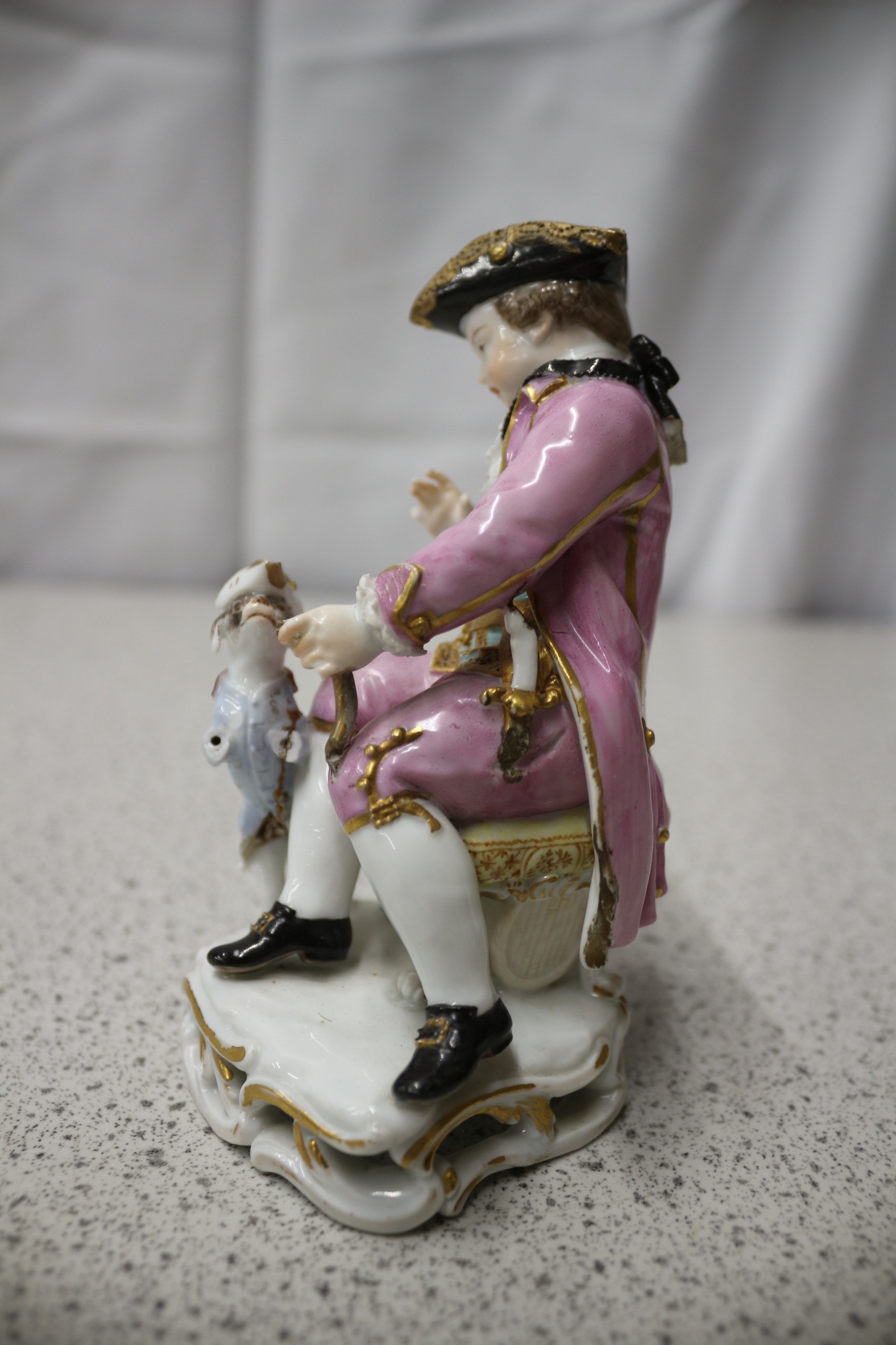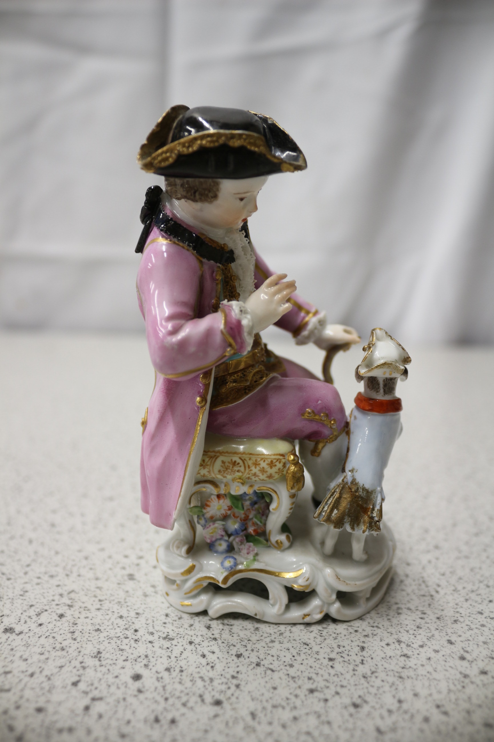 A Meissen porcelain figurine depicts a seated boy in a pink jacket and black hat interacting with a white and brown dog in a light blue outfit, all on a white and gold rococo-style base. 13cm Tall, AF