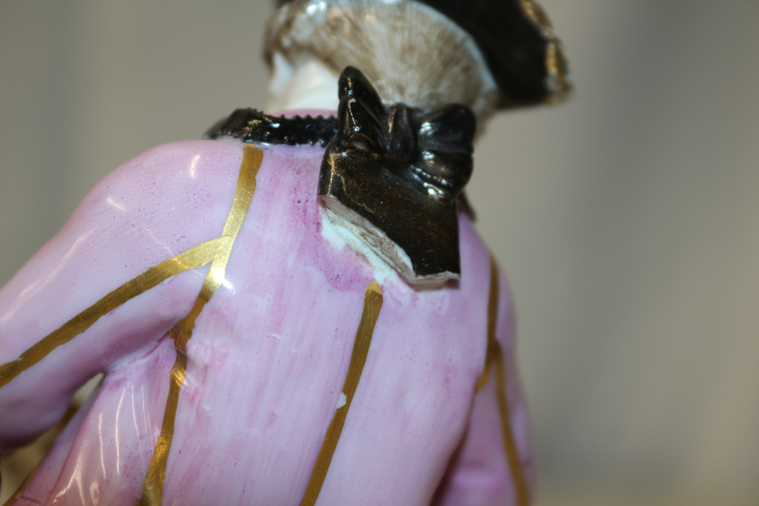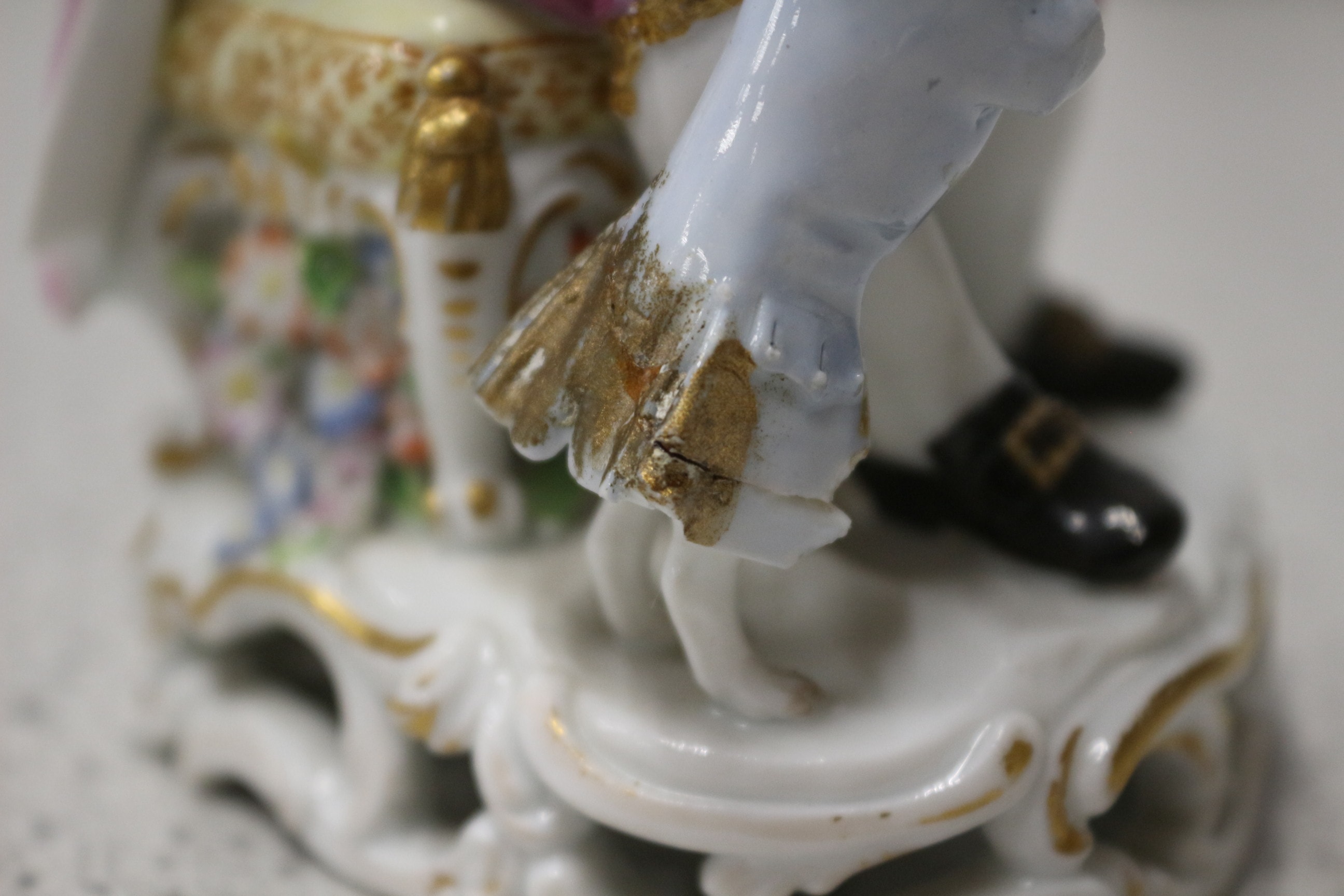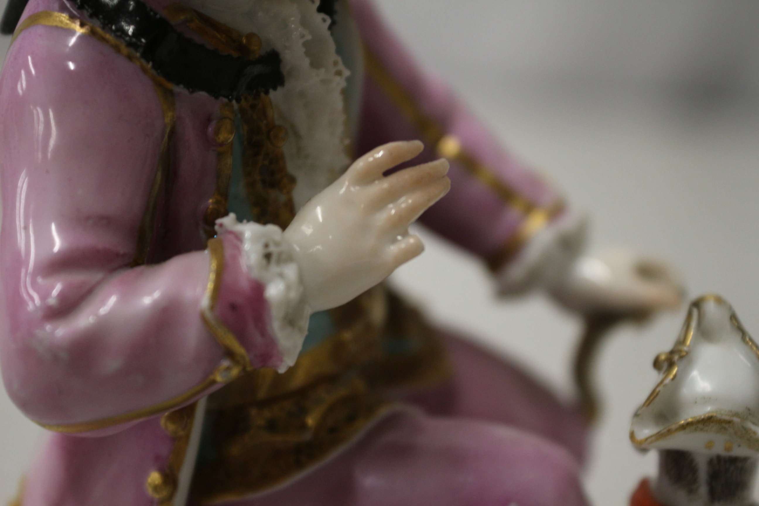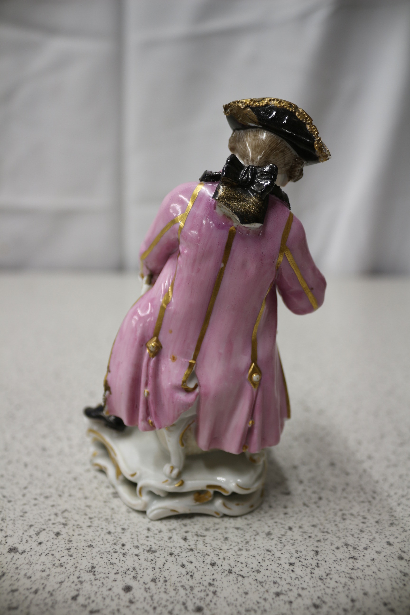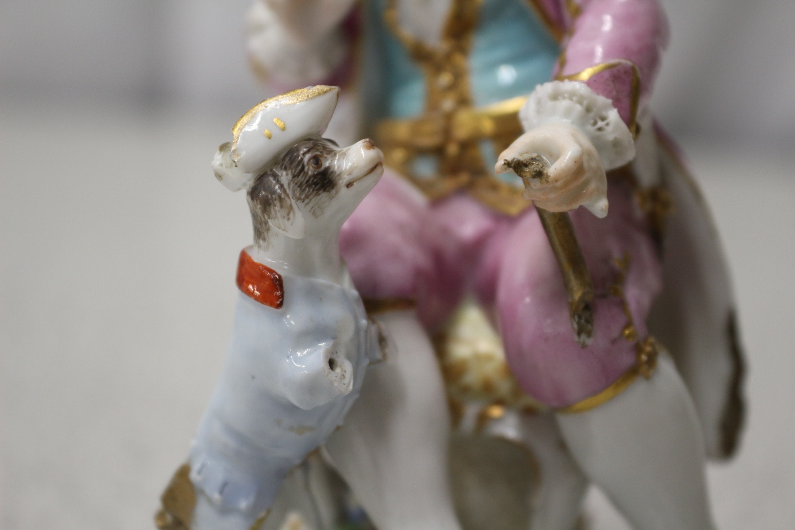 A Meissen porcelain figurine depicts a seated boy in a pink jacket and black hat interacting with a white and brown dog in a light blue outfit, all on a white and gold rococo-style base. 13cm Tall, AF