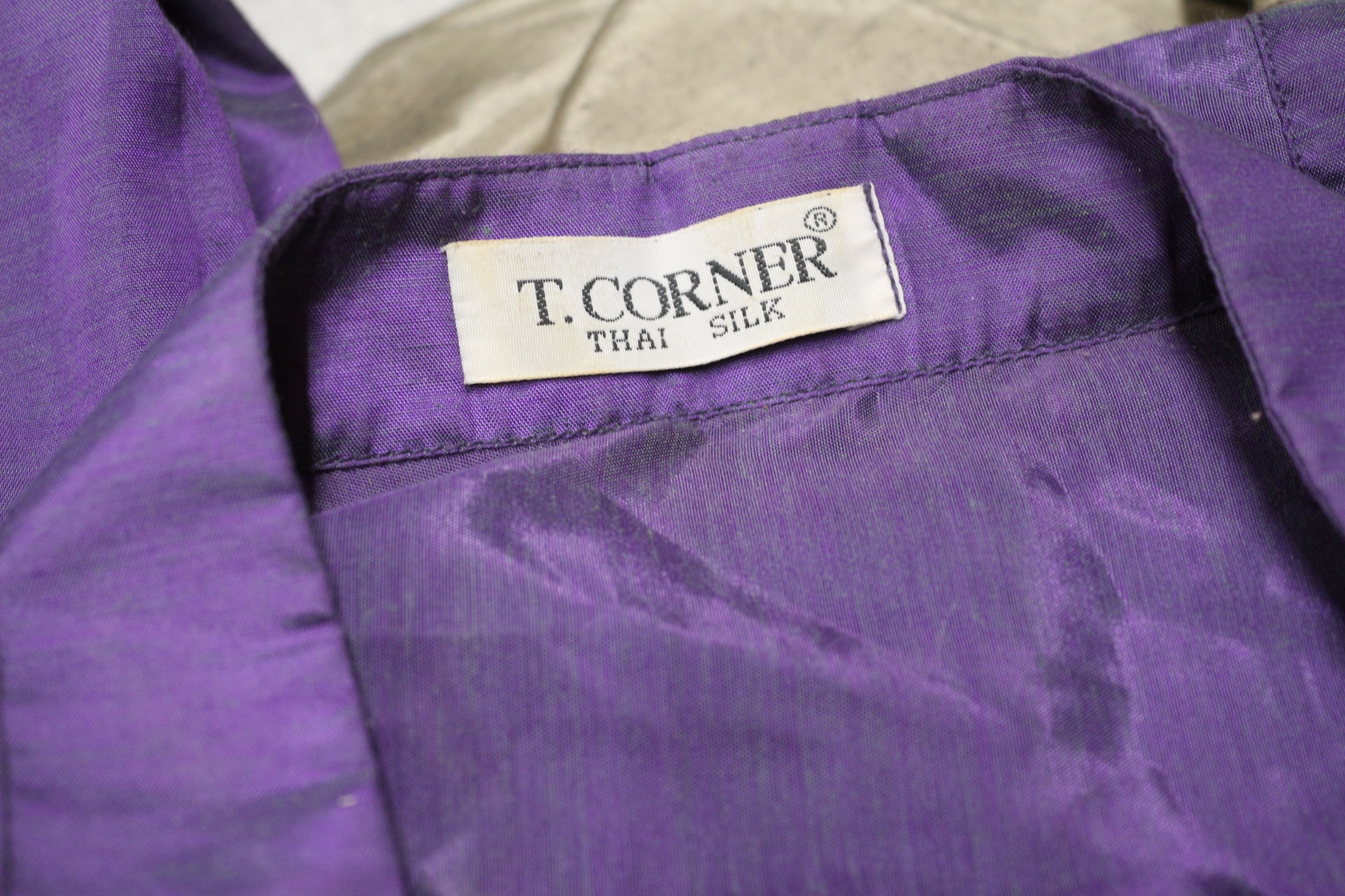 Inc A purple long-sleeved shirt with a ‘T. CORNER THAI SILK’ label inside the collar.