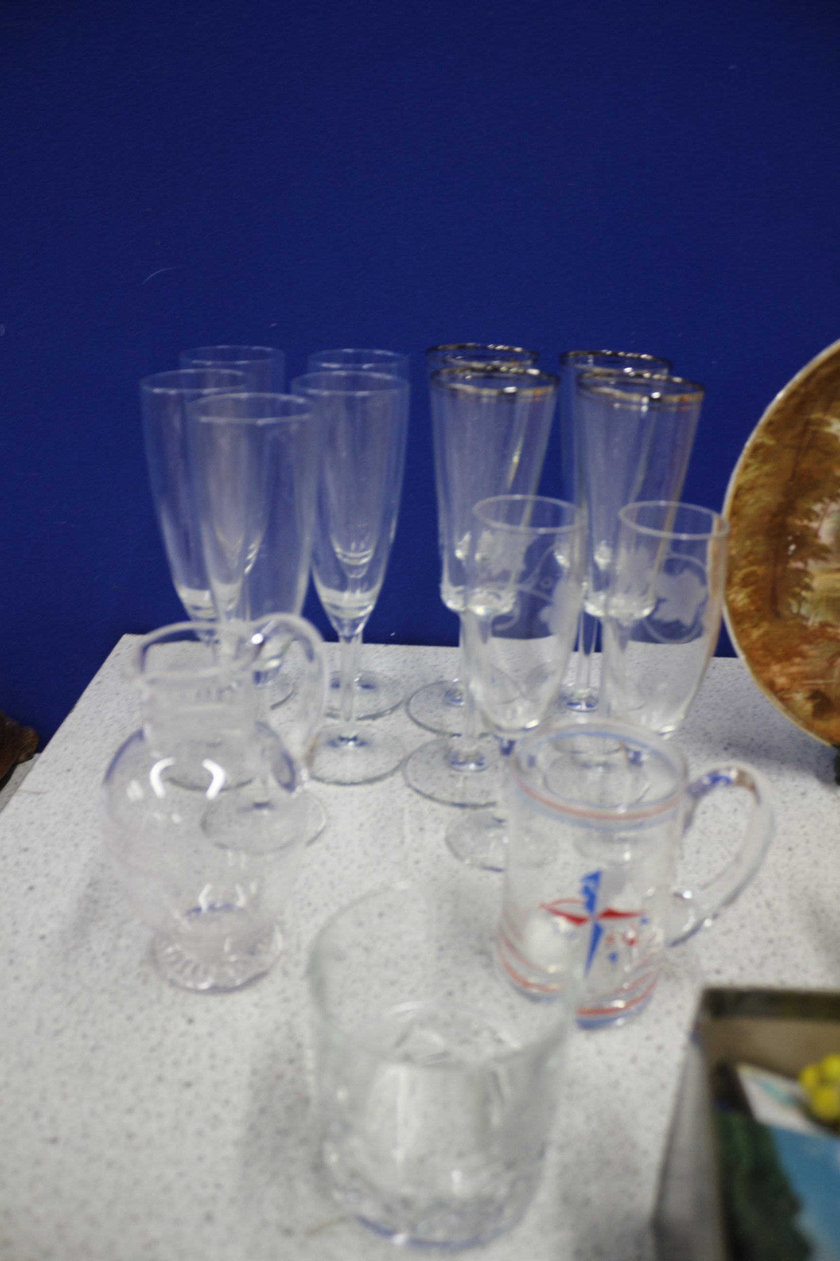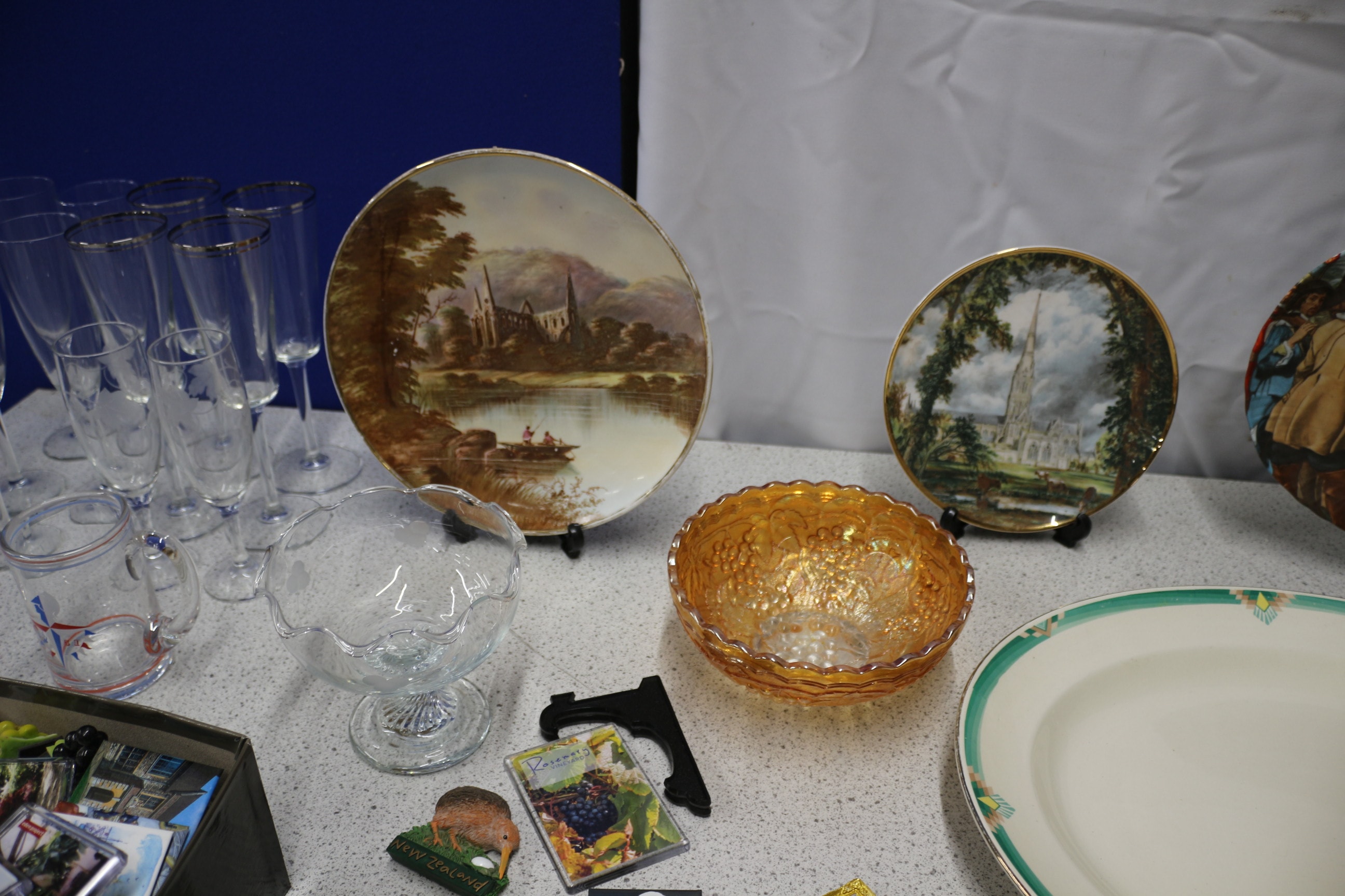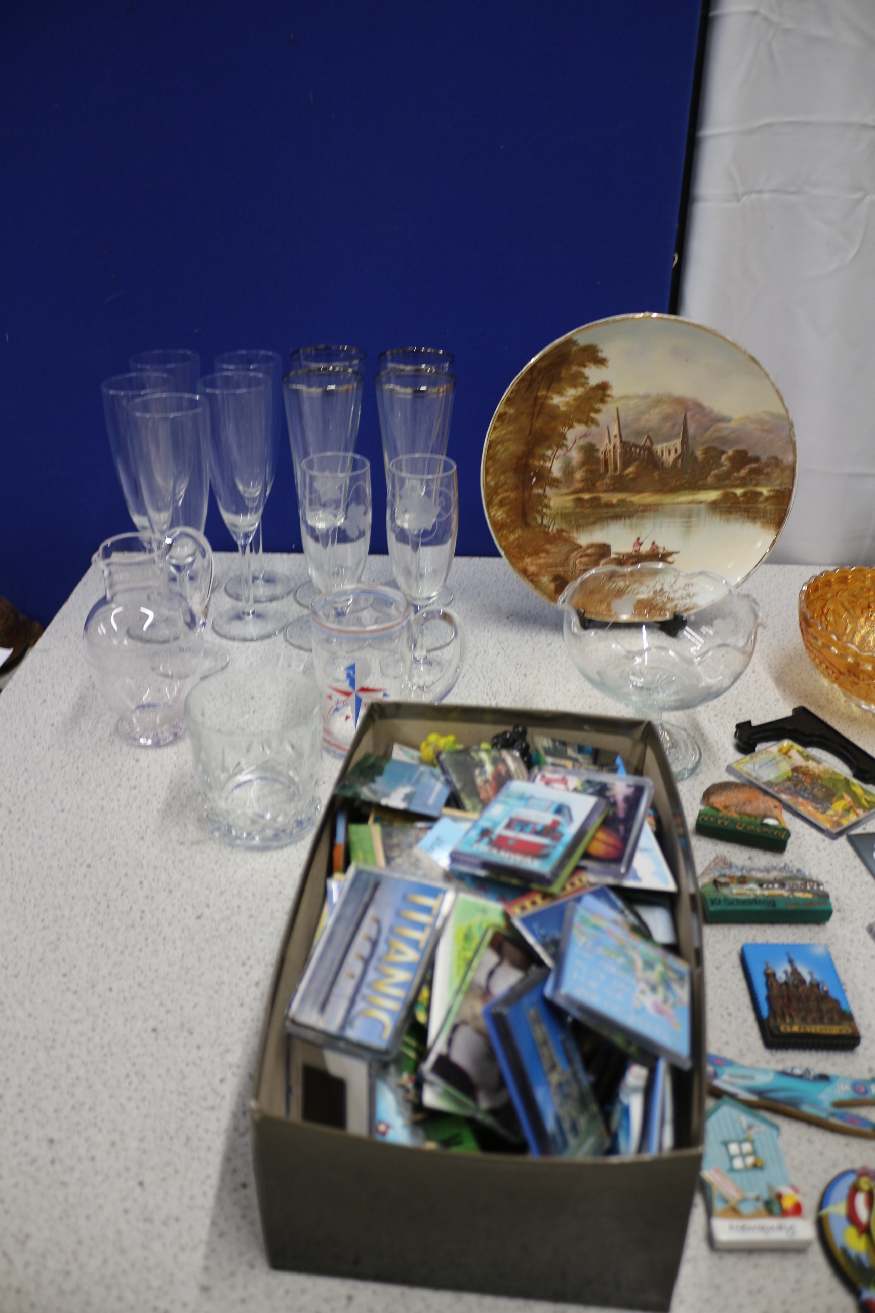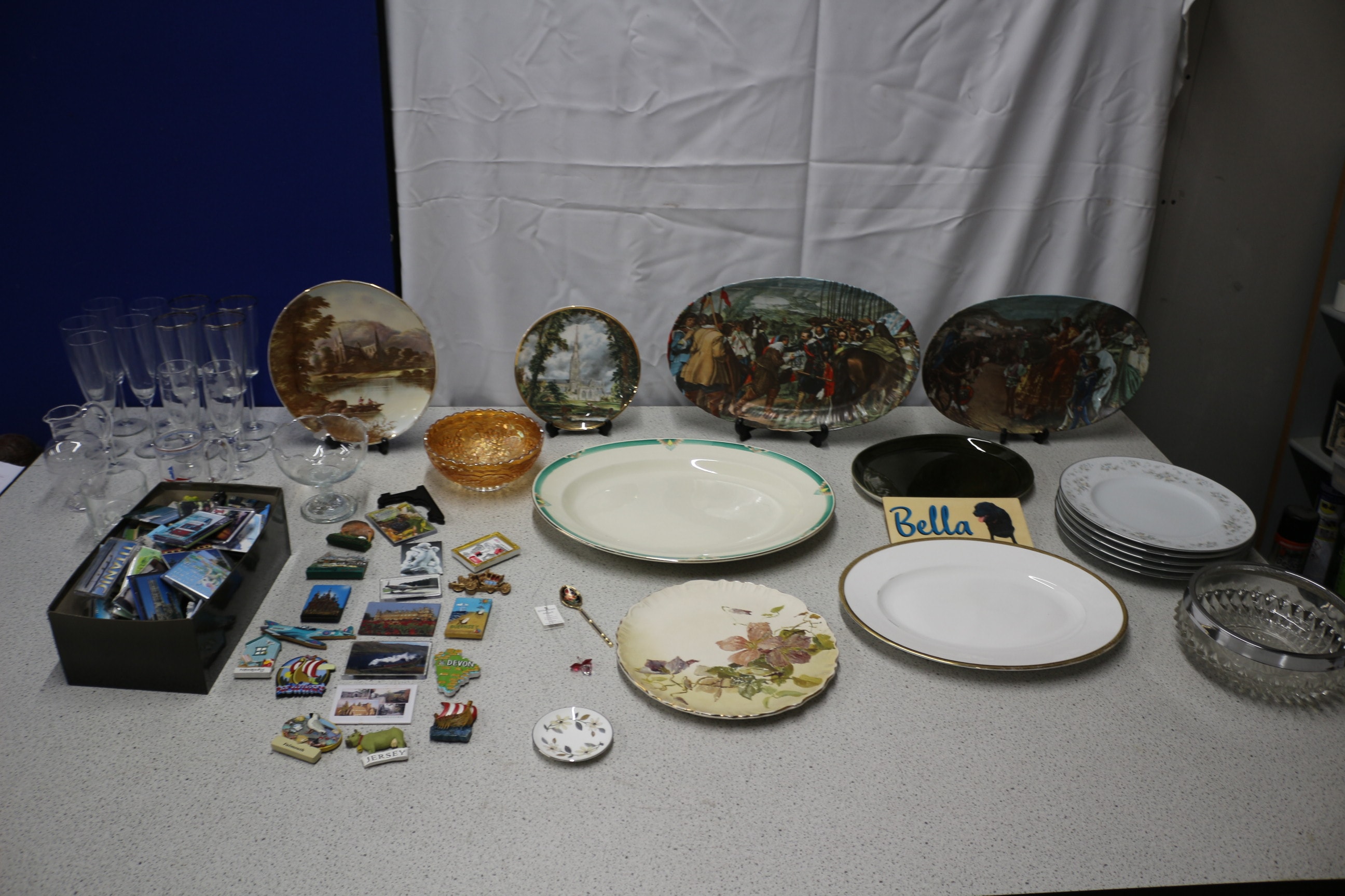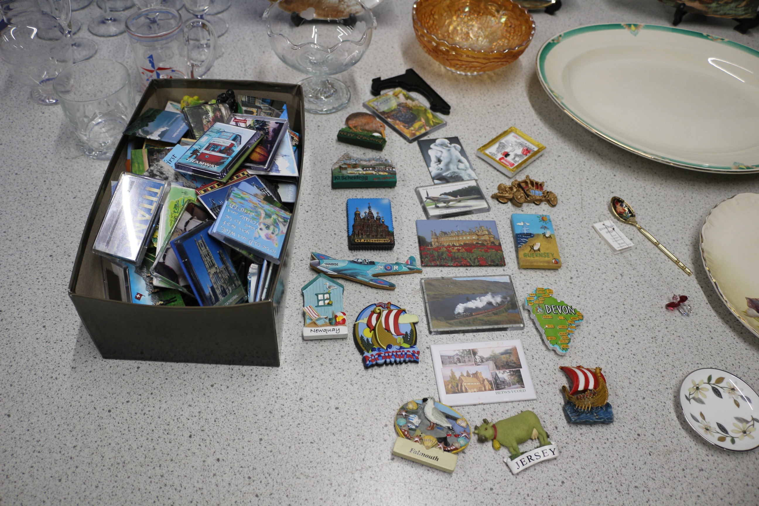 A diverse collection including various clear glass drinking vessels and bowls, several decorative ceramic plates, a box of souvenir magnets, and other small collectible items, including a plate by S. Hildesheimer & Co Ltd.